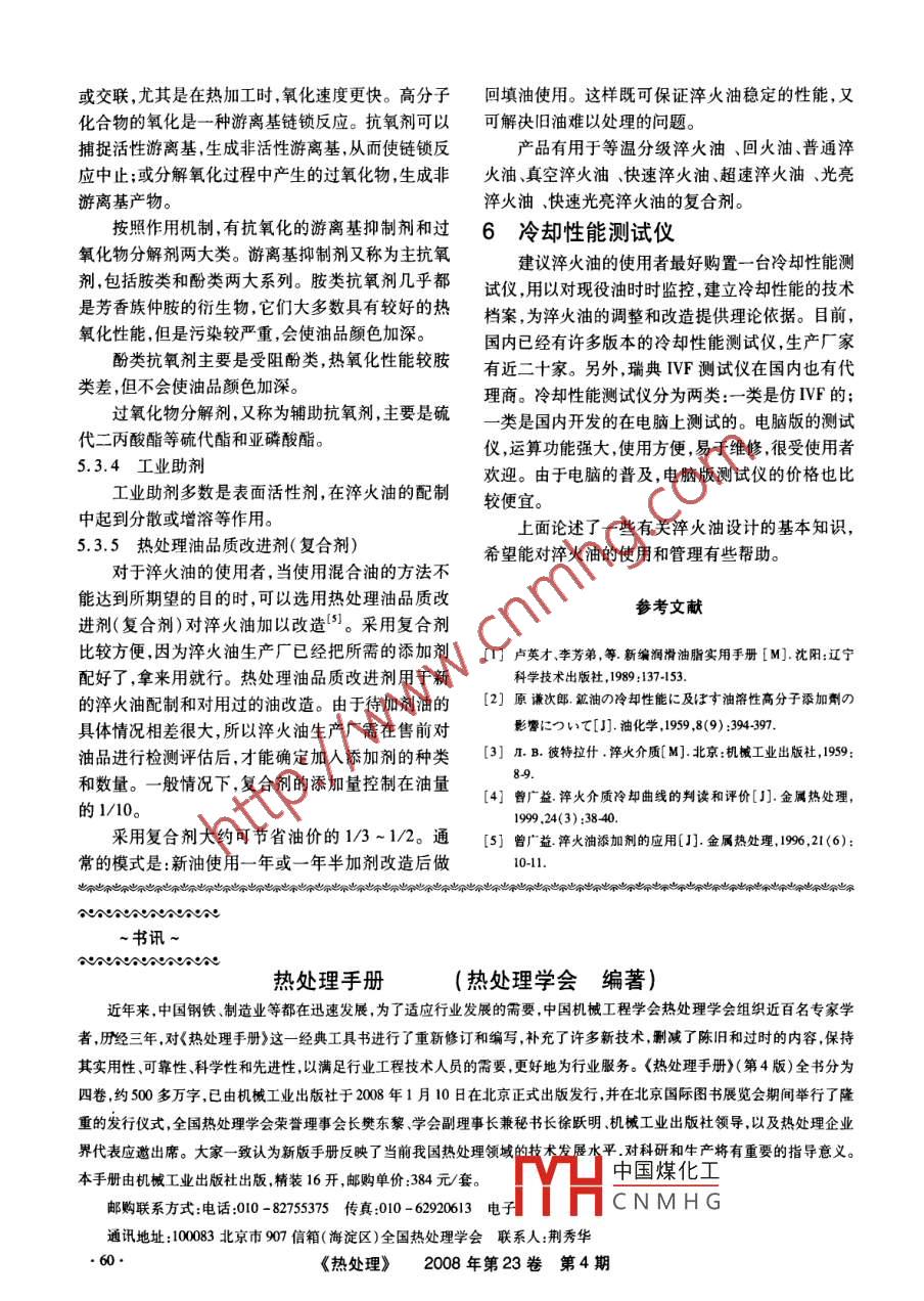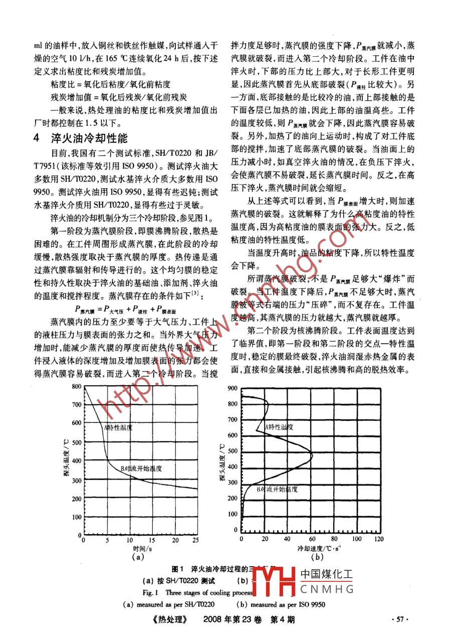 ~冷卻技術(shù)~淬火油的設(shè)計(jì)曾廣益(天津市關(guān)石石化產(chǎn)品有限公司,天津300112)摘要: 淬火油的設(shè)計(jì)是為淬火油的使用服務(wù),即淬火油的使用決定淬火油的設(shè)計(jì)。我國(guó)淬火油的設(shè)計(jì)依據(jù)是SH 0564《熱處理油》。在具體的使用中,對(duì)淬火油提出更進(jìn)一步的要求是合理的。關(guān)鍵詞:淬火油;使用;冷卻性能中圖分類(lèi)號(hào):TG154.4文獻(xiàn)標(biāo)識(shí)碼:A文章編號(hào):1008-1690(2008 )04-0055-006Design of Quenching OilsZENG Guang-yi .(Tianjin Mainstream Petrochemical Products Co. ,Itd. ,Tianjin 300112)Abstract : The design of quenching oils serves their application, that is to say, the design of quenching oils is de-pendent on their application. The quenching oils are designed on the basis of SH0564《Heat treatment oils》 in Chi-na. It is reasonable that higher demands for quenching oils are put forward in practical service.Key Words :quenching oil;use ;cooling characteristics對(duì)于淬火油的使用者為什么要研究淬火油的設(shè)合物,隨時(shí)都在變化之中,因此對(duì)淬火油的現(xiàn)場(chǎng)監(jiān)測(cè)計(jì)呢?是為了更好地管理和使用淬火油。淬火油在和管理就十分重要。淬火油的技術(shù)指標(biāo)很多,有理使用過(guò)程中要發(fā)生各種變化。淬火實(shí)踐是一個(gè)系統(tǒng)化指標(biāo)冷卻性能指標(biāo)、抗氧化性能指標(biāo)、光亮性能工程,它由許多程序組成,又分為許多細(xì)節(jié),因此可指標(biāo)、飽和蒸汽壓等。在我國(guó),淬火油的設(shè)計(jì)依據(jù)是以說(shuō)沒(méi)有細(xì)節(jié)就沒(méi)有管理。研究淬火油的設(shè)計(jì)就是SH0564《熱處理油》。以此為依據(jù),淬火油的使用.要了解和掌握這些細(xì)節(jié),把這些細(xì)節(jié)的變化控制在者可以根據(jù)自己的實(shí)踐將相關(guān)的信息反饋給淬火油最小的范圍內(nèi),以保證產(chǎn)品質(zhì)量的穩(wěn)定。通過(guò)淬火的生產(chǎn)者,以便生產(chǎn)者制造出更適合自己使用的淬實(shí)踐,我們可以找出重要指標(biāo)允許的最大值和最小火油。值,在淬火油設(shè)計(jì)和管理中加以保證。2淬火油理化指標(biāo)的含義"1淬火油 的設(shè)計(jì)依據(jù)淬火油的理化指標(biāo),如基礎(chǔ)油的類(lèi)別(石蠟基、工件的淬火對(duì)淬火油的最基本的要求是淬火油環(huán)烷基或中間基) ,運(yùn)動(dòng)粘度,開(kāi)口閃點(diǎn),水分等可性能的穩(wěn)定,尤其是淬火油的冷卻性能。影響淬火到石油公司去檢測(cè)。油的冷卻性能的因素很多。淬火油使用條件可以說(shuō)粘度指數(shù):是基礎(chǔ)油化學(xué)組成的函數(shù)。粘度指是最苛刻的。淬火油是一種多組分的高分子有機(jī)化數(shù)可以作 為一種性能的標(biāo)志,作為質(zhì)量控制的尺度。收稿日期:2007-10-10作者簡(jiǎn)介:曾廣益(1941-),男,黑龍江阿城人,高級(jí)工程師,主要從事淬火介質(zhì)的研究。聯(lián)系電話(huà):022-27531457 13502108605 E-mail: zengguangyi123@ sina. com2001 ,29(4) :38-42.ture and tensile properie of AI-MgSi alys[J]. Seripta Materia[6]韓建德,王常春,閔光輝, 等.鑄造A-Si-Cu合金的組織與性能lia,1997 ,36:1089 -1094.[J].鑄造技術(shù),2002 ,23(4) :245-247.[9]陳曠,關(guān)紹康,胡保健,馬 辦雙級(jí)時(shí)效工藝對(duì)低壓[7] Van. P. Mourik, Mitemejer E J. On peipiaition mpidly ;中國(guó)煤化工小輕合金加工技術(shù).eldified auminium-ilion lly[J]. Joumal of Malerials Sei-ence. 1983 ,18(9) :2706-2720.MHCN M H G熱處理工藝的研究[n].[8] Zhen L, KangS B. The ffete of pre-aging on microstrue-鑄造.2006 ,(2):132134.《熱處理》2008年第23卷第4期.55.淬火油的粘度指數(shù)主要反映淬火油的基礎(chǔ)油的類(lèi)80 C,這樣才能保證淬火過(guò)程的安全。-般說(shuō)來(lái),別。石蠟基油的粘度指數(shù)一般在90以上,優(yōu)質(zhì)環(huán)烷粘度高 則閃點(diǎn)高。高閃點(diǎn)和低閃點(diǎn)的油混合時(shí),閃基油為30~50左右,中間基油在這兩者之間。點(diǎn)向低閃點(diǎn)方向傾斜得多,這一點(diǎn)在使用混合油調(diào)基礎(chǔ)油的揮發(fā)性與油耗粘度穩(wěn)定性、氧化安定制淬 火油時(shí),必需特別加以注意。性都有關(guān)系。石蠟基油比環(huán)烷基油揮發(fā)性小,即粘國(guó)外淬火油的發(fā)展趨勢(shì)是使用高閃點(diǎn)低粘度的度指數(shù)越高,揮發(fā)性越小?;A(chǔ)油配制淬火油,最高使用溫度應(yīng)比開(kāi)口閃點(diǎn)至作為淬火油的基礎(chǔ)油應(yīng)該用石蠟基油。我國(guó)大少低 40 ~60 C。慶和玉門(mén)的油是低硫石蠟基油。水分:熱處理油的基礎(chǔ)油在煉制過(guò)程中的含水粘度:淬火油的一個(gè)重要指標(biāo),流動(dòng)物質(zhì)的內(nèi)摩量是很低的,只有幾個(gè)到十幾個(gè)ppm(百萬(wàn)分之- -)。擦力的量度叫粘度。粘度值隨溫度的上升而降低,熱處理油中的水,可能來(lái)自空氣,油調(diào)制時(shí)混人,冷大多數(shù)的潤(rùn)滑油是根據(jù)粘度來(lái)劃分油品牌號(hào)的。淬卻器漏水, 儲(chǔ)運(yùn)過(guò)程等許多方面。工件有光亮性要火油常用的粘度是運(yùn)動(dòng)粘度和動(dòng)力粘度。動(dòng)力粘度求的淬火油的水分應(yīng)控制在無(wú)(-般小于20x表示液體在一定的剪切應(yīng)力下流動(dòng)時(shí)內(nèi)摩擦力的量10-*)。 一般來(lái)說(shuō),其他淬火油的水分不應(yīng)大于痕