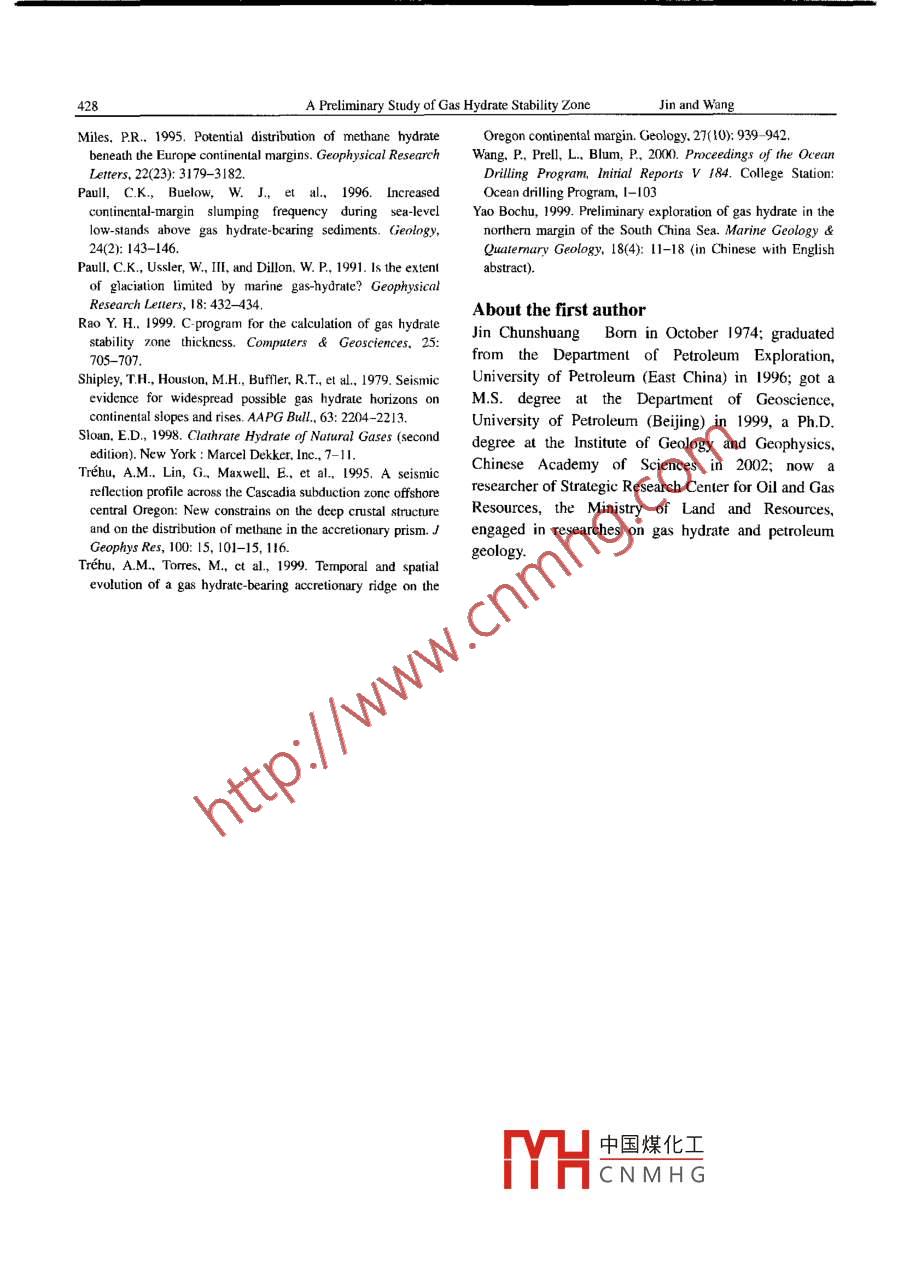 VoL. 76 No.4 ACTA GEOLOGICA SINICA Dcc. 2002A Preliminary Study of the Gas Hydrate Stability Zonen the South China SeaJIN Chunshuang"and WANG Jiyang1 Institute of Geology and Geophysics, Chinese Academy of Sciences, Beijing 1000292 Strategic Research Center for Oil and Gas Resources,Ministry of Land and Resources, Beijing 100034Abstract Based on the analysis of sea-bottom temperature and geothermal gradient, and by means of the phaseoundary curve of gas hydrate and the sea-bottom temperature versus water depth curve in the South China Sea, thispaper studies the temperature and pressure conditions for gas hydrate to keep stable. In a marine environment methanehydrate keeps stable at water depths greater than 550 m in the South China Sea. Further, the thickness of the gas hydratestability zone in the South China Sea was calculated by using the phase boundary curve and temperature-depth equationsThe result shows that gas hydrate have a better perspective in the southeast of the Dongsha Islands, the northeast of theXisha Islands and the north of the Nansha Islands for thicker stability zones.Key words: South China Sea, gas hydrate, stability zone, geothermal gradient, sea-bottom temperature1 Introduction1992)In the south China sea. the bsrs were identified inThe gas hydrate is an ice -like crystalline compound many crests of anticlines, mud volcanoes and mudcontaining methane or other low-molecular weight diapirs in the offshore collisional zone of Taiwan( Chigases in lattices of water molecules. As the main et al., 1998), and in some seismic reflection profiles ofomposition is methane, it is also called methane the Dongsha and Xisha Islands(Yao, 1998).Thesehydrate Gas hydrate are stable under temperature and BSRs confirmed the prospect of gas hydrate in theconditions generally found in permafrost South China Sea, but it is difficult to know theregions and within marine sediments at water depths distribution and thickness of the gas hydrate stabilitygreater than 500 m, and are commonly seen beneath the zone (GHSZ) throughout the areas because of thecontinental slope of both active and passive continental quantity and quality limitation of seismic reflectionmargins (Trehu et al., 1999). They have recently profiles. However, we can determine the distribution ofbecome a major focus of international research because the GHSZ and calculate its thickness through the phasethey represent a valuable global reservoir of boundary curve of gas hydrate and the pressurehydrocarbons(Kvenvolden, 1998), a potential source of temperature equations based on sea-bottom temperaturemethane, an important greenhouse gas(Paull et al., and geothermal gradient. This is of great importance for1991, Dickens et al., 1997), and a possible cause for the the evaluation of gas hydrate resources.instability of continent-marginal sediments( CarpenterAs for the formation pressure-temperature condition1981, Paull et al., 1996)of gas hydrate, Roozeboom(1884, 1885)made the firstIn the past years, the main approach used to evaluate pressure-temperature plot for SO2. When determininge presence of gas hydrate in sediments was based on a hydrate in pipelines, Hammerschmidt( 1934)publishedgeophysical proxy known as the bottom-simulating a correlation summary of over one hundred hydratereflector (BSR). The BSR is a seismic reflector that formation data points. Shortly afterwards, Professor Dmimics the sea floor, cuts original stratigraphic L. Katz and his colleagues began their experimentalreflections in general, and has a negative polarity, study中國煤化工 s that the energyindicating that it results from a decrease in acousticimpedance(Shipley et al., 1979; Hyndman and Spence, ThenCNMHmore attention toial distribution ofPreliminary Study of gas Hydrate Stability zoneJin and wamethane hydrate beneath the European continental 60@C/km and the sea-bottom temperatures are 2C andmargins. Rao(1999)calculated the thickness of gas 4C respectively. The GHSZ is about 500 m thick withhydrate stability zone beneath the India continental a sea-bottom temperature of 2 C and a geothermalmargins. In this paper we use the gas hydrate phase gradient of 40C/km, about 440 m thick with aoundary curve and pressure-temperature equationssea-bottom temperature of 4C and a geothermaldetermine the distribution of the GHSZ and calculate its gradient of 40oC/km, and about 330 m thick withthickness in the South China Sea. The parameters used sea-bottom temperature of 2C and a geothermale water depth, gradient of 60C/km. Thus, we can conclude that theea-botlom temperature, latitude and geothermal greater the geothermal gradient is, the smaller thegradient of sedimentsthickness of the GHSZ will be, and that the higher thethe thinner the ghsz will2 Gas Hydrate Stability Zone and Its be. Similarly, with the same sea-bottom temperaturethe deeper the GHSZ will beThe thickness and distribution area of the ghSz areindispensable for the evaluation of gas hydrate 3 Sea-bottom Temperature and Geothermalresources by means of the cubature. The amount of Gradient in the South China Seamethane in gas hydrate is determined based on theng eqtIn order to determine the thickness and distribution ofV=A×AxHEthe Ghsz, we have analyzed more than 200where V is the amount of methane in gas hydrate; A: theution area of gas hydrate; Az: the mean thicknessof the ghsz; p: the mean porosity of sediments; Hthe compaction percentage of gas hydrate; and E: thecubage-multiplying factor of gas hydrate.The gas hydrate phase diagram in Fig. I reveals thephase equilibrium between three phases, i.e. gashydrate, gas and water in the marine environment. Onthe left of the phase boundary, the pressure andPhase boundary curvemperature conditions are favorable for hydrateBSR and phase boundary curve is the gas hydrate aformation. The area enclosed by the ocean bottom, theGeothermal gradientstability zone. From Figsea-bottom temperature, geothermal gradient, waterSea bottomdepth, and the phase boundary cu