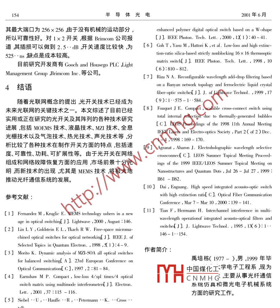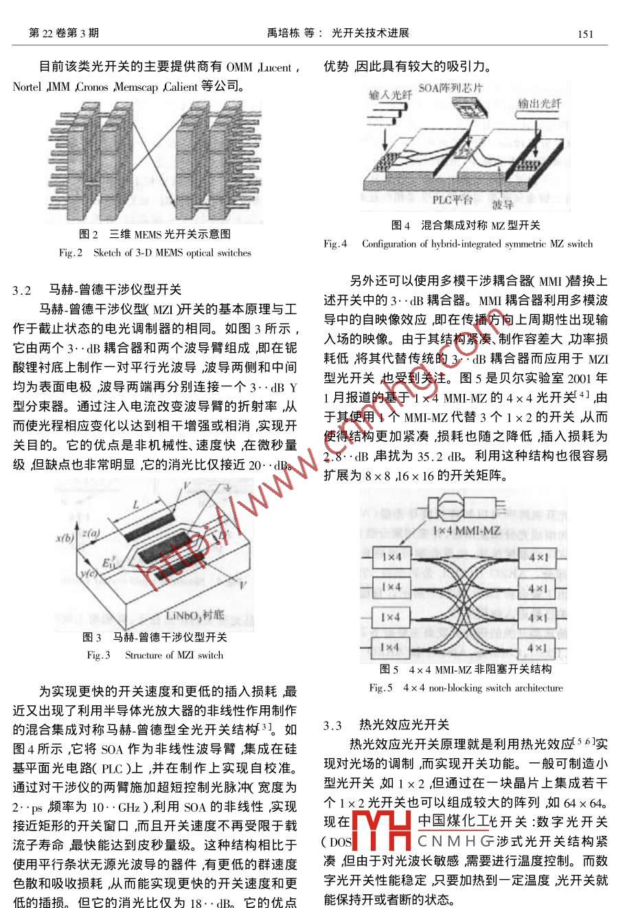 2001年6月Jme200年文章編號(hào):1001- 5868( 2001 )03 - 0149 - 06光開關(guān)技術(shù)進(jìn)展禹培棟,王國忠,陳明華,謝世鐘(清華大學(xué)電子工程系北京10084 )摘要:隨著密集波分復(fù)用技術(shù)的應(yīng)用以及光聯(lián)網(wǎng)的提出光開關(guān)技術(shù)已經(jīng)成為未來光聯(lián)網(wǎng)的關(guān)鍵技術(shù)之-。光開關(guān)廣泛應(yīng)用于交叉連接設(shè)備、保護(hù)倒換、分插復(fù)用器等各種設(shè)備中。綜述了目前已經(jīng)實(shí)用或正在研究的光開關(guān)及陣列的各種制作技術(shù)包括微光電子機(jī)械技術(shù)、液晶技術(shù)、全息光柵技術(shù)以及氣泡技術(shù)、熱光技術(shù)及聲光技術(shù)等詳細(xì)分析了各種技術(shù)相應(yīng)的發(fā)展?fàn)顩r、技術(shù)特點(diǎn)和應(yīng)用范圍并分析了其發(fā)展的趨勢(shì)。關(guān)鍵詞:光開關(guān);光聯(lián)網(wǎng);密集波分復(fù)用;微光電子機(jī)械系統(tǒng)中圖分類號(hào): TN25 ;TN929.11文獻(xiàn)標(biāo)識(shí)碼: ARecent Progress in Optical SwitchingYU Pei-dong , WANG Guo-zhong , CHEN Ming-hua , XIE Shi-zhong( Dept. of Electronic Engineering , Tsinghua University , Beijing 100084 , China )Abstract : With the application of dense wavelength division multiplexing and the advance in opticaltransport network , optical switching has become one of the key techniques for the future. Optical switches canbe applied in optical cross connects and optical add/ drop multiplexing , etc. In this paper ,many kinds ofmanufacture technologies are presented ,including micro-opto-electro- mechanical- system,liquid crystals , holo-grams, liquid gratings , bubbles , and acousto-optics. Different applications and recent progress of variousswitching technologies are discussed.Key words : optical switching ; optical transport network ; DWDM ; MOEMS1引言2光開關(guān)應(yīng)用范圍介紹隨著光纖通信技術(shù)的發(fā)展和密集波分復(fù)用光開關(guān)是全光交換中的關(guān)鍵器件,可實(shí)現(xiàn)在全(DWDM)系統(tǒng)的應(yīng)用,光聯(lián)網(wǎng)(OTN)已經(jīng)成為網(wǎng)絡(luò):光層的路由選擇、波長(zhǎng)選擇、光交叉連接以及自愈保發(fā)展的趨勢(shì),光開關(guān)技術(shù)已經(jīng)成為未來光聯(lián)網(wǎng)的關(guān)護(hù)等功能。目前光開關(guān)主要應(yīng)用包括1-4]:鍵技術(shù)之一。光聯(lián)網(wǎng)的實(shí)現(xiàn)主要依賴于光開關(guān)、光( 1 )光交叉連接( 0XC) 0XC由光開關(guān)矩陣組濾波器、新一代放大器、密集波分復(fù)用技術(shù)等器件和成主要實(shí)現(xiàn)動(dòng)態(tài)光路徑管理、光網(wǎng)絡(luò)的故障保護(hù)、技術(shù)的進(jìn)展。其中DWDM技術(shù)的發(fā)展是推動(dòng)光纖靈活增加新業(yè)務(wù)等。光交叉連接對(duì)開關(guān)的要求主要通信網(wǎng)絡(luò)發(fā)展的重要因素而光聯(lián)網(wǎng)的提出將使設(shè)有低中國煤化工以及無阻塞運(yùn)作。目備制造商、電信運(yùn)營(yíng)商都面臨巨大的機(jī)遇與挑戰(zhàn)。前微CNMHG術(shù)已經(jīng)在光交換應(yīng)用中進(jìn)入了現(xiàn)場(chǎng)實(shí)驗(yàn)階段1]由于其對(duì)波長(zhǎng)、數(shù)據(jù)速率和信號(hào)格式都透明在不遠(yuǎn)的將來有希望實(shí)現(xiàn)光層收稿日期2000- 10-31.基金項(xiàng)目國家863計(jì)劃光電子主題項(xiàng)目( 863- 307- 15-3).上的交換;(2)用光開關(guān)實(shí)現(xiàn)網(wǎng)絡(luò)的自動(dòng)保護(hù)倒換。當(dāng)光150半導(dǎo)體光電2001年6月纖斷裂或傳輸發(fā)生故障時(shí)就可以通過光開關(guān)改變mso這種二維技術(shù)受光程損耗的限制最大可以實(shí)業(yè)務(wù)的傳輸路徑實(shí)現(xiàn)對(duì)業(yè)務(wù)的保護(hù)。通常這種?,F(xiàn)32x32端口不過可以將多個(gè)子系統(tǒng)連接起來形護(hù)倒換只需1 x2端口的光開關(guān)就可以實(shí)現(xiàn);成更大的交叉矩陣。(3)用1x N光開關(guān)實(shí)現(xiàn)網(wǎng)絡(luò)監(jiān)控。在遠(yuǎn)端光一般MEMS光開關(guān)的開關(guān)時(shí)間都在毫秒量級(jí),纖測(cè)試點(diǎn)通過1x N光開關(guān)把多根光纖接到-個(gè)光在與其他技術(shù)比較中處于劣勢(shì)。另外,由于MEMS時(shí)域反射儀( OTDR )上通過光開關(guān)倒換實(shí)現(xiàn)對(duì)所有光開關(guān)是利用微鏡的機(jī)械轉(zhuǎn)動(dòng)來實(shí)現(xiàn)開關(guān)功能的,光纖的監(jiān)測(cè)。另外,利用光開關(guān)也可以在光纖線路所以任何機(jī)械摩擦、磨損以及外部振動(dòng)都可能使它中插入網(wǎng)絡(luò)分析儀實(shí)現(xiàn)網(wǎng)絡(luò)在線分析;的可靠性降低。驅(qū)動(dòng)結(jié)構(gòu)方面,目前靜電和磁感應(yīng)(4)光纖通信器件測(cè)試。光器件、光纜以及子逐漸成為MEMS光開關(guān)的主要選擇。靜電驅(qū)動(dòng)能力系統(tǒng)產(chǎn)品在測(cè)試過程中,可以使用光開關(guān)同時(shí)測(cè)試.較低而磁感應(yīng)驅(qū)動(dòng)還需要解決系統(tǒng)的屏蔽、封裝以多個(gè)器件,從而簡(jiǎn)化測(cè)試提高效率;及可靠性問題。因此靜電驅(qū)動(dòng)方案目前仍是首選,(5)光上下路復(fù)用( OADM)。 光上下路復(fù)用器而且已經(jīng)有很多靜電驅(qū)動(dòng)的開關(guān)產(chǎn)品投入市場(chǎng)。主要應(yīng)用于環(huán)形的城域網(wǎng)中,實(shí)現(xiàn)單個(gè)波長(zhǎng)和多個(gè)波長(zhǎng)從光路上自由上下
