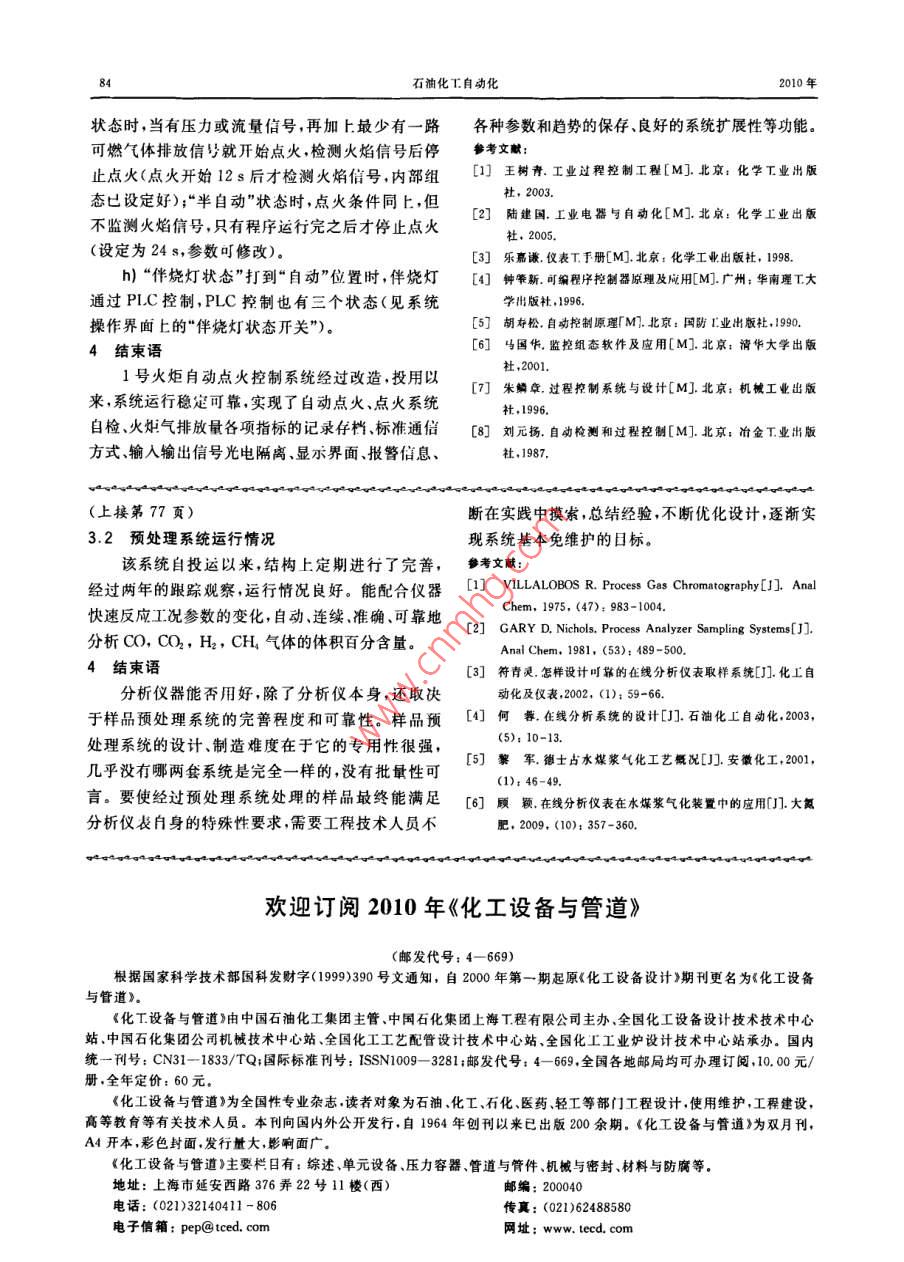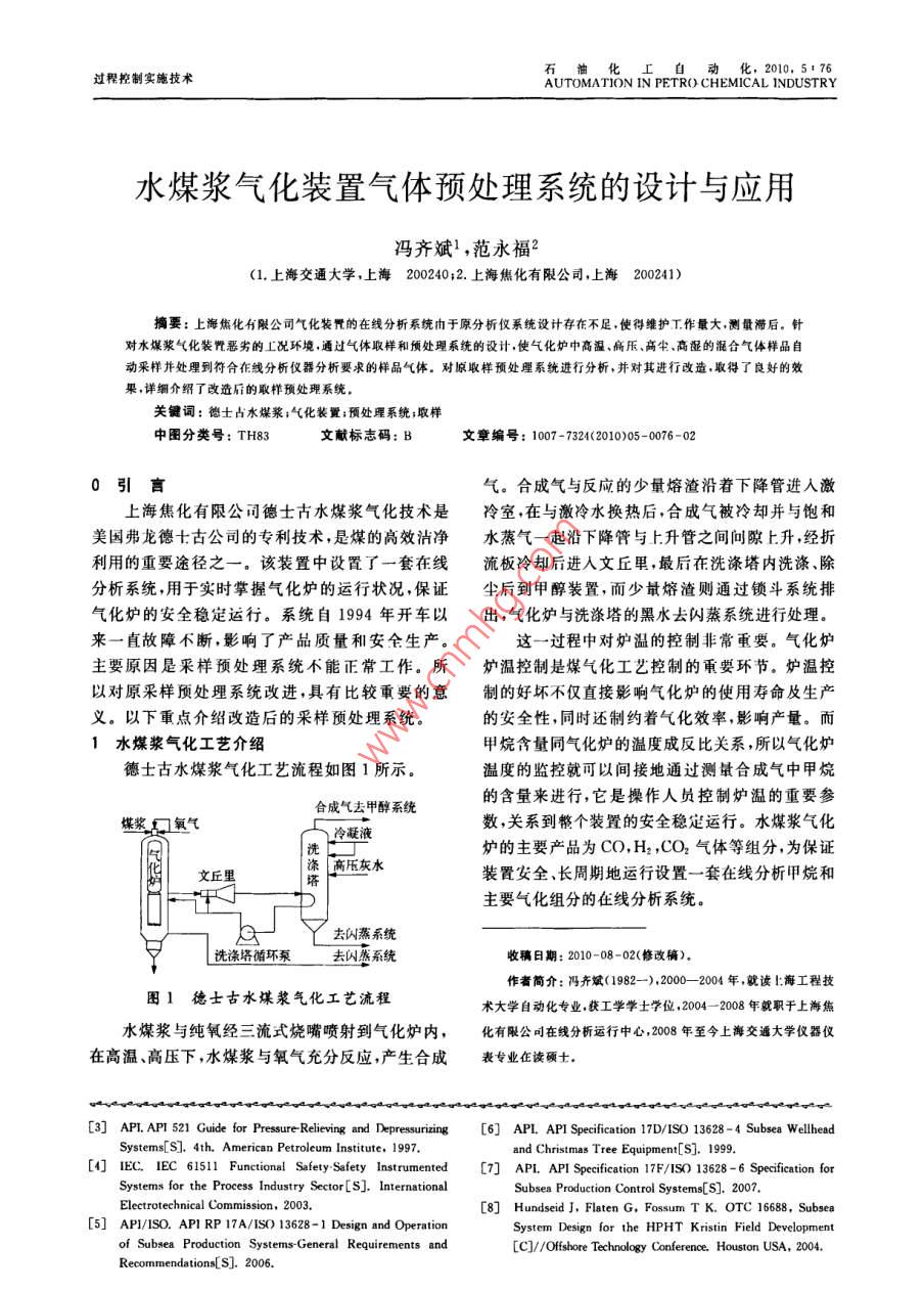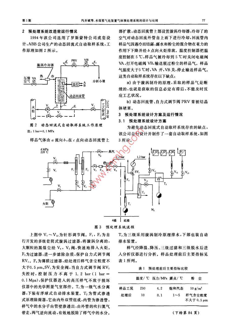 過程控制實施技術石油化工自動化,2010,5176AUTOMATION IN PETRO CHEMICAL INDUSTRY水煤漿氣化裝置氣體預處理系統(tǒng)的設計與應用馮齊斌1,范永福(1.上海學,上海200240;2.上海焦化有限公司,上海20241)摘要:上海焦化有限公司氣化裝置的在線分析系統(tǒng)由于原分析儀系統(tǒng)設計存在不足,使得維護工作量大測量滯后。針對水煤漿氣化裝置惡劣的工況環(huán)境,通過氣體取樣和預處理系統(tǒng)的設計,使氣化爐中高溫、高壓、高塵、高濕的混合氣體樣品自動釆樣并處理到符合在線分析儀器分析要求的樣品氣體。對原取樣預處理系統(tǒng)進行分析,并對其進行改造,取得了良好的效果,詳細介紹了改造后的取樣預處理系統(tǒng)關鍵詞:德士占水煤漿;氣化裝置;預處理系統(tǒng);取樣中圖分類號:TH83文獻標志碼:B文章編號:1007-7324(2010)05-0076-02氣。合成氣與反應的少量熔渣沿著下降管進入激上海焦化有限公司德士古水煤漿氣化技術是冷室,在與激冷水換熱后,合成氣被冷卻并與飽和美國弗龍德士古公司的專利技術,是煤的高效潔凈水蒸氣一起沿下降管與上升管之間間隙上升,經(jīng)折利用的重要途徑之一。該裝置中設置了一套在線流板冷卻后進入文丘里,最后在洗滌塔內(nèi)洗滌、除分析系統(tǒng),用于實時掌握氣化爐的運行狀況,保證塵后到甲醇裝置,而少量熔渣則通過鎖斗系統(tǒng)排氣化爐的安全穩(wěn)定運行。系統(tǒng)自1994年開車以出,氣化爐與洗滌塔的黑水去閃蒸系統(tǒng)進行處理。來一直故障不斷,影響了產(chǎn)品質(zhì)量和安全生產(chǎn)這一過程中對爐溫的控制非常重要。氣化爐主要原因是釆樣預處理系統(tǒng)不能正常工作。所爐溫控制是煤氣化工藝控制的重要環(huán)節(jié)。爐溫控以對原采樣預處理系統(tǒng)改進,具有比較重要的意制的好壞不僅直接影響氣化爐的使用壽命及生產(chǎn)義。以下重點介紹改造后的采樣預處理系統(tǒng)。的安全性,同時還制約著氣化效率,影響產(chǎn)量。而1水煤漿氣化工藝介紹甲烷含量同氣化爐的溫度成反比關系,所以氣化爐德士古水煤漿氣化工藝流程如圖1所示。溫度的監(jiān)控就可以間接地通過測量合成氣中甲烷合成氣去甲醇系統(tǒng)的含量來進行,它是操作人員控制爐溫的重要參煤漿幻氧氣冷凝液數(shù),關系到幣個裝置的安全穩(wěn)定運行。水煤漿氣化爐的主要產(chǎn)品為CO,H2,CO2氣體等組分,為保證文丘里滌[高壓灰水裝置安全、長周期地運行設置一套在線分析甲烷和主要氣化組分的在線分析系統(tǒng)。去閃蒸系統(tǒng)洗滌塔循環(huán)泵收稿日期:2010-08-02(修改稿)作者簡介:馮齊斌(1982-),2000-2004年,就讀上海工程技圖1德士古水煤漿氣化工藝流程術大學自動化專業(yè)獲工學學士學位,2004-2008年就職于上海焦水煤漿與純氧經(jīng)三流式燒嘴噴射到氣化爐內(nèi),化有限公吲在線分析運行中心,2008年至今上海交通大學僅器儀在高溫、高壓下,水煤漿與氧氣充分反應,產(chǎn)生合成表專業(yè)在讀碩土--Huwarderearrreo[3] APL. APl 521 Guide for Pressure-Relieving and Depressurizing [6] APL. API Specification 17D/ISO 13628-4 Subsea WellheadSystems[S]. 4th. American Petroleum Institute[4J IEC. IEC 61511 Functional Safety- Safety Instrumented [7] APL. API Specification 17F/1S0 13628-6 Specification forSystems for the Process Industry Sector [S]. InternationalSubsea Production Control Systems[S]. 2007.Electrotechnical Commission, 2003[8] Hundseid ], Flaten G, Fossum T K. OTC 16688, Subsea5] API/ISO. API RP 17A/ISO 13628-1 Design and OperationSystem Design for the HPHT Kristin Field Developmentof Subsea Production Systems-General Requirements and[CI//Offshore Technology Conference. Houston USA, 2004Recommendations[S].2006.第5期馮齊斌等.水煤漿氣化裝置氣體預處理系統(tǒng)的設計與應用2預處理系統(tǒng)改造前運行情況部擴散,動態(tài)回流管上部設置漩渦冷卻器冷卻了的1994年該公司選用了羅斯蒙特公司成套設空氣對動態(tài)回流外管自上而下進行冷卻,回流管內(nèi)計,ABB公司生產(chǎn)的動態(tài)回流式自動取樣系統(tǒng),工樣品氣因遇冷而結露露水和粉塵的混合物在重力的作原理如圖2所示。作用下下降并經(jīng)b點向火炬排放。溫度挖制器把溫度控制在5℃,樣品氣被冷卻到5℃時關閉電磁閥PRV漩渦冷VA,打開電磁閥V,輸送脫過粉塵的樣品氣。樣品氣溫度大于5℃時,Ⅵ開,VB關,停止輸送樣品氣。這類自動取樣系統(tǒng)存在以下缺點家廣母分析小星a)由于漩渦制冷的原理,采取的樣品氣是斷續(xù)的,也就是獲取的信息必定有滯后,不能及時反動態(tài)回流管應工藝狀況b)動態(tài)回流管、自力式調(diào)節(jié)閥PRv常被結晶體堵塞。3預處理系統(tǒng)設計方案及運行情況3.1預處理系統(tǒng)設計方案圖2動態(tài)回流式自動取樣系統(tǒng)工作原理為避免動態(tài)回流式自動取樣系統(tǒng)存在的缺點注;1bar=0該公司自行設計并制作了一套自動取樣系統(tǒng),如圖樣品氣體由a流向b,在c點向動態(tài)回流管上3所示改燕汽1. 2 bar1. 2 bar1°火炬樓|底樓圖3預處理系統(tǒng)流程上圖中V1~V1為針形調(diào)節(jié)閥。F1,F2為自T為三級采用漩渦制冷原理排水,下部也裝自動行開發(fā)的多級套筒式漩渦過濾器,將漩渦分離的,排水裝置。大顆粒的黑煤塵經(jīng)V,V5閥,快速地排入火炬。樣氣經(jīng)降溫、降壓、三級過濾和三級脫水后進F為過濾器,進一步濾除雜質(zhì),保護自力式調(diào)