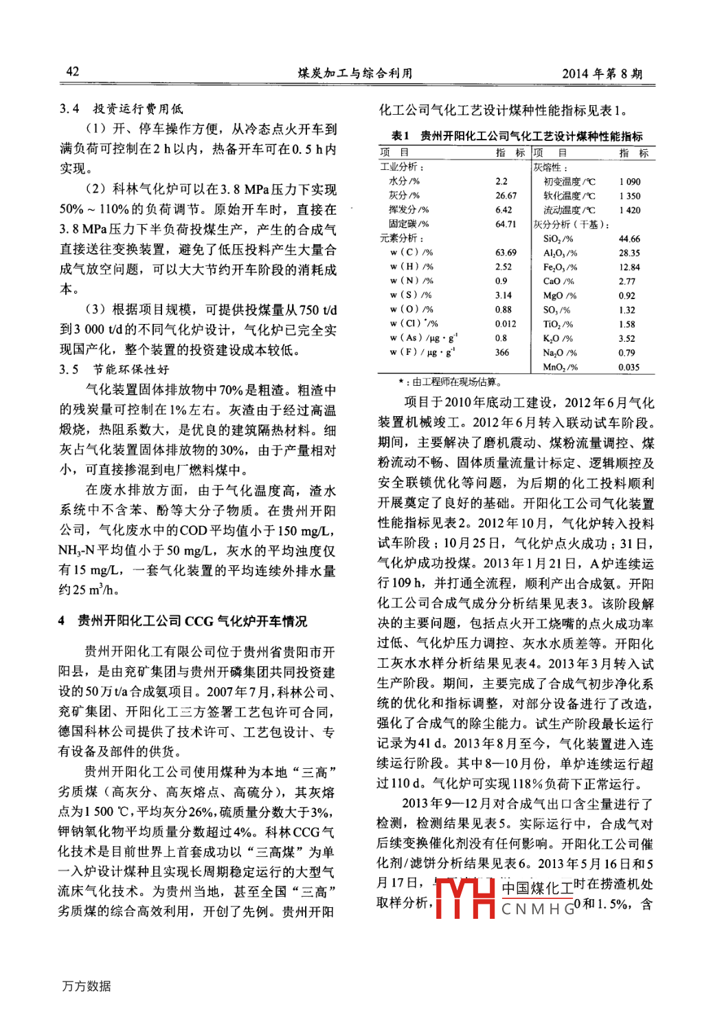 煤炭加工與綜合利用40COAL PROCESSING & COMPREHENSIVE UTILIZATIONNo.8, 2014科林CCG粉煤氣化技術(shù)特點(diǎn)及應(yīng)用賈彧智(德國科林工業(yè)技術(shù)有限責(zé)任公司,北京100004)摘要:介紹了科林CCG粉煤氣化技術(shù)的特點(diǎn)及貴州開陽化工公司氣化裝置試車情況;科林CCG氣化爐以貴州當(dāng)?shù)馗吡?、高灰分和高灰熔點(diǎn)煤為原料,實(shí)現(xiàn)了煤炭清潔轉(zhuǎn)化,為我國劣質(zhì)“三高”煤綜合高效利用開辟了一條新的途徑。關(guān)鍵詞:煤氣化;水冷壁;多噴嘴;高硫煤;灰分;灰熔點(diǎn)中圖分類號(hào): TQ546文獻(xiàn)標(biāo)識(shí)碼: A文章編號(hào): 1005-8397 (2014) 08-0040-04德國科林工業(yè)技術(shù)有限貴任公司在干粉煤氣工藝蒸汽流床氣化技術(shù)領(lǐng)域擁有四十多年的研發(fā)、設(shè)計(jì)、-常壓煤廠氧氣一→合成氣文丘里←工藝制造、建設(shè)及運(yùn)行經(jīng)驗(yàn),擁有科林CCG粉煤氣化冷凝液技術(shù)獨(dú)立完整的知識(shí)產(chǎn)權(quán)及工業(yè)解決方案?!7鬯宜每屏值膭?chuàng)始人是前德國燃料研究所研發(fā)部部(破碎/長(zhǎng)Wolf博士,其核心技術(shù)團(tuán)隊(duì)來自于前德國燃料煤粉研究所及黑水泵氣化廠。20世紀(jì)90年代,Wolf給料罐黑水處理博士與其同事共同創(chuàng)立了科林,并在黑水泵氣化磨煤機(jī)撈渣機(jī)廢水濾餅釋放氣廠200MW工業(yè)化裝置的基礎(chǔ)上完成了CCG粉煤氣化技術(shù)的研發(fā)工作。圖1科林 CCG粉煤氣化技術(shù)工藝流程1科林CCG 氣化工藝流程2科林CCG氣化爐結(jié)構(gòu)德國科林CCG粉煤氣化技術(shù)是干法粉煤加壓氣化爐由燒嘴、燃燒室、激冷室、水冷壁、進(jìn)料,以氧氣作為氧化劑并通過液態(tài)排渣的煤氣外殼等部分組成。圖2為科林CCG氣化爐?;夹g(shù)。該技術(shù)工藝主要包括:煤粉輸送系統(tǒng)、2.1燒嘴氣化與激冷系統(tǒng)、合成氣凈化系統(tǒng)、排渣系統(tǒng)及CCG氣化爐為多噴嘴頂置形式,分為引燃燒黑水處理系統(tǒng)??屏諧CG粉煤氣化技術(shù)工藝流程嘴和煤粉燒嘴。在開車和停車時(shí)候,利用液化氣示于圖1。混合氮?dú)庾鳛橐紵斓娜細(xì)?。在氣化爐運(yùn)行過程中,出于安全的考慮,引燃燒嘴在較小的功率下運(yùn)行(長(zhǎng)明燈)??梢岳醚h(huán)回送的合成氣收稿日期: 2014-07-31作者簡(jiǎn)介:賈彧智(1982- -),男,重慶人,2006年畢業(yè)于英國作為引燃燒嘴的燃料。由于長(zhǎng)明燈反應(yīng)放熱也是倫敷帝國理工大學(xué)機(jī)械工程系,理學(xué)碩士,德國科林工業(yè)技術(shù)有限氣化反應(yīng)中國煤化工成額外的能量責(zé)任公司北京代表處首席代表。損耗??芛HCNMHG2014年第8期賈或智:科林CCG粉煤氣化技術(shù)特點(diǎn)及應(yīng)用413科林CCG氣化技術(shù)特點(diǎn)及優(yōu)勢(shì)3.1煤種適應(yīng)性廣(1)粉煤氣化技術(shù)克服了部分煤種難以制漿的問題,可避免將大量的水帶入氣化爐,且氣化效率、碳轉(zhuǎn)化率等指標(biāo)高。(2)可以氣化無煙煤、煙煤、褐煤等煤種??屏謿饣夹g(shù)在貴州開陽化工的項(xiàng)目是應(yīng)用貴州本地高灰分、高灰熔點(diǎn)、高硫煤種,即“三高煤”,的最好例證。而最早在德國黑水泵廠的200 MW粉煤氣化爐應(yīng)用的是德國本地的褐煤。(3)德國科林公司擁有完整的煤種數(shù)據(jù)庫和圖2科林CCG氣化爐氣化用煤的理論體系,能夠針對(duì)該項(xiàng)目的不同煤種提供多種配煤或配灰方案。3.2水冷壁結(jié) 構(gòu)000.工藝燒嘴(1)這種結(jié)構(gòu)壽命長(zhǎng),檢修少,無需耐火磚,在線率高。水冷壁的壽命可達(dá)25 a,每半年檢修一次。(2)采用水冷壁結(jié)構(gòu)在開停車時(shí)不存在熱壁爐的烘爐問題,從冷態(tài)開車到滿負(fù)荷僅需要1 h,可以快速響應(yīng)下游對(duì)合成氣需求。(3)采用水冷壁進(jìn)行以渣抗渣,氣化反應(yīng)的溫度可以較高,不會(huì)對(duì)爐體有所損害,而對(duì)于熱壁爐則需要考慮氣化溫度對(duì)耐火材料的影響。故點(diǎn)火燒嘴水冷壁氣化爐可以氣化灰熔點(diǎn)較高的煤種,進(jìn)一圖3 科林CCG燒嘴分布步提高了煤種的適應(yīng)性。3.3多 燒嘴頂置下噴2.2燃燒室(1)多噴嘴布置保證了粉煤在反應(yīng)空間分布煤粉、氧氣和水蒸氣通過燒嘴進(jìn)入燃燒室,均勻,流場(chǎng)分布更加合理,在相同的氣化溫度下,發(fā)生部分氧化反應(yīng)。燃燒室是由齒形蛇管卷水冷與單噴嘴相比可以實(shí)現(xiàn)更高的碳轉(zhuǎn)化率。壁圍成的圓柱形空間,上部為燒嘴,下部為排渣口,(2)多噴嘴結(jié)構(gòu)可以更好地實(shí)現(xiàn)氣化爐內(nèi)壁原料與氧氣、水蒸氣的氣化反應(yīng)就在此空腔內(nèi)進(jìn)掛渣,尤其在氣化爐頂部可以形成較好的渣層。行。第一次開車后水冷壁被掛上一層渣,在后續(xù)良好的掛渣是保證氣化爐較高操作溫度的前提,運(yùn)行中利用以渣抗渣的原理保護(hù)水冷壁??屏謿饣癄t可以直接氣化灰熔點(diǎn)在1 500'C的貴州2.3激冷室“三高煤”正是基于這一點(diǎn)。激冷室位于氣化爐的下部,高溫粗煤氣和熔(3)燒嘴頂置下噴的方案可以使高溫粗氣及渣從氣化室下部一個(gè)喇叭形的排渣口通過激冷環(huán)灰渣流向相同,以確保燃燒室排渣順暢。可以克及下降管進(jìn)入激冷室液面以下,高溫合成氣在激服氣渣上下分流工藝固有的排渣困難,燒嘴同向冷室內(nèi)水浴