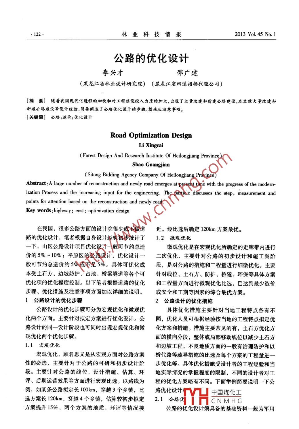 林業(yè)科技情報2013 Vol. 45 No.1公路的優(yōu)化設(shè)計李興才邵廣建(黑龍江省林業(yè)設(shè)計研究院) ( 黑龍江省四通招標(biāo)代理公司)[摘要]隨著我國現(xiàn)代化進程的加快和對工程建設(shè)投入力度的加大,出現(xiàn)了大量改建和新建公路建設(shè),本文就大量改建和新建公路建設(shè)等設(shè)計經(jīng)驗,簡要闡述了公路優(yōu)化設(shè)計的步驟、措施及注意事項。[關(guān)鍵詞]公路 ;造價;優(yōu)化設(shè)計Road Optimization DesignLi Xingcai( Forest Design And Research Institute Of Heilongjiang Province)Shao Guangjian( Sitong Bidding Agency Company Of Heilongjiang Province)Abstract:A large number of reconstruction and newly road emerges at present time with the progress of the modern-ization Process and the increasing input for the engineering. The particle discusses the step, measurement andpoints for attention based on the reconstruction and newly road.Key words :highway; cost; optimization design在我國,很多公路方面的設(shè)計院很少或不做道近。經(jīng)比選后確定120km方案最優(yōu)。路的優(yōu)化設(shè)計,筆者根據(jù)自身設(shè)計經(jīng)驗初步統(tǒng)計了1.2 微觀優(yōu)化一下,山區(qū)公路設(shè)計項目優(yōu)化設(shè)計一般可節(jié)約總造微觀優(yōu)化是在宏觀優(yōu)化所確定的走廊帶內(nèi)進行價的5%~10%;平原區(qū)的公路設(shè)計,優(yōu)化設(shè)計一二次優(yōu)化,主要針對公路的初步設(shè)計和施工圖階般可節(jié)約總造價約5%或不足5%。具體可優(yōu)化成段,是對公路的措施和工程量進行細微優(yōu)化。主要本受土石方、邊坡防護、占地、橋梁隧道等各個可針對線位、土石方、防護、橋隧、環(huán)保等具體方案優(yōu)化項的優(yōu)化程度控制。以下筆者根據(jù)道路的優(yōu)化和工程量方面進行微觀優(yōu)化比選,已達到最少造價步驟、優(yōu)化措施及注意事項方面加以詳細的說明?;虬踩凸て诘纫蛩氐木C合最優(yōu)方案。1公路設(shè)計的優(yōu)化步驟2公路設(shè)計的優(yōu)化措施公路設(shè)計的優(yōu)化步驟可分為宏觀優(yōu)化和微觀優(yōu)具體優(yōu)化措施主要針對當(dāng)?shù)毓こ烫攸c各有不化兩個方面。主要針對擬定方案進行優(yōu)化設(shè)計。公同,優(yōu)化人員可根據(jù)經(jīng)驗按當(dāng)?shù)氐墓こ烫攸c擬定優(yōu)路設(shè)計的同- -設(shè)計階段也可同時出現(xiàn)宏觀優(yōu)化和微化方案和措施。措施主要常見的有,土石方優(yōu)化方觀優(yōu)化兩個優(yōu)化步驟。面的橫向分段,整體或局部移動線位以減少土石方1.1 宏觀優(yōu)化和邊坡工程,不良地質(zhì)方面的一般有治理防護和以宏觀優(yōu)化,顧名思義是從宏觀方面對公路方案橋代路等疏導(dǎo)措施的比選及每個方案的工程量進-性的必選,主要針對于公路的可研和初步設(shè)計階步優(yōu)化等。具體優(yōu)化措施受設(shè)計者的工程經(jīng)驗和當(dāng)段。主要針對公路的線位、設(shè)計措施、估算、環(huán)地實際情況的掌握程度的限制,不同的設(shè)計者對工評、后期運營效果等方面進行宏觀比選。以路線為程的優(yōu)化方案略有不同。下面舉例簡要說明- -下公例,如某條公路擬定長100km,穿越3個鄉(xiāng)鎮(zhèn),比路優(yōu)化設(shè)計中國煤化工選方案長120km,穿越4個鄉(xiāng)鎮(zhèn),估算較初步擬定2.1公路優(yōu)YHCNMHG方案提升15%,兩個方案的地質(zhì)、環(huán)評等情況接公路的優(yōu)化設(shè)計須具備的基礎(chǔ)資料-般為軍用林業(yè)科技情報2013 Vol. 45 No.1(2)并用電子表格讀人緯地文件或CAD文件觀優(yōu)化和微觀優(yōu)化都要充分考慮,并充分計算各方并批量處理出土石方、支檔和深路塹等控制工程案的總體指標(biāo),從而確定最終設(shè)計方案。量。以土方比選為例,如下表所示(部分表格):4結(jié)束語(3)針對各交點最有利位置重新修正線形,以上闡述了道路設(shè)計過程中的優(yōu)化設(shè)計,優(yōu)化并修正縱斷。然后線位數(shù)據(jù)文件定稿,優(yōu)化結(jié)束。過程中需 要相應(yīng)設(shè)計階段的地質(zhì)水文、測繪等數(shù)最后確定的線位終稿,土石方由611萬方優(yōu)化據(jù),一般公路各專業(yè)組需做以下比選:路線做平縱至525萬方,深路塹或半洞減少約2km,支檔略有橫等分別比選;路基做坡率,支檔防護,不良地質(zhì)增加,橋涵無變化,占地減少約10萬平。總造價等分別比選;橋遂做橋型構(gòu)造比選,另各專業(yè)組可減少超5%。做交集方案比選等等,具體設(shè)計時設(shè)計人員可根據(jù)本次只列舉了實例項目的幾種優(yōu)化措施和優(yōu)化設(shè)計經(jīng)驗和地方習(xí)慣對無比選意義或比選相差懸殊過程,優(yōu)化措施中另用到了局部展線比選,以橋代的方案,不進行比選,直接確定設(shè)計方案,對于有路比選,縱斷優(yōu)化比選等等,這里不一一列出。比選價值的方案應(yīng)在設(shè)計中體現(xiàn),以便業(yè)主和各審3優(yōu)化注意事項查專家會上討論,進而確定最合理的方案。(1)注意優(yōu)化范圍,如土石方比選過程中,參考文獻最優(yōu)線位進了不良地質(zhì)區(qū),此種情況應(yīng)加入比選控[1] 孫延良?;谒帘3掷砟畹纳鷳B(tài)公路建設(shè)制因素或上升至宏觀比選。[J].森林工程, 2011, 27 (3): 80 - 82(2)注意優(yōu)化控制,如具體的控制節(jié)點,控+91.制高程,控制措施等等。- -般控制因素不宜過多,[2] 