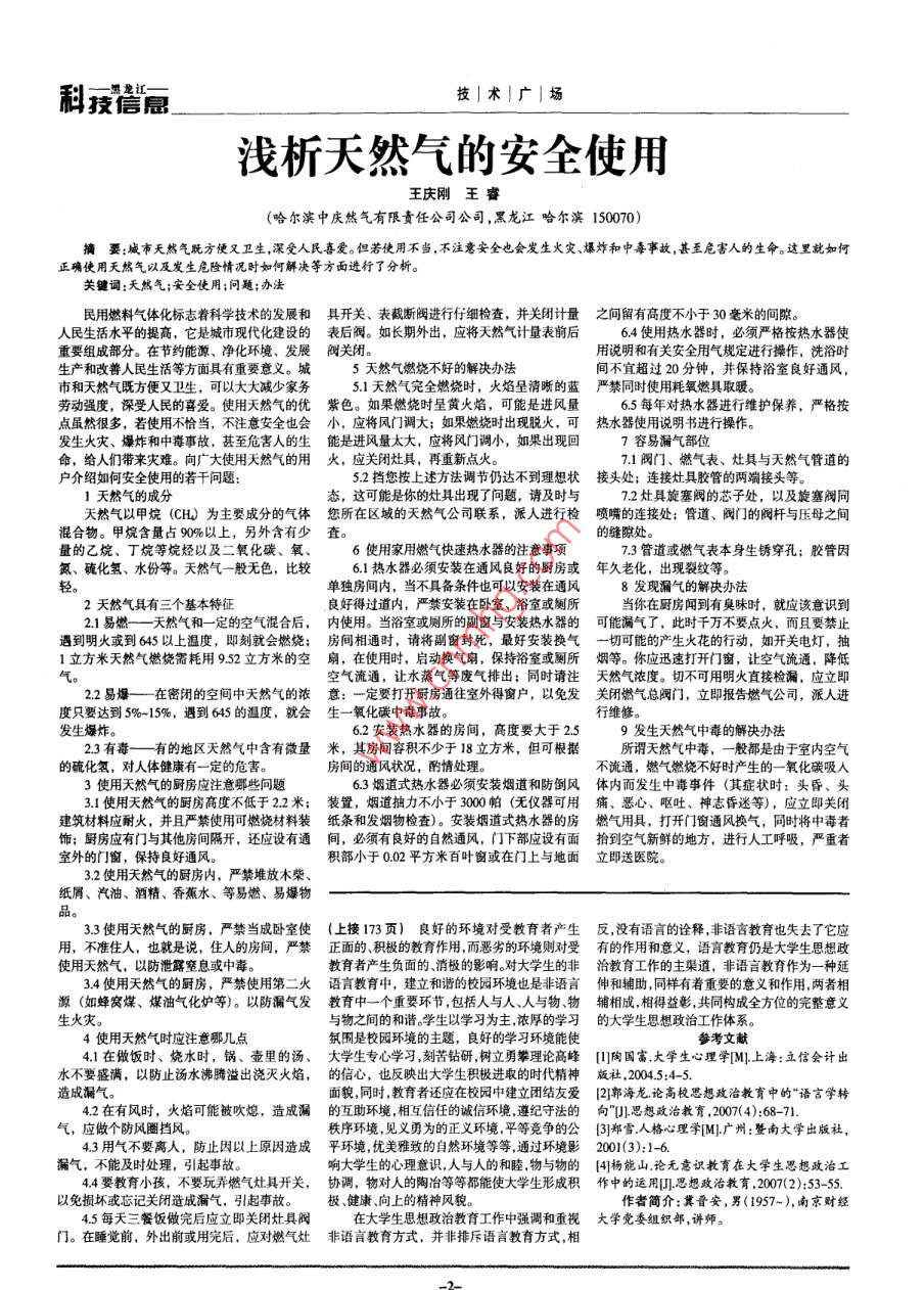 科技信層技術|廣|場淺析天然氣的安全使用王慶剛王睿(哈爾濱中慶然氣有限責任公司公司,黑龍江哈爾濱150070)擴要:城市天然氣既方便又衛(wèi)生,深受人民喜愛。但若使用不當,不注意安全也會發(fā)生火災、爆炸和中毒事故,甚至危害人的生命。這里就如何正確使用天然氣以及發(fā)生危險情況時如何解決等方面進行了分析。關鍵詞:天然氣;安全使用;問題;辦法民用燃料氣體化標志著科學技術的發(fā)展和具開關、表截斷閥進行仔細檢查,并關閉計量之間留有高度不小于30毫米的間隙人民生活水平的提高,它是城市現(xiàn)代化建設的表后閥。如長期外出,應將天然氣計量表前后64使用熱水器時,必須嚴格按熱水器使重要組成部分。在節(jié)約能源、凈化環(huán)境、發(fā)展閥關閉。用說明和有關安全用氣規(guī)定進行操作,洗浴時生產(chǎn)和改善人民生活等方面具有重要意義。城間不宜超過20分鐘,并保持浴室良好通風市和天然氣既方便又衛(wèi)生,可以大大減少家務51天然氣完全燃燒時,火焰呈清晰的藍嚴禁同時使用耗氧燃具取暖。勞動強度,深受人民的喜愛。使用天然氣的優(yōu)紫色。如果燃燒時呈黃火焰,可能是進風量65每年對熱水器進行維護保養(yǎng),嚴格按點雖然很多,若使用不恰當,不注意安全也會小,應將風門調(diào)大;如果燃燒時出現(xiàn)脫火,可熱水器使用說明書進行操作發(fā)生火災、爆炸和中毒事故,甚至危害人的生能是進風量太大,應將風門調(diào)小,如果出現(xiàn)回7容易漏氣部位命,給人們帶來災難。向廣大使用天然氣的用火,應關閉灶具,再重新點火7.1閥門、燃氣表、灶具與天然氣管道的戶介紹如何安全使用的若干問題52擋您按上述方法調(diào)節(jié)仍達狀接頭處;連接灶具膠管的兩端接頭等天然氣的成分態(tài),這可能是你的灶具出現(xiàn)了問題,72灶具旋塞閥的芯子處,以及旋塞閥同天然氣以甲烷(CH)為主要成分的氣體您所在區(qū)域的天然氣公司聯(lián)系檢噴嘴的連接處;管道、閥門的閥桿與壓母之間混合物。甲烷含量占90%以上,另外含有少查量的乙烷、丁烷等烷烴以及二氧化碳、氧、6使用家用燃氣快速熱水器的注意事項73管道或燃氣表本身生銹穿孔;膠管因氮、硫化氫、水份等。天然氣一般無色,比較61熱水器必須安裝在通風良好的廚房或年久老化,出現(xiàn)裂紋等單獨房間內(nèi),當不具備條件也可以安裝在通風8發(fā)現(xiàn)漏氣的解決辦法2天然氣具有三個基本特征良好得過道內(nèi),嚴禁安裝在臥室、浴室或廁所當你在廚房聞到有臭味時,就應該意識到21易燃—一—天然氣和一定的空氣混合后,內(nèi)使用。當浴室或廁所的副窗與安裝熱水器的可能漏氣了,此時千萬不要點火,而且要禁止遇到明火或到645以上溫度,即刻就會燃燒;房間相通時,請將副窗封死,最好安裝換氣一切可能的產(chǎn)生火花的行動,如開關電燈,抽1立方米天然氣燃燒需耗用9.52立方米的空扇,在使用時,啟動換氣扇,保持浴室或廁所煙等。你應迅速打開門窗,讓空氣流通,降低空氣流通,讓水蒸氣等廢氣排出;同時請注天然氣濃度。切不可用明火直接檢漏,應立即度只要達到5%15%,遇到645的溫度,就會生一氧化碳中往室外得窗戶,以免發(fā)關閉燃氣總閱門,立即報告燃氣公司,派人進22易爆—在密閉的空間中天然氣的濃意:一定要打開廚房發(fā)生爆炸62安裝熱水器的房間,高度要大于259發(fā)生天然氣中毒的解決辦法23有毒—有的地區(qū)天然氣中含有微量米,其房間容積不少于18立方米,但可根據(jù)所謂天然氣中毒,一般都是由于室內(nèi)空氣的硫化氫,對人體健康有一定的危害。房間的通風狀況,酌情處理。不流通,燃氣燃燒不好時產(chǎn)生的一氧化碳吸入3使用天然氣的廚房應注意哪些問題63煙道式熱水器必須安裝煙道和防倒風體內(nèi)而發(fā)生中毒事件(其癥狀時:頭昏、頭3.I使用天然氣的廚房高度不低于2.2米;裝置,煙道抽力不小于300帕(無儀器可用痛、惡心、嘔吐、神志昏迷等),應立即關閉建筑材料應耐火,并且嚴禁使用可燃燒材料裝紙條和發(fā)煙物檢查)。安裝煙道式熱水器的房燃氣用具,打開門窗通風換氣,同時將中毒者飾;廚房應有門與其他房間隔開,還應設有通間,必須有良好的自然通風,門下部應設有面抬到空氣新鮮的地方,進行人工呼吸,嚴重者室外的門窗,保持良好通風。積部小于0.02平方米百葉窗或在門上與地面立即送醫(yī)院32使用天然氣的廚房內(nèi),嚴禁堆放木柴、紙屑、汽油、酒精、香蕉水、等易燃、易爆物33使用天然氣的廚房,嚴禁當成臥室使(上接173頁)良好的環(huán)境對受教育者產(chǎn)生反沒有語言的詮釋,非語言教育也失去了它應用,不準住人,也就是說,住人的房間,嚴禁正面的、積極的教育作用而惡劣的環(huán)境則對受有的作用和意義,語言教育仍是大學生思想政使用天然氣,以防泄露窒息或中毒。教育者產(chǎn)生負面的消極的影響。對大學生的非治教育工作的主渠道,非語言教育作為一種延34使用天然氣的廚房,嚴禁使用第二火語言教育中,建立和諧的校園環(huán)境也是非語言伸和輔助,同樣有著重要的意義和作用,兩者相源(如蜂窩煤、煤油氣化爐等)。以防漏氣發(fā)教育中一個重要環(huán)節(jié)包括人與人、人與物、物輔相成相得益彰,共同構成全方位的完整意義生火災與物之間的和諧。學生以學習為主濃厚的學習的大學