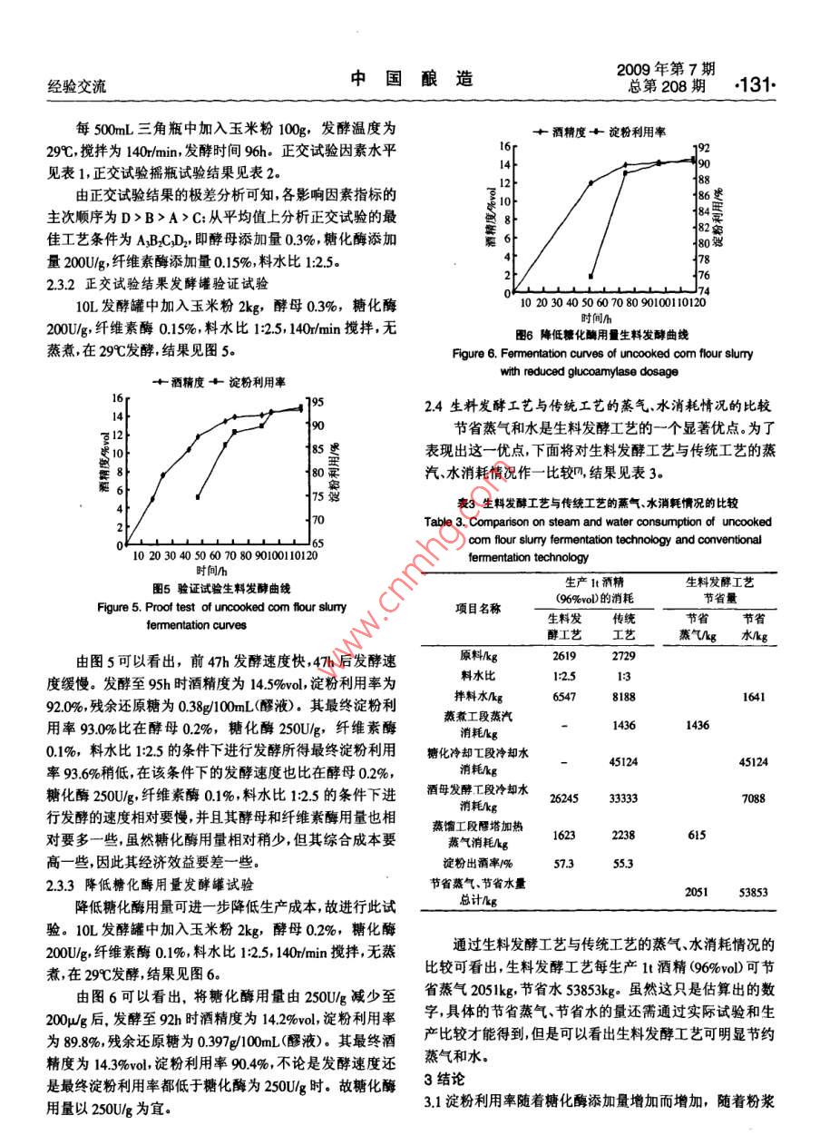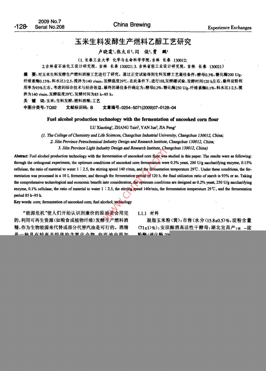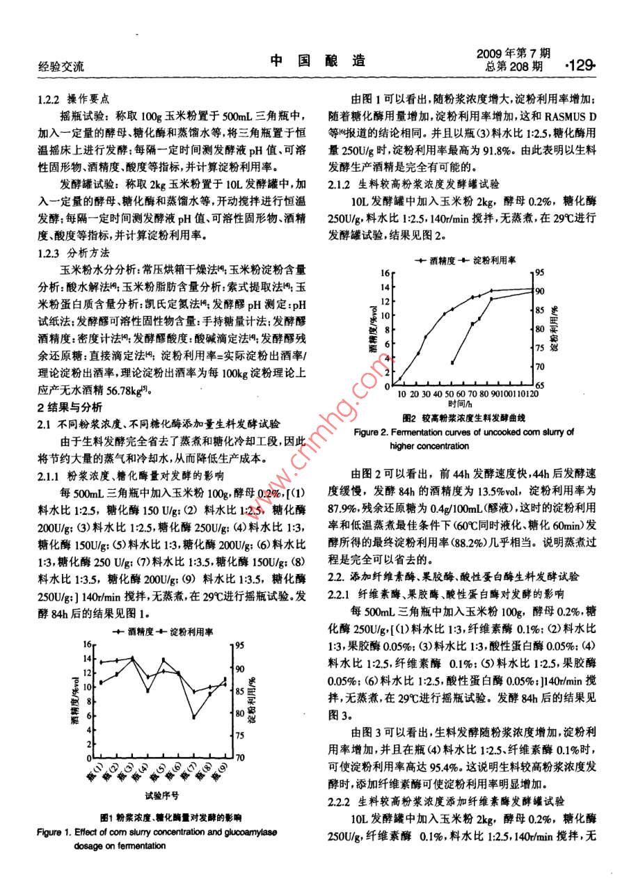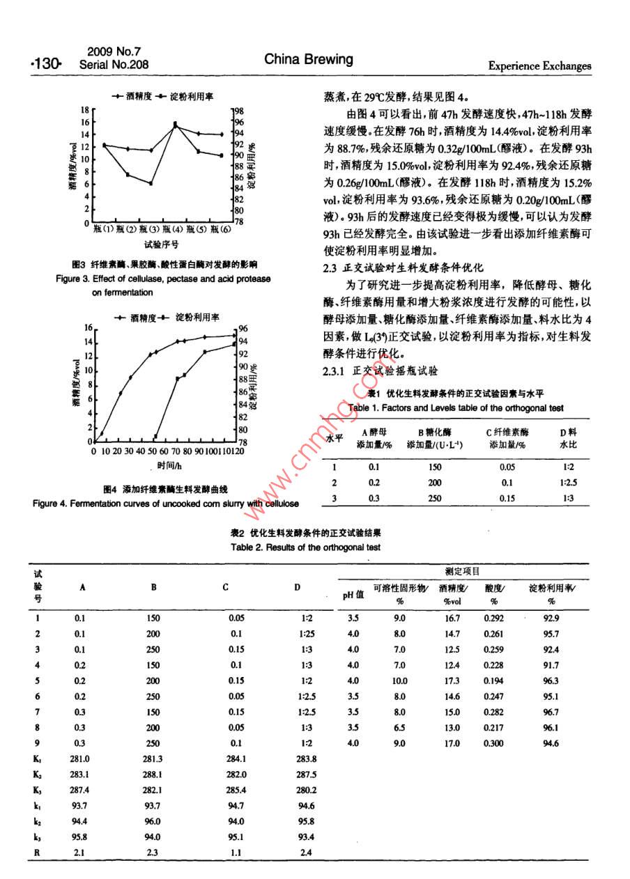 2009No7128 Serial No 208China BrewingExperience Exchanges玉米生料發(fā)酵生產(chǎn)燃料乙醇工藝研究盧曉霆,張?zhí)?閆俊,賈鵬(1.長春工業(yè)大學(xué)化學(xué)與生命科學(xué)學(xué)院,吉林長春130012;2吉林省石油化工設(shè)計(jì)研究院,吉林長春130021;3.吉林省輕工業(yè)設(shè)計(jì)研究院,吉林長春13021)摘要:對玉米生料發(fā)酵生產(chǎn)燃料酒精工藝進(jìn)行了研究,通過正交試驗(yàn)得到生料發(fā)酵工藝最佳條件:酵母03%,糖化酶200Ug纖維素酶015%料水比125,攪拌為140rmin,發(fā)酵溫度29℃.在此條件下,進(jìn)行10L發(fā)酵罐試驗(yàn)發(fā)酵時(shí)間120h左右,最終淀粉用率為93%左右考慮到綜合技術(shù)與經(jīng)濟(jì)效益最終的最佳條件確定為:酵母0.2%,糖化酶250Ug,纖維素酶0.%,料水比125,攪拌為140rmin,發(fā)酵溫度29℃,發(fā)酵時(shí)間為85h-95h關(guān)鍵詞:玉米;生料發(fā)酵:燃料酒精:工藝中圖分類號:TQ92文獻(xiàn)標(biāo)識碼:B文章編號:0254-5071(2009)07-012804Fuel alcohol production technology with the fermentation of uncooked corn flotLU Xiaoting, ZHANG Tairi?, YAN Jun, JIA Peng(1. The College of Chemistry and Life Sciences, Changchun Industrial University, Changchun 130012, China;2. Jilin Province Petrochemical Industry Design and Research Institute, Changchun 130012, China3. Jilin Province Light Industry Design and Research Institute, Changchun 130012, China)Abstract: Fuel alcohol production technology with the fermentation of uncooked com flour was studied in this paper. The results were as following:through the orthogonal experiment, the optimum conditions of uncooked com fermentation were 0.3% yeast, 200 U/g saccharifying enzyme, 0.15%cellulase, the ratio of material to water 1:2.5, the stiming speed 140 r/min, and the fermentation temperature 29C. Under these conditions, the fermentation was processed in a 10 L fermenter, and through the fermentation period of 120 h, the final utilization ratio of starch is 93% or so. Takingthe comprehensive technological and economic benefit into consideration, the optimum conditions are designed as 0.2% yeast, 250 U/g saccharifyingenzyme, 0. 1%cellulase, the ratio of material to water 1: 2.5, the stiring speed 140r/min, the fermentation temperature 29C, and the fermentationperiod 85 b-95hKey words: com; fermentation of uncooked com; fuel alcohol; technology“能源危機(jī)”使人們開始認(rèn)識到廉價(jià)的原油是會用完111材料的,利用可再生資源(如糧食或植物纖維)發(fā)酵生產(chǎn)燃料酒脫脂玉米粉(黃):市售(水分(158±05)%,淀粉含量精,作為生物能源來代替或部分代替汽油是可行的。酒精(71±1)%);安琪釀酒高活性干酵母:湖北宜昌產(chǎn);a-淀是一種具有較高辛烷值的含氧化合物,向汽油中添加粉酶(液化酶2000g:湖南省津市市新型發(fā)酵有限責(zé)任5%-10%無水酒精其辛烷值可提高2~3,發(fā)動(dòng)機(jī)不需任公司生產(chǎn);糖化酶(50000g):無錫市酶制劑廠生產(chǎn):纖維何改動(dòng),不會減少發(fā)動(dòng)機(jī)動(dòng)力而且還有助于汽油的充分素酶(00g0、果膠酶(3000g)、酸性蛋白酶燃燒,降低汽車尾氣中一氧化碳、碳?xì)浠衔锛傲虻呐欧?(00oug):肇東國科北方酶制劑有限公司生產(chǎn)有利于環(huán)境保護(hù)。1.12設(shè)備傳統(tǒng)的酒精生產(chǎn)工藝的能耗很高,尤其是其高壓蒸煮10L全自動(dòng)發(fā)酵罐:上海保興生物設(shè)備有限公司生工段的能耗、氣耗占整個(gè)生產(chǎn)工序能量投入的30%40%產(chǎn);氣浴恒溫?fù)u床THZ-82B:江蘇省金壇市醫(yī)療儀器廠;左右,并且由此而產(chǎn)生的生產(chǎn)冷卻用水量猛增也使酒精電熱恒溫干燥箱湖北省黃石市醫(yī)療器械廠生產(chǎn);恒溫水的生產(chǎn)成本增加淀粉質(zhì)原料生料發(fā)酵生產(chǎn)酒精取消了蒸浴鍋:電子天平(精確至0000g);分析天平:托盤天平(精煮工段和冷卻糖化工段,從而大幅度降低蒸汽和水的消耗確至01g);托盤天平(最大量程8kg)及減少設(shè)備的使用,進(jìn)一步簡化工藝,使勞動(dòng)強(qiáng)度大幅下1.2方法降降低生產(chǎn)成本岡。本試驗(yàn)采用脫脂玉米粉為原料,進(jìn)行121生料發(fā)酵生產(chǎn)燃料酒精工藝流程生料發(fā)酵生產(chǎn)燃料酒精的工藝研究。1材料與方法脫胚玉米粉→調(diào)漿→加入制劑及酵母→生料發(fā)酵→蒸餾→脫1.1材料與設(shè)備水→燃料酒精收稿日期:基金項(xiàng)目:吉林省教育廳十一五’科研規(guī)劃項(xiàng)目(吉教科合字(2007第105號作者簡介;:盧曉鑫(1963-),男吉林長春人,副教授,主要從事食品生物工程產(chǎn)品的開發(fā)研究、設(shè)計(jì)與教學(xué)工作2009年第7期經(jīng)驗(yàn)交流中國釀造總第208期129122操作要點(diǎn)由圖1可以看出,隨粉漿濃度增大,淀粉利用率增加搖瓶試驗(yàn):稱取100g玉米粉置于500mL三角瓶中,隨著糖化酶用量增加,淀粉利用率增加,這和 RASMUS D加入一定量的酵母、糖化酶和蒸餾水等將三角瓶置于恒等陶報(bào)道的結(jié)論相同。并且以瓶(3)料水比1:2.5,糖化酶用溫?fù)u床上進(jìn)行發(fā)酵;每隔一定時(shí)間測發(fā)酵液pH值可溶量250Ug時(shí),淀粉利用率最高為918%。由此表明以生料性固形物、酒精度、酸度等指標(biāo),并計(jì)算淀粉利用率發(fā)酵生產(chǎn)酒精是完全有可能的。發(fā)酵罐試驗(yàn):稱取2kg玉米粉置于10L發(fā)酵罐中,加2.1.2生料較高粉漿濃度發(fā)酵罐試驗(yàn)入一定量的酵母糖化酶和蒸餾水等,開動(dòng)攪拌進(jìn)行恒溫10L發(fā)酵罐中加入玉米粉2kg,酵母0.2%,糖化