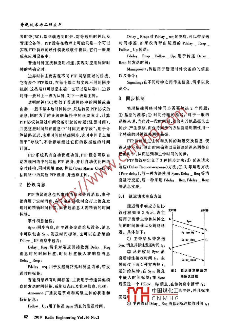 專題技術(shù)與工程廢用PTP技術(shù)分析方強(qiáng)(中國電子科技集團(tuán)公司第五十四研究所,河北石家莊050081)摘要時間同步技術(shù)廣泛應(yīng)用于工業(yè)自動化、儀表測量以及通信等領(lǐng)域,傳統(tǒng)的同步技術(shù)的同步精度比較低,已經(jīng)無法滿足高精度同步的需求,IEEE1588標(biāo)準(zhǔn)精確時間同步協(xié)議(PTP)的提出,解決了應(yīng)用領(lǐng)域中需要高精度時間同步的問題,它可以通過分組網(wǎng)絡(luò)實現(xiàn),大大降低系統(tǒng)成本。對PTP中的系統(tǒng)模型、同步機(jī)制進(jìn)行了分析,給出了PTP實現(xiàn)時注意的問題。關(guān)鍵詞PP;1588;NP中圖分類號TP393文獻(xiàn)標(biāo)識碼A文章編號1003-3106(2010)02-0061-04Analysis on PTPFANG QiangThe 54th Research institute of CETC, Shijiazhuang Hebei 050081, China)Abstract Time synchronization techniques are widely applied to industrial automation, instrument measurement and telecommunicationbut traditional methods can t satisfy the requirement in some precise time synchronization application. IEEE1588 standard addresses precisesynchronization of clocks in application that needs precise time references. It can achieve highly accurate synchronization over pnetwork(e. g. Ethemet)and reduce cost of system deployment. In this paper, PTP system model and precise synchronization principle arediscussed and some key points in designing PTP system are givenKey words PTP: 1588; NTP成本,提高了效率0引言時間同步技術(shù)廣泛應(yīng)用于工業(yè)自動化、工業(yè)控1系統(tǒng)模型制、儀器測量以及通信領(lǐng)域,早期的時間同步技術(shù)一PTP系統(tǒng)是一個分布式網(wǎng)絡(luò)結(jié)構(gòu),在PP系統(tǒng)般需要專用的時間同步網(wǎng)絡(luò)為應(yīng)用系統(tǒng)提供服務(wù),中,協(xié)議運(yùn)行的邏輯范圍稱為一個域( Domain),域中無法直接在應(yīng)用網(wǎng)絡(luò)中(尤其是在分組網(wǎng)絡(luò)中)傳遞設(shè)備采用主、從方式實現(xiàn)時間精準(zhǔn)同步,所有的實時時間同步信息,所以系統(tǒng)的成本比較高,NTP時鐘組成主從同步端口,一個設(shè)備可以有多個( Network Time protoco)雖然可以在應(yīng)用網(wǎng)絡(luò)中實現(xiàn)端口,對上它是從端口,對下它是主端口。系時間同步,但是精度不是很高,無法滿足日益增長的統(tǒng)中有一個高級主時鐘( Grandmaster),它決定了對精確時間同步的需求,所以PTP技術(shù)應(yīng)運(yùn)而生。整個系統(tǒng)的時鐘IEEE1588標(biāo)準(zhǔn)(網(wǎng)絡(luò)測量和控制系統(tǒng)精確時鐘同步頻率。系統(tǒng)中主協(xié)議,簡稱PP)由安捷倫實驗室的成員開發(fā),并于從設(shè)備通過交換2002年11月正式成為IEEE標(biāo)準(zhǔn)(版本1.0),最初PIP協(xié)議消息,來的標(biāo)準(zhǔn)主要用于工業(yè)自動化、精密控制以及工業(yè)測調(diào)整本地時鐘,從量和測試方面,但是隨著精確時間定時的廣泛應(yīng)用,而達(dá)到時鐘的同IEEE在2008年4月推出了2.0版本,增加了PTP在步。一個簡單的電信、網(wǎng)絡(luò)、航空以及電力系統(tǒng)中的應(yīng)用。 IEEE PTP1588的出現(xiàn)解決了時間同步應(yīng)用中對時間精度的圖1"中國煤化工系模要求,實現(xiàn)了網(wǎng)絡(luò)中精確時鐘同步;采用了以太網(wǎng)絡(luò)CNMHG普通時鐘(OC)邊實現(xiàn)傳輸可以和采用分組網(wǎng)絡(luò)的應(yīng)用結(jié)合降低了收稿日期:200182010旱無實電工翟第40癮第2期61專題技術(shù)與工程應(yīng)用界時鐘(BC)、端到端透明時鐘、對等透明時鐘以及Delay_ Resp:對 Delay_meq的響應(yīng),可以帶發(fā)送管理設(shè)備等。PTP設(shè)備在物理上可能只是一個可以時間標(biāo)簽,如果沒有帶由隨后的 Delay Resp實現(xiàn)PIP協(xié)議的硬件模塊或軟件模塊,它們一般集Folw_Up傳送;成在應(yīng)用設(shè)備中。Pdelay_ Resp Follow Up:用于傳送De普通時鐘直接和應(yīng)用相連,實現(xiàn)對應(yīng)用所需時Resp的發(fā)送時間;鐘的精確定時。Management:傳輸用于管理時鐘設(shè)備的的信息邊界時鐘主要實現(xiàn)不同PTP網(wǎng)絡(luò)區(qū)域的橋接,以及命令;它有多個PTP端口,在每個端口都實現(xiàn)不同的同步ignaling:在不同時鐘之間傳送信息、請求以及機(jī)制,這些端口可以是主端口也可以是從端口,邊界命令。時鐘一般對上一級為從鐘,對下一級是主鐘。3同步機(jī)制透明時鐘(T℃C)類似于普通網(wǎng)絡(luò)中的網(wǎng)橋或路由器,一般不做本地時鐘同步,只是轉(zhuǎn)發(fā)PP協(xié)議的實現(xiàn)精確網(wǎng)絡(luò)時鐘同步需要解決2個問題消息,同時為了防止級聯(lián)拓?fù)渲械恼`差累計,計算①晶振的漂移;②時間傳輸?shù)难舆t。對于一般的PTP協(xié)議包經(jīng)過中間設(shè)備引起的時延(駐留時間),晶振來說,當(dāng)經(jīng)過一段時間后就會和其他晶振失去并把這些時間加在消息中“時間更正字段”,用于計同步,產(chǎn)生漂移,而保持同步的方法就是周期性用算鏈路延遲,實現(xiàn)時間的精確同步,這時中間節(jié)點相個精確的時鐘源去調(diào)整晶振。當(dāng)于“導(dǎo)線”,不會影響經(jīng)過它們的數(shù)據(jù)包的時間PTP協(xié)議通過主鐘和從鐘的頻繁交換信息,使計算得從鐘不斷計算出時間偏移以及鏈路延遲來調(diào)整自PTP系統(tǒng)具有自動管理功能,PP設(shè)備可以自已的時鐘從而達(dá)到和主鐘時間的同步動發(fā)現(xiàn)網(wǎng)絡(luò)中的其他PP設(sh