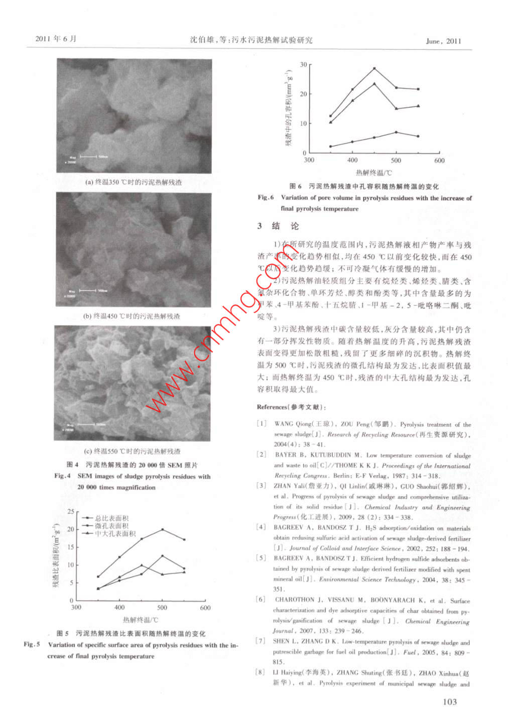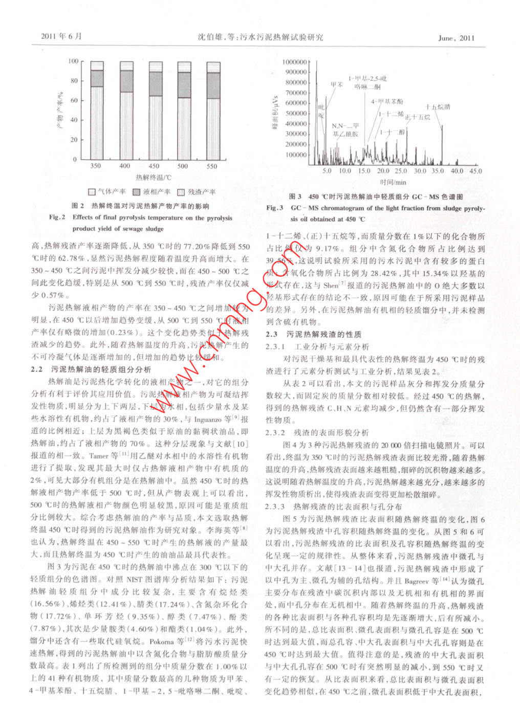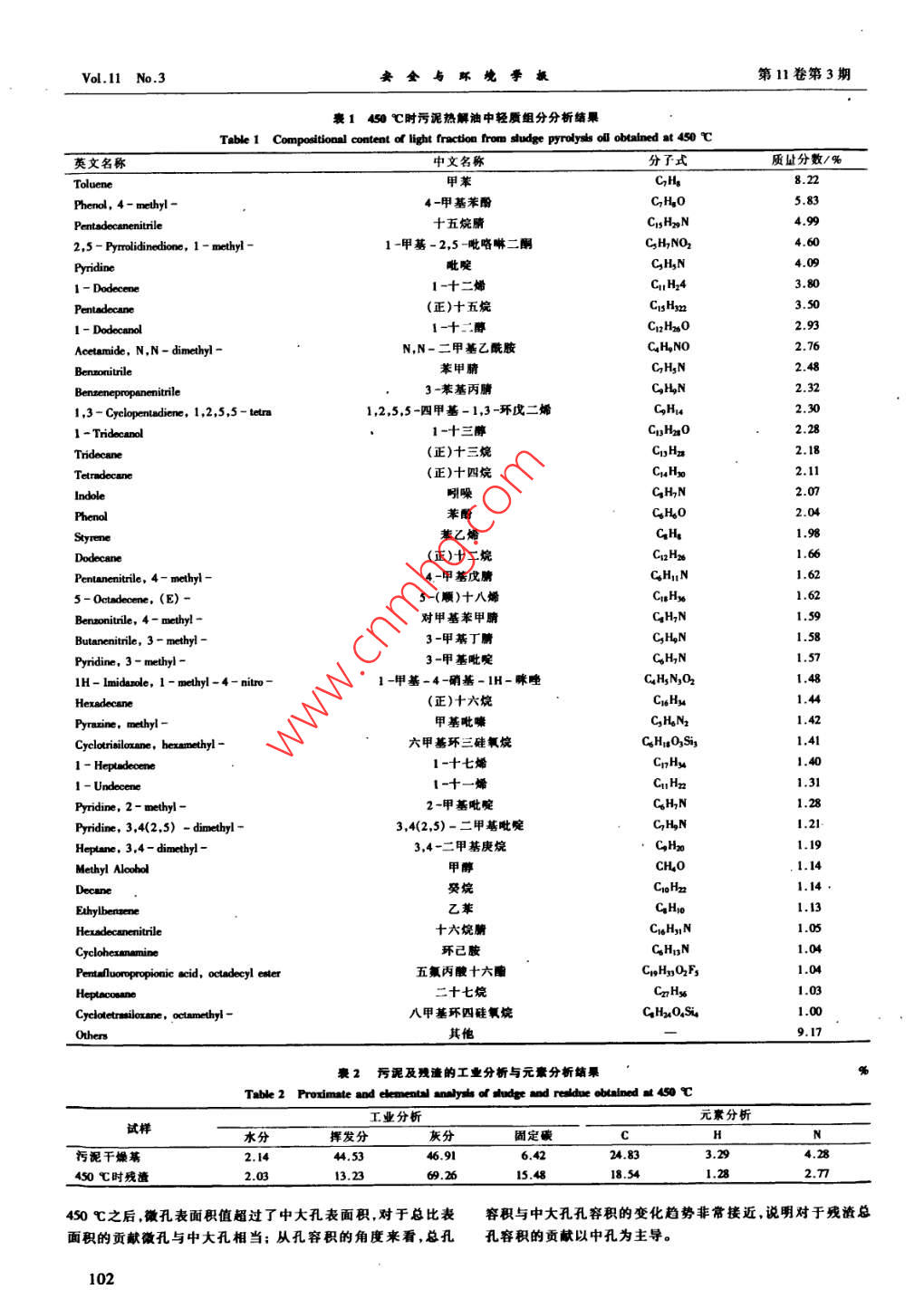 第11卷第3期妻金與境季Vol. 11 No. 32011年6月Joumal of Safety and EnvironmentJune, 2011文章編號:1009604(2011030100051試驗部分污水污泥熱解試驗研究1.1試驗原料與反應流程沈伯雄,張增輝,陳建宏,郝曉翠,文姥試驗污泥取白天津巾某污水處理廠的消化污泥,含水率為7688%,在(105±5)℃條件下恒溫干燥24h,得到污泥干(南開大學環(huán)境科學與工程學院,天津30001)燥基。為使物料的敉度均勻,將污泥干燥基研磨至0.075pm以下。污泥熱解裝置為實驗室自制的固定床熱解爐,見圖1要:研究了熱解終溫對污水污泥熱解產(chǎn)物產(chǎn)率的影響,對污泥熱熱解條件:常壓,隔絕氧,無載氣,熱解終溫350~550℃解油中的輕質(zhì)組分進行了分析并初步探討了污泥熱解疫渣的插本性每50℃設為1個試驗工況,升溫速率20℃/min,熱解終溫保質(zhì)。研究表明熱解終溫為40-500℃時,液相產(chǎn)物產(chǎn)率較高,隨著持時間為45min。熱解終溫的升高熱解殘渣減少的趨勢與液相產(chǎn)物增加的趨勢相似;1.2測試與分析方法450℃時得到的污泥熱解油的輕質(zhì)組分中主要含有烷烴類、烯烴類稱取污泥干爍基10.0g放入反應器內(nèi),接通加熱裝置電類含氯雜環(huán)化合物和單環(huán)芳香烴等;隨著熱解終溫的升高,殘渣源開始試驗,熱解產(chǎn)生的氣體經(jīng)冷凝收集得到液體和不可冷表面越來越松散和粗糙:40℃時得到的熱解殘渣孔容積最大,面50凝氣體。液體的質(zhì)量通過試驗前后液相產(chǎn)物收集裝置的質(zhì)量℃時得到的殘渣微孔最為發(fā)達,比表面積值最高。差獲得,熱解殘渣的質(zhì)尅通過試驗前后反應器的質(zhì)量差得到關鬟惆:環(huán)境工程學;污泥熱解;熱解油;輕質(zhì)組分;熱解殘渣根據(jù)質(zhì)量守恒計算氣體產(chǎn)生量。用二氯甲烷對污泥熱解液相中圖分類號:X705文獻標識碼:A產(chǎn)物進行萃取,提取熱解油中的有機組分然后在常壓下對其Do:103969/j.in.1006094.2011.03.025進行蒸餾,收集沸點在300℃以下的餾分,冉利川氣質(zhì)聯(lián)用儀0引言(5890Cc-5971Ms)對其組分進行測試。將污泥熱解殘渣研磨至0.075m以下,采用德國 Heraeus公司的Van-EL型元素污水污泥是用活性污泥法對污水進行好氧生化處理中的分析儀測定殘渣CHN元素的含量;采用島津公司Ss-550型一種副產(chǎn)物其中含有大量的微生物細菌重金屬及合成有掃描電子顯徽鏡觀察熱解殘渣的表面形貌;采用美國Qumn機物處理不當將會危害人體的健康及污染環(huán)境。目前,常用 hrome nova-2000全自動氣體吸附系統(tǒng)對污泥熱解殘渣的污泥處置方法主要有填埋、堆肥和焚燒但這些方式存在處的比表面積和孔結(jié)構(gòu)進行測試。本文未研究不可冷凝氣體的理成本高,不能有效回收能量和造成嚴重的二次污染等問題。組成與性質(zhì)污泥熱解技術是在無氧環(huán)境下,把干燥的污泥加熱至一定溫度,在干餾和熱分解的作用下,使污泥轉(zhuǎn)化為熱解油、水、不可2結(jié)果與討論冷凝氣體(NCc)和熱解殘渣(焦炭)4種物質(zhì)l。其研究開始2.1熱解終溫對污泥熱解產(chǎn)物產(chǎn)率的影響于20世紀80年代,最早是由 Bayer2)提出來的。此技術工藝在污泥熱解過程中,影響固液氣3相產(chǎn)物產(chǎn)率及特性簡單充分利用了污泥中含量豐富的有機質(zhì),進而提高了污泥的因素很多其中最為關鍵的影響因素則是熱解溫度。因的綜合利用價值。盡管熱解裝置相對復雜,但是熱解過程二此,本文重點研究熱解終溫對熱解產(chǎn)物產(chǎn)率及特性的影響。次污染小,處理成本低于焚燒過程,較其他處置方法也有一定熱解殘渣為熱解結(jié)束后殘留在反應器內(nèi)的固體碳渣,它的優(yōu)勢是當前污泥處置的前沿研究課題3,受到了學者的廣是固體廢耷物脫除揮發(fā)分反應和碳化反應的結(jié)果,由于其中泛關注。 Agreen等4研究了污水污泥熱解殘渣對H2S氣體還含有少量可揮發(fā)成分,通常也稱之為半焦。圖2顯示了熱解終溫對污泥熱解產(chǎn)物產(chǎn)率的影響,可以看出,污泥熱解殘的吸附性能,并對其進行了改性研究。 Jindarom等6著重研究質(zhì)與染料吸附性能。$hem等果用渣在污泥熱解產(chǎn)物中占了很大的比例。隨著熱解終溫的開GC-Ms對污泥熱解油進行了檢測,發(fā)現(xiàn)其中含氧芳香族化合溫控儀物占很高的比例。在國內(nèi),李海英國報道了污泥熱解殘渣的元素分析結(jié)果與燃料特性,并對熱解油進行∫油質(zhì)評價,認為從發(fā)熱值、運動黏度、閃點、凝點等指標來看,熱解油都滿足熱電偶熱解爐燃料油的要求。污泥樣品本文采用固定床常壓低溫熱解技術研究熱解終溫對污水氣休出口污泥熱解三相產(chǎn)物產(chǎn)率的影響,對污泥熱解油中沸點低于300℃的輕質(zhì)有機組分進行分析,并對熱解殘渣的相關性質(zhì),特別是比表面積和孔容積進行研究。液相產(chǎn)物收集瓶冰水混合物普收稿日期:2010-07-16污泥熱解裝置圖作者篇介:沈伯雄,教授,主要從事固體廢物處理與煙氣凈化的研究, shenhe nankai,咖,cn基金項目:重點基礎研究發(fā)展計劃項目(200cB202m);國家自然科學基金項日(50976050)2011年6月沈伯雄,等:污水污泥熱解試驗研究June, 201 I100000800000甲苯甲2.57000006000004-甲基苯酚十五烷腈止十五烷100000005505.010.015020.025030.035.0400450熱解終溫r℃口氣體產(chǎn)率口液相產(chǎn)率□殘渣產(chǎn)率圖3450℃時污泥熱解油中輕質(zhì)組分GC-MS色譜圖圖2熱解終