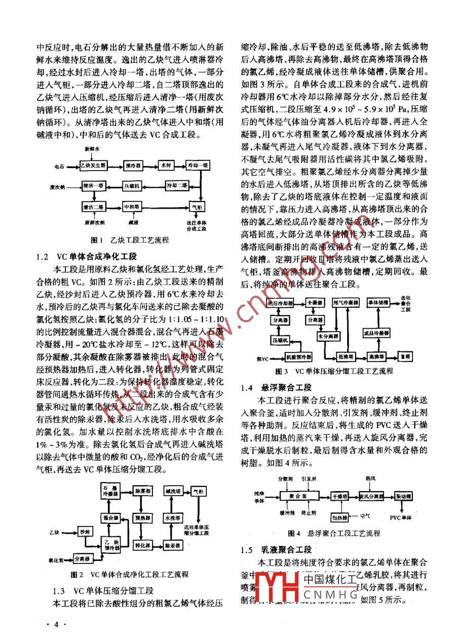 第24卷,總第135期《節(jié)能技術(shù)》Vol.24 , Sum. No. 1352006年1月,第1期ENERGY CONSERVATION TECHNOLOGYJan. 2006,No.1聚氯乙烯裝置熱集成馮霄,趙馳峰,孫 亮(西安交通大學(xué)化工系,陜西西安710049)摘要:聚氯乙烯裝置是一個高耗能裝置,對其利用夾點技術(shù)進行節(jié)能改造,有很重要的應(yīng)用.價值。本文利用夾點技術(shù)對某聚氯乙烯流程進行了分析,找出了其能量利用不合理的環(huán)節(jié),針對這些不合理的環(huán)節(jié)提出了節(jié)能改造方案,并對方案進行了技術(shù)經(jīng)濟評價。關(guān)鍵詞:換熱網(wǎng)絡(luò);夾點技術(shù);優(yōu)化;節(jié)能中圖分類號:TQ021.3文獻標(biāo)識碼:A文章編號:1002 - 6339 (2006) 01-0003-03Heat Integration of Polyvinyl Chloride SystemFENG Xiao,ZHAO Chi - feng, SUN Liang(Departnent of Chemical Engineering, Xi' an Jieaotong University, Xi' an 710049,China)Abstract:' The polyiny chloride (PVC) system is highly energy - consuming, herefore,it is worthy of aplyingthe pinch techology to this systen, so that a better heat - exchanger network can be propased and the energyconsumption can be reduced. This paper applies the pinch technology to analyze the flowsheet of a certain PVCsystem, thereafter, the bottleneck is found and an energy saving retrfit design is proposed and economically e-valuated.Key words: heat - exchanger network; pinch technology ;opization; enery saving在化工生產(chǎn)過程中,能耗直接影響操作費用,因與回收的優(yōu)化配置,提高能量利用率,降低能耗。而是反應(yīng)系統(tǒng)優(yōu)劣的一個重要指標(biāo)。一個典型的過聚氯乙烯裝置是-一個高耗能裝置,需要對多種程系統(tǒng)包括以下3個組成部分:反應(yīng)分離部分換熱原料、產(chǎn)品流和中間物流進行換熱。本文利用夾點部分和公用工程部分。其中,換熱部分是直接的耗技術(shù)對某聚氯乙烯換熱流程進行了分析,找出了其能部分,其設(shè)計優(yōu)劣直接影響到系統(tǒng)的能量消耗。能量利用不合理的環(huán)節(jié),提出了優(yōu)化后的換熱網(wǎng)絡(luò),要把一個過程工業(yè)的工廠設(shè)計的能耗最小、花并對方案進行了技術(shù)經(jīng)濟評價。費最少和環(huán)境污染最低,就必須把整個系統(tǒng)集成起來作為--個有機結(jié)合的整體來看待,達到整體設(shè)計1現(xiàn)有工藝流程最優(yōu)化。不同的學(xué)者提出了不同的集成方法,例如某聚氯乙烯工藝流程分為五個工段:乙炔工段;夾點技術(shù)分析法(~3)、熱力學(xué)分析法與熱經(jīng)濟學(xué)分VC(氯乙烯)單體合成凈化工段;VC單體壓縮分餾析法(4-5)、數(shù)學(xué)規(guī)劃法[6)等。其中,夾點技術(shù)是過程工段;懸浮聚合工段(包括懸浮聚合干燥);乳液聚合集成方法中目前最實用的3。夾點技術(shù)將熱力學(xué)原工段(包括乳液聚合干燥)。理與系統(tǒng)工程相結(jié)合,用以取定工程系統(tǒng)能量利用.1 乙快工段收稿日期2005-11-09 修訂稿日期 2005-12-04中國煤化工應(yīng)生成乙炔氣,再基金項目:國家自然科學(xué)基金重點項目(20436040)經(jīng)工HCNMH G氣。如圖1所示:作者簡介:馮霄(1953-),女 ,博士.博士生導(dǎo)師,教授。電石進入發(fā)生器遇水產(chǎn)生乙炔氣從發(fā)生器逸出,其3●中反應(yīng)時,電石分解出的大量熱量借不斷加入的新縮冷卻,除油、水后平穩(wěn)的送至低沸塔,除去低沸物鮮水來維持反應(yīng)溫度。逸出的乙炔氣進人噴淋器冷后人高沸塔,再除去高沸物,最終在高沸塔頂?shù)煤细駞s經(jīng)過水封后進入冷卻- -塔,出塔的氣體,一部分的氯乙烯,經(jīng)冷凝成液體送往單體儲槽,供聚合用。進入氣柜,一部分進人冷卻二塔,自二塔頂部逸出的如圖3所示。自單體合成工段來的合成氣,進機前乙炔氣進入壓縮機,經(jīng)壓縮后進人清凈-~塔(用廢次冷卻器用6C水冷卻以除掉部分水分,然后經(jīng)往復(fù)鈉循環(huán)) ,出塔的乙炔氣再進人清凈二塔(用新鮮次式壓縮機,二段壓縮至4.9x I0 ~5.9x 10 Pa,壓縮鈉循環(huán))。從清凈塔出來的乙炔氣體進入中和塔(用后的氣體經(jīng)氣體油分離器人機后冷卻器,再進入全堿液中和),中和后的氣體送去VC合成工段。凝器,用6C水將粗聚氣乙烯冷凝成液體到水分離新鮮水器,未凝氣再進入尾氣冷凝器,液體下到水分離器,跖一它塊發(fā)生教- +器-樹] +冷卻一圖不凝氣去尾氣吸附器用活性碳將其中氯乙烯吸附,其它空氣排空。粗聚氯乙烯經(jīng)水分離器分離掉少量的水后進人低沸塔,從塔頂排出所含的乙炔等低沸物,除去了乙炔的塔底液體在控制一-定溫度和液面遭請二場一→中和帶的情況下,靠壓力進人高沸塔,從高沸塔頂出來的合新鮮次鈉送往平體格的氯乙烯經(jīng)成品冷凝器冷凝成液體, -部分作為高塔回流,大部分送單體儲槽作為本工段成品。高圖1乙炔工段工藝流程沸塔底間斷排出的高沸殘液含有- -定的氯乙烯,送1.2 VC 單體合成凈化工段入儲槽。定期開回收0塔將殘液中氯乙烯蒸出送人本工段是用原料乙炔和氯化氫經(jīng)工藝處理,生產(chǎn)氣柜, 塔簽高佛物排人高沸物儲槽,定期回收。最合格的粗VC。如圖2所示:由乙炔工段送來的精制后,將純凈的單體送往聚合工段。乙炔,經(jīng)沙封后進人乙炔預(yù)冷器,用6C水來冷卻去水,預(yù)冷后的乙炔再與氯化車間送來的已除去凝酸的凱后冷知輸金司醫(yī)冷源國事體使何一氯化氫按照乙炔:氯化氫的分子比為1:1.05~ 1:1.10的比例控制流量進人混合器