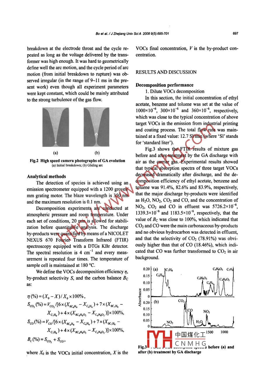 Bo et al. /J Zhejlang Univ Sci A 2008 9(5): 695-701ISSN 1673-565x (Print ) ISSN 1862-1775(Online)www.zju.edu.cn/jzus:www.springerink.commail:jus@zju.edu.cnSimultaneous removal ofethyl acetate benzene and toluenewith gliding arc gas dischargeZheng BO, Jian-hua YaN", Xiao-dong LL, Yong CHI, Ke-fa CEN(State Key Laboratory of clean Energy Utilization, Institute for Thermal Power Engineering, Zhejiang University Hangzhou 310027, china)E-mail:bozh@zju.edu.cn;yanjh@cmeezju.edu.cnReceived July 20, 2007; revision accepted Dec. 25, 2007; published online Feb 23, 2008Abstract: The simultaneous removal of ethyl acetate, benzene and toluene with relatively low or high initial concentration isstudied using a laboratory scale gliding arc gas discharge( GA)reactor. good decomposition efficiencies are obtained whichproves that the ga is effective for the treatment of volatile organic compounds( vocs )with either low or high concentration. atheoretical decomposition mechanism is proposed based on detection of the species in the plasma region and analysis of thedecomposition by-products, This preliminary investigation reveals that the ga has potential to be applied to the treatment ofexhaust air during color printing and coating works, by either direct removal or combination with activated carbon adsorp-Key words: Plasma, Gliding arc gas discharge( GA), Volatile organic compounds(vOCs), Simultaneous removal, Printing andcoating processdoi: 10. 163 1/jZus. A071391Document code: ACLC number: X7077INTRODUCTIONcommon problem in the catalytic incineration; acti-vated carbon is expensive, thus making regenerationVolatile organic compounds(vOCs)are par- economically desirable in the activated carbon adcularly burdensome for the natural environment sorption process. The combination of activated car-problems such as global warming, photochemical bon adsorption and further destructive process, suchsmog formation, stratospheric ozone depletion and as thermal incineration and catalyst incineration, hastropospheric ozone increase( Fiella et al., 2007; been successfully applied to industry. More advancedLeach et al, 1999; Sakai et al., 2004). In China, destructive technologies are still required for the de-printing and coating industry is one of the principal structive regeneration of the spent activated carbonstationary sources of VOCs emissions from solverdsorbentRemoval of these toxic species becomes an importantAs an alternative, atmospheric non-thermatask for relevant enterprises in achieving environ- plasma has been conducted to vOCs destruction sincementally accepted pollutants levels and meeting new the last 10 years by using electron- beam irradiatistandard(SEPA, 1997). However, the applications of (Kim et aL, 2005; Nichipor et al, 2000)and variousmost commonly used processes in the removal of electrical discharge systems( Schutze et al, 1998vOCs are limited due to their own disadvantages: Spanel et al., 2007; Subrahmanyam et al, 2007;external fuel consumption is high in the thermal in- Yamamoto, 1997), which has shown a great technicalcineration process; rapid catalyst deactivation is a and economical potential as compared with tradi-中國煤化工 attractive benei Comesponding authorfit ofCNMHGemical proProject (No. 50476058) supported by the National Natural Science is that, urused to simulate theFoundation of Chinachemical reactions but not heat the bulk gases. InBo et al. /JZhejlang Univ Sc A 2008 9(5): 695-701other words, the non-thermal plasma region provides setup is shown in Fig. 1. It mainly consists of a gasa reactive atmosphere to make the chemical reactions feed system, a GA reactor with its power supply, andccur out of equilibrium with energetic costs lower an analysis system. The simulative VOCs flue resultsthan the thermodynamic onesfrom the mixing of a VOCs flow with a carrier gasGliding arc gas discharge (GA) is an flow. The concentration of VOCs is controlled byauto-oscillating phenomenon developing between at means of mass flow meters. The gas enters the GAleast two electrodes that are immersed in a laminar or reactor after passing through a drying column packedturbulent gas flow, which provides significantly with a silica-gel desiccant to eliminate the influencenon-equilibrium plasma region at elevated power level of atmosphere water vapor. GA reactor mainly con-(Fridman et al., 1999; Richard et aL., 1996). Since the sists of two knife-shaped electrodes fixed on a Teflonearly 1990,'s, the above feature was utilized to develop bed plate, a nozzle with inner diameter 1.5 mm,aa Ga device(Czermichowski, 1994; Lesueur et al., ceramic seal and a metal seal. Two electrodes ar1988)as an innovative approach to addressing energy connected to a 50 Hz high voltage transformer (220conservation(Sreethawong et al., 2007)and envi- V/10 kv) with leakage fluxes. The effect of leakageronmental protection(Indarto et al., 2007; Ma- fluxes determines a reactance that produces a constantrouf-Khelifa et al, 2006). Previous work of our group RMS(Root Mean Square) value of current in thehas demonstrated the feasibility of GA in the emission secondary coil. Two gas sample tubes are fixed in thecontrol and treatment of vocs with different chemical front and back of the GA reactor for the analysis of thestructures(Bo et al., 2007; Yan et al., 2007)gas composition before and after discharge, respecIn this paper, the simultaneous decomposition of tively. In this work, the electrode gap G was set as 3ethyl acetate(C4HgO2), benzene(C6H6)and toluene mm, and the vertical distance between electrode(C Hs), which are among the key pollutants included throat and nozzle outlet H was 15 mmin exhaust air during color printing and coating works,was studied using a laboratory scale GA reactor. Both GA plasma phenomenondilute and concentrated simulative flues were treated,Fig 2 shows the high speed camera photographsbecause the VOCs concentration is usually low under of the evolution of GA phenomenon. The images ofindustrial conditio