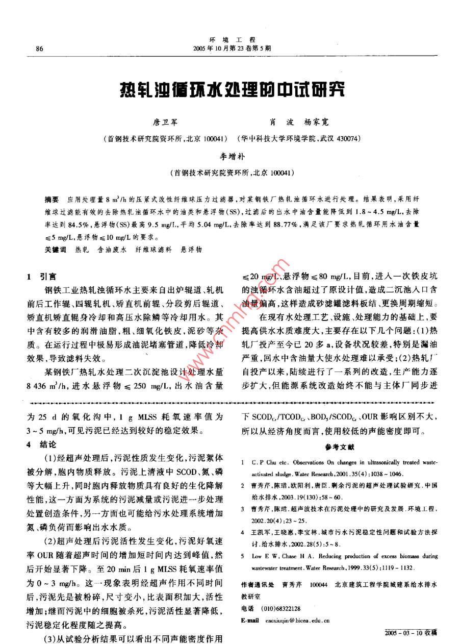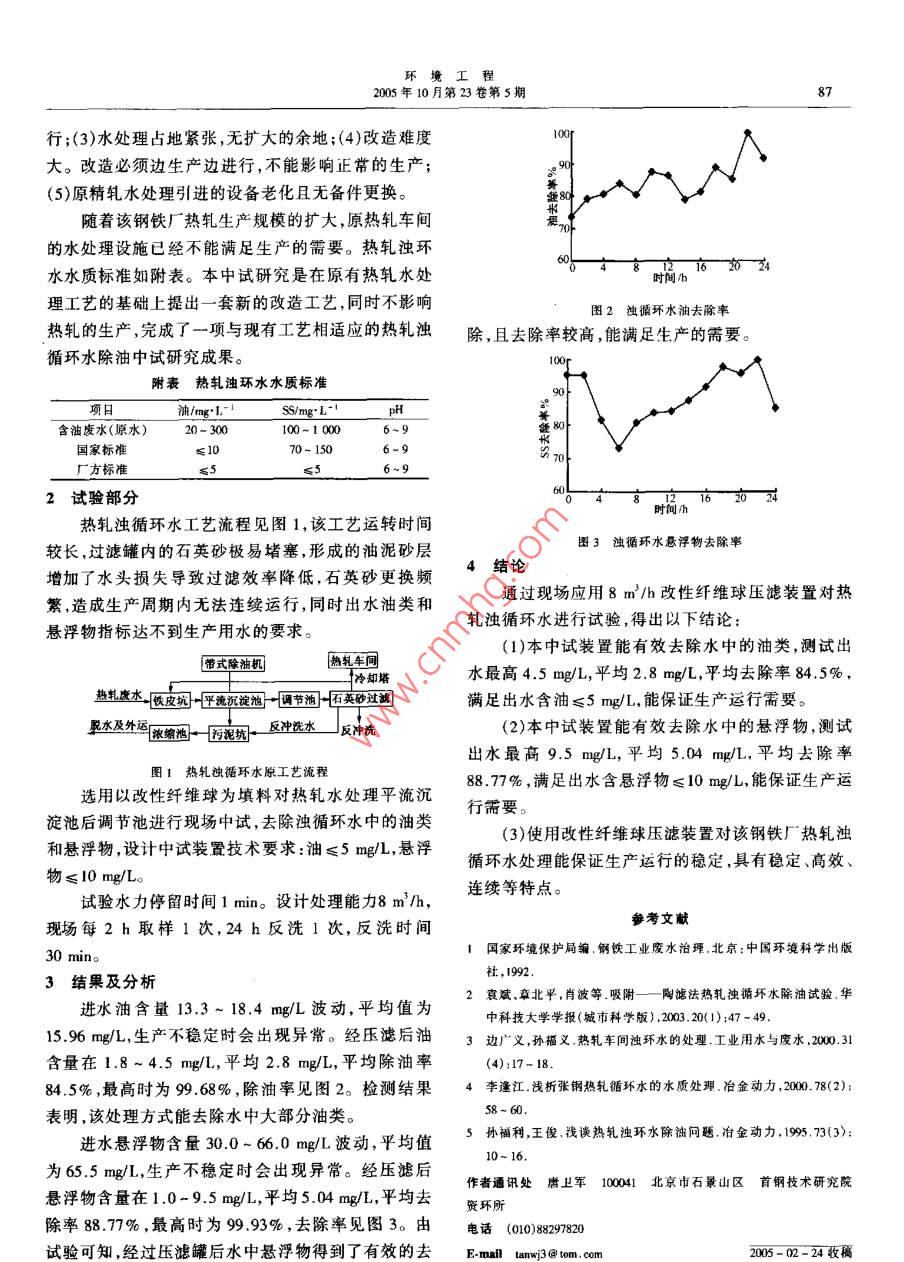 環(huán)境工程2005年10月第23卷第5期熱軋迎循環(huán)水逃理的中試研唐衛(wèi)軍肖波楊家寬(首鋼技術(shù)研究院資環(huán)所,北京100041)(華中科技大學(xué)環(huán)境學(xué)院,武漢430074)李增樸(首鋼技術(shù)研究院資環(huán)所,北京100041)摘要應(yīng)用處理量8m3/h的壓緊式改性纖維球壓力過濾器,對(duì)某鋼鐵廠熱軋濁循環(huán)水進(jìn)行處理。結(jié)果表明,釆用纖維球過濾能有效的去除熱軋濁循環(huán)水中的油類和懸浮物(SS),過濾后的出水中油含量能降低到1.8~45mg/L,去除率達(dá)到84,5%,懸浮物(S最高9.5mg/I,平均5.04mg/L,去除率達(dá)到88.77%,滿足該廠要求熱軋循環(huán)用水油含量≤5mg/L,懸浮物≤10mgL的要求關(guān)螻詞熱軋含油痰水纖維球?yàn)V料懸浮物1引言≤20mg/L、懸浮物≤80mg/L,目前,進(jìn)入一次鐵皮坑鋼鐵工業(yè)熱軋濁循環(huán)水主要來自出爐輥道、乳軋機(jī)的濁循環(huán)水含油超過了原設(shè)計(jì)值,造成二沉池入口含前后工作輥、四輥軋機(jī)、矯直機(jī)前輥、分段剪后輥道、油量偏高,這樣造成砂濾罐濾料板結(jié)、更換周期縮短。矯直機(jī)矯直輥身冷卻和高壓水除鱗等冷卻用水。其在現(xiàn)有水處理工藝、設(shè)施、處理能力的基礎(chǔ)上,要中含有較多的潤(rùn)滑油脂,粗、細(xì)氧化鐵皮,泥砂等雜提高供水水質(zhì)難度大,主要存在以下幾個(gè)問題:(1)熱質(zhì)。在運(yùn)行過程中極易形成油泥堵塞管道降低冷卻軋廠投產(chǎn)至今已20多a,設(shè)備狀況較差,特別是漏油效果,導(dǎo)致濾料失效。嚴(yán)重,回水中含油量大使水處理難以承受;(2)熱軋廠某鋼鐵廠熱軋水處理二次沉淀池設(shè)計(jì)處理水量自投產(chǎn)以來,陸續(xù)進(jìn)行了一系列的改造,生產(chǎn)能力逐8436m3/h,進(jìn)水懸浮物≤250mg/L,出水油含量步擴(kuò)大,但能源系統(tǒng)改造始終不能與主體廠同步進(jìn)為25d的氧化溝中, I g MLSS耗氧速率值為下scoD,/ TCODcr、BOD2 SCODG、OUR影響區(qū)別不大3~5mg/h,可見污泥已經(jīng)達(dá)到較好的穩(wěn)定效果。所以從經(jīng)濟(jì)角度而言,使用較低的聲能密度即可。4結(jié)論考文獻(xiàn)(1)經(jīng)超聲處理后,污泥性質(zhì)發(fā)生變化,污泥絮體1 C P Chu etc. Observations On changes in ultrasonically treated waste-被分解,胞內(nèi)物質(zhì)釋放。污泥上清液中SCOD、氮、磷activaled Sludge. Water Research, 2001. 35(4): 1038-1046等大幅上升,同時(shí)胞內(nèi)釋放物質(zhì)具有良好的生化降解2曹秀芹陳增歐陽利唐臣剩余污泥的超聲處理試驗(yàn)研究中國性能,這一方面為系統(tǒng)的污泥減量或污泥進(jìn)一步處理給水排水,2003.19(130):58處置創(chuàng)造條件,另一方面也可能給污水處理系統(tǒng)增加3曹秀芹,陳f超聲波技術(shù)在污泥處理中的研究及發(fā)展環(huán)境L程氮、磷負(fù)荷而影響出水水質(zhì)。200220(4):23-4王凱軍,王曉惠,李寶林城市污水污泥穩(wěn)定性問題和試驗(yàn)方法探(2)超聲處理后污泥活性發(fā)生變化,污泥好氧速討給水排水,2002.28(5):5~8率OUR隨著超聲時(shí)間的增加短時(shí)間內(nèi)達(dá)到峰值,然5 LOwe w., Chase h a. Reducing production of excess biomass during后開始顯著下降。至20min后 i g miss耗氧速率值wastewater treatment. Water Research, 1999. 33(5): 1119-1132為0~3mg/h。這…現(xiàn)象表明經(jīng)超聲作用不同時(shí)間作者通訊處卿秀芹1004北京建筑工程學(xué)院城建系給水排水后,污泥先是被粉碎,尺寸變小,比表面積加大,活性教研室增加;繼而污泥中的細(xì)胞被殺死,污泥活性顯著降低,電話(006822污泥穩(wěn)定化程度隨之提高。E-mail caoxiuqin@ bicea. edu.en從試驗(yàn)分析結(jié)果可以看出不同聲能密度作用2005-03-10收稱環(huán)境工程2005年10月第23卷第5期行;(3)水處理占地緊張,無擴(kuò)大的余地;(4)改造難度大。改造必須邊生產(chǎn)邊進(jìn)行,不能影響正常的生產(chǎn)(5)原精軋水處理引進(jìn)的設(shè)備老化且無備件更換。隨著該鋼鐵廠熱軋生產(chǎn)規(guī)模的擴(kuò)大,原熱軋車間的水處理設(shè)施已經(jīng)不能滿足生產(chǎn)的需要。熱軋濁環(huán)水水質(zhì)標(biāo)準(zhǔn)如附表。本中試研究是在原有熱軋水處理工藝的基礎(chǔ)上提出一套新的改造工藝,同時(shí)不影響圖2濁循環(huán)水油去除率熱軋的生產(chǎn),完成了一項(xiàng)與現(xiàn)有工藝相適應(yīng)的熱軋濁除,且去除率較高,能滿足生產(chǎn)的需要循環(huán)水除油中試研究成果附表熱軋濁環(huán)水水質(zhì)標(biāo)準(zhǔn)項(xiàng)日油/ng1-smg;L含油廢水(原水)20100~1000國家標(biāo)準(zhǔn)70-150廠方標(biāo)準(zhǔn)2試驗(yàn)部分熱軋濁循環(huán)水工藝流程見圖1,該工藝運(yùn)轉(zhuǎn)時(shí)間較長(zhǎng),過濾罐內(nèi)的石英砂極易堵塞,形成的油泥砂層圖3濁循環(huán)水懸浮物去除率增加了水頭損失導(dǎo)致過濾效率降低,石英砂更換頻4結(jié)論繁,造成生產(chǎn)周期內(nèi)無法連續(xù)運(yùn)行,同時(shí)出水油類和通過現(xiàn)場(chǎng)應(yīng)用8m3/h改性纖維球壓濾裝置對(duì)熱懸浮物指標(biāo)達(dá)不到生產(chǎn)用水的要求。軋濁循環(huán)水進(jìn)行試驗(yàn),得出以下結(jié)論:(1)本中試裝置能有效去除水中的油類,測(cè)試出〔帶式除油機(jī)熱軋車間水最高4.5mg/L,平均2.8mg/L,平均去除率84.5%,-鐵皮抗平流沉淀池“調(diào)節(jié)油英砂過鴻滿足出水含油≤