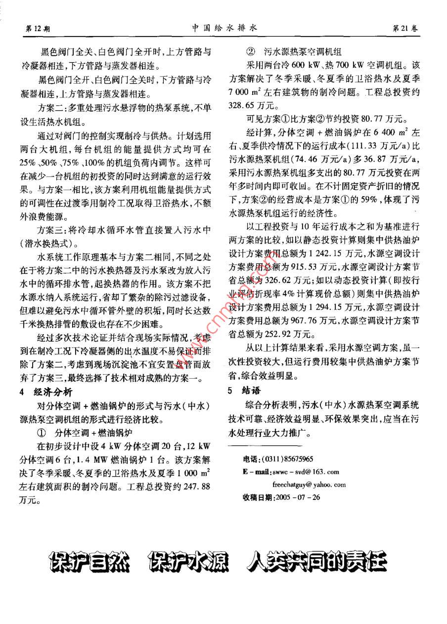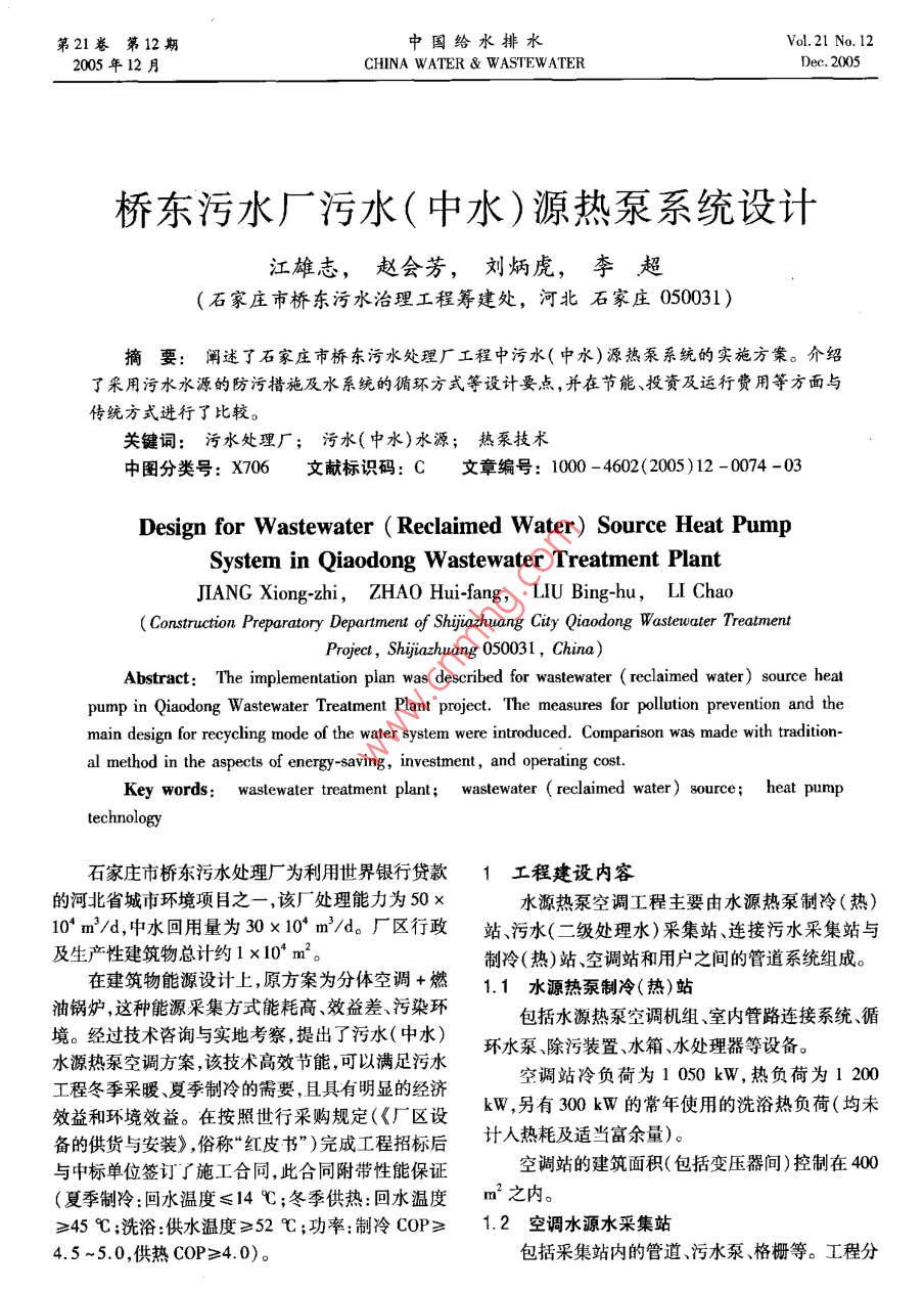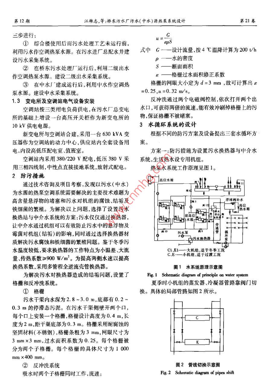 第21卷第12期中國給水排水Vol 21 No 122005年12月CHINA WATER WASTEWATERDec. 205橋東污水廠污水(中水)源熱泵系統(tǒng)設(shè)計江雄志,趙會芳,劉炳虎,李超(石家莊市橋東污水治理工程籌建處,河北石家莊050031)摘要:闡述了石家莊市橋東污水處理廠工程中污水(中水)源熱泵系統(tǒng)的實施方案。介紹了采用污水水源的防污措施及水系統(tǒng)的循環(huán)方式等設(shè)計要點,并在節(jié)能、投資及運行費用等方面與傳統(tǒng)方式進行了比較。關(guān)鍵詞:污水處理廠;污水(中水)水源;熱泵技術(shù)中圖分類號:X706文獻標(biāo)識碼:C文章編號:1000-4602(2005)12-074-03Design for Wastewater( Reclaimed Water) Source Heat PumpSystem in Qiaodong Wastewater Treatment PlantJIANG Xiong-zhi, ZHAO Hui-fang, LIU Bing-hu, LI ChaoConstruction Preparatory Department of Shijiazhuang City Qiaodong Wastewater TreatmentProject, Shijiazhuang 050031, China)Abstract: The implementation plan was described for wastewater(reclaimed water)source heatpump in Qiaodong Wastewater Treatment Plant project. The measures for pollution prevention and themain design for recycling mode of the water system were introduced. Comparison was made with tradition-al method in the aspects of energy-saving, investment, and operating costKey words: wastewater treatment plant; wastewater (reclaimed water ) source: heat pumptechnolog石家莊市橋東污水處理廠為利用世界銀行貸款1工程建設(shè)內(nèi)容的河北省城市環(huán)境項目之一,該廠處理能力為50水源熱泵空調(diào)工程主要由水源熱泵制冷(熱)10m3/d,中水回用量為30×10m/d。廠區(qū)行政站、污水(二級處理水)采集站連接污水采集站與及生產(chǎn)性建筑物總計約1×104m2。制冷(熱)站、空調(diào)站和用戶之間的管道系統(tǒng)組成。在建筑物能源設(shè)計上,原方案為分體空調(diào)+燃1.1水源熱泵制冷(熱)站油鍋爐,這種能源采集方式能耗高、效益差、污染環(huán)包括水源熱泵空調(diào)機組、室內(nèi)管路連接系統(tǒng)、循境。經(jīng)過技術(shù)咨詢與實地考察,提出了污水(中水)水源熱泵空調(diào)方案,該技術(shù)高效節(jié)能,可以滿足污水環(huán)水泵、除污裝置、水箱、水處理器等設(shè)備。工程冬季采暖、夏季制冷的需要,且具有明顯的經(jīng)濟空調(diào)站冷負(fù)荷為1050kW,熱負(fù)荷為1200效益和環(huán)境效益。在按照世行采購規(guī)定(《廠區(qū)設(shè)kW,另有300kW的常年使用的洗浴熱負(fù)荷(均未備的供貨與安裝》,俗稱“紅皮書”)完成工程招標(biāo)后計入熱耗及適當(dāng)富余量)與中標(biāo)單位簽訂了施工合同,此合同附帶性能保證空調(diào)站的建筑面積(包括變壓器間)控制在400夏季制冷:回水溫度≤14℃;冬季供熱:回水溫度m2之內(nèi)?!?5℃;洗浴:供水溫度≥52℃;功率制冷COP≥12空調(diào)水源水采集站4.5~5.0,供熱COP≥4.0)。包括采集站內(nèi)的管道、污水泵、格柵等。工程分第12期江雄志,等:橋東污水廠污水(中水)源熱泵系統(tǒng)設(shè)計第2】卷步進行①綜合樓使用后而污水處理工藝未運行前利用污水作空調(diào)熱泵水源。在污水進廠總配水井建式中G——設(shè)計流量按4℃溫降計算為200h設(shè)污水采集系統(tǒng)。p—水的密度②在橋東污水處理廠運行后,利用二級出水S—斷面面積作空調(diào)熱泵水源。建設(shè)二級出水采集系統(tǒng)。E—格柵過水面積修正系數(shù)③在中水廠建成運行后,利用中水作空調(diào)熱格柵的網(wǎng)眼大小定為d=3mm,故可計算出E泵水源。建設(shè)中水采集系統(tǒng)0.25,l=0.32m/s。1.3變電所及空調(diào)站電氣設(shè)備安裝反沖洗通過兩個電磁閥控制,依次打開兩個出空調(diào)站按三類用電負(fù)荷供電,在污水廠總變電水口,可獲得兩倍的流速,能有效沖刷掉格柵上的污所的基礎(chǔ)上增設(shè)一臺高壓開關(guān)柜作為新變電所的物保證格柵不被堵塞10kV供電電源3水循環(huán)系統(tǒng)的設(shè)計新變電所與空調(diào)站合建,采用一臺630kVA變根據(jù)不同的防污方案及設(shè)備提出三套水循環(huán)方壓器作為空調(diào)站的動力中心,供應(yīng)站內(nèi)全套設(shè)備用案。電,內(nèi)設(shè)高低壓配電室、值班室。方案一:防污措施為設(shè)置污水換熱器與中介水空調(diào)站內(nèi)采用38020V配電,低壓380V采系統(tǒng),生活熱水設(shè)專用機組。用三相四線制,中性點直接接地系統(tǒng)放射式配電。熱泵水系統(tǒng)工作原理見圖1。2防污措施上高位水箱通過技術(shù)咨詢及項目考察,發(fā)現(xiàn)以污水(中水)為水源的熱泵空調(diào)系統(tǒng)需要解決的主要技術(shù)難題為高含量懸浮物的堵塞和污水對機組的腐蝕、結(jié)垢及浮球閥補水鐵細菌的繁殖。為解決以上問題,選擇了設(shè)置污水熱水箱換熱站與中介水系統(tǒng)的方案:污水僅僅通過換熱器水箱讓中介水通過機組可以有效防止污水中的懸浮物及霉菌對機組(結(jié)垢)的影響,同時通過選擇換熱器材質(zhì)解決污水腐蝕和鐵細菌的繁殖問題。鑒于冬季污水換熱器水溫度較低,要求換熱器的工作特點為小溫差、大流機組,適于冬季工況量、傳熱系數(shù)≥900W/m2。為提高兩側(cè)水速以提高C、E—小機組,適于過渡工況換熱系數(shù),采用多管程全逆流殼管換熱器。圖1水系統(tǒng)原理示意圖為解決污水對換熱器造成的結(jié)垢問題,設(shè)置了Fig 1 Schematic diagram of principle on water system格柵和反沖洗系統(tǒng)。夏