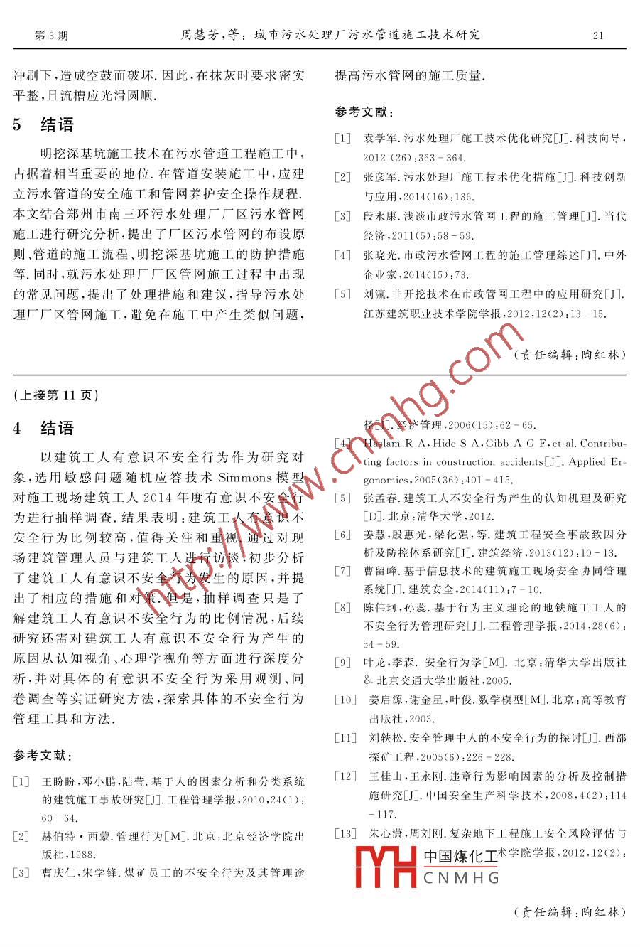 第15卷第3期江蘇建筑職業(yè)技術學院學報Vol. 15 No.32015年09月JOURNAL OF JIANGSU JIANZHU INSTITUTESep. 2015城市污水處理廠污水管道施工技術研究周慧芳',高將1,朱蒙恩2( 1.江蘇建筑職業(yè)技術學院建筑工程管理學院,江蘇徐州221116;2.機械工業(yè)第六設計研究院有限公司,河南鄭州450007 )摘要: 污水處理廠管道的施工質量決定了投入運營后管道的日常維護.為了優(yōu)化污水處理廠廠區(qū)污水管道的施工,以提高污水管道的施工質量,以鄭州市南三環(huán)污水處理廠廠區(qū)污水管道施工為例,進行了污水管道的布設、施工工藝、施工方案、明挖深基坑施工防護等方面的研究,分.析了施工過程中出現(xiàn)的常見問題及采取的措施.結果表明:在明挖深基坑管道施工過程中,采取踏勘施工現(xiàn)場、合理確定工藝流程、及早采取防護措施等,對污水處理廠廠區(qū)管網施工有著重要的意義.關鍵詞:污水處理廠;污水管道;深基坑;工藝流程;防護措施中圖分類號:TU 175文獻標志碼: A文章編號: 2095 - 3550(2015)03 -0018 - 04Study on sewer line construction technique of municipal sewage plantZHOU Huifang' ,GAO Jiang' ,ZHU Mengen2( 1. School of Construction Management, Jiangsu Jianzhu Institute, Xuzhou, Jiangsu 221116,China;2. No.6 Institute of Project Planning & Research of Machinery Industry EngineeringGroup Co., Ltd, Zhengzhou, Henan 450007,China )Abstract: Construction quality of sewer line of municipal sewage plant determines the routine maintenanceafter being put into operation. In order to optimize sewer line construction of sewage plant and improve theconstruction quality, this paper, taking sewer line construction of Zhengzhou Nansanhhuan Sewage Plant asan example, carries out studies on pipeline layout, construction technology, construction scheme and con-struction protection of open cutting deep foundation pit, and analyzes the common problems as well ascountermeasures. Results show that during construction process of open cutting deep foundation pit pipe-line, it is important to survey construction site, determine technological process reasonably, adopt protec-tion measures as soon as possible for sewer line construction of sewage plant.Key words: sewage plant; sewer line; deep foundation pit; technological process ; protection measures隨著國民經濟的快速發(fā)展,人們對物質追求和享成為我國的奮斗目標.城市污水處理廠建設作為市政受越來越高.生活環(huán)境關乎到人們的切身利益,打造生公月中國煤化工捷.城市污水管網的完態(tài)宜居城市,建設資源節(jié)約型、環(huán)境友好型社會,已經善YHCNMHG目之--.城市污水處理廠內部各構筑物是整個污水處理的核心和主體,而廠區(qū)的污水管網(輸送廠區(qū)污水以及處理廠的污泥二次收稿日期: 2015-03 -22.回流)作為附屬管網設施,是為了污水能夠更好地進行作者簡介:周慧芳,女,山東荷澤人,講師,碩土.E - mail: huifang 01 10@ 163. com深化處理.廠區(qū)的污水管網的高效運行,其施工技術顯第3期周慧芳,等:城市污水處理廠污水管道施工技術研究19得更為重要.通過對管網施工方案的優(yōu)化,在施工的合結構,將常規(guī)分散、開放布置的污水處理各個功能池理性與經濟效益上達到共贏的目的.本文以鄭州市體密集整合到-一個密閉的箱體內部,污水進人箱體后南三環(huán)污水處理廠的廠區(qū)污水管網明挖深基坑技術為經過粗細格柵.曝氣沉砂池、初沉池、生物反應池、=沉池高密度沉淀池.v型濾池等工藝,被處理成中水例進行分析和研究.流出.該污水處理廠屬于典型的半地下式結構.箱體1 明挖深基坑施工概述內部分為上下兩層,下層為污水處理的功能池體,上根據中華人民共和國住房和城鄉(xiāng)建設部于層為操作層.工程平面由完全縫劃分為15 個區(qū),每區(qū)2009年5月13日發(fā)布《危險性較大的分部分項工之間結構斷開,依靠橡膠止水帶形成封閉池體.箱體程安全管理辦法》中的附屬文件,對深基坑工程的頂板后期覆土1. 5 m,規(guī)劃為景觀公園.定義為:開挖深度超過5m(含5 m)的基坑(槽)的3廠區(qū)污水管網施工方案土方開挖、支護、降水工程.另外,有些開挖深度雖未超過5m,但地質條件、周圍環(huán)境和地下管線復3.1污水管 網布設原則雜,或影響毗鄰建筑(構)物安全的基坑(槽)的土方根據污水管網的--般定線原則,除特殊情況下開挖、支護、降水工程也稱為深基坑.污水管網需要靠提升泵站外,其他情況的污水管網根據管道工程施工技術要求,明挖深基坑工程均按重力流排放.鄭州市南三環(huán)污水處理廠的廠區(qū)施工就是經勘察過的施工范圍,清理地面雜物.放線,污水管網按地勢坡度進行定線.廠區(qū)中污水進入箱根據施工管道的管徑大小和埋設深度,確定基坑的坡體入口處標高為-7.30 m(廠區(qū)地面標高為士0.00),度和開挖深度,并在施工區(qū)域設置圍擋和警示標語.污水管網收集廠區(qū)污水和二次回流污泥口處的標在進行開挖前,施工單位應編制深基坑專項施工方高為-2.60m,兩點標高差為4.70m.結合廠區(qū)實案.組織專家論證.參加專家論證會的人員除專家組際,從污水匯集口標高為-2.60m處開挖.開挖一成員外,建設單位項目負責人、監(jiān)理單位總監(jiān)、施工單段,護坡- -段,標高復測一段,鋪設污水管一段,做位相關負責人.勘察和設計單位項目負責人也應該參到施工完畢后,污水按重力流排至箱體人口處.加.待方案經專家組論證通過后,才可按論證后方案3.2污水管網 施工技術要點組織實施.若方案未獲專