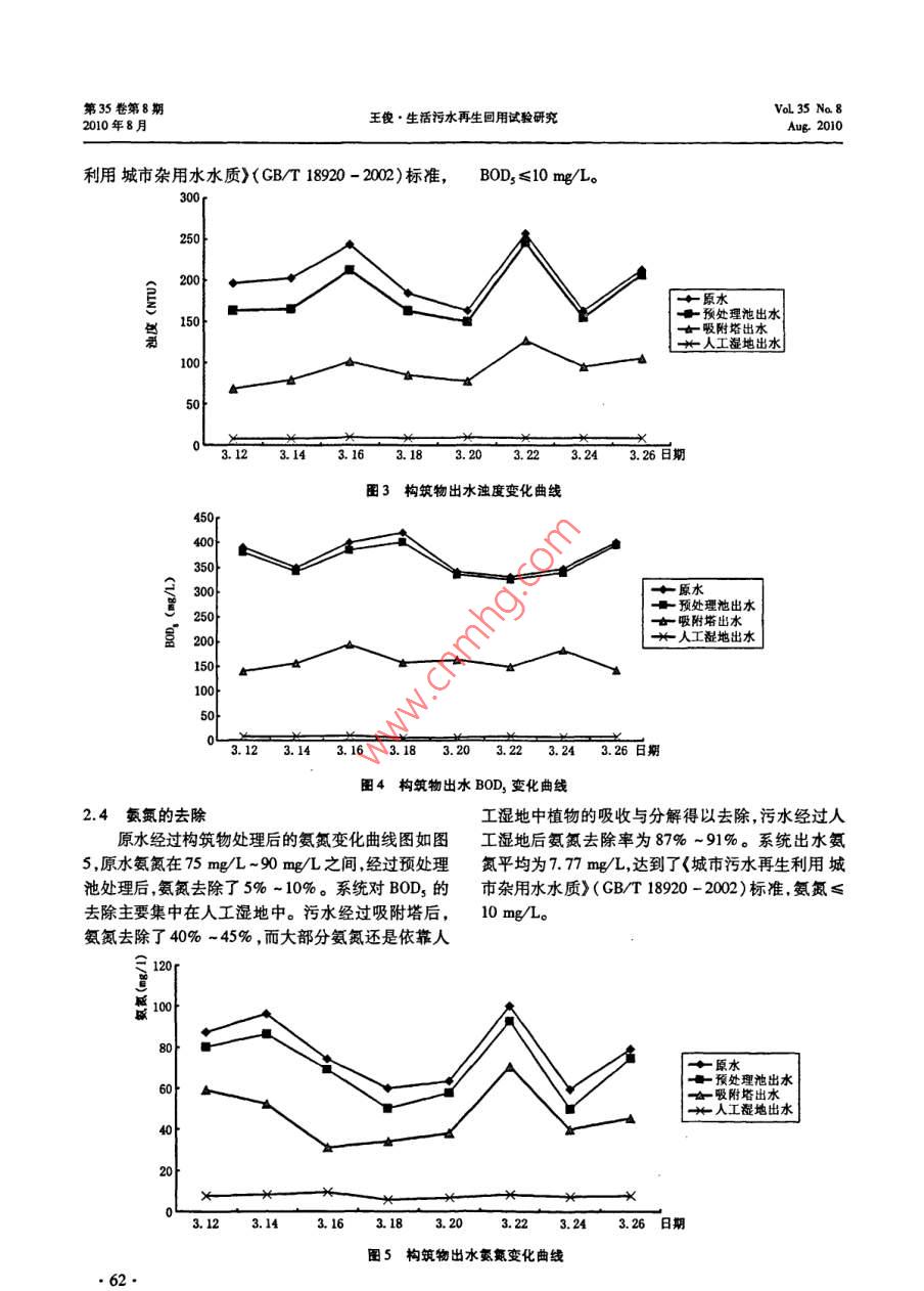第35卷第8期環(huán)境科學(xué)與管理Vol 35 No 82010年8月ENVIRONMENTAL SCIENCE AND MANAGEMENTAug. 2010文章編號(hào):1674-6139(2010)08-0060生活污水再生回用試驗(yàn)研究王俊(中交第二航務(wù)工程勘察設(shè)計(jì)院有限公司湖北武漢430071)摘要:分散式生活污水處理與回用可以大大提高水賁源的利用效率,本試驗(yàn)設(shè)計(jì)的一套新的污水處理系統(tǒng)利用生物質(zhì)吸附塔和人工濕地相結(jié)合的方法處理生活污水,對(duì)生活污水有著很好的處理效果,出水水質(zhì)穩(wěn)定,并且各指標(biāo)均達(dá)到了城市雜用水的水質(zhì)標(biāo)準(zhǔn),在整個(gè)污水處理過程中無二次污染做到了清潔生產(chǎn)。關(guān)鍵詞:生活污水;田用;吸附;生物質(zhì)中圖分類號(hào):X22文獻(xiàn)標(biāo)識(shí)碼:AStudy on Reuse of DomesticWang JunCCCC Second Harbor Consultants Co. Ld, Wuhan 430071, China)Abstract: Treatment and reuse for small amount of domestic sewage is very important in developing in our country. And itcan greatly improve the efficiency of using of the water. In this experiment we design a new system of treatment for sewage, thesystem include biomass adsorption tower and constructed wetland. The system can treat the water very well. Water quality of thetlet is very stable. The indexes of the water of the outlet are all achieve the standard. And in the process of the treatment, it isclean productiKey words: domestic sewage; reuse; ads二十一世紀(jì),隨著全球污染的加劇,環(huán)境的惡進(jìn)行生物處理濕地出水經(jīng)過臭氧消毒后收集于集化,水資源供需矛盾日益突出。為了解決這一矛盾,水池中面必須節(jié)約用水,提高水資源的利用效率,另一生活所木處理池]氣一生物原覺方面要對(duì)污水進(jìn)行處理回收利用,走水資源利用可持續(xù)發(fā)展的道路。生活污水是城市污水的主要來集水臭氧消毒人工濕地生物質(zhì)吸附塔2源如果能夠?qū)ι钗鬯M(jìn)行分散式處理并回用,則必將大大地提高水資源的利用效率,緩解日益突出圖1試驗(yàn)工藝流程圖的水資源短缺問題。針對(duì)生活污水回用,本試驗(yàn)設(shè)1.2試驗(yàn)裝置計(jì)了一套新型的污水回用處理系統(tǒng)2本污水處理系統(tǒng)由四部分組成:預(yù)處理池,調(diào)節(jié)池生物質(zhì)吸附塔,人工濕地。預(yù)處理池和調(diào)節(jié)池用1實(shí)驗(yàn)方法與裝置混凝土澆注,預(yù)處理池中填充刨花,刨花可以攔截污充程1.1試驗(yàn)工藝流水中較大的顆粒物質(zhì)對(duì)污水進(jìn)行初次的過濾。調(diào)節(jié)試驗(yàn)流程圖如圖1。本系統(tǒng)主要由預(yù)處理池、池收集預(yù)處理池的出水調(diào)節(jié)生物質(zhì)吸附塔的進(jìn)水水調(diào)節(jié)池、生物質(zhì)吸附塔、人工濕地集水池組成。生質(zhì)。其中預(yù)處理池長1.5m,寬1.5m,深1.4m。調(diào)活污水首先經(jīng)過預(yù)處理池進(jìn)行預(yù)處理,然后流人調(diào)節(jié)池長2m寬1.5m深12m節(jié)池,再經(jīng)提升泵提升至生物質(zhì)吸附塔1,進(jìn)行一級(jí)試驗(yàn)采用兩個(gè)吸附塔串連形式作為吸附裝置吸附,一級(jí)吸附處理后的水通過重力流進(jìn)入生物質(zhì)水流方式為降流式。兩個(gè)吸附塔用25m不銹鋼吸附塔2生物質(zhì)吸附塔2的出水再流入人工濕地材料制作,塔高2米直徑1米塔的底部制作篩網(wǎng)與隔板,用來承重填料與濾水塔的上部用多孔不銹收稿日期:2010-01-27鋼管布水并安裝水位計(jì),塔頂安裝溢流管溢流管與作奢筒介:王俊(1981-)男碩士主要研究方向污水處理技術(shù)。預(yù)處理池相連。填料為鋸末。第一個(gè)生物質(zhì)吸附塔第35卷第8期2010年8月王俊·生活污水再生回用試驗(yàn)研究Vol 35 No 8Aug. 2010填充10~40目的鋸末,填充鋸末的高度為0.80m;第2個(gè)生物質(zhì)吸附塔填充40目~80目的鋸末鋸2實(shí)驗(yàn)結(jié)果與分析末填充的高度為1.20m。在試驗(yàn)開始之前先用清水對(duì)鋸末進(jìn)行清洗,直人工濕地長168m寬45m,深0.8m。底面到清水滲過鋸末后保持水的色度不變?nèi)缓髮⑶逑匆曰炷翝沧?周邊以磚砌水泥抹面。人工濕地主過的鋸末填入吸附塔中。在試驗(yàn)過程中隨著時(shí)間要有三層防滲層基質(zhì)層和植物層。防滲層防止污和處理水量的增加生物質(zhì)吸附的容量也增加同水滲人地下?;|(zhì)層又分為表層土,細(xì)煤渣粗煤時(shí),生物質(zhì)吸附塔的滲透阻力也會(huì)增大。當(dāng)達(dá)到渣。植物層種植植物為蘆葦。在濕地前端的15cm定時(shí)間后生物質(zhì)吸附容量會(huì)布置礫石區(qū)以防止出現(xiàn)表面流和布水不均勻;在濕物質(zhì)吸附塔的處理效率會(huì)急劇下降而鋸末層上的地出水的集水區(qū)的02m,0.4m和0.6m三個(gè)高度水頭損失也會(huì)急劇上升,此時(shí)應(yīng)該作為一個(gè)吸附周處設(shè)出水管以調(diào)節(jié)濕地系統(tǒng)的水深(-。期,及時(shí)更換鋸末。通過試驗(yàn)得知,系統(tǒng)的吸附周期1.3分析項(xiàng)目與方法為15-20天。色度采用鉑鉆比色法,濁度采用WGZ-200型2.1色度的去除散射式濁度儀檢測BOD5采用稀釋與接種法氨氮原水經(jīng)過構(gòu)筑物處理后的色度變化曲線圖如圖采用納氏試劑比色法。2,原水色度在180~240之間,經(jīng)過預(yù)處理池處理1.4原水水質(zhì)后,色度去除了5%~10%。系統(tǒng)對(duì)色度的去除主原水取生活小區(qū)的生活污水,水質(zhì)如表1:要集中在吸附