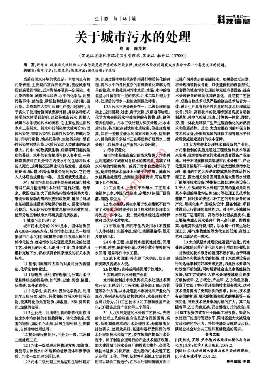生|態(tài)|與|環(huán)|境利技層關(guān)于城市污水的處理戰(zhàn)濤陳茂林(黑龍江省海林市環(huán)境衛(wèi)生管理站,黑龍江牡丹江157000摘要:近年來,城市居民垃圾和工業(yè)水污染是最嚴(yán)重的水污染來源,致使污水處理問題現(xiàn)成為當(dāng)今世界一個(gè)備受關(guān)注的問題關(guān)鍵詞:城市污水;處理技術(shù);物理方法;固體物質(zhì);污染物當(dāng)前我國水環(huán)境的狀況是:主要河流有機(jī)法即通過微生物的代謝作用進(jìn)行物質(zhì)轉(zhuǎn)化的過以推廣國外先進(jìn)的制罐技術(shù),如拼裝式反應(yīng)器。污染普遍,主要湖泊富營養(yǎng)化嚴(yán)重,流經(jīng)城市河程,將污水中的各種復(fù)雜的有機(jī)物氧化降解為簡將處理構(gòu)筑物設(shè)備化,以快速低耗的設(shè)備型式,段普遍受到污染近岸海域亦受到一定污染。水單的物質(zhì)生物處理對污水水質(zhì)、水溫水中的溶成套提供城市污水處理的單元反應(yīng)器設(shè)備;提高污染的來源城市居民垃圾、水中的化學(xué)品、河流氧量、p值等有一定的要求污水二級(jí)處理為主水處理設(shè)備的成套化和設(shè)備化,將完整工藝技污染事件、硝酸鹽、磷酸鹽和洗滌劑、鋁污染、鉛體處理后的污水一般能達(dá)到排放標(biāo)準(zhǔn)術(shù)、成熟自控技術(shù)以及嚴(yán)格的制造技術(shù)結(jié)合為一污染。水資源在人類生活和生產(chǎn)使用過程中,由123污水三級(jí)處理是在一、二級(jí)處理的基體設(shè)計(jì)生產(chǎn)具有高科技含量的的廢水處理成套于喪失了使用價(jià)值而被廢棄外排,并以各種形式礎(chǔ)上應(yīng)用混凝過濾離子交換反滲透等物理、設(shè)備;另外高新技術(shù)的使用特別是高度自動(dòng)控使受納水體受到影響這就是城市污水即排入化學(xué)方法去除污水中難溶解的有機(jī)物磷氮等制系統(tǒng)使電氣控制、儀表計(jì)算機(jī)一體化即監(jiān)、城鎮(zhèn)污水系統(tǒng)的污水的統(tǒng)稱它主要包括生活污營養(yǎng)性物質(zhì)。污水三級(jí)處理為深度處理,出水水控管一體化是環(huán)保廠生產(chǎn)過程自動(dòng)化的必然要水和工業(yè)污水。污水中的污染物大致可分為:固質(zhì)較好甚至能達(dá)到飲用水質(zhì)標(biāo)準(zhǔn)但處理費(fèi)用求和發(fā)展趨勢??傊罅Πl(fā)展我國的環(huán)保自控體污染物、需氧污染物營養(yǎng)性污染物、酸堿污染高,除在一些極度缺水的國家和地區(qū)外,應(yīng)用較技術(shù)和設(shè)備,是提高我國的環(huán)保工程管理水平和物、有毒污染物、油類污染物、生物污染物、感官少。目前我國許多城市正在籌建和擴(kuò)建污水二級(jí)處理設(shè)施穩(wěn)定運(yùn)行的根本保障性污染物和熱污染。水質(zhì)污染對人類健康的危害處理廠,以解決日益嚴(yán)重的水污染問題32大力推進(jìn)水處理技術(shù)和設(shè)備的產(chǎn)業(yè)化極大。污水中的致病微生物病毒等可引起傳染2污水資源化水污染控制的實(shí)施是通過工程設(shè)施和技術(shù)裝備的蔓延。水中的有毒物質(zhì)可使人畜中毒,一些城市污水是城市穩(wěn)定的淡水資源,污水再來實(shí)現(xiàn)我國需要建立污水處理成套設(shè)備產(chǎn)業(yè)基劇毒物質(zhì)可在幾分鐘之內(nèi)使水中的生物和飲水生利用減少了城市對自然水的需求量削減了對地。對于不同規(guī)模和類型城市污水處理廠,產(chǎn)業(yè)人死亡這種情況還算比較容易發(fā)現(xiàn)。最危險(xiǎn)水環(huán)境的污染負(fù)荷,減弱了對水自然循環(huán)的干化發(fā)展目標(biāo)是不一樣的對于超大型城市污水處的是汞、鎘鉻鋁等金屬化合物的污染,它們進(jìn)擾,是維持健康水循環(huán)不可缺少的措施。城市污理廠采用的工藝大多是比較成熟的傳統(tǒng)活性污人人體后造成慢性中毒,一且發(fā)現(xiàn)就無法遏止。水經(jīng)再生處理后達(dá)到相應(yīng)標(biāo)準(zhǔn)要求,可應(yīng)用于泥工藝因此相關(guān)設(shè)備發(fā)展重點(diǎn)是大型污水處理付于城市污水的處理主要是通過城市排水如下幾個(gè)領(lǐng)域廠的單項(xiàng)技術(shù)設(shè)備(特別是二級(jí)處理相關(guān)設(shè)備)。管網(wǎng)匯集并輸送到污水處理廠進(jìn)行處理。近年21工業(yè)用水:主要用于冷卻水,工藝用水對于大、中型城市污水處理廠發(fā)展的重點(diǎn)是對已來,我國政府加大了經(jīng)濟(jì)結(jié)構(gòu)戰(zhàn)略性調(diào)整力度,和鍋爐十水沖洗與洗滌水雜用水(包括廠區(qū)澆基本掌握的氧化溝法和SB等處理工藝技術(shù)加繼續(xù)采取拉動(dòng)內(nèi)需的積極財(cái)政政策增加了對城灌消防、除塵)。速推廣,同時(shí)要加快這幾種工藝的專用設(shè)備的國市基礎(chǔ)設(shè)施建設(shè)和環(huán)境保護(hù)的投入,強(qiáng)化環(huán)境綜2農(nóng)業(yè)灌溉再生水用于農(nóng)業(yè)灌溉不僅節(jié)產(chǎn)化規(guī)?;a(chǎn),形成從設(shè)計(jì)、設(shè)備制造、項(xiàng)目合整治,從而使污染物排放總量得到有效控制,省了水資源同時(shí)也使回歸自然水體的處理水又建設(shè)到運(yùn)行管理的總體能力。對于中、小城鎮(zhèn)污使部分地區(qū)和城市水環(huán)境質(zhì)量有所改善。得到進(jìn)一步凈化。一般二級(jí)處理水經(jīng)過適當(dāng)稀釋水處理廠適用簡易、高