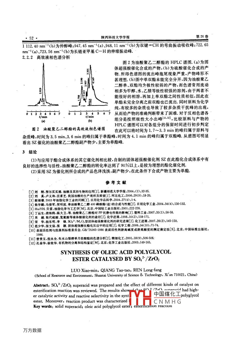 陜西科技大學(xué)學(xué)報(bào)Apr.2008JOURNAL OF SHAANXI UNTVERSITY OF SCIENCE TECHNOLOGYVoL 26文章編號:1000-5811(2008)02-0050-03油酸聚乙二醇酯催化合成研究羅曉民,強(qiáng)濤濤,任龍芳(陜西科技大學(xué)資源與環(huán)境學(xué)院,陜西西安710021)摘要:制備了SO3/ZrO2國體超強(qiáng)酸,考察了不同類型催化劑(自制固體超強(qiáng)酸、硫酸、對甲苯磺酸等)對酯化反應(yīng)的影響結(jié)果表明,SO2/ZrO2固體超強(qiáng)酸在油酸聚乙二醇酯合成反應(yīng)中具有較高的催化活性和高的反應(yīng)選擇性,并采用IR對反應(yīng)產(chǎn)物進(jìn)行了表征關(guān)鍵詞:固體超強(qiáng)酸;油酸聚乙二醇酯;酯化反應(yīng)中圖分類號:TQ316.314文獻(xiàn)標(biāo)識碼:A0前言近年來,隨著人們環(huán)保意識的增強(qiáng)加上油脂產(chǎn)品本身具有的低毒性低刺激性及易于生物降解的優(yōu)點(diǎn)采用油酸為原料合成表面活性劑越來越受到重視。油酸是最重要的一烯酸,存在于一切天然油脂中大約占天然脂肪酸總量的50%以上,并且是液體植物油的主要組成部分.油酸聚乙二醇酯是一類重要的工業(yè)反應(yīng)中間體將其進(jìn)一步衍生化可合成各類表面活性劑潤滑油油品添加劑等因此具有廣泛的工業(yè)應(yīng)用價(jià)值16.目前工業(yè)上生產(chǎn)油酸醇酯的方法主要為脂肪酸與醇類的直接酯化,傳統(tǒng)生產(chǎn)工藝中采用以濃硫酸為代表的無機(jī)酸為催化劑,使用硫酸作催化劑存在選擇性差、副產(chǎn)品多、污染環(huán)境等缺點(diǎn),因此開發(fā)環(huán)境友好型固體酸催化劑用于酯化反應(yīng)工藝具有實(shí)際的應(yīng)用前景.本文將自制固體超強(qiáng)酸、硫酸對甲苯磺酸、雜多酸離子交換樹脂等不同類型的催化劑應(yīng)用于油酸與聚乙二醇酯化反應(yīng),探索了適用的油酸聚乙二醇酯化反應(yīng)催化劑1實(shí)驗(yàn)部分實(shí)驗(yàn)材料Zrocl28H2O,分析純,上?;瘜W(xué)試劑廠;油酸,化學(xué)純洛陽市化學(xué)試劑廠;聚乙二醇化學(xué)純,天津市福晨化學(xué)試劑廠;其它試劑均為化學(xué)純1.2實(shí)驗(yàn)儀器超聲波細(xì)胞粉碎機(jī)(型號JY922D,寧波新芝生物科技股份有限公司);旋轉(zhuǎn)蒸發(fā)器(型號:R206,上海申生科技有限公司);傅立葉紅外光譜儀(型號: VECTOR22,美國 BRUKER公司).1.3實(shí)驗(yàn)方法1.3.1SO42/ZO2固體超強(qiáng)酸催化劑(SZ)的制備以 Zrocl2·8H2O為原料制備SO42/ZO2固體超強(qiáng)酸稱取ZrOC2·8H2O溶于去離子水中并配制成過飽和溶液隨后移入通風(fēng)櫥中,在磁力攪拌器上邊攪拌邊滴加28%的氨水溶液,直至出現(xiàn)白色絮狀沉淀調(diào)節(jié)溶液pH到所要求的范圍然后在鼓風(fēng)干燥箱中進(jìn)行烘干隨后,將此ZrO載體加人到硫酸促進(jìn)劑中進(jìn)行超聲波浸漬并在600℃下鍛燒3h1.3.2油酸聚乙二醇酯的合成在旋轉(zhuǎn)蒸發(fā)儀中進(jìn)行將一定量的油酸聚乙二醇、催化劑置于干燥的反應(yīng)瓶中,旋轉(zhuǎn)加熱,穩(wěn)定控制反應(yīng)溫度緩慢升高(100-130c),減壓分水待反應(yīng)體系的階中國煤化止冷卻,過濾·收稿日期:2008-02-01CNMHG作者簡介:羅曉民(1966-),女陜西省藍(lán)田縣人,副教授碩士,研究方向皮革化學(xué)品的合成及分析基金項(xiàng)目陜西省教育廳專項(xiàng)基金項(xiàng)目(05JK149)羅曉民等:油酸聚乙二醇酯催化合成研究51堿洗除去酸溫水洗至中性,蒸餾分水,得透明油狀產(chǎn)物1.3.3油酸醇酯的分析測試合成酯酸值、酯值的測定見參考文獻(xiàn)[9,10]合成酯紅外光譜分析(FTR)采用美國 BRUKER公司 VECTORS型傅立葉紅外光譜儀進(jìn)行.將產(chǎn)物樣品涂于KBr鹽片上,置于紅外樣品架上直接觀測其紅外光譜.掃描范圍4000~400cm-1,收集結(jié)果前扣除背景2結(jié)果與討論2.1不同催化劑催化性能的比較針對油酸聚乙二醇酯的合成體系催化效果差別較大,實(shí)驗(yàn)中使用了不同的催化劑,其它反應(yīng)條件為:n(聚乙二醇):n(油酸)=L.0:1.05,反應(yīng)溫度120℃,真空度2×10Pa每隔1h采樣測酸值,以濃硫酸作催化劑共反應(yīng)3h以對甲苯磺酸等作催化劑共反應(yīng)6h.實(shí)驗(yàn)結(jié)果見表1從表1可以看出,以表1不同催化劑催化合成油酸聚乙二醇酯的實(shí)驗(yàn)結(jié)果濃硫酸為催化劑活性最催化劑用量油酸轉(zhuǎn)化率強(qiáng),酸轉(zhuǎn)化率最高,所需反催化劑/%(wt)酯產(chǎn)率/%選擇性/%產(chǎn)品色澤應(yīng)時(shí)間最短,但由于會發(fā)濃硫酸78.96棕黑色生氧化、異構(gòu)化、焦化、聚對甲苯磺酸0.591棕紅色合等副反應(yīng)而使得目標(biāo)產(chǎn)雜多酸80.0079.8899.85淡黃色物收率降低、產(chǎn)品色澤變離子交換樹脂65.19淡黃色深;以對甲苯磺酸為催化Sz固體超強(qiáng)酸0.0790.4399.78淡黃色劑雖然轉(zhuǎn)化率較高,但反應(yīng)選擇性差,產(chǎn)品色澤深,導(dǎo)致產(chǎn)物后處理困難;以100雜多酸為催化劑反應(yīng)選擇性雖好,但催化活性不*9高;而以自制的固體超強(qiáng)酸SZ為催化劑,反應(yīng)具有良好的選擇性與較高的轉(zhuǎn)化率,可見固體超強(qiáng)酸是7種可用于此酯化體系的很有前途的催化劑需要指出的是,用SO42處理制得的固體超強(qiáng)酸與直接使用硫酸作催化劑無論從本質(zhì)上還是從后果來看都是不一樣的硫酸浸泡是為了引入硫酸根離子與氧化鋯(物)結(jié)合,加強(qiáng)氧化鋯(物)的路易§喜斯酸性,硫酸根離子不會進(jìn)入反