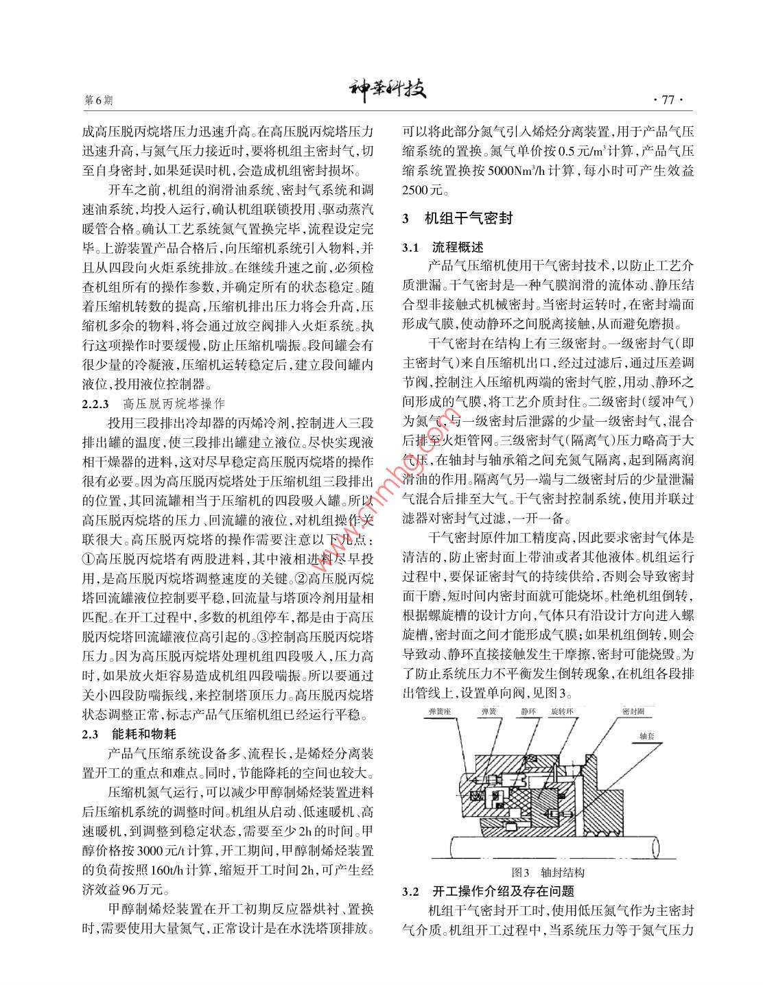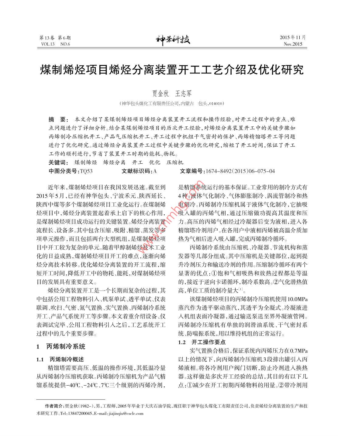 第13卷第6期神華科技2015年11月VOL.13 NO.6Nov.2015煤制烯烴項(xiàng)目烯烴分離裝置開工工藝介紹及優(yōu)化研究賈金秋王志軍(神華包頭煤化工有限責(zé)任公司,內(nèi)蒙古包頭,014010)摘要:本文介紹了某煤制烯烴項(xiàng)目烯烴分離裝置開工流程和操作經(jīng)驗(yàn),對開工過程中的重點(diǎn)、難.點(diǎn)問題進(jìn)行了詳細(xì)分析。結(jié)合某煤制烯烴項(xiàng)目的歷次開工經(jīng)驗(yàn),對烯烴分離裝置開工中的關(guān)鍵步驟如丙烯制冷壓縮機(jī)開工、產(chǎn)品氣壓縮機(jī)開工、開工過程中機(jī)組干氣密封的保護(hù)、丙烯精餾塔開工等問題進(jìn)行了優(yōu)化研究。通過烯烴分離裝置開工過程中關(guān)鍵步驟的優(yōu)化研究,縮短了開工時(shí)間,保證了開工工作的順利進(jìn)行,節(jié)省了裝置開工時(shí)期的能耗、物耗。關(guān)鍵詞:煤制烯烴 烯烴分離開工優(yōu)化壓縮 機(jī)中圖分類號(hào):TQ53文獻(xiàn)標(biāo)識(shí)碼:A文章編號(hào):1674- -8492(2015)06- -075-04近年來,煤制烯烴項(xiàng)目在我國發(fā)展迅速。截至到是精餾系統(tǒng)運(yùn)行的基本保證。工業(yè)常用的制冷方式有2015年5月,已經(jīng)有神華包頭、寧波禾元、陜西延長、4種:液體氣化制冷、氣體膨脹制冷、渦流管制冷和熱陜西中煤等多個(gè)煤制烯烴項(xiàng)目工業(yè)化運(yùn)行。在煤制烯電制冷。丙烯制冷壓縮機(jī)屬于液體氣化制冷,它抽吸烴項(xiàng)目中,烯烴分離裝置起著承上啟下的核心作用,吸人罐的丙烯氣相,通過壓縮做功提高其溫度和壓是煤制烯烴項(xiàng)目成功運(yùn)行的關(guān)鍵裝置。烯烴分離裝置力。高壓的丙烯氣相經(jīng)過冷凝器后變?yōu)橐合?進(jìn)人各.流程長、設(shè)備多。其中包含壓縮、吸附精餾、蒸發(fā)等多精餾塔冷劑用戶。在各用戶中液相丙烯被高溫介質(zhì)加項(xiàng)單元操作,而且包括兩臺(tái)大型機(jī)組,是煤制烯烴項(xiàng)熱為氣相后進(jìn)人吸人罐,完成丙烯制冷循環(huán)。目中開工較為復(fù)雜的單元。隨著甲醇制烯烴技術(shù)工業(yè)丙烯制冷系統(tǒng)由壓縮機(jī)、冷凝器、節(jié)流機(jī)構(gòu)和蒸化的日益成熟,煤制烯烴項(xiàng)目開工的難點(diǎn),逐漸向烯發(fā)器等幾部分組成。其中壓縮機(jī)是關(guān)鍵部位,起到提烴分離技術(shù)轉(zhuǎn)移。優(yōu)化烯烴分離裝置的開工流程,縮升冷劑壓力和輸送冷劑的作用。壓縮制冷循環(huán)有兩個(gè)短開工時(shí)間,降低開工中的物耗、能耗,對煤制烯烴項(xiàng)顯著的優(yōu)點(diǎn):①飽和氣相吸熱和放熱過程都是等溫目的發(fā)展具有重要意義。的,接近于逆向卡諾循環(huán),制冷系數(shù)高.②氣化潛熱值烯烴分離裝置開工是-一個(gè)長期而復(fù)雜的過程,其高,單位工質(zhì)的制冷量大"。中包括公用工程物料引入、機(jī)泵單試、透平單試、儀表該煤制烯烴項(xiàng)目的丙烯制冷壓縮機(jī)使用10.0MPa聯(lián)調(diào)、吹掃、氣密、氮?dú)庵脫Q、實(shí)氣置換、丙烯制冷系統(tǒng)蒸汽作為透平驅(qū)動(dòng)蒸汽,其透平為全凝式。冷凝液進(jìn)開工產(chǎn)品氣系統(tǒng)開工等步驟。本文著重介紹設(shè)備、儀入機(jī)組表面冷凝器,通過輸送泵送至界外凝液管網(wǎng)。表調(diào)試完畢、公用工程物料引人之后,工藝系統(tǒng)開工丙烯 制冷壓縮機(jī)有單獨(dú)的潤滑油系統(tǒng)、干氣密封系過程中的幾個(gè)重要步驟。統(tǒng)、防喘振系統(tǒng),用以維持機(jī)組的正常運(yùn)行。1.2 開工操作要點(diǎn)1丙烯制冷系統(tǒng)實(shí)氣置換合格后,保證系統(tǒng)內(nèi)丙烯壓力在0.7MPa1.1 丙烯 制冷概述以上的情況下,向丙烯制冷壓縮機(jī)3段排出罐引人丙精餾塔需要高壓、低溫的操作環(huán)境,其低溫冷量烯液相。將各冷劑用戶閥門切斷,防止冷劑進(jìn)人換熱.從丙烯制冷壓縮機(jī)獲取。丙烯制冷壓縮機(jī)為產(chǎn)品氣精器。這樣做是多次開工經(jīng)驗(yàn)的總結(jié),其目的有以下幾餾系統(tǒng)提供-409C .-24C、79三個(gè)級(jí)別的丙烯冷劑,點(diǎn):①減少在開工初期丙烯物料的用量。②帶冷劑用作者簡介:賈金秋( 1982-),男,工程師,2005年畢業(yè)于大慶石油學(xué)院,現(xiàn)任職于神華包頭煤化工有限責(zé)任公司,負(fù)責(zé)烯烴分離裝置的生產(chǎn)和技術(shù)研究工作oTel: 1847202005E-mail:jajnqiu@csclc.com●76.賈金秋等:煤制烯烴項(xiàng)目烯烴分離裝置開工工藝介紹及優(yōu)化研究第6期戶開工,丙烯制冷壓縮機(jī)運(yùn)行不穩(wěn)定,用戶中的冷劑去水和重?zé)N,在水洗塔除去甲醇、乙醇、乙醛、丙酮、丙會(huì)進(jìn)入一二段吸人罐,增加停車風(fēng)險(xiǎn).③用戶過早引醇、二甲醚等氧化物,在堿洗塔除去二氧化碳,在氣、人冷劑,會(huì)造成精餾系統(tǒng)回流和再沸不匹配,推遲產(chǎn)液相干燥器除去痕量水。前脫丙烷流程在壓縮機(jī)三段品合格時(shí)間。將碳四及以上重組分分離,減少進(jìn)人壓縮機(jī)四段的物丙烯制冷壓縮機(jī)組啟動(dòng),轉(zhuǎn)速達(dá)到最小可調(diào)轉(zhuǎn)速料量,降低了負(fù)荷。同時(shí),也導(dǎo)致了開工時(shí),脫丙烷系之后,主操作調(diào)整系統(tǒng)的各項(xiàng)參數(shù),建立起壓力和溫度統(tǒng)和壓縮機(jī)系統(tǒng)互相影響,增加了開工難度,見圖2。梯度。丙烯制冷系統(tǒng)