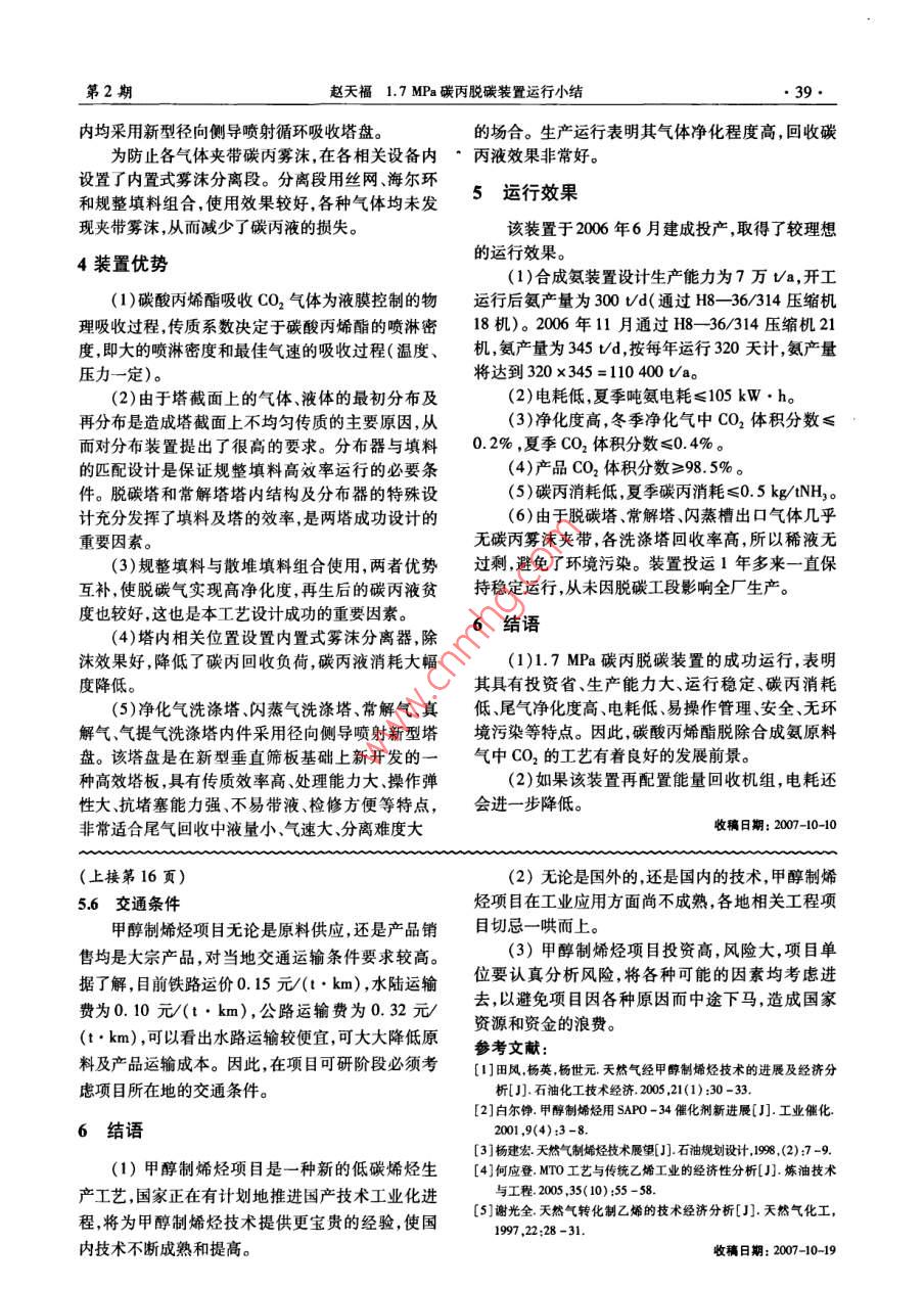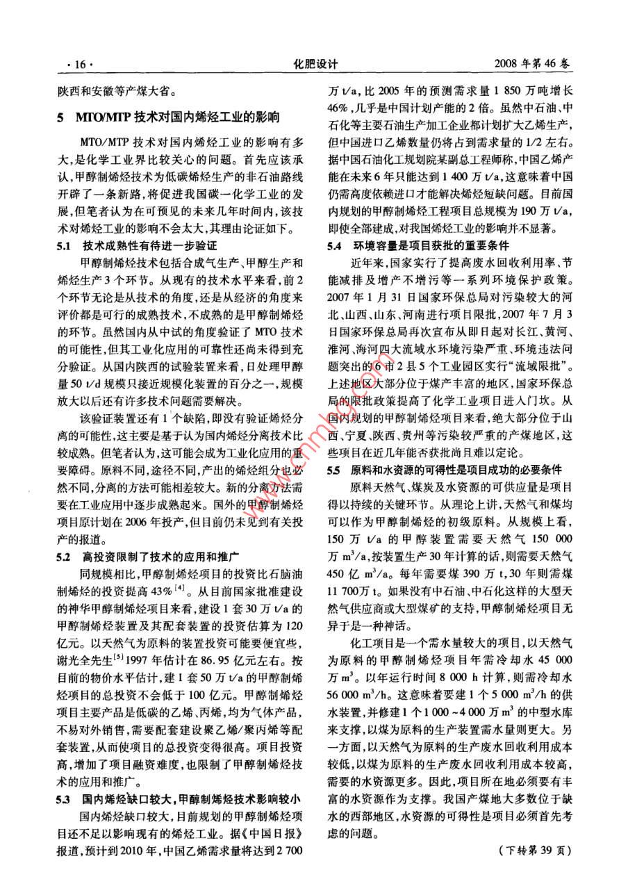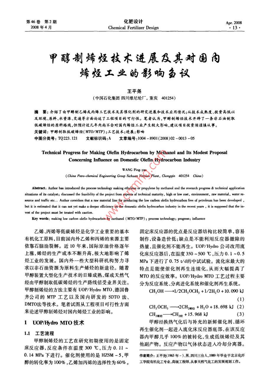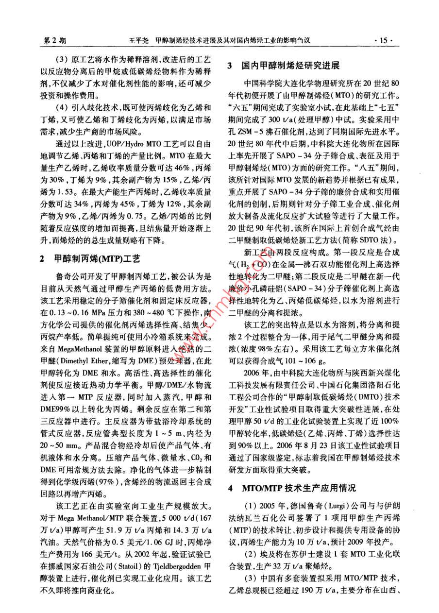 第46卷第2期化肥設(shè)計(jì)Apr. 20082008年4月Chemical Fertilizer Design●13●甲醇制烯烴技術(shù)進(jìn)展及其對國內(nèi)烯烴工業(yè)的影響芻議王平堯(中國石化集團(tuán)四川維尼綸廠,重慶401254)摘要:介紹了 由甲醇制乙烯或丙烯工藝技術(shù)及其催化劑的研究進(jìn)展和技術(shù)應(yīng)用情況;從技術(shù)成熟度、投資高低以及環(huán)境、原料、水資源、交通等方面論述了工程項(xiàng)目的可行性。筆者認(rèn)為,甲醇制烯烴技術(shù)開辟了一條非石油制取低碳烯烴的原料路線,但預(yù)計(jì)近幾年內(nèi)尚不會(huì)對國內(nèi)烯烴工業(yè)產(chǎn)生較大影響,建議項(xiàng)目投資須謹(jǐn)慎從事。關(guān)鍵詞:甲醇制取低碳烯烴( MTO/MTP);工藝技術(shù);進(jìn)展;影響中國分類號(hào): TQ223. 121文獻(xiàn)標(biāo)識(shí)碼:A文章編號(hào):1004 - 8901(2008)02 -0013 -05Technical Progress for Making Olefin Hydrocarbon by Methanol and Its Modest ProposalConcerning Infuence on Domestic Olefin Hydrocarbon IndustryWANG Ping-yao .( China Petro-chemical Enginering Group Sichuan Vinylon Plant, Chongqin 401254 China)Abstract: Author has introduced the process technology making ethylene or propylene by methanol and the reserch progress & tchnical applieationsituations of it catalyst; discussed the feasibility of the project from aspects of technical maturity, high or low coet, environment, row material, water吧source and taffe etc. . Author considers that a raw materil line for producing the low carbon olefn hydrocarbon free of petroleum has been developed,but it is estimated that it can not yet make a deeper efciency on the domestic olefin hydrocarbon industry in the recent years,it is supposed that the in-vet of the project must be treated with caution.Key words: making low carbon olefn hydroearbon by methanol (MTO/MTP); process tchnology; proree; influence乙烯、丙烯等低碳烯烴是化學(xué)工業(yè)重要的基本固定床反應(yīng)器的優(yōu)點(diǎn)是反應(yīng)器結(jié)構(gòu)比較簡單,容易有機(jī)化工原料,目前國內(nèi)外乙烯和丙烯的來源主要制作,設(shè)備造價(jià)低;缺點(diǎn)是不能利用反應(yīng)器撤除的依靠石腦油裂解。近10年來,國際原油價(jià)格逐年熱量,且催化劑不能再生。UOP/Hydro 公司改用流上漲,烯烴的生產(chǎn)成本不斷升高,極大地影響了烯化床反應(yīng)器后,在溫度350 ~500 C ,壓力0.1 ~0.5烴工業(yè)的發(fā)展。國內(nèi)外一些大型科研機(jī)構(gòu)努力尋MPa下進(jìn)行了0. 75 Vd的中試試驗(yàn)。流化床最大的求以非石油資源為原料生產(chǎn)烯烴的新途徑。隨著特點(diǎn)是能使催化劑再生連續(xù)化,從而大幅提高了甲醇裝置大型化生產(chǎn)技術(shù)的日臻成熟,煤或天然氣MTO的反應(yīng)效率。U0P/Hydro MTO工藝過程主要經(jīng)由甲醇制取低碳烯烴的生產(chǎn)路線倍受業(yè)界關(guān)注。分為反應(yīng)系統(tǒng)、分離進(jìn)化系統(tǒng)和催化劑再生系統(tǒng)。甲醇制烯烴的方法主要有UOP/Hydro MTO .德國魯CH,OH一→l/2CH3OCH, + 1/2H20 + 10.090 kJ齊公司的MTP工藝以及國內(nèi)研發(fā)的SDTO法、(1)DMTO法等技術(shù)。筆者試圖從工程項(xiàng)目可行性方面CH,OCH,一→+2CH2烴+H20 +18.698 kJ (2)來論述甲醇制烯烴對國內(nèi)烯烴工業(yè)的影響。CH燒一→CH2橋 +15. 968 kJ(3)1 UOP/Hydro MTO技術(shù)甲醇經(jīng)換熱氣化后與補(bǔ)充的新鮮催化劑、循環(huán)再生催化劑- -起進(jìn) 人流化床反應(yīng)器底部,在該反應(yīng)1.1工藝流程甲醇制烯烴的工藝在研究初期使用的是固定器內(nèi)甲醇幾乎100%的被轉(zhuǎn)化,生成低級(jí)烯烴及其床反應(yīng)器,反應(yīng)條件在溫度300 C,壓力0.11 ~他副產(chǎn)物。反應(yīng)產(chǎn)物以氣體狀態(tài)進(jìn)人拎卻分離器。0.14 MPa下進(jìn)行。催化劑使用的是HZSM -5,甲作者簡介:王平堯(1963年- ),男,四川三臺(tái)人,1989年畢業(yè)于北京化纖醇的轉(zhuǎn)化率為100% ,乙烯加丙烯的選擇性為60%。工學(xué)院有機(jī)化工專業(yè),高級(jí)I程師,從事天然氣化工的發(fā)展規(guī)劃工作?;试O(shè)計(jì)2008年第46卷反應(yīng)熱由反應(yīng)生成的水以蒸汽形式帶走一部分,其其合成方法是按通常的水熱法直接合成。理余的熱量由設(shè)置在反應(yīng)器內(nèi)部的冷卻盤管移出。想的硅源、鋁源和磷源分別為硅溶膠、水鋁石及正催化劑再生器與反應(yīng)器-起構(gòu)成-一個(gè)完整的MTO磷酸。常用的模板劑為四乙基氫氧化銨(TEAOH)。反應(yīng)系統(tǒng),使催化劑及時(shí)再生循環(huán)使用,反應(yīng)系統(tǒng)按照關(guān)系式(0.5~ 10)R: (0. 05 ~ 10)Si02:(0.2~得以連續(xù)運(yùn)行。失活的廢催化劑進(jìn)人再生器后,加3)AI20; (0.2 ~3)P20; (20 ~ 200)H20(R為模板人空氣進(jìn)行鍛燒,以除去催化劑上的積碳,恢復(fù)活劑)確定原料組成。在攪拌的同時(shí),將原料按一定性后又回到反應(yīng)器內(nèi)。催化劑表面的積碳在再生順序混合,充分?jǐn)嚢璩赡z,裝人不銹鋼高壓釜中,器內(nèi)燃燒放出的熱量經(jīng)回收后供其他單元使用。封閉加熱到150~250C,在自身壓力下進(jìn)行恒溫晶反應(yīng)生成物(氣體)在冷卻分離器中經(jīng)回收熱化反應(yīng),待晶化完成后,將固體產(chǎn)物過濾或離心分量后被冷卻,水及部分重組分被冷凝分離出來,氣離,水洗干燥即得SAP0 -34分子篩原粉(2]。相組分進(jìn)入下一工序,用堿洗脫出其中的CO2,然后UOP在SAP0-34的基礎(chǔ)上加入催化劑組合進(jìn)入干燥
