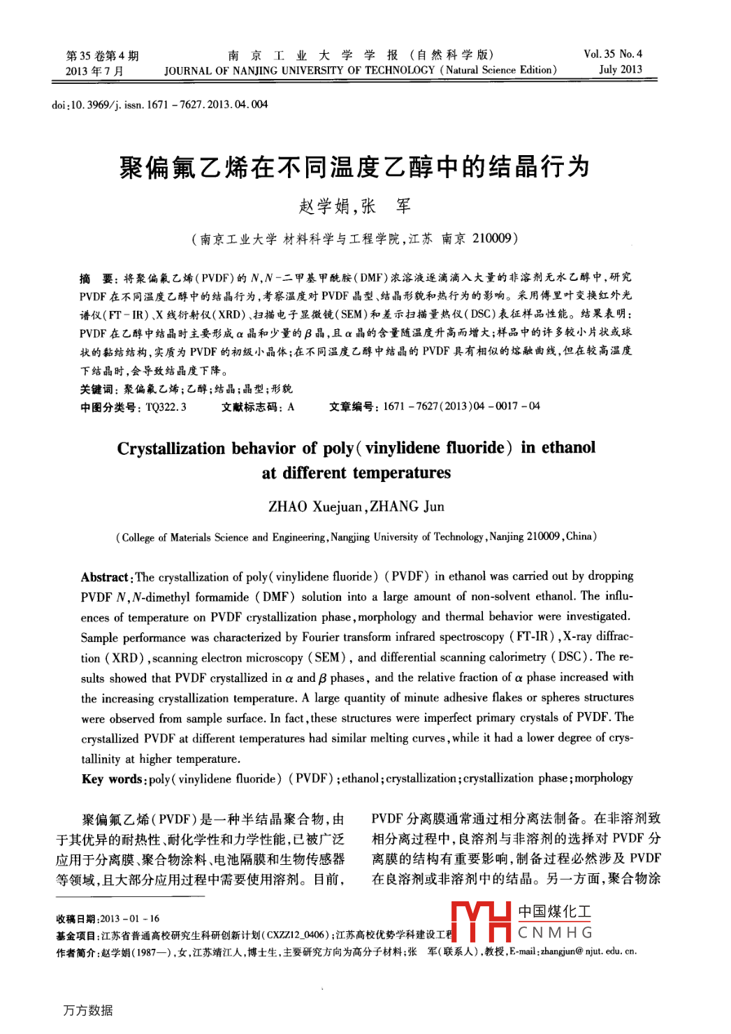 第35卷第4期南京工業(yè)大學(xué)學(xué)報(自然科學(xué)版)Vol 35 No, 42013 4F7 F JOURNAL OF NANJING UNIVERSITY OF TECHNOLOGY( Natural Science Edition) July 2013doi:10.3969/jisn.1671-7627.2013.04.004聚偏氟乙烯在不同溫度乙醇中的結(jié)晶行為趙學(xué)娟,張軍(南京工業(yè)大學(xué)材料科學(xué)與工程學(xué)院,江蘇南京210090摘要:將聚偏氟乙烯(PVDF)的N,N-二甲基甲酰胺(DMF)濃溶液逐滴滴入大量的非溶劑無水乙醇中,研究PVDF在不同溫度乙醇中的結(jié)晶行為,考察溫度對PVDF晶型、結(jié)晶形貌和熱行為的影響。采用傅里葉變換紅外光譜儀(FT-IR)、X線衍射儀(XRD)、掃描電子顯微鏡(SEM)和差示掃描量熱儀(DSC)表征樣品性能。結(jié)果表明:PvDF在乙醇中結(jié)晶時主要形成α晶和少量的β晶,且α晶的含量隨溫度升高而增大;樣品中的許多較小片狀或球狀的黏結(jié)結(jié)構(gòu),實質(zhì)為PVDF的初級小晶體;在不同溫度乙醇中結(jié)晶的PVDF具有相似的熔融曲線,但在較高溫度下結(jié)晶時,會導(dǎo)致結(jié)晶度下降。關(guān)鍵詞:聚偏氟乙烯;乙醇;結(jié)晶;晶型;形貌中圖分類號:TQ322.3文獻標志碼:A文章編號:1671-7627(2013)04-0017-04Crystallization behavior of poly vinylidene fluoride)in ethanolat different temperaturesZHAO Xuejuan, ZHANG JunCollege of Materials Science and Engineering, Nangjing University of Technology, Nanjing 210009, China)Abstract: The crystallization of poly vinylidene fluoride)(PVDF)in ethanol was carried out by droppingPVDF N, N-dimethyl formamide(DMF)solution into a large amount of non-solvent ethanol. The influ-ences of temperature on PVDF crystallization phase, morphology and thermal behavior were investigatedSample performance was characterized by Fourier transform infrared spectroscopy(FT-IR), X-ray diffraction(XRD), scanning electron microscopy(SEM), and differential scanning calorimetry( DSC). The re-sults showed that PVDF crystallized in a and B phases, and the relative fraction of a phase increased withthe increasing crystallization temperature. A large quantity of minute adhesive flakes or spheres structureswere observed from sample surface. In fact, these structures were imperfect primary crystals of PVDF. Thecrystallized PVDF at different temperatures had similar melting curves, while it had a lower degree of crys-tallinity at higher temperature.Key words: poly( vinylidene fluoride)(PVDF); ethanol; crystallization; crystallization phase; morphology聚偏氟乙烯(PVDF)是一種半結(jié)晶聚合物,由PVDF分離膜通常通過相分離法制備。在非溶劑致于其優(yōu)異的耐熱性、耐化學(xué)性和力學(xué)性能,已被廣泛相分離過程中,良溶劑與非溶劑的選擇對PDF分應(yīng)用于分離膜、聚合物涂料、電池隔膜和生物傳感器離膜的結(jié)構(gòu)有重要影響,制備過程必然涉及PVDF等領(lǐng)域,且大部分應(yīng)用過程中需要使用溶劑。目前,在良溶劑或非溶劑中的結(jié)晶。另一方面,聚合物涂收稿日期:2013-01-16中國煤化工基金項目:江蘇省普通高校研究生科研創(chuàng)新計劃(CXZ2_0406);江蘇高校優(yōu)勢學(xué)科建設(shè)工CNMHG作者簡介:趙學(xué)娟(1987-),女,江蘇靖江人,博士生,主要研究方向為高分子材料;張軍(聯(lián)系人),教授,E-mail:hangjun@njut.edu.cn南京工業(yè)大學(xué)學(xué)報(自然科學(xué)版)第35卷料的制備過程中通常需要使用良溶劑與非溶劑的混1.3樣品表征合溶劑,溶劑的選擇對聚合物涂料的穩(wěn)定性極其重采用 Nicolet iS5型傅里葉變換紅外光譜儀要。因此,研究PVDF在良溶劑與非溶劑中的結(jié)晶(FT-R,美國 Thermo Fisher公司,分辨率4cm-1,都是非常重要的。PⅤDF至少含有a晶、βB晶、y晶掃描范圍400~4000cm1)和XD-3A型X線衍和8晶34種晶體結(jié)構(gòu)。非極性的a晶是熱力學(xué)射儀(XRD,日本 Shimadzu公司掃描范圍5°-50°,上最穩(wěn)定的狀態(tài),極性的B晶具有獨特的介電和壓掃描速率4(°)/min)表征PⅤDF的晶體結(jié)構(gòu)電性能。在不同的溫度和壓力下,通過熔融結(jié)晶、溶利用Q200型差示掃描量熱儀(DC,美國TA液結(jié)晶機械拉伸可得到不同的PVDF晶型,不同的儀器公司)分析樣品的熱行為。稱取約10mg樣品晶型之間可相互轉(zhuǎn)化2。放人坩堝,置于DSC樣品池中。在N2保護下,以10目前,文獻報道的關(guān)于PVDF在溶劑中的結(jié)晶℃C/min的速率從室溫升至200℃,得到樣品的熔融行為,主要是在良溶劑或良溶劑與溶脹劑組成的混曲線。樣品的結(jié)晶度(X)通過式(1)計算。合溶劑中的結(jié)晶。PVDF從良溶劑中結(jié)晶所得到的△H晶型與溶劑的蒸發(fā)速率、結(jié)晶溫度有關(guān)2。低溫X100%°△H下,PVDF主要形成晶或a晶,而在高溫下,a晶則式中:△H為測試樣品的熔融焓;△H=104.5成為主要晶型。這是因為對溫度敏感的偶極子間的J/g8,為X。=100%的PVDF的熔融焓。相互作用會引起PVDF大分子鏈團尺寸的改變,從對樣品表面進行噴金處理,通過JSM-5900型而引起PVDF晶型的變化。PVDF從良溶劑和溶掃描電子顯微鏡(SEM,日本JOL公司)觀察樣品脹劑組成的混合溶劑中結(jié)晶時主要形成a晶和少的表面形貌。量的B晶。但是,關(guān)于PVDF在非溶劑中結(jié)晶行為的研究目前還沒有系統(tǒng)的報道。2結(jié)果與討論在前期工作中,筆者報道了PVDF和PVDF/聚由于PVDF不溶于非溶劑乙醇,因此不能通過甲基丙烯酸甲酯(PMMA)共混物在非溶劑乙醇中的溶液結(jié)晶直接制備得到在乙醇中結(jié)晶的PⅤDF樣結(jié)晶。本文選擇溫度為變量,研究PVDF在不品。本文首先將PVDF溶于良溶劑DMF中,配成同溫度乙醇中的結(