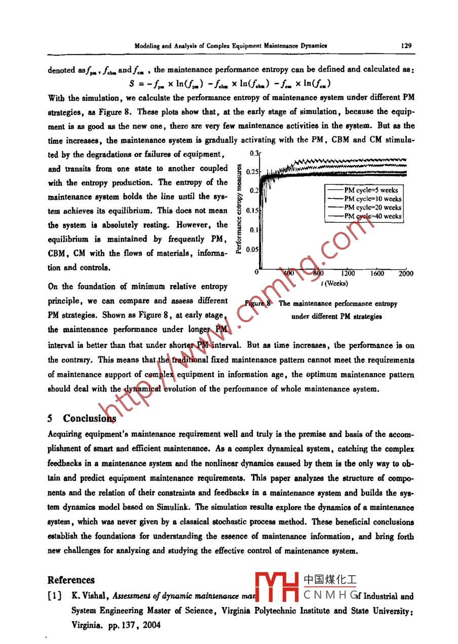 Intemationsl Joumal of Plant Engineering and ManagementVol.12 No.3Septcmber 2007Modeling and Analysis of Complex EquipmentMaintenance DynamicsYIN Xiao-hu' , LJU Hai-yan2,WEN Xi-sen' , QIAN Yan-ling' , YANG Yong -min'1. Institute of Mechatronic Engineering, School of Mechatronica and Automation,National University of Defense Technology, Changsha 410073, P. R. Cbina2. School of Language and Culture, Nanjing University of InformationScience Technology, Nanjing 210044, P. R. ChinaAbstract: An equipment maintenance system is naturally a complex dynamical system. The ffecive ma-intenance management must be based on the knowledge of the system's intrinsic dynamics. And the strue-ture of the maintenance system determines is beharior. This paper analyzes the basic structures and ele-ments of a maintenance system for complex multi-components equipment. The maintenance system is con-sidered as a dynamic system whose behasior is influenced by is struture's feedback and interaction, andthe system's awvailable resources. Building the dynamical model with Simulink, we show some resultsabou the maintenance system's nonlinear dynamics , which are never given by stochastic process meth-ods. The model can be used for understanding and determining maintenance system behavior, towardswhich operational adjustments of maintenance infrastructure, precise prediction of maintenance require-ments and timely supply of maintenance resources can be made in a more informed way.Key words: modeling and simulation, dynamics, maintenance system , complex equipment1 IntroductionIn the informnation age, precise and eficient maintenance support bas been necessary for eystematiccounterwork. In termns of 8ystem structure, an equipment maintenance system is naturally a multi-scaleaystem. On the scale of a Bystem' evolvement life, the cbange of equipment perfermance is continu-ous, while the maintenance activities are stochastic and discrete. However, wben the system's consti-tution is explored, it may deal with equipment, maintenance workers, maintenance resouree etc. Andon the 8cale of maintenance decision, three levels should be taken into account: the strategic, thetactic, and the organizational. The characteristics on different scales of a maintenance aystem are in-teractive and afected with maintenance informnation, s0 that the system will exhibit complex dymamicalbehavior in the equipment life cycle. In order to manage maintenance activities in a more informedand rational manner, it is very important to understand the inherently complex and dynamics of thesystem, to evaluate the systen's whole performance focusing on the maintenance information flow'I,and to catch the feedback and interaction between different enalee nf tha avstam(2]中國煤化工Tradinally , the stochastic simulation or Markov proceaTYHCN M H cmodel the equipment maintenance system, which considers the system a8 probaD1usuc ana containing several differentRceived 28 March 2007122International Joumal of Plant Engineering and Management Vol.12 No.3September 2007possible states. Based on the reliability of the single component or subsystem and some assumptions ofsystem structure,maintenance effects and equipment faults, various optimal models or statistical mod-els can be built. Although this method is very flexible with the application of various probability distri-butions, the drawback is obvious'?. On one hand, these assumptions have bard and fast precondi-tions; on the other hand, because of many complex feedbacks and delays in the system, the effect ofthe model and the system characters described by it cannot be observed and estimated. As to mainte-nance management, what people care is not the single component's change, but the whole system'schanges, such as maintenance requirement, resource demand ,equipment availability and degrada-tion. It is necessary that we should explore and analyze a maintenance system from a new angle.In system theory, it is the structure that determines the system's behavior. This paper considers thechanges of the whole equipment maintenance system as complex behavior resulting from its intrinsicfeedbacks in order to explore the effects of the feedbacks and the system's dynamics.2 Problem articulations and dynamic hypothesisThis paper deals with the maintenance system for multi-components complex equipment. Although theevents in the maintenance systems may be discrete, such 8s sudden unexpected failures, there are lots ofcontinuous and interacting processes, such as degradalion and repairing of machines , changes of mainte-nance requirements and supply of maintenance resources. Therefore ,continuous approximations can beused with dynamical simulation to model and analyze the complex equipment maintenance syetem.If complex equipment consists of many components, each having a different mean life and variancewhich are randomly distributed, then the system malfunction rate becomes esentally constant asfailed parts are replaced4. From a dynamic simulation point of view , the probabilistic nalure of fail-ures is " noise". Compared with the average failure rate, when the nunber of independent componentsin the complex equipment increases, the proportion of noise becomes smaller and smaller. Therefore,the maintenance system is simplified s0 that the stochastic behavior of failures can be considered as thedeteministic function of the average of the components populations. And the failure rate of themulti-components complex equipment could be approximated with an exponential function. Comparedto traditional methods, the fundamental difference is that its concermn is the proportion of broken-downcomponents in the whole, rather than the failure probability of each component.Failures or not depends on the level of equipment degredation and cumulative defects of components.On account of manufacture arts and crafts and wearing in use, there are some inevitable defects inequipment or its components. During the operational cycle, defects are 