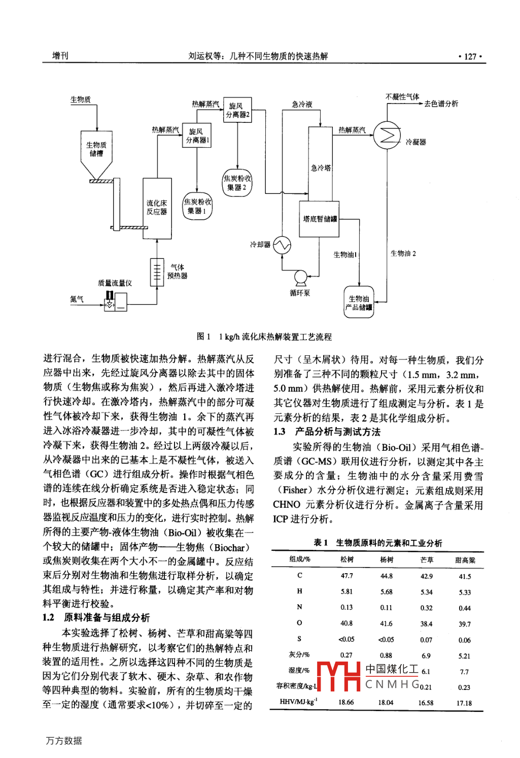 化工進展126·CHEMICAL INDUSTRY AND ENGINEERING PROGRESS2010年第29卷增刊幾種不同生物質(zhì)的快速熱解劉運權(quán),龍敏南(廈門大學能源研究院,福建廈門361005)摘要:在一流化床連續(xù)熱解裝置中(生物質(zhì)處理能力1kgh),對松樹、楊樹、芒草、和甜高粱等幾種典型的生物質(zhì)進行了快速熱解研究,考察了熱解溫度、停留時間、進料顆粒大小等對生物油產(chǎn)率與組成的影響,獲得了這幾種生物質(zhì)的最佳熱解工藝條件。研究結(jié)果表明,在相同的搡作條件下,木質(zhì)類生物質(zhì)具有相對較高的生物油產(chǎn)率;而芒草和甜高梁等草本類生物質(zhì)由于含灰分較多,熱解后所得固體產(chǎn)物——生物焦的產(chǎn)率較高,但生物油的產(chǎn)率相對較低,不過其生物油組成中含氧量也相對較低。關(guān)鍵詞:生物質(zhì);熱解;生物油;木質(zhì)纖維素生物質(zhì)能源作為一種可替代能源,目前越來越為了加速我國生物質(zhì)能源的利用與發(fā)展,開發(fā)受到重視。生物質(zhì)是指各種天然生成的和衍生出來具有實用價值的生物質(zhì)轉(zhuǎn)化與利用技術(shù),特別是滿的物質(zhì),比如木質(zhì)類和雜草類植物、木材廢料、蔗足福建省以及整個海西經(jīng)濟區(qū)對生物質(zhì)能源利用的渣、各種農(nóng)林殘余物、廢紙、城市固體廢棄物、鋸需要,廈門大學能源硏究院于最近開發(fā)了一套處理木屑、雜草、食品加工產(chǎn)生的廢料、動物排泄物、能力為約1kgh實驗室小型流化床連續(xù)快速熱解裝水生植物和藻類等。最古老的生物質(zhì)利用方法是將置。本文報道的便是采用該實驗裝置對松樹、楊樹它直接燃燒,以產(chǎn)生熱量。但是,由于生物質(zhì)中一芒草、和甜高粱等幾種典型的生物質(zhì)進行快速熱解般含有較高的水分,導致其燃燒速率不穩(wěn)定,故直的研究結(jié)果。之所以選擇對生物質(zhì)進行熱解研究,接燃燒法法目前已不常用。我們認為,熱解相對來說是一較簡單的過程,且屬除了直接燃燒外,目前利用生物質(zhì)能量的方法于非能源密集型過程(所需的外部能量相對較少)主要有生物化學法和熱化學法兩大類。生物化學而熱解所得的產(chǎn)物卻是高能量密度的液體(稱為生法是將生物質(zhì)通過微生物的作用(比如酶解和發(fā)酵)物油或熱解油)和高能量密度的固體(稱為生物焦轉(zhuǎn)化為酒精或其它含氧化合物;而熱化學法則包括或焦炭),與生物質(zhì)原料本身比較起來,更便于運熱解、液化、氣化、超臨界流體萃取等多種方法。輸和儲存。故熱解是一條非常有前途的生物質(zhì)能源目前,熱解和氣化是熱化學法中最常用的兩種轉(zhuǎn)化利用途徑,值得進一步研究與開發(fā)。方法,其中熱解是將生物質(zhì)在無氧的條件下加熱到1實驗部分定溫度,使其快速分解轉(zhuǎn)化為液體的過程,由于該過程涉及自由基的形成等一系列復雜的反應(yīng),故11實驗裝置與流程其產(chǎn)物也較復雜。而氣化也是在加熱條件下將生物本實驗所采用的熱解裝置如圖1所示,主要由質(zhì)進行分解的過程,不過,氣化所需的反應(yīng)溫度要流化床反應(yīng)器、加熱保溫系統(tǒng)、進料系統(tǒng)、旋風分比熱解高,同時氣化過程一般需要加入少量的氧氣離器、激冷塔、冰浴冷凝器等部件組成。這是一套(或空氣)以及一定量的蒸汽來進行。氣化的主要可以連續(xù)運行的熱解反應(yīng)系統(tǒng),其生物質(zhì)的處理能產(chǎn)物為氣體(以H2和CO為主),并伴有少量的固約為1kg/h。其中,反應(yīng)器為一的鼓泡式流化床,體產(chǎn)物(生物焦)生成。研究表明2,對于生物質(zhì)內(nèi)置一定量的沙子(用于將生物質(zhì)快速加熱)。操的熱化學轉(zhuǎn)化,如果目標是欲獲得盡可能多的液體,作時采用氮氣作為載氣將沙子流態(tài)化起來。氮氣先則宜選擇較低的溫度、快的加熱速率和較短的停留經(jīng)過電預熱器加熱到一定的溫度,然后再進入反應(yīng)時間;如果欲獲得更多的焦炭,則宜選擇低溫、器將沙子預中國煤化工諸槽和螺桿進料低加熱速率和較長的停留時間;如果目的產(chǎn)物是器兩部分CNMHG氣體,則宜選擇較高的溫度、低加熱速率和較長的工藝流程如下:生物質(zhì)經(jīng)計量后由螺桿進料器停留時間。送入反應(yīng)器中與事先預熱到一定溫度的氮氣和沙子增刊劉運權(quán)等:幾種不同生物質(zhì)的快速熱解生物質(zhì)熱解蒸汽旋風急冷液不凝性氣體土街譜分析分離器2熱解蒸汽旋風熱解蒸汽生物質(zhì)分離器1冷凝器儲槽急冷塔焦炭粉收集器2流化床(焦炭粉收反應(yīng)器集器1塔底暫儲罐冷卻器生物油1生物油2預熱器質(zhì)量流量儀氮氣生物油圖11kgh流化床熱解裝置工藝流程進行混合,生物質(zhì)被快速加熱分解。熱解蒸汽從反尺寸(呈木屑狀)待用。對每一種生物質(zhì),我們分應(yīng)器中出來,先經(jīng)過旋風分離器以除去其中的固體別準備了三種不同的顆粒尺寸(1.5mm,3.2mm,物質(zhì)(生物焦或稱為焦炭),然后再進入激冷塔進5.0mm)供熱解使用。熱解前,采用元素分析儀和行快速冷卻。在激冷塔內(nèi),熱解蒸汽中的部分可凝其它儀器對生物質(zhì)進行了組成測定與分析。表1是性氣體被冷卻下來,獲得生物油1。余下的蒸汽再元素分析的結(jié)果,表2是其化學組成分析。進入冰浴冷凝器進一步冷卻,其中的可凝性氣體被1.3產(chǎn)品分析與