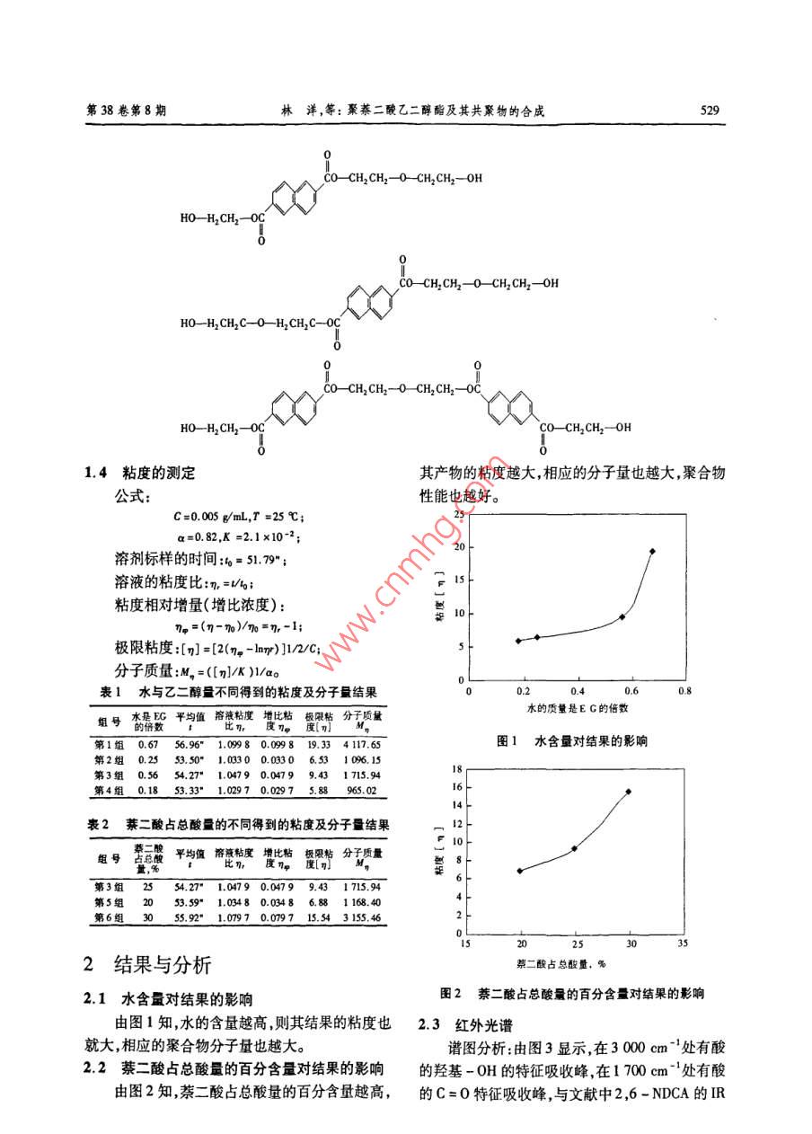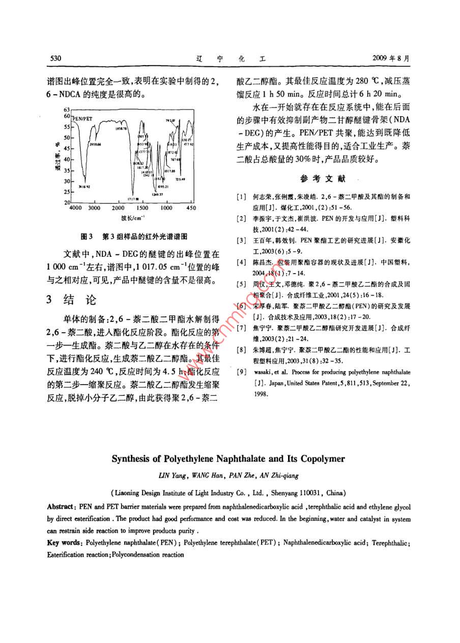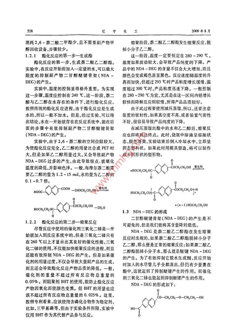 第38卷第8期Vol. 38. No. 82009年8月Liaoning Chemical IndustryAugust, 2009聚萘二酸乙二醇酯及其共聚物的合成林洋,王晗,潘哲,安志強(qiáng)(遼寧省輕工設(shè)計(jì)院有限公司,遼寧沈陽(yáng)110031)摘要:采用直接酯化法,通過2,6-萘二酸和對(duì)苯二甲酸按一定比例混合,與乙二醇在有水存在的條件下反應(yīng),經(jīng)縮聚制成性能良好的PEN與PET混合的阻隔性包裝材料達(dá)到既保持良好性能,又降低成本的目的。反應(yīng)一開始就存在于系統(tǒng)中的水和催化劑能夠最大限度的抑制副產(chǎn)物二甘醇醚鍵骨架(NDA-DEC)的產(chǎn)生提高產(chǎn)品純度。關(guān)鍵詞:聚-2,6-萘二酸乙二醇酯(PEN);聚對(duì)苯二甲酸乙二醇酯(PET);2,6-萘二酸;對(duì)苯二甲酸;酯化反應(yīng);縮聚反應(yīng)中圖分類號(hào):TQ323文獻(xiàn)標(biāo)識(shí)碼:A文章編號(hào):1004-0935(2009)08-0527聚-2,6-萘二酸乙二醇酯(PEN),在結(jié)構(gòu)少,且不需要副產(chǎn)物甲醇回收設(shè)備。上與聚對(duì)苯二甲酸乙二醇酯(PET)相似,由于萘本實(shí)驗(yàn)釆用的直接酯化法。通過2,6-萘二環(huán)代替了苯環(huán),使得PEN具有了PET所不可比擬酸和對(duì)苯二甲酸按一定比例混合,與乙二醇在有的優(yōu)良性能。PEN具有強(qiáng)度高,阻隔性、尺寸穩(wěn)水存在的條件下反應(yīng),經(jīng)縮聚制成性能良好的定性和熱穩(wěn)定性好,耐化學(xué)性和耐水解性強(qiáng)等優(yōu)PEN與PET混合的阻隔性包裝材料,達(dá)到既保持點(diǎn),應(yīng)用前景廣泛。特別是在阻隔性包裝材料方良好性能,又降低成本的目的。面,已經(jīng)顯示出其優(yōu)于原始玻璃容器的許多特性但是由于原料2,6-萘二酸的價(jià)格較髙,使得生1實(shí)驗(yàn)部分產(chǎn)PEN的成本居高不下。因此各個(gè)國(guó)家都在研1.1單體的合成究降低PEN成本的方法,以使其廣泛應(yīng)用在工業(yè)在單體的合成中,加入原料2,6-萘二酸二生產(chǎn)中甲酯、氫氧化鉀、95%乙醇使之反應(yīng)。乙醇在這里作溶劑,讓氫氧化鉀過量,獲得2,6-萘二酸的鉀鹽。PEN:XCOCH, CH2加鹽酸,將鹽中鉀離子置換成H’,即可得到2,6-萘二酸。之后,利用2,6-萘二酸不溶于水的性質(zhì)進(jìn)行水洗,主要洗去包含在2,6-萘二酸中的HClCOCH2CH2PET1.2直接酯化法縮聚反應(yīng)目前,由于2,6-萘二酸制造和價(jià)格的原因,制備聚萘二酸乙二醇酯時(shí),外界一般采用酯交換PEN的合成路線可分為酯交換法和直接酯法合成PEN。而在實(shí)驗(yàn)中采用直接酯化法生產(chǎn)化法。相同量的PEN,消耗的2,6-萘二酸比酯交換法直接酯化法生產(chǎn)相同量的PEN消耗的2,6萘二酸比酯交換法消耗2,6-萘二酸二甲酯收稿日期:2009作者簡(jiǎn)介洋(198-),男,助理工程師528遼寧化工2009年8月消耗2,6-萘二酸二甲酯少,且不需要副產(chǎn)物甲縮聚階段茶二酸乙二醇酯發(fā)生縮聚反應(yīng),脫醇回收設(shè)備,步驟較少。掉小分子乙二1.2.1酯化反應(yīng)的第一步一生成酯這一階段,溫度一定要恒定在280~200℃酯化反應(yīng)的第一步,生成萘二酸乙二醇酯。溫度如果波動(dòng)較大,會(huì)導(dǎo)致產(chǎn)品純度的下降。產(chǎn)實(shí)驗(yàn)中,在反應(yīng)開始前加入一定量的水,可以最大品中的NDA-DEG的含量不僅會(huì)大大增加,而且限度的抑制副產(chǎn)物二甘醇醚鍵骨架(NDA-顏色會(huì)變成褐色甚至黑色。反應(yīng)速度隨溫度的升DEG)的產(chǎn)生。高而加快,但超過293℃時(shí)產(chǎn)品粘度增長(zhǎng)緩慢溫實(shí)驗(yàn)中,溫度的控制顯得格外重要。為實(shí)現(xiàn)度超過300℃時(shí),產(chǎn)品粘度迅速下降。一般控制這一步驟溫度應(yīng)控制在240℃,這一階段,萘二在280~290℃為宜,尤其是在這一區(qū)間內(nèi)鏈增長(zhǎng)酸與乙二醇在水存在的條件下,進(jìn)行酯化反應(yīng)。較快而降解反應(yīng)則較慢,所得產(chǎn)品品質(zhì)較好。按照傳統(tǒng)的酯化反應(yīng)進(jìn)程,由于酯化反應(yīng)是生成由于此過程要使用減壓蒸餾,所以,還要注意水的,所以一般不加水。但是,經(jīng)過實(shí)驗(yàn),可以得裝置的密封性,如果真空度不高,或者裝置氣密性出結(jié)論,水在一開始就存在在反應(yīng)系統(tǒng)中能在后不好,很容易導(dǎo)致產(chǎn)品純度的下降。面的步驟中有效抑制副產(chǎn)物二甘醇醚鍵骨架在減壓蒸餾出酯中的水和乙二醇后,縮聚反(NDA-DEC)的產(chǎn)生。應(yīng)也即將到達(dá)終點(diǎn)。此時(shí),燒瓶中溶液呈熔融狀實(shí)驗(yàn)中,由于2,6-萘二酸的空間位阻較大,態(tài),顏色淡黃,實(shí)驗(yàn)結(jié)束后倒入冷卻水中,立即呈為使酯化反應(yīng)完全,乙二醇的用量比合成PET時(shí)固態(tài)塑料狀。如果此時(shí)用模具塑造,將可以制作大,但是如果乙二醇用量過大,又會(huì)導(dǎo)致副產(chǎn)物成不同形狀的塑形物NDA一DEG過多的產(chǎn)生,由此導(dǎo)致熔點(diǎn)、玻璃化溫度的降低,并影響色澤。一般,每摩爾萘二酸需COCH2CH2OH催化劑nHOCH, CH, OC要乙二醇的量為1.2~15ml,水的量為乙二醇的0.1~0.7倍。2HOC02cH2OH,蟹化劑-COCH, CH O+HHOCH, CH, COtC+(n-1)HOCH, CH2 OH1.3NDA-DEG的形成1.22酯化反應(yīng)的第二步一縮聚反應(yīng)甘醇醚鍵骨架(NDA-DEC)的產(chǎn)生是不盡管反應(yīng)中使用的催化劑三氧化二銻是一開可避免的,但是我們能將其含量降到最低。NDA-DEG是萘二酸乙二醇酯在發(fā)生縮聚始就加入到反應(yīng)系統(tǒng)中