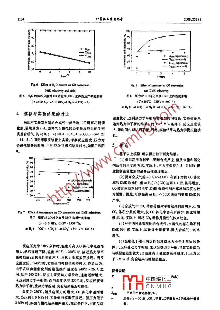 第25卷第9期計(jì)算機(jī)與發(fā)用化Vol 25. No 92008年9月28日Computers and Applied Chemistry合成氣一步法制二甲醚過(guò)程熱力學(xué)模擬的研究王波',魏偉勝2,蔡飛鵬',王建梅,徐建2(1.山東省科學(xué)院能源研究所,山東,濟(jì)南,250014;2.中國(guó)石油大學(xué)(北京),中國(guó)石油天然氣集團(tuán)公司催化重點(diǎn)實(shí)驗(yàn)室北京,10249)摘要:使用美國(guó)商用過(guò)程模擬軟件PRO/Ⅱ,根據(jù)最小化吉布斯自由能方法研究合成氣一步法制二甲醚過(guò)程的熱力學(xué)模擬??疾鞙囟葔毫铣蓺饨M成等因素對(duì)熱力學(xué)平衡條件下一氧化碳轉(zhuǎn)化率、二甲醚選擇性和產(chǎn)率的影響,為二甲醚合成過(guò)程反應(yīng)器的模擬計(jì)算和開(kāi)發(fā)提供理論依據(jù)。結(jié)果表明:低溫高壓有利于二甲醚的合成;為提高一氧化碳的轉(zhuǎn)化率,最佳的氫炭比為14~20;在一定范圍內(nèi)二氧化碳含量對(duì)熱力學(xué)平衡組成的影響不大,而水蒸氣不利于合成反應(yīng)。模擬與固定床微反裝置的實(shí)驗(yàn)結(jié)果比較,不分伯仲關(guān)鍵詞:合成氣;二甲醚;一步法;熱力學(xué)模擬;PRO/Ⅱ中圖分類號(hào):TQ013.1文獻(xiàn)標(biāo)識(shí)碼:A文章編號(hào):10014160(2008)0911311135Thermodynamic simulation of the single-step synthesis of dimethyl ether fromsyngasWang Bo, Wei Weisheng, Cai Feipeng, Wang Jianmei and Xu Jian2(1. Research Institute of Energy, Shandong Academy of Sciences, Jinan, 250014, Shandong, China; 2. Key Laboratoryof Catalysis, China National Petroleum Co, China University of Petroleum, Beijing, 102249, China)Abstract: On the bases of Gibbs free energy minimization, the single-step synthesis of dimethyl ether(DME)from syngas(CO+H,)as been simulated thermodynamically with the advanced process simulator PRO/I. The influences of temperature, pressure, n(H,)/n( Co)ratio, carbon dioxide content and water content in feed gas on the conversion of Co, selectivity and yield to dimethyl ether wasand DME yield, the optimal n(H,)/n( Co)ratio is 1. 4-2. 0 for higher CO corTHC-tion and the existence of water in the feed tends to decrease the DMe yield. The simulations were in good agreement with the experi-mental dates taken from a fixed bed micro-reactorKey words: syngas, dimethyl ether, single-step synthesis, thermodynamic simulation, PRO/IWang B, Wei WS, Cai FP, Wang JM and Xu J. Thermodynamic simulation of the single-step synthesis of dimethylether from syngas. Computers and Applied Chemistry, 2008, 25(9): 1131-11351引言CO轉(zhuǎn)化率大幅度提高。一步法具有流程短、設(shè)備規(guī)模小、操作壓力低和CO單程轉(zhuǎn)化率高等特點(diǎn),設(shè)備投資和操作費(fèi)用二甲醚(DME)用途廣泛可替代氯氟烷作冷凍劑、氣霧大大減少,生產(chǎn)成本較兩步法大大降低。劑和發(fā)泡劑,是重要的有機(jī)合成原料,且與液化石油氣雖然一步法打破了合成氣制甲醇化學(xué)平衡的限制,反應(yīng)(LNG)的物理性質(zhì)相似,可作為潔凈燃料的替代品,有著巨趨向于有利生成二甲醚,但由CO加氡合成甲醇、甲醇脫水大的市場(chǎng)前景。近年來(lái)在合成過(guò)程和應(yīng)用領(lǐng)域的研究已生成二甲醚和水煤氣變換反應(yīng)組成的合成氣制二甲醚體系,成國(guó)內(nèi)外化工的熱點(diǎn)之也同樣受化學(xué)平衡的限制。因此熱力學(xué)模擬合成氣一步法目前,已開(kāi)發(fā)和正在開(kāi)發(fā)的二甲醚合成方法有兩種:制二甲醚過(guò)程,有助于全面理解該過(guò)程在較寬的工藝條件下由甲醇脫水制取即通常所說(shuō)的兩步法;另一由合成氣直接的熱力學(xué)平衡限度,優(yōu)化反應(yīng)條件,以確定琿論的反應(yīng)結(jié)果,制取,也稱一步法,是將水煤氣變換、合成甲醇和甲醇脫水反為實(shí)驗(yàn)研究獻(xiàn)計(jì)。近年來(lái)類似的研究工作不少1-6。應(yīng)合為一步。一步法合成二甲醚,由于反應(yīng)的協(xié)同效應(yīng),突田x的計(jì)暫古法考察溫度壓力等破單純甲醇合成中熱力學(xué)平衡的限制增大反應(yīng)推動(dòng)力,使條件中國(guó)煤化工但方法和過(guò)程均較為CNMHG收稿日期:200840220;修回日期:200806-19基金資助:山東省自然科學(xué)基金資助項(xiàng)目(Y2007B48);山東省科技攻關(guān)資助項(xiàng)目(200cC1000700)作者簡(jiǎn)介:王波(198一),碩士,助理研究員,主要從事生物質(zhì)轉(zhuǎn)化及醇醚燃料合成方面的研究1132針?biāo)惴c用化看2008,25(9)繁瑣。本文使用過(guò)程模擬軟件PROⅡ熱力學(xué)模擬合成氣一應(yīng)高溫則不利于反應(yīng)。步法制二甲醚過(guò)程,并在固定床微反裝置上作實(shí)驗(yàn)初步驗(yàn)證計(jì)算結(jié)果。目的和前人一樣,致力于全面考察溫度壓力合成氣組成等條件對(duì)熱力學(xué)平衡組成的影響,為評(píng)價(jià)、設(shè)計(jì)和改進(jìn)工藝過(guò)程提供理論依據(jù)。2PRO/Ⅱ熱力學(xué)模擬4567PRO/Ⅱ是美國(guó)模擬科學(xué)(SMSC)公司開(kāi)發(fā)的大型流程-e-8 MP模擬軟件,用數(shù)學(xué)模型描述和模擬整個(gè)工藝流程將整個(gè)流程視為一綜合的計(jì)算過(guò)程,綜合了巨大的化學(xué)組分庫(kù)和熱力學(xué)方法,為化學(xué)石油天然氣、合成燃料工業(yè)領(lǐng)域提供準(zhǔn)確、Fg1 Efects of temperature and pressure on Co conversion可靠的模擬功能圖1溫度和壓力對(duì)co轉(zhuǎn)化率的影響n(H2)/n(CO)=作者在模擬中,選用PRO/Ⅱ軟件中的吉布斯反應(yīng)器模塊( Gibbs Reactor)和Peng- Robinson(PR)