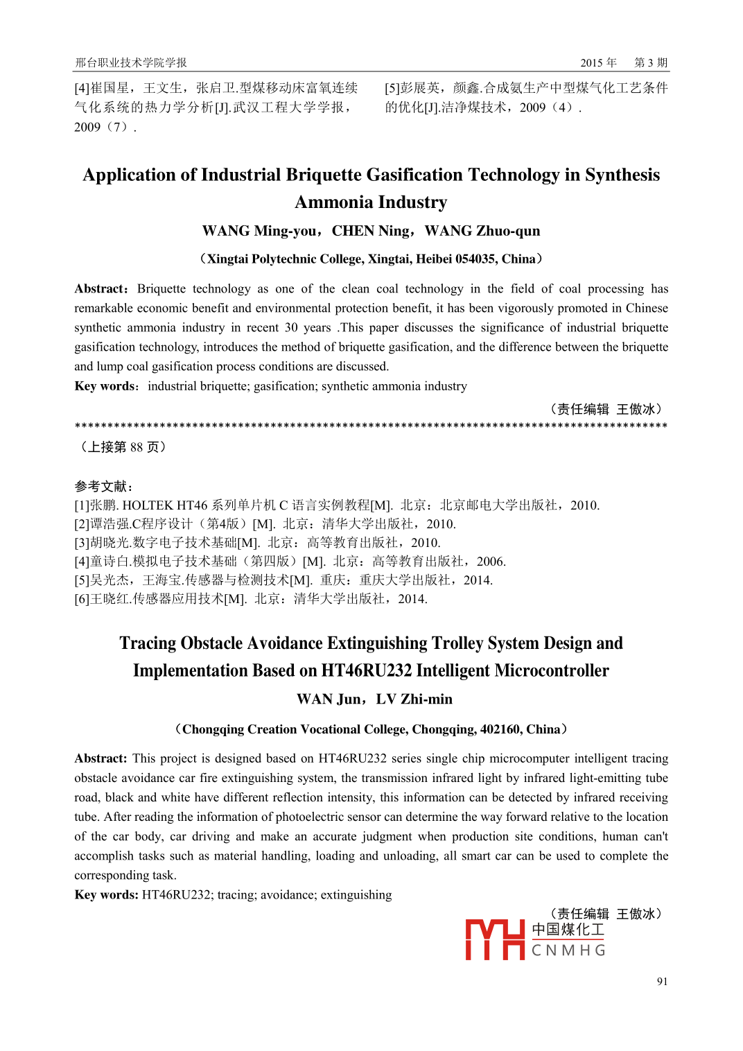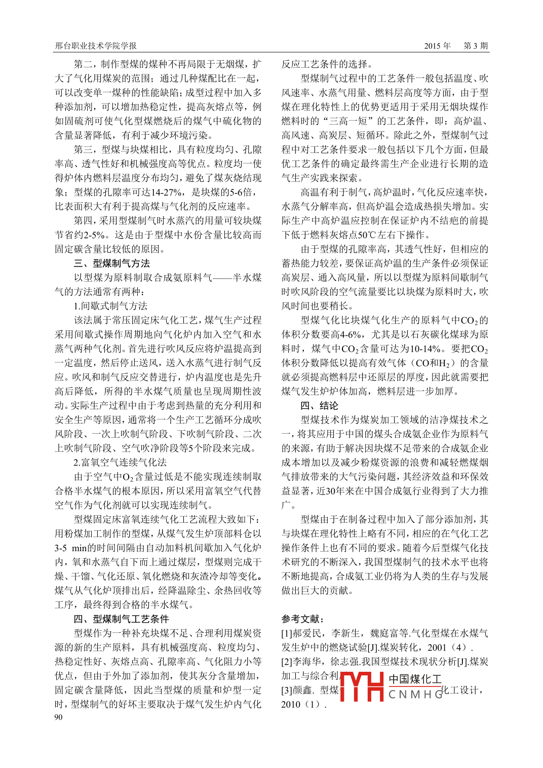 第32卷第3期邢臺職業(yè)技術(shù)學(xué)院學(xué)報Vol.32 No.32015年6月Joumal of Xingtai Polytechnic CollegeJun. 2015工業(yè)型煤氣化技術(shù)在合成氨工業(yè)中的應(yīng)用王明友,陳寧,王卓群(邢臺 職業(yè)技術(shù)學(xué)院,河北邢臺054035 )摘要:型煤技術(shù)作為煤炭加工領(lǐng)域的潔凈煤技術(shù)之一,在企業(yè)經(jīng)濟和環(huán)境保護方面效益顯著,近30年來在中國合成氨行業(yè)得到了大力推廣。本文論述了型煤氣化技術(shù)對于合成氨工業(yè)的意義,介紹了型煤氣化的常用方法,并對采用型煤與塊煤制氣的工藝條件不同進行了探討。關(guān)鍵詞:型煤;氣化; 合成氨中圖分類號: TQ546; TQ113.242文獻標(biāo)識碼: A文章編號: 1008- -6129 (2015) 03-0089-03合成氨是最重要的化工產(chǎn)品之- -,其產(chǎn)量位居料。各種化工產(chǎn)品之首。自1913年世界上第- - 座日產(chǎn)30按照用途不同,型煤可分為民用型煤、工業(yè)型噸的合成氨裝置投產(chǎn)到如今日產(chǎn)千噸以上的合成煤,其中工業(yè)型煤占比例比較大,可以細(xì)分為氣化氨裝置分布全球,合成氨工業(yè)對于能源的消耗也是型煤和動力型煤。上世紀(jì)60年代以來,為解決合成巨大的。據(jù)統(tǒng)計,在合成氨生產(chǎn)過程中消耗的能源氨企業(yè)當(dāng)時面臨的無煙塊煤供應(yīng)不足的問題,人們占全球能源供應(yīng)總量的2%,排放的CO2占全球排先后研制出了石灰碳酸化煤、腐植酸鹽型煤、粘土放總量的1.6%。隨著能源危機以及環(huán)保問題的日益型煤等粉煤成型技術(shù),年總產(chǎn)量曾達100 Mt以上,突出,合成氨工業(yè)中的節(jié)能減排問題也逐漸得到人為全國近60%的化肥企業(yè)提供了造氣原料。們的關(guān)注。利用廉價易得的粉煤生產(chǎn)優(yōu)質(zhì)的氣化型煤,不目前世界上合成氨常用的原料有:焦炭、煤、但可以緩解塊煤供應(yīng)不足,降低企業(yè)的原料成本,天然氣、焦?fàn)t氣、石腦油和重油,由于“富煤少油提高企業(yè)的經(jīng)濟效益,還可以提高粉煤資源的利用缺氣"的能源結(jié)構(gòu)特點,我國90%以上的合成氨企率,減少燃煤污染物的排放,實現(xiàn)煤炭的高效潔凈業(yè)、70%以上的合成氨產(chǎn)能都是以煤為原料,而煤利用,具有很高的社會效益,為此國家把型煤產(chǎn)業(yè)頭合成氨中主要以無煙塊煤作為原料,其市場價位列為節(jié)能、環(huán)保的重點扶持產(chǎn)業(yè)。居高不下。隨著煤炭開采機械化程度的提高,煤的二、型煤氣化技術(shù)的意義破碎率也升高了,導(dǎo)致產(chǎn)量減少的塊煤價格攀升,最近幾年,型煤氣化技術(shù)有了突飛猛進的發(fā)而粉煤卻積壓滯銷,造成了煤炭資源的巨大浪費,展,無煙煤及部分煙煤等粉煤制作氣化型煤的技術(shù)并嚴(yán)重污染著礦山周圍的環(huán)境。已經(jīng)達到很高的水平,而且對型煤氣化工藝的研究合成氨生產(chǎn)中原料煤占合成氨企業(yè)生產(chǎn)成本也不斷深入,已經(jīng)能夠達到塊煤爐和型煤爐的煤種的1/3左右,把粉煤加工成型煤作為生產(chǎn)半水煤氣互換而產(chǎn)氣量、煤氣品質(zhì)基本一樣的水平。的原料,可降低合成氨企業(yè)的生產(chǎn)成本,提高企業(yè)通過粉煤成型技術(shù)制作氣化用型煤,再將型煤的競爭力。因此型煤氣化技術(shù)的研究不僅對于企業(yè)用作氣化反應(yīng)生產(chǎn)半水煤氣等的原料,可為化工、經(jīng)濟狀況而且對于整個社會的長遠發(fā)展都有深遠冶金等行業(yè)拓寬原料來源,降低企業(yè)生產(chǎn)成本、提的影響。高經(jīng)濟效益。將型煤氣化技術(shù)應(yīng)用于合成氨工業(yè)有以下意義:型煤是一-種清潔、高效能的新型燃料,是以適第一,型煤技術(shù)能夠解決我國煤炭資源粉化嚴(yán)當(dāng)?shù)墓に嚭驮O(shè)備(添加膠黏劑、固硫劑等經(jīng)過配制、重問題,提高煤炭資源的利用率,同時降低企業(yè)的混合等加工工藝),將粉煤加工成具有一-定形狀、生產(chǎn)成本,采用型煤氣化技術(shù)可使每噸合成氨的生尺寸及理化性能(熱穩(wěn)定性、防水性等)的塊狀燃產(chǎn)成本下降300元以上。中國煤化工收稿日期: 2015-04-19YHCNMH G作者簡介:王明友(1986一), 山東安丘人,邢臺職業(yè)技術(shù)學(xué)院資源與環(huán)境工程系,助教。89邢臺職業(yè)技術(shù)學(xué)院學(xué)報2015年第3 期第二,制作型煤的煤種不再局限于無煙煤,擴反應(yīng)工藝條件的選擇。大了氣化用煤炭的范圍;通過幾種煤配比在-起,型煤制氣過程中的工藝條件- - 般包括溫度、吹可以改變單- -煤種的性能缺陷;成型過程中加入多風(fēng)速率、水蒸氣用量、燃料層高度等方面,由于型種添加劑,可以增加熱穩(wěn)定性,提高灰熔點等,例煤在理化特性上的優(yōu)勢更適用于采用無煙塊煤作如固硫劑可使氣化型煤燃燒后的煤氣中硫化物的燃料時的“三高一短”的工藝條件,即:高爐溫、含量顯著降低,有利于減少環(huán)境污染。高風(fēng)速、高炭層、短循環(huán)。除此之外,型煤制氣過第三,型煤與塊煤相比,具有粒度均勻、孔隙程中對工藝條件要求一般包括以下幾個方面,但最率高、透氣性好和機械強度高等優(yōu)點。粒度均- -使優(yōu)工藝條件的確定最終需生產(chǎn)企業(yè)進行長期的造得爐體內(nèi)燃料層溫度分布均勻,避免了煤灰燒結(jié)現(xiàn)氣生產(chǎn)實踐來探索。象;型