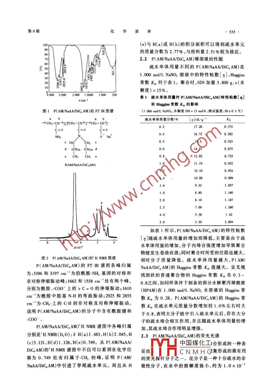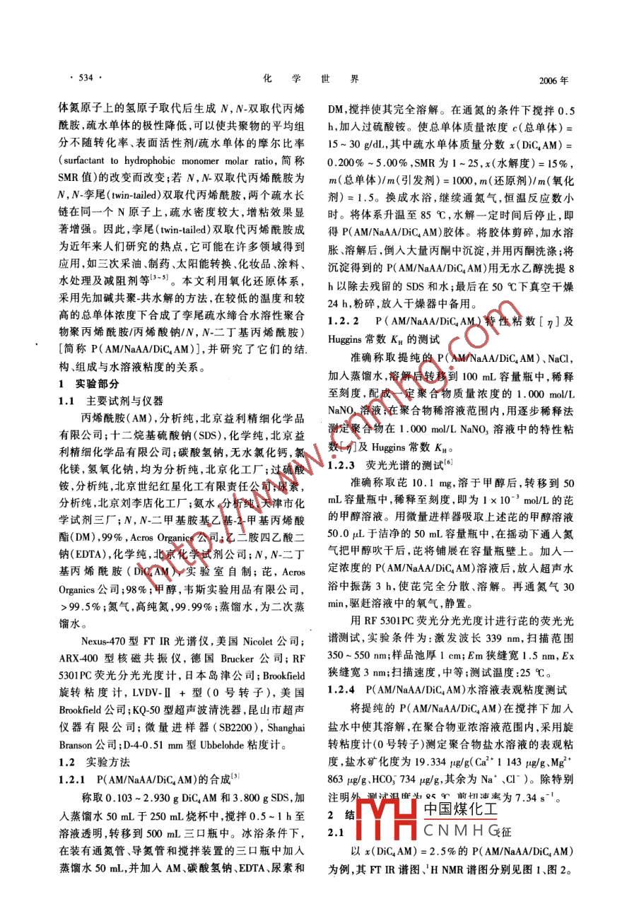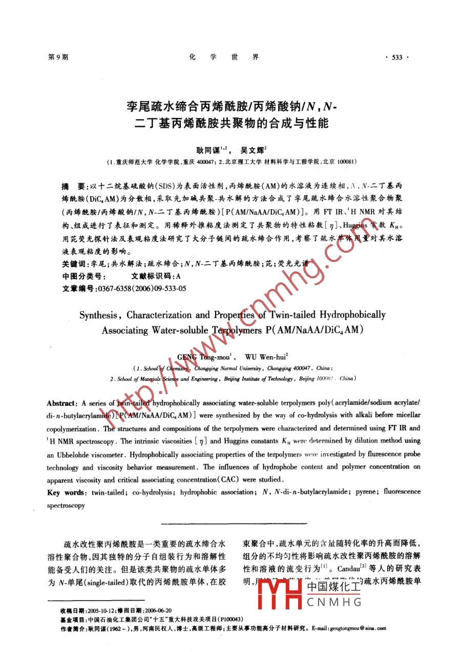 第9期533孿尾疏水締合丙烯酰胺/丙烯酸鈉/N,N二丁基丙烯酰胺共聚物的合成與性能耿同謀2,吳文輝2(1重慶師范大學(xué)化學(xué)學(xué)院,重慶40007;2.北京理工大學(xué)材料科學(xué)與工程學(xué)院,北京10081摘要:以十二烷基硫酸鈉(SDS)為衷面活性劑,丙烯酰胺(AM)的水溶液為連續(xù)相,A,N-二丁基丙烯酰胺( DiC AM)為分散相,采取先加堿共聚-共水解的方法合成了孿尾疏水締合水溶性聚合物聚(丙烯酰胺/丙烯酸鈉/N,N-二丁基丙烯酰胺)[P( AM/NaAA/ DiC AM)]。用FTIR、HNMR對其結(jié)構(gòu)、組威進(jìn)行了表征和測定。用稀釋外推粘度法測定了共聚物的特性粘數(shù)[n]、 Huggins常數(shù)Ks。用芘熒光探針法及表觀粘度法研究了大分子鏈間的疏水締合作用,考察了疏水單體用量對其水溶液表觀粘度的影響。關(guān)鍵詞:孿尾;共水解法;疏水締合;N,N-二丁基丙烯酰胺;芘;熒光光譜中圖分類號文獻(xiàn)標(biāo)識碼:A文章編號:0367-6358(2006)0953305Synthesis, Characterization and Properties of Twin-tailed HydrophobicallyAssociating Water-soluble Terpolymers P(AM/NaAA/DiC,AM)GENG Tong-mou, WU W(1. School of Chemistry, Chongging Normal Unirersity, Chongqing 400047,China2. School of Materials Science and Engineering, Beiing Institute of Technology, Beijing 100w!. China)Abstract: A series of twin-tailed hydrophobically associating water- soluble terpolymers poly( acrylamide/ sodium acrylatedi-n-butylacrylamide)[P(AM/NaAA/DiC, AM)] were synthesized by the way of co-hydrolysis with alkali before micellarcopolymerization. The structures and compositions of the terpolymers were characterized and determined using FT IR andH NMR spectroscopy. The intrinsic viscosities 7] and Huggins constants KH were determined by dilution method usingan Ubbelohde viscometer. Hydrophobically associating properties of the terpolymers were investigated by flurescence probetechnology and viscosity behavior measurement. The influences of hydrophobe content and polymer concentrationapparent viscosity and critical associating concentration( CAC)were studiedKey words: twin-tailed; co-hydrolysis; hydrophobic association; N, N-di-n-butylacrylamide; pyrene; fluorescencespectroscop疏水改性聚丙烯酰胺是一類重要的疏水締合水束聚合中,疏水單元的含量隨轉(zhuǎn)化率的升高而降低溶性聚合物,因其獨(dú)特的分子自組裝行為和溶解性組分的不均勻性將影響疏水改性聚丙烯酰胺的溶解能備受人們的關(guān)注。但是該類共聚物的疏水單體多性和溶液的流變行為。 Candar2等人的研究表為N單尾( single-tailed)取代的丙烯酰胺單體,在膠明中國煤化工硫水丙烯酰胺單CNMHG收稿日期:20051012;修回日期:20060620基金項目:中國石油化工集團(tuán)公司“十五”重大科技攻關(guān)項目(P100043)作者簡介:耿同謀(1962~),男,河南民權(quán)人,博士高級工程師;主要從事功能高分子材料研究。Emil: e gengtongmou@in_,com化學(xué)世界年體氮原子上的氫原子取代后生成N,N-雙取代丙烯DM攪拌使其完全溶解。在通氮的條件下攪拌0.5酰胺,疏水單體的極性降低,可以使共聚物的平均組h,加入過硫酸銨。使總單體質(zhì)量濃度c(總單體)=分不隨轉(zhuǎn)化率、表面活性劑疏水單體的摩爾比率15~30g/d,其中疏水單體質(zhì)量分?jǐn)?shù)x(DiC4AM)( surfactant to hydrophobic monomer molar ratio,簡稱0.200%~5.0%,SMR為1-25,x(水解度)=15%SMR值)的改變而改變;若N,N雙取代丙烯酰胺為m(總單體)m(引發(fā)劑)=1000,m(還原劑)/m(氧化N,N·李尾( twin-tailed)雙取代丙烯酰胺,兩個硫水長劑)=1.5。換成水浴,繼續(xù)通氮?dú)?恒溫反應(yīng)數(shù)小鏈在同一個N原子上,疏水密度較大,增粘效果顯時。將體系升溫至85℃,水解一定時間后停止,即著增強(qiáng)。因此,李尾( twin-tailed)雙取代丙烯酰胺成得P( AM/NaAA/DiC AM)膠體。將膠體剪碎,加水溶為近年來人們研究的熱點它可能在許多領(lǐng)域得到脹、溶解后,倒入大量兩酮中沉淀并用丙酮洗滌;將應(yīng)用,如三次采油制藥、太陽能轉(zhuǎn)換、化妝品涂料、沉淀得到的P( AM/NaAA/DiCAM)用無水乙醇洗提8水處理及減阻劑等3。本文利用氧化還原體系,h以除去殘留的SDs和水;最后在50℃下真空干燥采用先加堿共聚共水解的方法,在較低的溫度和較24h,粉碎,放入干燥器中備用。高的總單體濃度下合成了孿尾疏水締合水溶性聚合1.2,2P( AM/NaAA/DiC AM)特性粘數(shù)[n]及物聚丙烯酰胺丙烯酸鈉/N,N二丁基丙烯酰胺) Huggins常數(shù)k:的測試[簡稱P(AM/ NaAA/DiC4AM)],并研究了它們的結(jié)構(gòu)、組成與水溶液粘度的關(guān)系。準(zhǔn)確稱取提純的P( AM/NaAA/DiC4AM)、NaCl實驗部分加入蒸餾水,溶解后轉(zhuǎn)移到100mL容量瓶中,稀釋11主要試劑與儀器至刻度,配成一定聚合物質(zhì)量濃度的1.000mol/L丙烯酰胺(AM),分析純,北京益利精細(xì)化學(xué)品NaNO3溶液;在聚合物稀溶液范圍內(nèi),用逐步稀釋法有限公司;十二烷基硫酸鈉(SDs),化學(xué)純,北京益測定聚合物在1.000mol/ L NaNO3溶液中的特性粘利精細(xì)化學(xué)品有限公司;碳酸氫鈉,無水氯化鈣,氯數(shù)[y1及 Huggins常數(shù)k化鎂,氫氧化鈉,均為分析純,北京化工廠;過硫酸1.2.3熒光光譜的測試6銨,分析純,北京世紀(jì)紅星化工有限責(zé)任公司;尿素準(zhǔn)確稱取芘10.1mg,溶于甲醇后,轉(zhuǎn)移到50分析純,北京劉李店化工廠;氨水,分析純,天津市化mL容量瓶中,稀釋至刻度,即為1×10moL的芘學(xué)試劑三廠;N,N二甲基胺基乙基2甲基丙烯酸的甲醇溶液。用微量進(jìn)樣器吸取上述芘的甲醇溶液酯(DM),9%, Acros Organics公司;乙二胺四乙酸二50.0