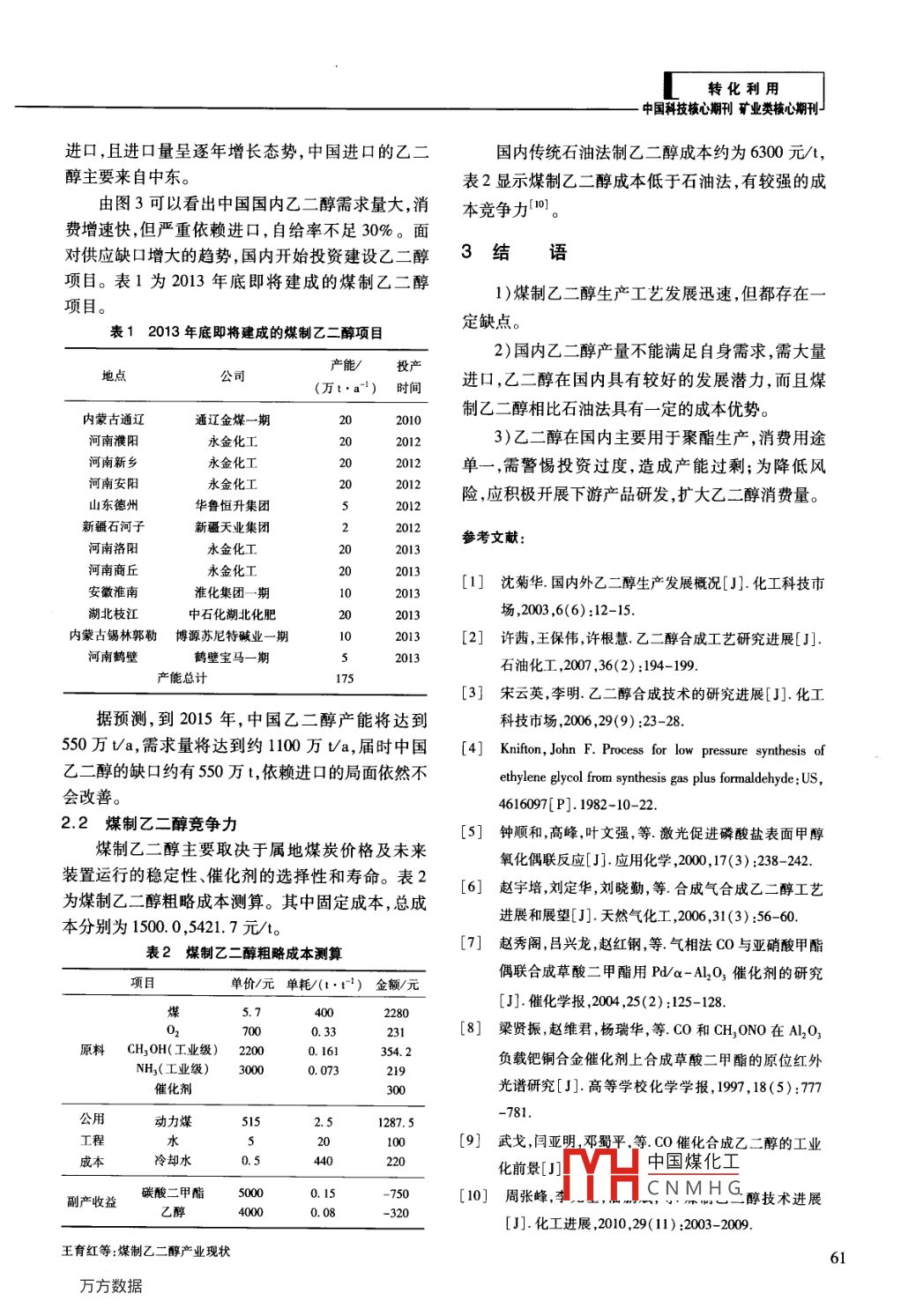 轉(zhuǎn)化利用國(guó)科技核心期刊礦業(yè)類核心期刊媒制乙二醇產(chǎn)業(yè)現(xiàn)狀王育紅,谷小虎(中國(guó)平煤神馬能源化工研究院,河南平頂山467000)摘要:乙二醇是一種重要的有機(jī)化工原料,主要以石油為原料進(jìn)行生產(chǎn)。中國(guó)特殊的能源結(jié)構(gòu)使煤制乙二醇研究熱度日益高漲。闡述了3種煤制乙二醇工藝路線及優(yōu)缺點(diǎn),詳細(xì)介紹了C0催化偶聯(lián)法制乙二醇生產(chǎn)技術(shù)。通過(guò)分析國(guó)內(nèi)乙二醇的供需形勢(shì)、投資建設(shè)情況,認(rèn)為煤制乙二醇擁有成本優(yōu)勢(shì),具有一定的競(jìng)爭(zhēng)力,但不可盲目開(kāi)發(fā)投資,謹(jǐn)防產(chǎn)能過(guò)剩,且仍需開(kāi)拓下游產(chǎn)品,拓寬利用途徑,抵抗市場(chǎng)風(fēng)險(xiǎn)。關(guān)鍵詞:煤;乙二醇;工藝技術(shù);產(chǎn)業(yè)化中圖分類號(hào):TQ223;TD849文獻(xiàn)標(biāo)識(shí)碼:A文章編號(hào):1006-6772(2013)06-0059-03Status and development of synthesis of ethylene glycol from coalWANG Yuhong, GU XiaohuChina Pingmei Shenma Group Research Institute of Energy and Chemical, Pingdingshan 467000, China)Abstract: Ethylene glycol is an important organic raw material for chemistry industry. It's mainly developed fromtroleum.Limited by the energy structure in China, the research of coal to ethylene glycol become urgent. Introduceseveral main coal to ethylene glycol processes and their merits and demerits. Detail co catalytic coupling methodas well as domestic ethylene glycol supply and demand situation, investment status. The results show that, coalto ethylene glycol industry has cost advantage. To prevent overcapacity, the investment should be intelligent. Thedevelopment of downstream products is also important, whichto resist riskKey words: coal; ethylene glycol; technology industrialization0引言2009—2013年掀起了建設(shè)高潮。本文介紹了煤制乙二醇生產(chǎn)工藝及優(yōu)缺點(diǎn),認(rèn)為開(kāi)展煤制乙二醇技乙二醇(EG)是一種重要的石油化工基礎(chǔ)有機(jī)原術(shù)研究十分必要,但在技術(shù)完全成熟前需控制生產(chǎn)料,又名甘醇、亞乙基二醇分子式為HOCH2CH2OH,規(guī)模。是無(wú)色透明、稍帶甜味的黏稠液體。乙二醇是最簡(jiǎn)單和最重要的脂肪族二元醇,主要用于生產(chǎn)聚酯和1煤制乙二醇工藝各類抗凍劑,前者用于制造纖維、薄膜和聚對(duì)苯二以煤為原料制取乙二醇,主要有3種工藝,3種甲酸乙二醇酯(PET)樹(shù)脂;其它用途則包括解凍液、工藝最初的步驟均為采用煤氣化技術(shù)制取合成氣表面涂層、照像顯影液、水力制動(dòng)用液體以及油墨(CO+H2)。等行業(yè)。高純乙二醇可用做過(guò)硼酸銨的溶劑和介1)由合成氣一步直接合成乙二醇。其化學(xué)反質(zhì),還可用于生產(chǎn)特種溶劑乙二醇醚3)。應(yīng)方程式為面對(duì)乙二醇對(duì)外需求度過(guò)高的現(xiàn)狀,國(guó)內(nèi)在2CO+3H2一→HOCH2CH2OH收稿日期:2013-07-08責(zé)任編輯:宮在芹基金項(xiàng)目:河南省重大科技專項(xiàng)(0030700)H中國(guó)煤化工作者簡(jiǎn)介:王育紅(1968),女河南平頂山人,高級(jí)工程師,畢業(yè)于安徽工業(yè)大學(xué),主要從事CNMHGuQ163. com引用格式:王育紅,谷小虎煤制乙二醇產(chǎn)業(yè)現(xiàn)狀[潔凈媒技術(shù),2013,19(6):59-61王育紅等:煤制乙二醇產(chǎn)業(yè)現(xiàn)狀轉(zhuǎn)化利用此反應(yīng)條件要求苛刻需要催化劑和高溫高壓其含量為CO為25%-90%,亞硝酸酯為5%-40%條件。催化劑的選擇是該工藝的關(guān)鍵43。Al2O3作為載體的鈀催化劑。2)由合成氣生產(chǎn)甲醇,再由甲醇制乙烯,乙烯3)尾氣再生。將分離了草酸酯的反應(yīng)尾氣導(dǎo)氧化得環(huán)氧乙烷,最后由環(huán)氧乙烷水合法制乙二入再生塔,按NO與O2物質(zhì)的量比為41:6.5,配入醇。煤制烯烴已建成多個(gè)示范裝置,其中神華包頭氧氣氧化,按醇與NO的物質(zhì)的量比為2~6送入公司已經(jīng)取得商業(yè)化成功,乙烯制乙二醇工藝和石20%以上的醇水溶液接觸反應(yīng)油法制乙二醇都是成熟完善的技術(shù),但缺點(diǎn)是流程4)亞硝酸酯的回收。長(zhǎng)且甲醇制乙烯過(guò)程中還會(huì)產(chǎn)生丙烯。5)非反應(yīng)氣體的排放。3)合成氣中的CO催化偶聯(lián)合成草酸二甲酯,圖2為( COOCH3)2的生產(chǎn)流程。草酸二甲酯加氫生成乙二醇。圖1為其工藝流程。CO凈化co度氫草酸二甲酯產(chǎn)品亞硝酸甲酯CO草酸酯圖2( COOCH)2生產(chǎn)流程煤「合成氣精餾以上3種工藝中,第1種為最簡(jiǎn)單、直接和有效H2聚酯級(jí)的途徑,即使反應(yīng)選擇性和轉(zhuǎn)化率較低,也具有很大的實(shí)際應(yīng)用價(jià)值,但反應(yīng)條件要求苛刻;直接法圖1co催化偶聯(lián)法制乙二醇工藝2013年尚不能實(shí)現(xiàn)工業(yè)化,如果能有突破,使反應(yīng)第1步為CO與CH2ONO在催化劑的作用下,在較溫和的條件下進(jìn)行,將非常有競(jìng)爭(zhēng)力。第2種反應(yīng)生成(C0CH13)2和NO,偶聯(lián)反應(yīng)方程式為工藝,流程較長(zhǎng),且甲醇生產(chǎn)乙烯過(guò)程中還會(huì)生成2C0+2CH2ONO—→( COOCH3)2+2NO丙烯,能耗較高。第3種方法是最先實(shí)現(xiàn)工業(yè)化的第2步為偶聯(lián)反應(yīng)生成的NO與CH3OH和O2煤制乙二醇路線,但草酸酯加氫催化劑的穩(wěn)定性反應(yīng)生成CH2ONO,反應(yīng)方程式為差,壽命較短;DMo加氫時(shí)氫氣循環(huán)量大、能耗高;2NO+2CH,OH+1/202 -+2C