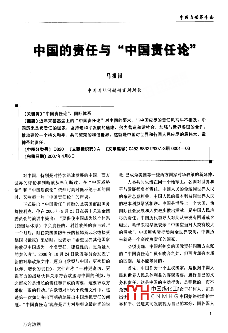 中圓與世界專論中國的責任與“中國責任論”馬振崗中國國際問題研究所所長〔關(guān)鍵詞〕“中國責任論”、國際體系〔提要〕近年來甚囂塵上的“中國責任論”對中國的要求,與中國應(yīng)盡的責任風馬牛不相及。中國歷來是負責任的國家,堅持走和平發(fā)展的道路,努力營造和諧社會,加強與世界各國的合作,推動建設(shè)一個持久和平、共同繁榮的和諧世界。這就是中國對世界和各國人民應(yīng)盡的最偉大、最神圣的責任〔中圖分類號〕D820〔文獻標識碼〕A〔文章編號)04528832(20073期000103〔完稿日期)2007年4月6日對中國,特別是對持續(xù)迅速發(fā)展的中國,西方教,已成為美國等一些西方國家對華政策的新延伸。世界的評論和判斷就從未間斷過。在“中國威脅人類共同生活在同一個地球上,各國對世界和論”和“中國崩潰論”依然時高時低不絕于耳的同平與發(fā)展都負有責任。中國人民的命運同世界人民時,又響起一片“中國責任論”的聲調(diào)。的命運息息相關(guān),中國人民的根本利益同世界人民正式提出“中國責任”問題的是美國前副國務(wù)的根本利益緊緊相聯(lián)。中國是世界上一個大國,為卿佐利克,他在2005年9月21日在美中關(guān)系全國國際社會發(fā)展和人類進步做出貢獻,是中國人民應(yīng)委員會的演講中提出:“要促使中國成為這個體系盡的責任。中國歷代領(lǐng)導人對此從來沒有回避或含指國際體系)中負責任的、利益攸關(guān)的參與者?!焙^,毛澤東很早就表示“中國應(yīng)當對人類有較大個月后,時任美國國防部長的拉姆斯菲爾德接受的貢獻”。中國用實際行動向全世界表明,中國歷德國《鏡報》采訪時,也表示“希望世界其他國家來就是一個高度負責任的國家。將敦促中國成為一個負責任、建設(shè)性的、更為融入必須明確,中國所擔負的國際責任同西方主張的參入者”。2006年10月24日歐盟委員會發(fā)表了的“中國責任論”雖有吻合之處,但兩者卻有本質(zhì)新的對華政策文件,題為《歐盟與中國:更密切的的區(qū)別,是不能等同的。伙伴、增長的責任》,文件聲稱“一種更密切、更首先,中國作為一個主權(quán)國家,是根據(jù)中國人強有力的戰(zhàn)略伙伴關(guān)系符合歐盟與中國的利益,與民和世界人民總體利益的客觀需要,履行自己的義之而來的是增長的責任和開放的需要,這要求雙方務(wù)和責任。這是中國的主動行為,是積極的,而不采取一致的行動,%在歐盟對華六個政策文件中,這是被V中國煤化工命于任何人。正是是第一次如此突出而明確地提出中國承擔責任的問出于CNMHG中國始終把維護世題?!爸袊熑握摤F(xiàn)在是西方對華輿論最時尚的說界和平、促進共同發(fā)展視為自己的本分,同各國人國際問題研究民一道做著持續(xù)不懈的努力。其三,從宏觀和戰(zhàn)略角度,“中國責任論”主再者,中國一切作為的出發(fā)點和落腳點,是對張者的核心意圖是要中國維護現(xiàn)行國際體系。關(guān)于世界絕大多數(shù)人民負責,而絕不是為了中國的一己這一點,佐利克講得明白無誤。他聲稱,“美國兩之利,也不是服務(wù)于某個國家或某個集團的任何圖黨的七位總統(tǒng)…努力促使中國融入國際體系,成謀。中國作為聯(lián)合國安理會常任理事國中惟一的發(fā)為其中的正式成員……我們的政策取得了相當大的展中國家,一貫堅持原則,伸張正義,反對強權(quán)政成功”,“國際體系幫助中國獲得成功,中國也有治,維護廣大發(fā)展中國家的權(quán)益責任加強這個體系”。他還斷言,“從中國的角度第三,中國在履行國際責任時,一向?qū)Ω鲊鴪詠砜?今后與我們共同發(fā)展國際體系,看來更有利持平等和尊重的態(tài)度,從不把自己當成恩施國,不于維護中國的國家利益”。2把自己的意志強加于人,更不帶有任何“改造”或揭開遮蓋在“中國責任論”上粉飾的面紗,可“管治”他國的意圖。中國對別國提供力所能及的以清楚看出“中國責任論”的實質(zhì)援助時,不附加任何政治條件,就是鮮明的例證。潛臺詞——中國是個“不負責任”的國家。另外,中國有13多億人口,約占世界的五分大背景——國際形勢處于錯綜復雜的變化中之一。中國通過和平發(fā)展實現(xiàn)國內(nèi)穩(wěn)定和諧,人民美國內(nèi)外面臨不少難題,世界霸主地位受到多種挑的物質(zhì)和文化水平不斷得到提高。確保世界上如此戰(zhàn);中國崛起是無法阻擋的客觀現(xiàn)實,已經(jīng)影響到眾多的人民過著安居樂業(yè)的生活,這本身就是對國世界的現(xiàn)在與未來,但“難以預料中國將如何運用際社會最大的負責。其力量”。西方主張的“中國責任論”與中國人民的國際新對策——鑒于舊的冷戰(zhàn)模式難再有效地應(yīng)對責任觀在出發(fā)點、內(nèi)涵和目的上均有差異。概括迅速發(fā)展起來的中國,需要變換對策,“中國責任說,西方的“中國責任論”包括三種含意論”應(yīng)運而生。新對策的基本思路就是:鼓勵和促使其一,一些人出于對中國根深蒂固的偏見,頑中國融入現(xiàn)行國際體系,以國際體系約束、規(guī)范中固地認為中國是個“不負責任”的國家,很早以來國,并誘壓中國承擔維護和發(fā)展國際體系的責任就不斷地“教訓”中國要負起責任。這種傳統(tǒng)的觀當今國際體系是二次世界大戰(zhàn)后