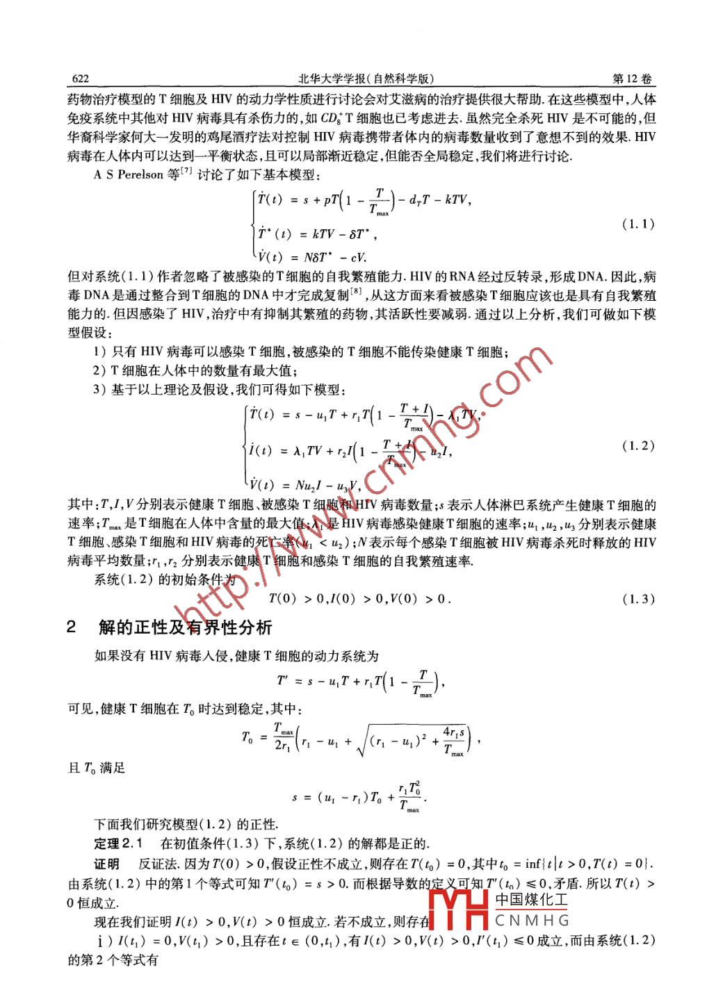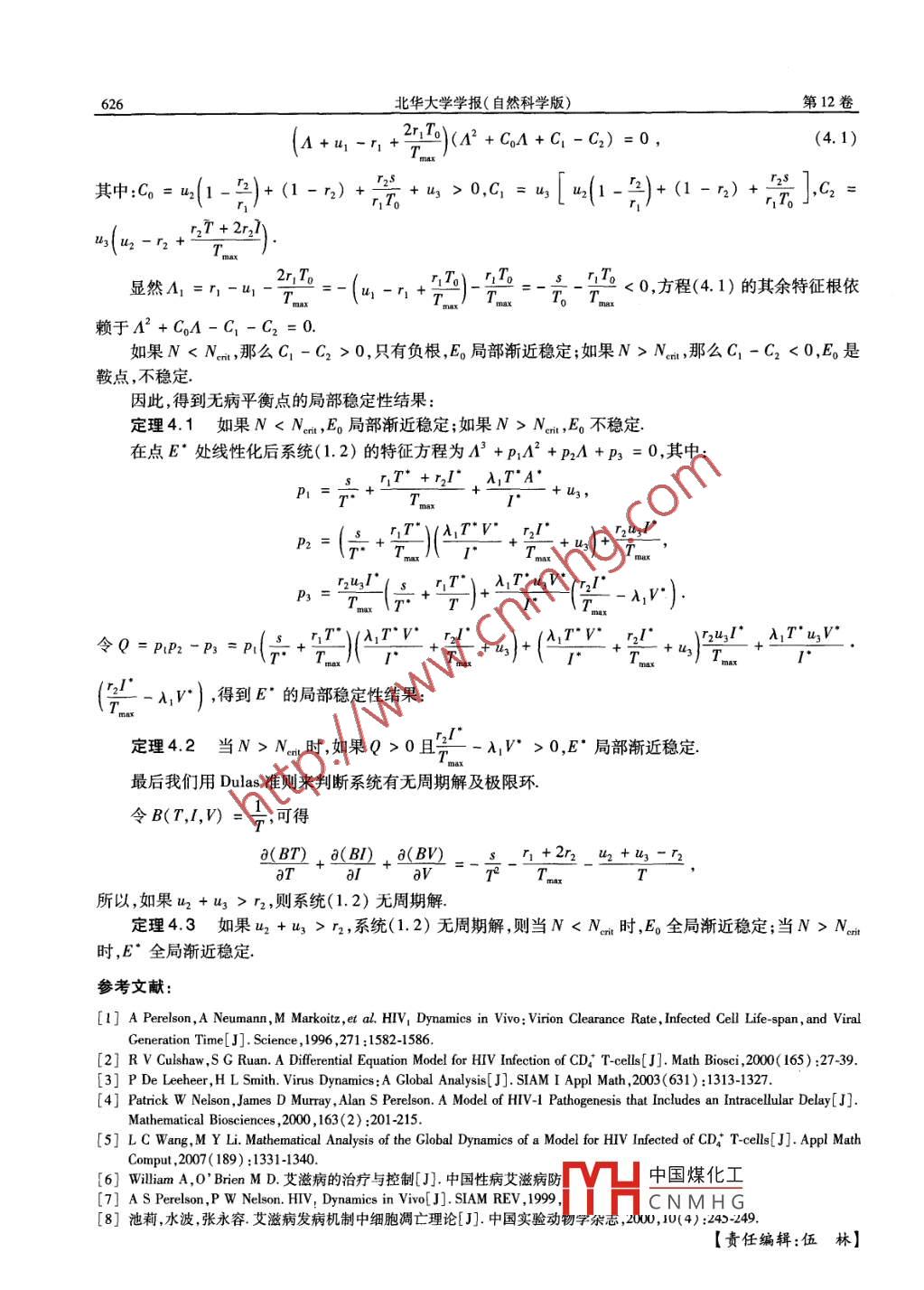 第12卷第6期北華大學學報(自然科學版)Vol. 12 No 62011年12月JOURNAL OF BEIHUA UNIVERSITY( Natural Science)Dec.2011文章編號:10094822(2011)0640621406HⅣ∨病理動力學模型分析蘇雙雙,王凱,夏米希努爾1.新疆大學數(shù)學與系統(tǒng)科學學院新疆烏魯木齊830046;2新疆醫(yī)科大學醫(yī)學工程與技術(shù)學院,新疆烏魯木齊830054)摘要:考慮了CDT細胞的全 logistic自我繁殖,構(gòu)造了具有治療的HV病理研究模型,研究了解的存在性、正性及穩(wěn)定性通過對每個感染T細胞釋放的HⅣ病毒平均數(shù)量N的討論,得到:如果NN灬,有無病平衡點和地方病平衡點兩個平衡點,但此時無病平衡點不穩(wěn)定,地方病平衡點是局部漸近穩(wěn)定的最后通過構(gòu)造 dulac- Benison函數(shù),得到了地方病平衡點全局穩(wěn)定的條件關鍵詞:HV;T細胞;漸近穩(wěn)定;平衡點中圖分類號:0175.12文獻標志碼:AAnalysis of the Dynamics Model of HIv Pathogenesis ModelSU Shuang-shuang, WANG Kai, Xamxinur(1. College of Mathematics and System Sciences, Xin jiang University, Urumqi 830046, China;2. Department of Medical Engineering and Technology, Xinjiang Medical University, Urumgi 830054, ChinaAbstract: HIV virus, which invade the human body, mostly parasitic in the T cells, where they transcribe RNAduplicate, then generate some new ones, at last kill the infected T cells, released from them. According to this wedivide the species in this paper into three kinds: uninfected T cells, infected T cells and HIV. Only uninfected Tcells can be created by body, others can't increase because of external input. Being predator, HIV just add frominfected T cells. We have proved that if NNit the infected steady state is locally asymptotically stable. Both of them are globally asymptotically stable ifone condition is satisfiedKey words HIV; T cells; asymptotically stable; equilibrium1引言自從20世紀80年代艾滋病被發(fā)現(xiàn)至今,已有許多關于HV病理學研究結(jié)果2,尤其是近些年將數(shù)學模型與HV病理學相結(jié)合3.我們更好地理解和治療HV提供了很大的幫助作為威脅人類最強的傳染病之一,對HIV病理研究是十分必要的而數(shù)學模型這一強大的工具,在史上幾次流行病研究中顯示出了其強大的威力眾所周知,HⅣV進入人體后主要攻擊T淋巴細胞(簡稱T細胞),寄宿在T細胞內(nèi),完成RNA反轉(zhuǎn)錄及復制,當產(chǎn)生新的HV病毒后再將T細胞徹底殺死『產(chǎn)中的*6,故對具有收稿日期:20110924CNMHG作者簡介:蘇雙雙(1986-),女,碩士研究生,主要從事常微分方程及其應用研究;王凱(1982-),男,講師博士,主要從事微分方程在生物傳染病、復雜網(wǎng)絡的應用研究622北華大學學報(自然科學版)第12卷藥物治療模型的T細胞及HIV的動力學性質(zhì)進行討論會對艾滋病的治療提供很大幫助.在這些模型中,人體免疫系統(tǒng)中其他對HV病毒具有殺傷力的,如CDT細胞也已考慮進去雖然完全殺死HⅣV是不可能的,但華裔科學家何大一發(fā)明的雞尾酒療法對控制HV病毒攜帶者體內(nèi)的病毒數(shù)量收到了意想不到的效果HIV病毒在人體內(nèi)可以達到一平衡狀態(tài),且可以局部漸近穩(wěn)定,但能否全局穩(wěn)定,我們將進行討論A S Perelson等7討論了如下基本模型:d-T-krv1.1)T(1)=kⅣV-δ7,V(t)=NδT’-cV但對系統(tǒng)(1.1)作者忽略了被感染的T細胞的自我繁殖能力HIV的RNA經(jīng)過反轉(zhuǎn)錄,形成DNA.因此,病毒DNA是通過整合到T細胞的DNA中才完成復制8],從這方面來看被感染T細胞應該也是具有自我繁殖能力的但因感染了HⅣV,治療中有抑制其繁殖的藥物,其活躍性要減弱通過以上分析,我們可做如下模型假設1)只有HⅣV病毒可以感染T細胞,被感染的T細胞不能傳染健康T細胞;2)T細胞在人體中的數(shù)量有最大值;3)基于以上理論及假設,我們可得如下模型7(t)=s-1T+r1T1i(t)=A1rv+r,n(1T+1)-a21(1.2)V(1)=Nu2/-u3V,其中:T,,V分別表示健康T細胞、被感染T細胞和HIV病毒數(shù)量;5表示人體淋巴系統(tǒng)產(chǎn)生健康T細胞的速率;Tm是T細胞在人體中含量的最大值;λ是HV病毒感染健康T細胞的速率;l1,u2,3分別表示健康T細胞感染T細胞和HV病毒的死亡率(u10,l(0)>0,V(0)>0(1.3)2解的正性及有界性分析如果沒有HIV病毒人侵,健康T細胞的動力系統(tǒng)為T=s-1+T1-可見健康T細胞在T時達到穩(wěn)定,其中TT4r且7滿足(u1-r1)T0下面我們研究模型(1.2)的正性定理2.1在初值條件(1.3)下,系統(tǒng)(1.2)的解都是正的證明反證法因為r(0)>0,假設正性不成立,則存在T(t)=0,其中to=inft|t>0,7(t)=0由系統(tǒng)(1.2)中的第1個等式可知T(4)=s>0.而根據(jù)導數(shù)的定義可知T()≤0.矛盾.所以T()>0恒成立中國煤化工現(xiàn)在我們證明(t)>0,V(t)>0恒成立若不成立,則存在CNMHG)I(t1)=0,W(t1)>0,且存在t∈(0,l1),有I(l)>0,V(t)>0,P(t1)≤0成立,而由系統(tǒng)(1.2)的第2個等式有6期蘇雙雙,等:HV病理動力學模型分析4)=(4)4)+6(4)(1-(4+()-(4)=7(44)>0,矛盾;i)I(41)>0,v(t1)=0,且存在t∈(0,),有I(t)>0,(t)>0,v(t1)≤0成立,而v(t1)=Nu2(t1)-u3V(1)>0,矛盾;ⅲ)I(t1)>0,(t1)=0,且存在t∈(0,t),有I(t)>0,v(t)>0,而l(t)=0,W(t)=0是系統(tǒng)(1.2)的一個解,且滿足初始條件l(t)=0,(t)=0,由解的唯一性,對任意t≥0,有l(wèi)(t)=0,V(t)=0恒成立,矛盾下面研究解的有界性定理2.2系統(tǒng)(1.2)滿足初始條件(1.3)的解有界證明由系統(tǒng)(1.2)的第1個等式得T≤-T+7(1-)所以,如果7(0)<70,那么 lim sup7(t)≤T,對所有t>0成立將系統(tǒng)(1.2)的前兩個等式相加得a(r+n=s-a1r+nr(1-T+1+n1(1-x+)-n1/≤r2(T+D)s+r1(T+1)-(T+D)r2(T+nT(n1-u1)(T+1)+s.(2.1)由式(21)可知,存在M1>0,使得T+/≤M1成立,又