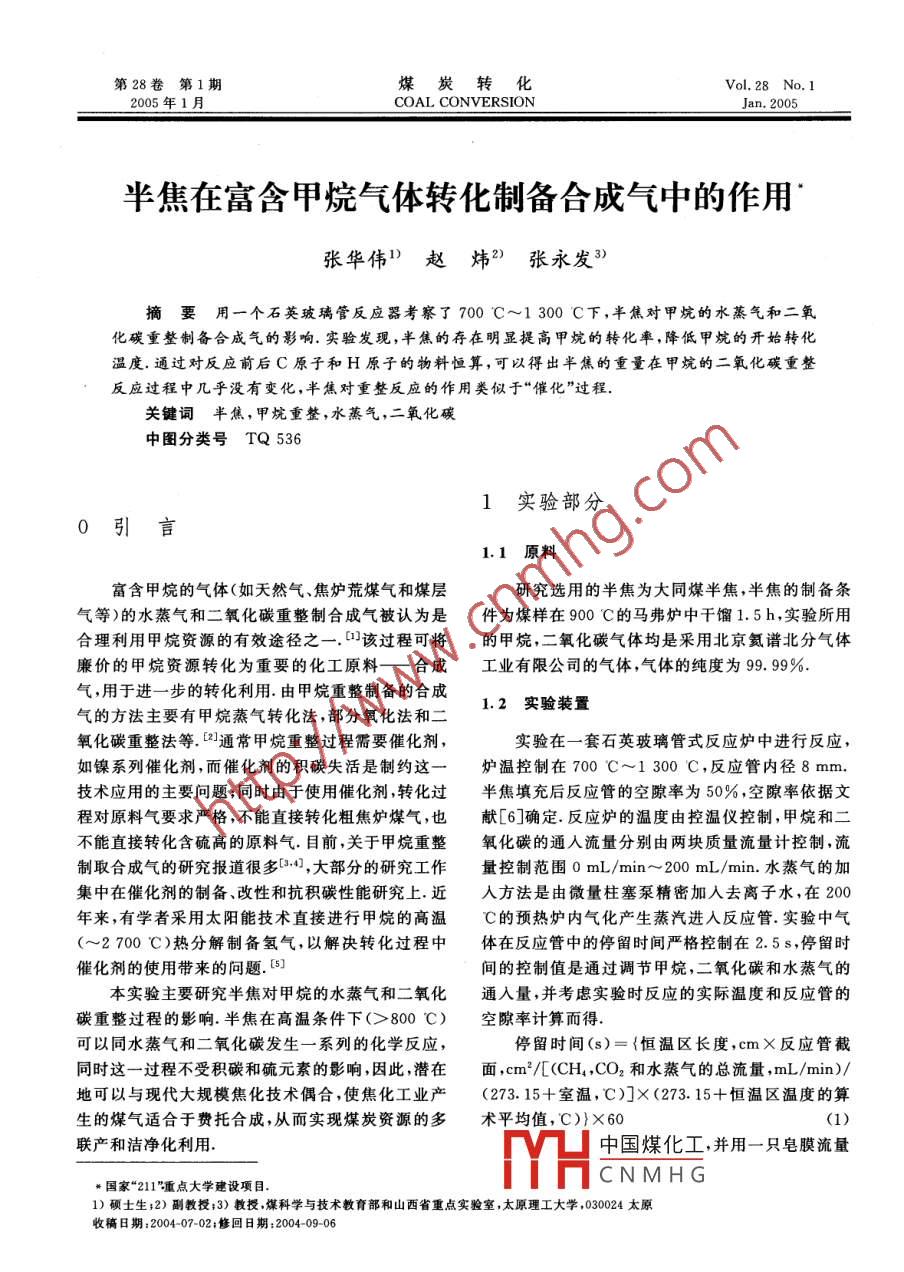 半焦在富含甲烷氣體轉(zhuǎn)化制備合成氣中的作用