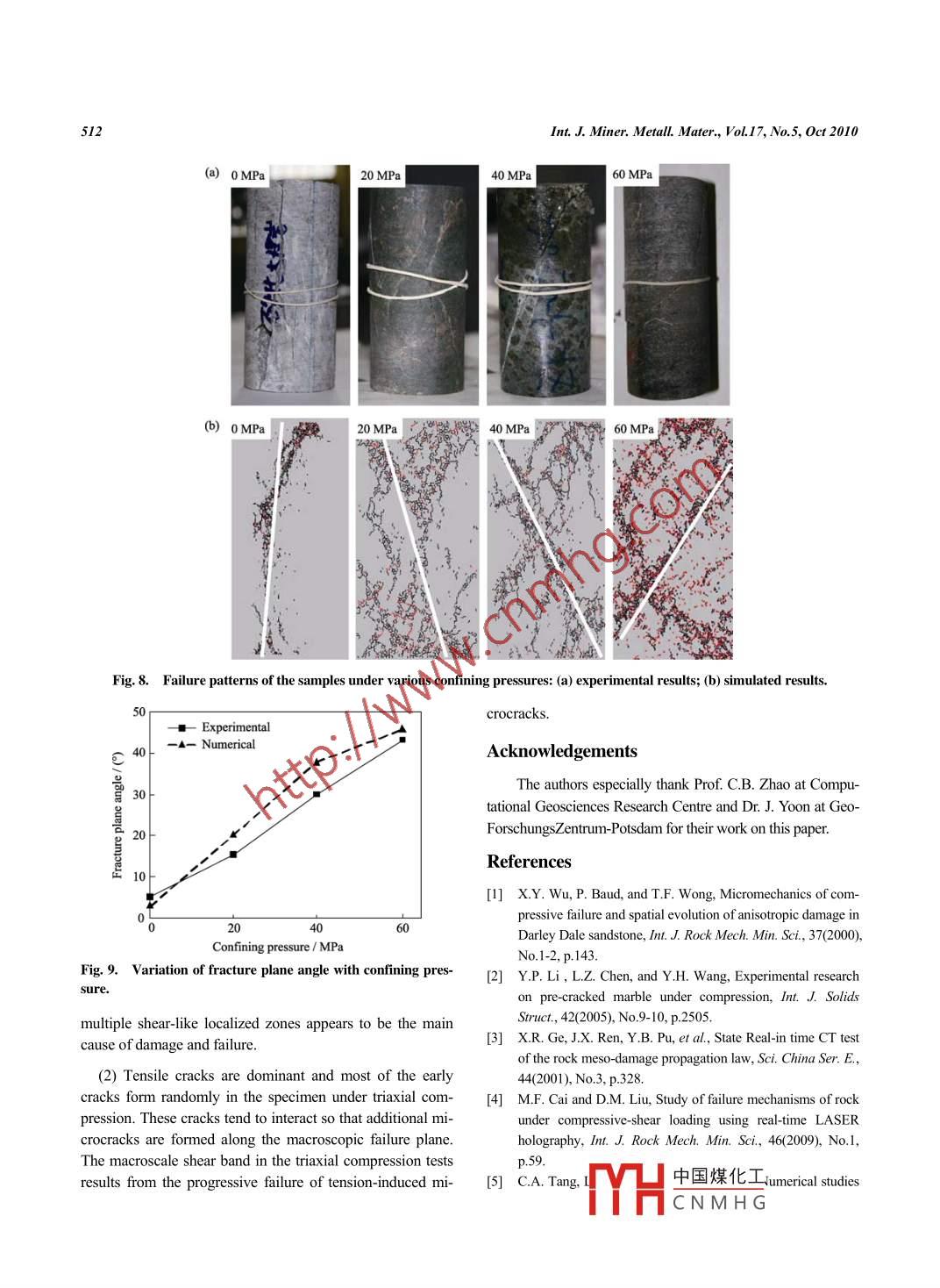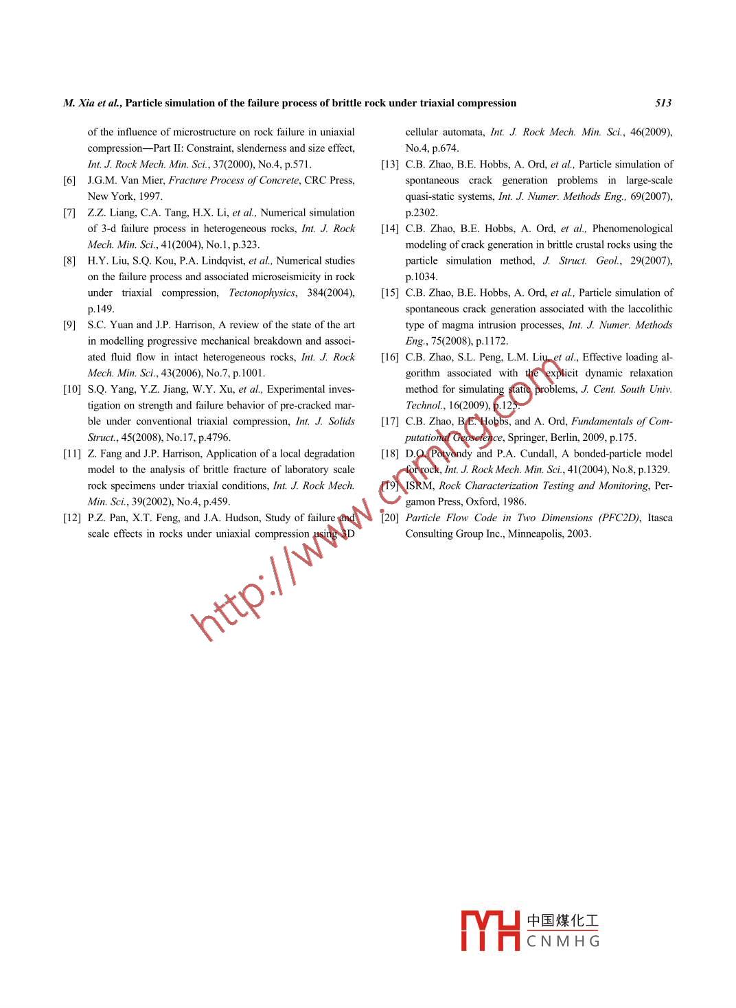 International Journal of Minerals, Metallurgy and MaterialsVolume 17, Number 5, October 2010, Page 507DOI: 10.1007/s12613-010-0350-4Particle simulation of the failure process of brittle rock undertriaxial compressionMing Xia.2) and Ke-ping Zhou)1) School of Resources and Safety Engineering, Central South University, Changsha 4 10083, China2) Ma'anshan Institute of Mining Research, Ma'anshan 243004, China(Received: 20 August 2009; revised: 17 September 2009; acepted: 3 October 2009)Abstract: In order to investigate the failure process of britle rock under triaxial compression through both experimental and numerical ap-proaches, the particle simulation method was used in numerical simulations and the simulated results were compared with those of the ex-periment. The numerical simulation results, such as fracture propagation, microcrack distribution, stress-strain response, and damage patterns,were discussed in dtail. The simulated results under various confining pressures (0-60 MPa) are in good agreement with the experimentalresults. The simulated results reveal that rock failure is caused by axial spitting under uniaxial compression. As the confining pressure in-creases, rock failure occurs in a few localized shear planes and the rock mechanical behavior is changed from brittle to ductile. Consequently,the peak failure strength, microcrack numbers, and the shear plane angle increase, but the ratio of tensile to shear microcracks decreases. Thedamage formation during the compression simulations indicates that the particle simulation method can produce similar behaviors as thoseobserved through laboratory compression tests.Keywords: rock mechanics; compression testing; failure; fracture modes; simulation; microcracks[This work was financially supported by the Graduate Degree Thesis Inmovation Foundation of Central South University (No. 2093st226).]1. Introductionused to simulate the crack initiation, propagation, and coa-lescence, associated with the rock failure. Recently, the par-Advanced techniques, such as scanning electron micros-ticle simulation method [13-17], in which the bonded parti-:opy (SEM), acoustic emission (AE), computerized tomo-cle model is commonly used [18], provides a new way tography (CT), and real-time laser holographic interferometry,reproduce many features related to rock behaviors, such asare applied to laboratory experiments for monitoring rockelasticity, fracturing, acoustic emission, material anisotropyfailure processes [1-4]. Although these studies enhance the due to damage accumulation, hysteresis, dilation, post-peakunderstanding of these processes under compression, the re-softening, and strength increase with confinement. For thislated failure mechanisms, including the microcrack initiation,reason, the particle simulation method has been used topropagation, coalescence, axial splitting, and shearing, arsolve a wide range of rock failure problems of sample-, en-not fully understood [5].gineering-, and geological-length scales [13-17].Many existing models, such as the lattice model [6] andIn this paper, the particle simulation method built in thethe rock failure process analysis (RFPA) model [7-8], havecommercial code (two-dimensional particle flow codesome considerable limitations for simulating rock failurePFC2D)) was adopted to simulate the failure process of brit-processes [9-10]. To overcome the limitations of the RFPAtle rock under the confining pressures of 0, 20, 40, and 60model, the local degradation approach [11] and theMPa, respectively. The comparison between experimentalelasto-plastic cellular automaton model (EPCA) [12] are and numerical results was carried out. In addition, the for-Corresponding author: Ming XiaE-mail: xiaming105@126.com◎University of Science and Technology Beiing and Springer-Verlag Berlin Heidelberg 2010中國煤化工包SpringerMYHCNM HG.508Int J. Miner. Metall. Mater, Vol.17, No.5, Oct 2010mation of microcracks, fracture patterns, and failure planeTable 1. Microscopic parameters of the PFCzD modelangles were carefully analyzed.Particle radius multiplier,..0Particle-particle contact modulus, E。/ GPa802. Experimental and numerical methodologyParticle siffness ratio, kn 1 ks.52.1. Test samples and experimental apparatusParllel-bond modulus, E。 /GPa30A total of 40 skarn samples were prepared to carry outParllel-bond siffnesss ratio, k。 1k。uniaxial and conventional triaxial compression tests (theParticle friction coefficient, μ).5confining pressure equaled to 0, 20, 40, and 60 MPa, re-Parllel-bond mean normal strength,元。/ MPa00spectively). The preparation and testing procedure of rockParallel-bond normal strength, standard deviation,25samples followed the standard testing methods by Interna-od /MPa .tional Society for Rock Mechanics (ISRM) [19].Parallel-bond mean shear strength,元。 / MPaThe triaxial compression experiments were carried out byParallel-bond shear strength, standard deviation,using an MTS815 full-digitally servo-controlled rock me-Taa /MPachanics testing machine at the Rock Mechanics Laboratory,Note: kn- -normal sifess; kg- shear sifness; kn - paral-Changsha Instute of Mining Research, China.lel-bond normal sifess, ks- parall-bond shear sifess.2.2. Brief introduction of PFC2DTable 2. Sample-level parameters of the skarn sampleThe two-dimensional particle flow code (PFC2) [20] isused to approximately simulate the physical tests. The codeParameterNunmerical Experimentalallows the user to explicitly model fracture damage directlyDimensions / (mmxmm)60*12060>120[18]. The microcrack initiation and propagation can be ex-Density 1 (kgm~3)3269pressed as a progressive breakage of contact bonds. TheElastic modulus / GPa117.2111.59 .crack pattermn is automatically determined without need forre-meshing and can be visualized directly during the simula-Poisson ratio0.177tion [18, 20]. As a result, the micromechanical damage canUniaxial compressive strength/ MPa 138.03139.8progressively evolve. Since typical PFC