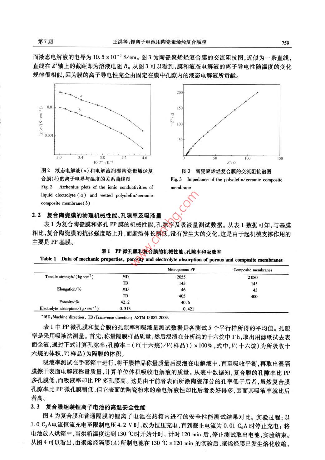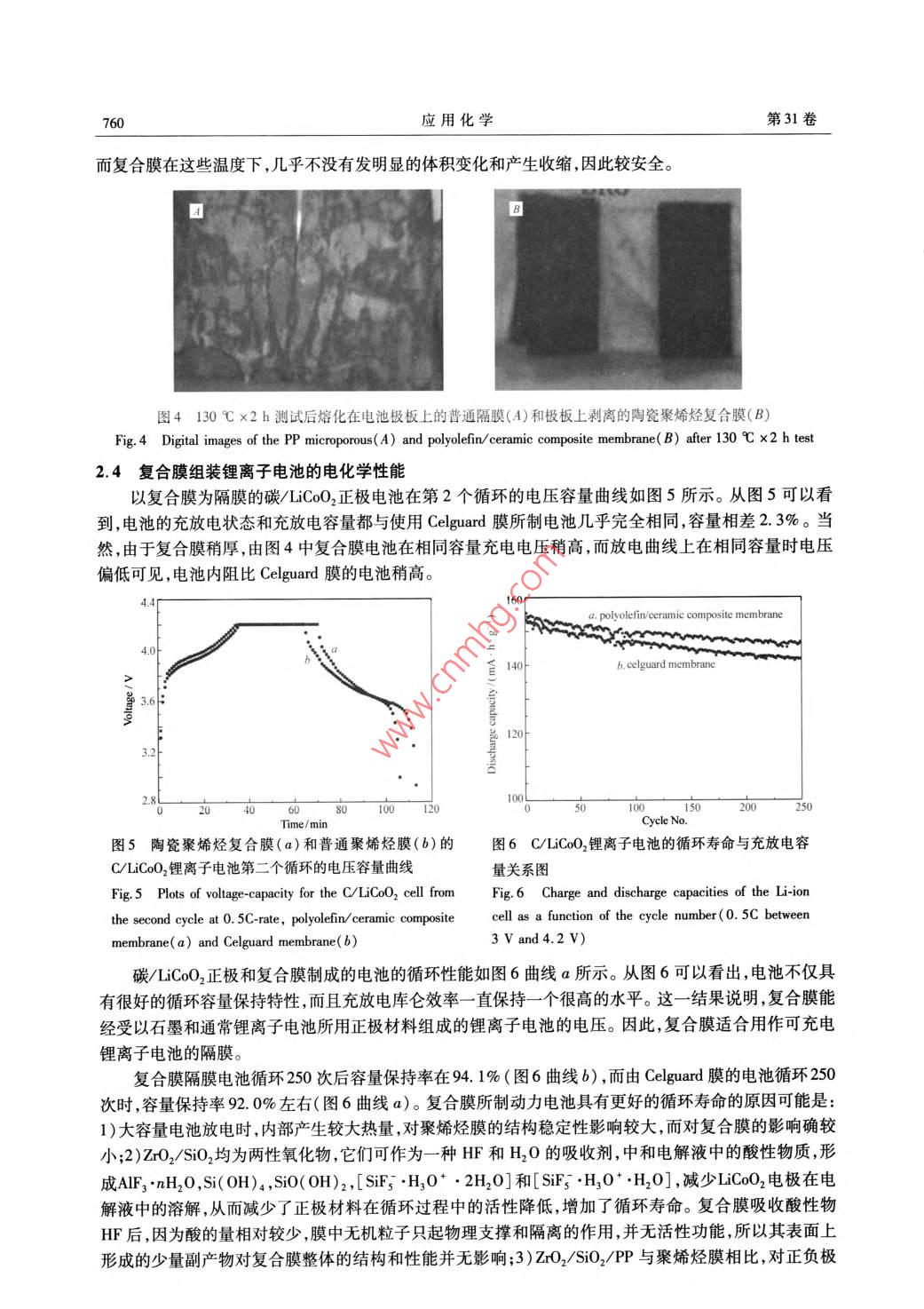 第31卷第7期應用化學Vol.31 Iss. 72014年7月CHINESE JOURNAL OF APPLIED CHEMISTRYJuly 2014研究論文 5鋰離子電池用陶瓷聚烯烴復合隔膜王洪°*楊馳°謝文峰5余剛‘(°綿陽師范學院化學與化學工程學院綿陽621000;'四川師范大學成都610066;格林電池有限公司重慶 400708)摘要為改善聚烯烴微孔膜的耐熱安全性,研究了用于鋰離子電池的陶瓷聚烯烴復合隔膜Zr0,/SiO2/PP(聚丙烯)。復合膜具有高度多孔性和良好液體電解液濕潤性。由于高的毛細吸附作用,通過吸附液態(tài)電解液,膜很易傳導鋰離子。膜中ZrO2/SiO2的兩性特征,將電解液中的酸性HF(氟化氫)消耗掉,而HF作為現(xiàn)在鋰離子電池所用電解液中的雜質(zhì)是不可避免的。復合膜作為隔膜制備的碳/正極材料鋰離子電池不僅具有優(yōu)良的容量保持性、高溫安全性,也顯示良好的倍率放電性。關鍵詞陶瓷聚烯烴隔膜, 鋰離子電池,離子電導,循環(huán)性能中圖分類號:0646; TM911.1文獻標識碼:A文章編號:000-0518(2014)07-0757-06DOI:10. 3724/SP. J.1095. 2014. 30445鋰離子電池是- -種有潛力的電動汽車和混合電動車用能源113] ,然而高成本和低安全性問題仍限制其實際應用。為降低成本,開發(fā)了價格低廉的活性材料[42)] ,如尖晶石LiMn20,正極材料、天然石墨負極材材和液態(tài)電解液;為解決安全性,開發(fā)了高安全性的活性材料,如磷酸鐵鋰、錳酸鋰和鈦酸鋰[849]等。而有關隔膜的研究較少,涉及隔膜的研究,大多為以有機聚合物為主體的凝膠態(tài)電解質(zhì)|012] ,實際上,電池隔膜的耐熱性能對于鋰離子電池的電化學性能和安全性能具有很大的影響。聚烯烴膜(如Celgard膜)在溫度達到130 C或更高時,會出現(xiàn)軟化甚至熔化田,隔膜體積劇烈收縮引起內(nèi)部短路,從而引發(fā)災難性的熱失控。因此,作為高功率用途的鋰離子電池,開發(fā)出高溫尺寸穩(wěn)定的隔膜顯得非常必要。隔膜的熱安全溫度很大程度上取決于制備隔膜的基材,均質(zhì)的聚乙烯( PE)膜熱閉孔溫度即可理解為熱安全溫度,然而,通過結構復合技術提高膜的熱熔化溫度可以有效提高膜的熱安全溫度。Chung等[4)在PE膜上添加二甲基丙烯酸乙二醇酯( DEGDMA)聚合物涂層,使PE膜的熱閉孔溫度與熱安全溫度分別提高到142和155 C。Yoo等[I5]在此基礎上將PE隔膜置于含有水、DEGDMA、正硅酸乙酯的甲醇溶液中,在PE膜表面上形成納米氧化硅膜層,將隔膜的熱安全溫度提高至170 C。Moon等[16]以高密度聚乙烯與極高相對分子質(zhì)量聚乙烯代替普通乙烯作原料,以常規(guī)濕法制備聚乙烯隔膜將熱閉孔溫度提高至130 C、熱安全溫度提高至160 C。Zhang等['7]用相轉(zhuǎn)移法制備了PVDF/PMMAVPVDF(聚偏氟乙烯~聚甲基丙烯酸甲酯-聚偏氟乙烯)結構隔膜,該膜的熱安全溫度升高至180 C。Kize[8]用聚合物纖維制備了無紡布隔膜,熱安全溫度可達180 C ,并具有極小的熱收縮。這些膜或由于厚度和阻抗較大,或難于控制孔徑,或?qū)岬碾娊庖翰环€(wěn)定,基本上沒有商業(yè)實用性。本文用兩性Z02/SiO2為主要成分與聚烯烴類微孔膜-起制得有機無機復合膜,以它作為鋰離子電池隔膜,訒性好,可以現(xiàn)埸與鋰離子電池電解液中產(chǎn)生的酸性副產(chǎn)物HF(氟化氫)作用,而且熱穩(wěn)定性好,對電解液穩(wěn)定和不影響基膜孔徑,比商用的微孔聚烯烴鋰離子電池隔膜具有更好的電化學性能。1實驗部分1.1 試劑和儀器Z02粉末(0.2 ~0.5 μm ,98% ,Aldrich) ;Si0,粉末(0. 2 ~0. 3 μm,98% ,Aldrich) ;鈷酸鋰(5 ~6 μm,2013-09-03 收稿,2013-1104修回,2014-01-28接受四川教育廳基金項目(11ZA165) ;綿陽師范學院支持項目(2011D01)通訊聯(lián)系人:王洪教授; Tel/Fax :182000; E-mail: wang19S9hong@ liyun. com;研究方向:鋰離子電池材料,固態(tài)橐合物鋰離子電池工程.758應用化學第31卷湖南瑞翔公司) ;中間相碳微球( MCMB,日本大阪煤氣) ,粒度20 μm;聚偏氟乙烯(PVDF 2801 ,美國阿托化學) ;N-甲基吡咯烷酮(NMP,日本三菱化學) ;導電碳黑(比利時,特密高)。電解液:1 mol/L LiPF。溶于V( EC-碳酸乙烯酯): V( DMC碳酸二甲酯) =1:1的混合溶劑(日本三菱化學);上述試劑均為電池級。聚丙烯( PP)膜2400(美國Celguard)。THS-A型恒溫恒濕試驗機(臺灣KSON科技) ;Labmaster手套箱(德國M Braun) ;JSM-7100F型掃描電子顯微鏡(日本,JEOL) ;BT-3043型電池測試儀(美國, Arbin) ;C-2000型涂布機(美國,AES)。1287型電化學界面儀(英國, Solartron) ;4294A型精密阻抗分析儀(美國, Agilent)。1.2實驗方法1.2.1陶瓷聚烯烴復合隔膜制備干燥 N2氣中于50 C將計量的用作陶瓷粉末粘合劑的PVDF粉末慢慢加入計量的NMP和丙酮體積比為1:2 的混合溶劑中,直至溶解透明。再將計量的Zr02/SiO2(m( ZrO2):m( Si02) =2:1)粉末加入此體系中,經(jīng)充分混合成為漿狀物,后用涂布機涂布到PP微孔膜的表面,烘干成陶瓷聚烯烴復合隔膜,膜單面涂布厚度約5μm。為了做電化學測試,將膜切成小圓片。1.2.2樣品的電化學性能測試測試電池正極制作:鈷酸鋰與導電炭黑、PVDF以質(zhì)量比92:5:3,在.NMP中分散成漿料,再將漿料用輥涂的方式均勻涂布于0. 012 mm厚的鋁箔上面。測試電池負極制作:MCMB與導電炭黑PVDF以質(zhì)量比90:5:5比例,在NMP中分散成漿料,再將漿料用輥涂的方式均勻涂布于0.009mm厚的銅箔上面。為平衡正負極比例,MCMB/鈷酸鋰質(zhì)量比為1:2。制得的正負極極片均沖切成圓片,在120 C,真空干燥16 h備用。測試電池在充氬的手套箱中裝配,復合膜為電池的隔膜。用具有不銹鋼雙電極的對稱電池