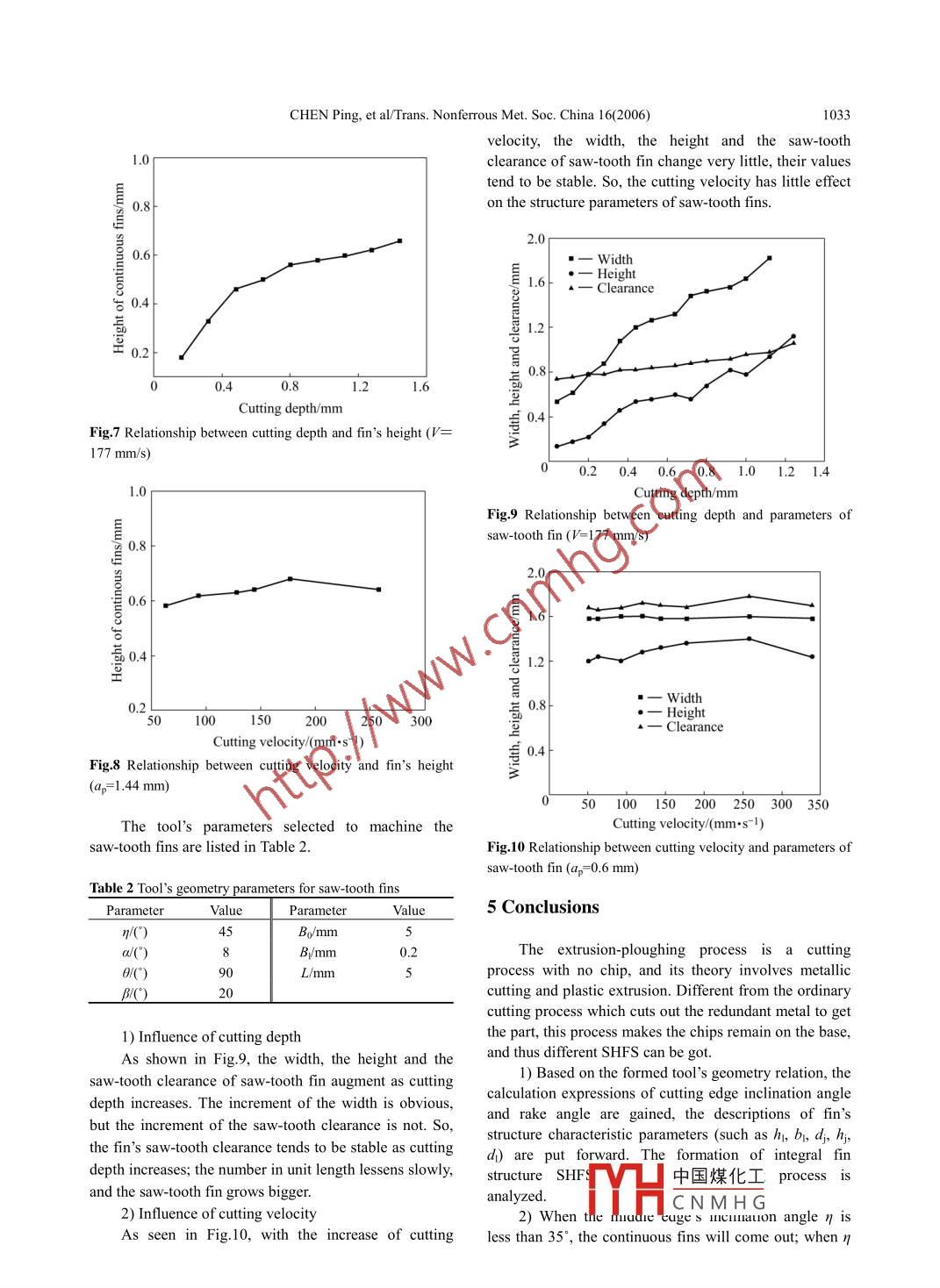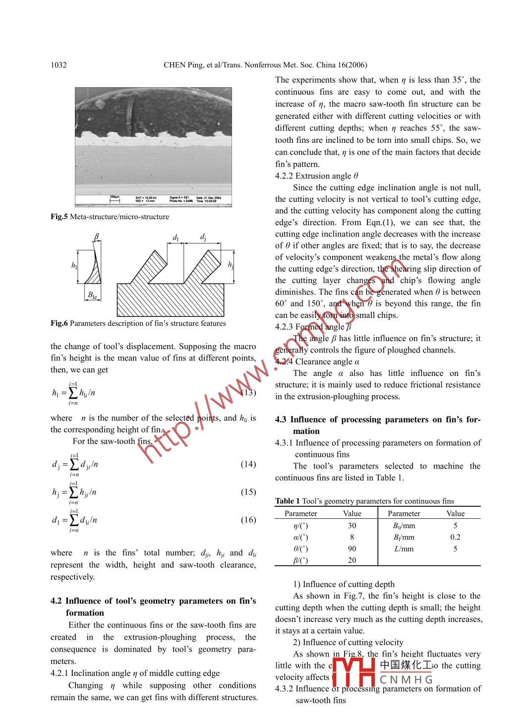 Available online at www.sciencedirect.comsCIENCE (@oIRECT.Transactions of.Nonferrous MetalsSociety of ChinaScienceTrans. Nonferrous Met. Soc. China 16(2006) 1029-1034PressFormation of integral fins function-surface by extrusion-ploughing processCHEN Ping(陳平), TANG Yong(湯勇), LIU Xiao-kang(劉小康), LIU Xiao-qing(劉曉晴)Collge of Mechanical Engineering, South China University of Technology, Guangzhou 510640, ChinaReceived 9 November 2005; accepted 10 May 2006A bstract: An extrusion-ploughing process was presented to fabricate the integral fin function- surface. Cutting edge inclination angleand rake angle can be calculated from the tool's geometry relationship. The description of fins' geometry characters was standardized.The experiments show that, when the middle cutting edge's inclination angle η is less than 35", continuous fin will come out; when ηis between 35° and 55;, the fins will be saw-tooth ones, and the fins will be torn when this angle is above 55"; when the extrusionangle θ is between 60° and 150", the fins will appear, or else, the fins will be torm into chips from the base. Forming angle andclearance angle have lttle effect on fin's formation. For continuous fin, its height is close to cutting depth when it is small, but it willbecome approximately constant as cutting depth grows; for saw-tooth fins, the width, the height, as well as the clearance willincrease with the increase of cutting depth, but the increment of clearance is small; neither for continuous fin, nor for saw-tooth ones,cutting velocity has little influence on their structure parameters.Key words: fins; integral fins; extrusion- ploughing formation; heat function surfaceexternal convection pattern, even needs to employ1 Introductionsurface meta-structure and micro-structure to strengthenthe heat transmission. But which SHFS to use and how toThe ever-increasing integrity of electronic chipsmachine remain unclear; the description, design,results in high heat flow density, which makes themachining and the application of SHFS lack necessarycooling become the ever more serious[1 - -5]. Thetheories, so it can't realize the design and machining oftraditional single-scale and simple figure surfaceSHFS effectively, according to the active requirement,heat-function macro-structure can not meet the coolingyet nor can realize the digital design and fabrication.requirement,which slows the development ofIn this work, an extrusion-ploughing technologyhigh- integrity chips.with no chip is presented to generate fin SHFS,and theAt present, the research of surface heat functionmachining theory of SHFS can be richened and perfectedstructure(SHFS) mainly focuses on the analysis andby studying the forming mechanism and relevantdesign of heat transmission in macro-scale. For example,influencing factors, which provides the optimum methodGeogria Institute of Technology[6] has done somefor high heat flow density.researches on the surface macro-structure andmeta-structure. With the worsening of cooling, the study2 Experimentalof SHFS is turming to meta/micro field, such as thedevelopment of micro heat transfer[7- 12]. Themachining of meta-structure and micro-structure of the2.1 Experimentmacro structure surface[13-15], as well as the ke;The experiment was carried out on the universalplaner B6050B. The tool was made of high speed steeltechnology, has been studied at home.Solving the present high heat flow density needs toW18Cr4V, and the workpiece was made of red copper T2.design heat function surface macro structure, based onThe fitness of the workpiece and the tool is shown inthe special radiating environment requirement andFig.1.中國煤化工Foundation item: Projects(50436010; 50375055) supprted by the National Natural Science Fou: supported by theNatural Science Foundation of Guangdong Province, China; Project(2005B10201:YHC N M H Gnnological Projcetof Guangdong Province, ChinaCorresponding author: GHEN Ping; Tel: +86-20-87114634; Fax: +86-20-87604634; E-mail: cp629@163 com.1030CHEN Ping, et al/Trans. Nonferrous Met. Soc. China 16(2006)2.3 Tool's anglesFrom Fig.2, differing from the common planer tool,the extrusion-ploughing formed tool has 3 characters.The first is that the rake angle y is minus, and the secondis that the cutting edge inclination angle h is not zero,and the last is that the tool has multi cutting edges, so thecutting pattern corresponds to the multi-edge cutting withinclination angle. Supposing the cutting velocity is alongZ minus axis, that is perpendicular to the base level Prand pointing to the tool. From tool's geometryrelationship, 7 and h can be calculated as follows:θcos- cosa cosηsinλ =(1Fig.1 Experimental device of extrusion-ploughing process/sin2二sin2 (a +η)+cos2二cos2 η2.2 Formed toolContrary to the common cutting process which cutsout the redundant metal to get the part, the extrusion-cosY=√R+B +Cploughing process makes the chips remain on the base,thus the radiating area is enlarged; not only the material'sutilization is bettered, but also the problem of practicalcossin a cosηcontact thermal resistance in heat control is solved. Thedesign of formed tool should fully reflect the non-chipn2 :sin2(a +7)+cos2 sin2 a cos2 ηtechniques. As shown in Fig.2, the tool's movingdirection is parallel to the formed plane.√A2+B2 +C2sin G sin(x +η)RoPn(2)θ./sin2。sin2(a +η)+ cos2O sin2 acos'η2Forming PAfacewhereTool frankMiddleA= cos一sin a cosη sin sinη(3)cutting edge27XsCfABRake faceB= sin2 _sisin(a + n)sinη(4)Main cutting edgea)C = sin2二sin(o + n)cosn + cos二sinocos' η(5)3 Extrusion-ploughing forming process3.1 Critical depth in double edge cuttingIn Fig.2, when ap equals Y value of intersection ofline FC and plane P, both main cutting edge and sidecutting edge cut the workpiece simultaneously, thecutting depth is named as the critical depth her.From Fig.3, the critical depth can be solved asher =hp +k(hc-hp)_6)(b)中國煤化工M tan axYHCNMH G .Fig.2 Extrusion-plough