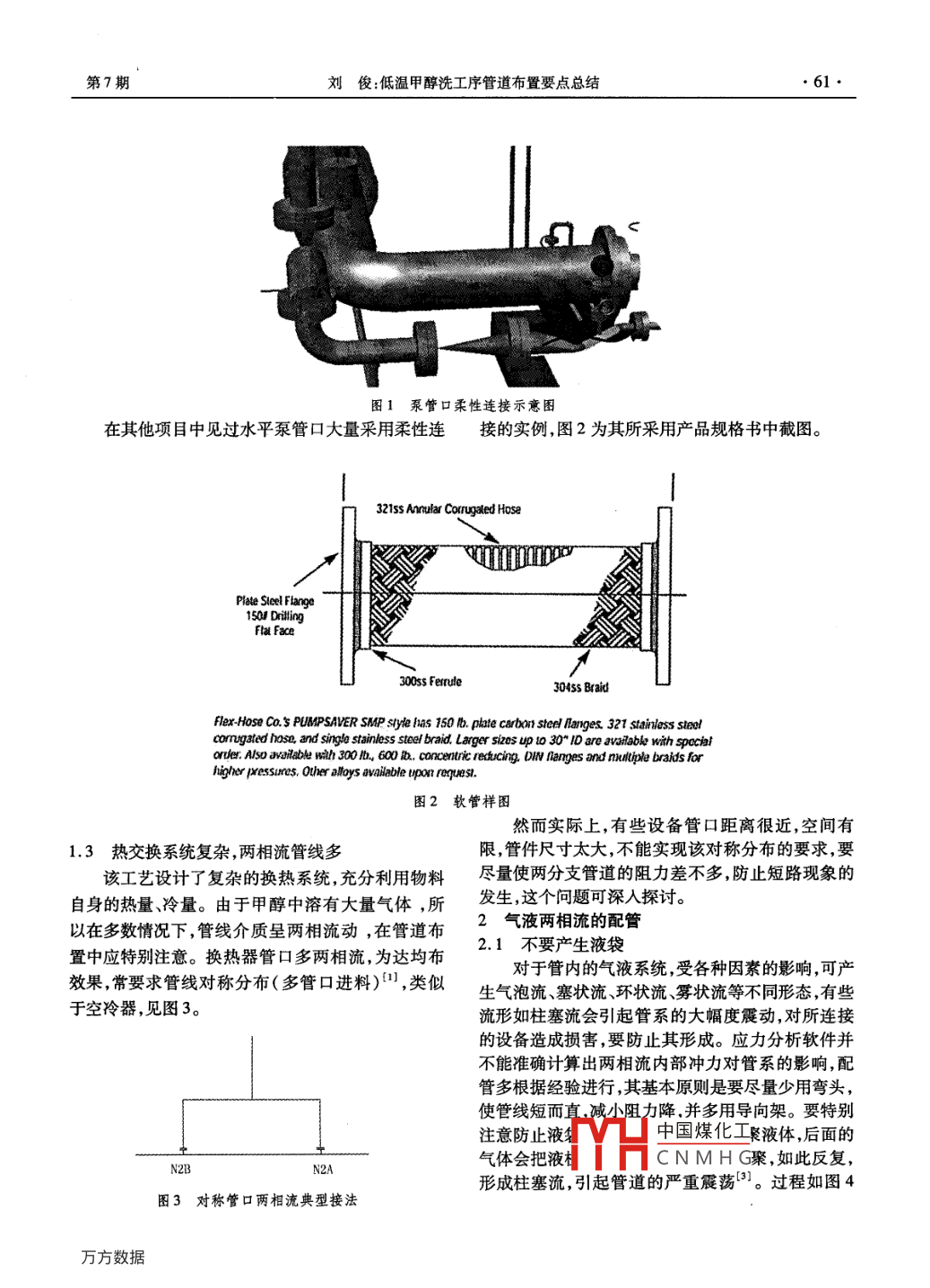 山東化工SHANDONG CHEMICAL INDUSTRY2012年第41卷低溫甲醇洗工序管道布置要點總結劉俊(中國化學工業(yè)桂林工程有限公司,廣西南寧530022)摘要:針對低溫甲醇洗裝置的工藝特點對主要設備的管道布置的要點跟技巧進行總結供工程設計人員參考。關鍵詞:氣液兩相;管道布置;低溫甲醇中圖分類號:TQ23.12;TQ055.81文獻標識碼文章編號:1008-021X(2012)07-0060-04The Key Point for the Piping Arrangement of Rectisol UnitLIU JunChina Chemical GuiLin Engineering Co. Ltd, Nanning 530022, ChinaAbstract: The summary of the piping arrangement for the important equipments involved in the Rectisolprocess, for engineers referenceKey words: gas-liquid two-phase flow; piping arrangement rectisol低溫甲醇洗是一種物理洗滌法,利用甲醇在-節(jié)閥前后都應加導淋。另外,對水平方向的機泵管60℃左右的低溫下對酸性氣體溶解度極大的特性,口來說,若是泵口(如側線抽頭)與管道尺寸相差較去除變換合成氣中的CO2、H2S等氣體,多用于氨合大,常規(guī)的配管方式很難解決其應力問題,在該項目成、甲醇合成羰基合成、工業(yè)制氫、城市煤氣、天然中兩臺并聯(lián)泵的管口為DN50,管道為DN50(見圖氣凈化等大型工業(yè)化裝置,具有吸收能力大、選擇性1),管口所能承受的力跟力矩都很小(設備廠商提好凈化度高、操作費用低的特點。供數(shù)據(jù)),調(diào)整多次管道都難以滿足應力要求,可以目前國內(nèi)使用的低溫甲醇洗工藝大量引進德國考慮泵管口用柔性連接。林德公司和魯奇公司的專利技術,兩家公司現(xiàn)在也(2)氣體。流體中會夾帶H2S、CO、H2等有毒是在相互借鑒,區(qū)別越來越小。作者參與了江蘇淮易燃氣體,不能隨意排放到大氣中需進入火炬系統(tǒng)安某企業(yè)所釆用的魯奇工藝的低溫甲醇洗的管道設處理。計工作(PDS三維),就設計過程中的一些要點、難1.2溫度低,管線尺寸大點做些闡述與探討。利用甲醇在在低溫下(最低-60℃)的選擇吸1工藝特點收性,同時分段吸收合成氣中的CO2、H2S,實現(xiàn)凈化1.1吸收劑有毒用量大,需密閉回收目的。為保證管系在低溫工況中保持足夠的柔性、(1)液體。甲醇屬易燃易爆物品,且有毒,易揮不會因脆變造成損壞,裝置大量采用低溫鋼與不銹發(fā),不得隨意排放,裝置中需設置密閉回收系統(tǒng),減鋼管道管件,本項目中的所有的低溫鋼管道材料都少環(huán)境污染以及其潛在著火危險,這就要求設計者由國外采購,成本大大提升,這就需要在配管時要特仔細檢查管道走向,在管系低點增加排凈閥門(雙別考慮其經(jīng)濟性。+盲板)連接到回收系統(tǒng)。需要注意的是泵出口該裝置80%以上的工藝管道都需要保冷,在開管道止回閥后管系很長,停車檢修時,由于閥門的止始進行管道布置時就應考慮設置保冷支架的位置,逆作用,會停留大量的甲醇止回閥通常會設置在低增大管道之間,管道與構建筑物之間的距離。點,就要注意該點的排凈問題。于此類似的還有調(diào)管道多在DN300以上,管件、閥門占空間大,應節(jié)閥組的低點,特別是一些事故關(FC)的閥門,調(diào)力問題中國煤化工收稿日期:2012-06-2TYHCNMHG作者簡介:劉俊(1983-),男,山東泰安人,工程師,主要從事管道設計工作。第7期劉俊:低溫甲醇洗工序管道布置要點總結1泵管口柔性連接示意圖在其他項目中見過水平泵管口大量采用柔性連接的實例,圖2為其所采用產(chǎn)品規(guī)格書中截圖。321ss Annular Corrugated HoseIsQ DrillingFa Face300ss Ferrule045s Braidflex- Hose Co 3 PUMPSAVER SMP styte has 150 b. ple carbon steel llanes. 321 stain ess steelcorrugated hose, and single stainess steel braid, Larger sizes up to 30- ID are avaiable with spccialardler. Also aaae wah 300 600 concentric reducing DIN Ranges and mutiple braids fartiger pressures. Other aloys avaiable upon request圖2軟管樣圖然而實際上,有些設備管口距離很近,空間有1.3熱交換系統(tǒng)復雜,兩相流管線多限,管件尺寸太大,不能實現(xiàn)該對稱分布的要求,要該工藝設計了復雜的換熱系統(tǒng),充分利用物料盡量使兩分支管道的阻力差不多,防止短路現(xiàn)象的自身的熱量冷量。由于甲醇中溶有大量氣體,所發(fā)生,這個問題可深人探討。以在多數(shù)情況下,管線介質(zhì)呈兩相流動,在管道布2氣液兩相流的配管置中應特別注意。換熱器管口多兩相流,為達均布2.1不要產(chǎn)生液袋效果,常要求管線對稱分布(多管口進料)(,類似對于管內(nèi)的氣液系統(tǒng),受各種因素的影響,可產(chǎn)生氣泡流、塞狀流、環(huán)狀流、霧狀流等不同形態(tài),有些于空冷器,見圖3。流形如柱塞流會引起管系的大幅度震動,對所連接的設備造成損害,要防止其形成。應力分析軟件并不能準確計算出兩相流內(nèi)部沖力對管系的影響配管多根據(jù)經(jīng)驗進行,其基本原則是要盡量少用彎頭,使管線短而直減小阻力降并多用導向架。要特別注意防止液中國煤化工褻液體,后面的N2B氣體會把液CNMHG聚,如此反復,形成柱塞流,引起管道的嚴重震蕩。過程如圖4圖3對稱管口兩相流典型接法62SHANDONG CHEMICAL INDUSTRY012年第41卷所示。塔的配管與確定管口方位緊密聯(lián)系在一起,兩者不能孤立開來,塔可分為操作側與配管區(qū)兩部分UlU配管區(qū)主要用于容納工藝與公用工程管道,操作側用于設置人孔及平臺,用于檢修塔內(nèi)件、儀表及少量操作任務。管口方位的確定可遵循一定的原則,比如從上到下,對局限性大的管道優(yō