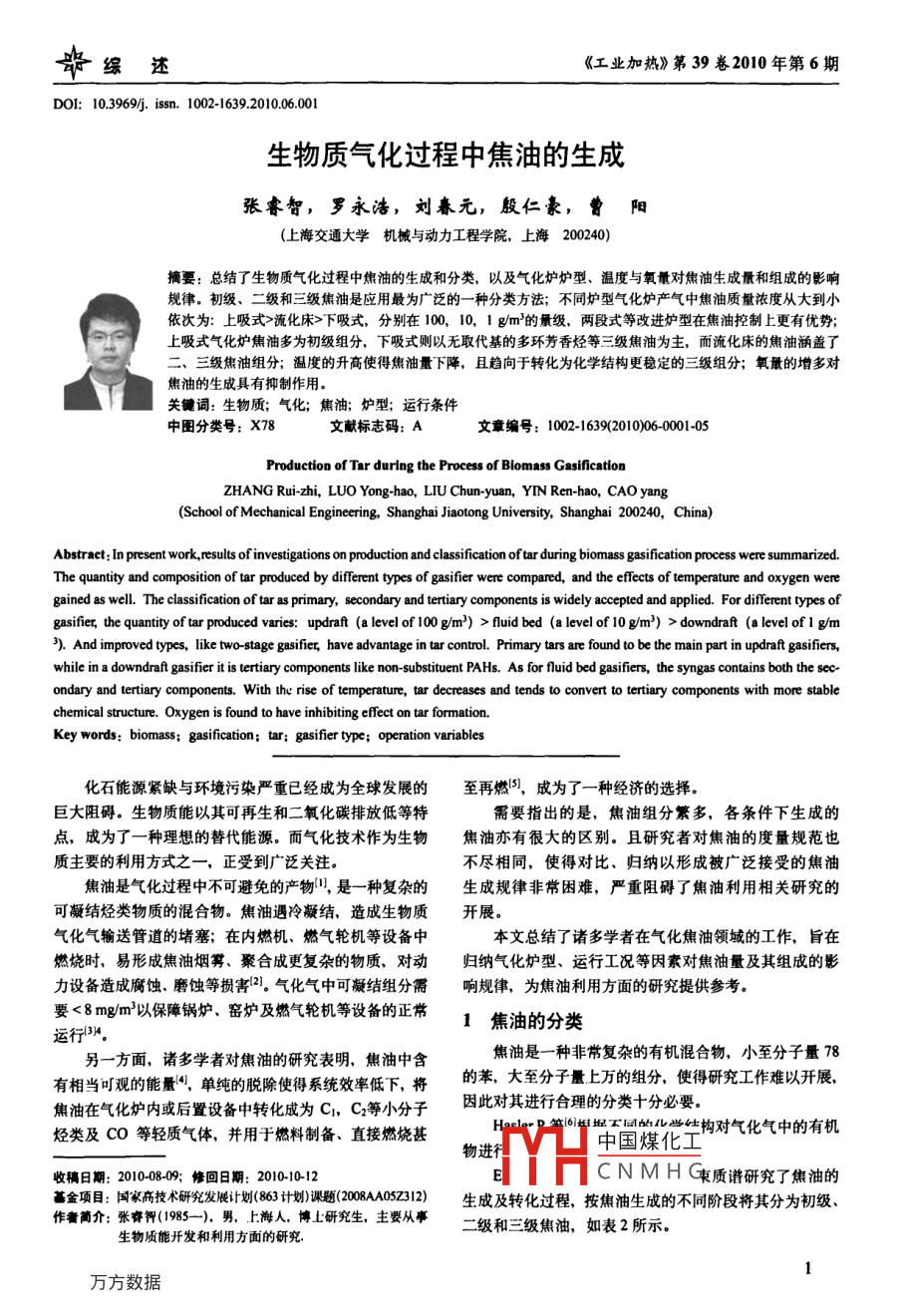 辛緣述《工業(yè)加熱》第39卷2010年第6期DoI:10.3969.isn.1002-1639.2010.06001生物質(zhì)氣化過程中焦油的生成張睿智,羅永浩,劉春元,殷仁豪,曾陽(上海交通大學(xué)機(jī)械與動力工程學(xué)院,上海200240)摘要:總結(jié)了生物質(zhì)氣化過程中焦油的生成和分類,以及氣化爐爐型、溫度與氧量對焦油生成量和組成的影響規(guī)律。初級、二級和三級焦油是應(yīng)用最為廣泛的一種分類方法;不同爐型氣化爐產(chǎn)氣中焦油質(zhì)量濃度從大到小依次為:上吸式>流化床>下吸式,分別在100,10,1g/m3的量級,兩段式等改進(jìn)爐型在焦油控制上更有優(yōu)勢;上吸式氣化爐焦油多為初級組分,下吸式則以無取代基的多環(huán)芳香烴等三級焦油為主,而流化床的焦油涵蓋了三級焦油組分;溫度的升高使得焦油量下降,且趨向于轉(zhuǎn)化為化學(xué)結(jié)構(gòu)更穩(wěn)定的三級組分;氧的增多對焦油的生成具有抑制作用關(guān)鍵詞:生物質(zhì);氣化;焦油;爐型;運行條件中圖分類號:X78文獻(xiàn)標(biāo)志碼:A文章編號:1002-1639(2010)06-0001-05Production of Tar during the Process of Biomass GasificationZHANG Rui-zhi, LUo Yong-hao, LIU Chun-yuan, YIN Ren-hao, CAO yang(School of Mechanical Engineering, Shanghai Jiaotong University, Shanghai 200240, China)Abstract: In present work, results of investigations on production and classification of tar during biomass gasification process were summarized.The quantity and composition of tar produced by different types of gasifier were compared, and the effects of temperature and oxygen weregained as well. The classification of tar as primary, secondary and tertiary components is widely accepted and applied. For different types ofgasifier, the quantity of tar produced varies: updraft (a level of 100 g/m )>fluid bed (a level of 10 g/m )>downdraft (a level of i g/m2). And improved types, like two-stage gasifier have advantage in tar control. Primary tars are found to be the main part in updraft gasifiers,while in a downdraft gasifier it is tertiary components like non-substituent PAHs. As for fluid bed gasifiers, the syngas contains both the see-ondary and tertiary components. With the rise of temperature, tar decreases and tends to convert to tertiary components with more stablechemical structure. Oxygen is found to have inhibiting effect on tar formation.Key words: biomass; gasification; tar: gasifier type: operation variables化石能源緊缺與環(huán)境污染嚴(yán)重已經(jīng)成為全球發(fā)展的至再燃S,成為了一種經(jīng)濟(jì)的選擇。巨大阻礙。生物質(zhì)能以其可再生和二氧化碳排放低等特需要指出的是,焦油組分繁多,各條件下生成的點,成為了一種理想的替代能源。而氣化技術(shù)作為生物焦油亦有很大的區(qū)別。且研究者對焦油的度量規(guī)范也質(zhì)主要的利用方式之一,正受到廣泛關(guān)注。不盡相同,使得對比、歸納以形成被廣泛接受的焦油焦油是氣化過程中不可避免的產(chǎn)物是一種復(fù)雜的生成規(guī)律非常困難,嚴(yán)重阻礙了焦油利用相關(guān)研究的可凝結(jié)烴類物質(zhì)的混合物。焦油遇冷凝結(jié),造成生物質(zhì)開展。氣化氣輸送管道的堵塞;在內(nèi)燃機(jī)、燃?xì)廨啓C(jī)等設(shè)備中本文總結(jié)了諸多學(xué)者在氣化焦油領(lǐng)域的工作,旨在燃燒時,易形成焦油煙霧、聚合成更復(fù)雜的物質(zhì),對動歸納氣化爐型、運行工況等因素對焦油量及其組成的影力設(shè)備造成腐蝕、磨蝕等損害2。氣化氣中可凝結(jié)組分需響規(guī)律,為焦油利用方面的研究提供參考要<8mg/m3以保障鍋爐、窯爐及燃?xì)廨啓C(jī)等設(shè)備的正常焦油的分類運行3另一方面,諸多學(xué)者對焦油的研究表明,焦油中含焦油是一種非常復(fù)雜的有機(jī)混合物,小至分子量78有相當(dāng)可觀的能量“,單純的脫除使得系統(tǒng)效率低下,將的苯,大至分子量上萬的組分,使得研究工作難以開展焦油在氣化爐內(nèi)或后置設(shè)備中轉(zhuǎn)化成為C1,C2等小分子因此對其進(jìn)行合理的分類十分必要。烴類及CO等輕質(zhì)氣體,并用于燃料制備、直接燃燒甚P篇°坦同化爛構(gòu)對氣化氣中的有機(jī)物進(jìn)中國煤化工收稿日期:2010-08-09;修回日期:2010-1012CNMH(束質(zhì)譜研究了焦油的金項目:國家高技術(shù)研究發(fā)展計劃(803計劃)課題(200A402312)生成及轉(zhuǎn)化過程,按焦油生成的不同階段將其分為初級、作奢簡介:張資智(195-).男,上海人,博上研究生,主要從亭二級和三級焦油,如表2所示生物質(zhì)能開發(fā)和利用方面的研究《工業(yè)加熱》第39卷2010年第6期表1 Hasler P.等的分類重焦油高沸點高分子有機(jī)組分,通常用稱重法測定多環(huán)芳香烴擁有兩個芳香環(huán)以上的有機(jī)組分,美國EPA給出了個16種組分的PAH列表,酚類含有羥基(OH)的芳香族(如苯酚、甲酚)趙果輕焦油含有中等揮發(fā)性的烴類,沸點80~200℃(如BTX苯、甲苯和二甲苯),并不包含酚類0.1輕烴非芳香族烴類,最高至Cs,常溫下為氣態(tài)(如甲烷和乙烯)a be d上吸式下吸式流化床氧化物含氧的非芳香族有組分(如乙酸、甲醇)注:字母a~q代表不同研究中獲得的實驗數(shù)據(jù):注:灰色底紋部分不列入焦油范疇kRistensen O.,文獻(xiàn)l9表2 Evans R.J等的焦油分類bAlo K,文獻(xiàn)[c-Stahlberg P,木料,文獻(xiàn)[∞o;類別d- Stahlberg P,城市垃圾,文獻(xiàn)[lo;初級焦油典型的快速熱解焦油,包括了絕大部分纖維素中聚合e-Stahlberg P,稻草,文獻(xiàn)[ll-∞;物的碎片和