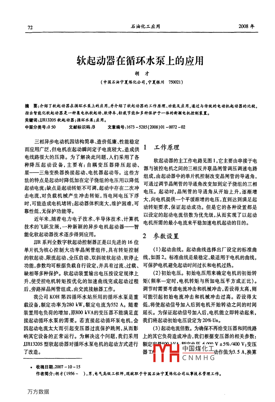 72石油化工應(yīng)用2008年軟起動器在循環(huán)水泵上的應(yīng)用胡才(中國石油寧夏煉化公司,寧夏銀川750021)摘要:介紹了軟起動器在循環(huán)水泵上的應(yīng)用,并介紹了軟起動器的工作原理、功能及應(yīng)用,通過與傳純的電動機起動器的比較,指出智能化軟起動器是一種集電機軟起動、軟停車、輕載節(jié)能和多種保護于一體的新穎電機控制裝置。關(guān)鍵詞:JR1320s軟起動器;循環(huán)水泵;應(yīng)用。中圖分類號050文獻標識碼B文章編號:1673-5285(200801-0072-02三相異步電動機因結(jié)構(gòu)簡單、造價低廉、性能穩(wěn)定而應(yīng)用廣泛,但電機在起動瞬間定子電流較大,造成供1工作原理電線路很大的壓降。為了解決此問題,人們采用了各種降壓起動設(shè)備,主要有:自耦變壓器降壓起動軟起動器的主工作電路見圖1,它主要由串接于電星——三角變換器換接起動、電抗器起動等。這些方源與被控電機之間的三相反并聯(lián)晶閘管調(diào)壓調(diào)速電路法的特點是起動時降低加在定子繞組的電壓用以降低組成,由起動器中的單片機控制改變晶閘管的導(dǎo)通角起動電流;缺點是起動轉(zhuǎn)矩不可調(diào)起動中存在二次沖可通過調(diào)節(jié)晶閘管的導(dǎo)通角改變加到定子繞組的三相擊電流,對負載機械產(chǎn)生沖擊轉(zhuǎn)矩,當電網(wǎng)電壓下浮電壓。起動時,晶閘管的導(dǎo)通角從開始上升,逐漸增時,可能造成電機堵轉(zhuǎn);起動器體積龐大維護困難,可大,向電機提供一個平緩漸增的電壓,直到達到滿足起靠性低,無保護功能等動轉(zhuǎn)矩要求,保證起動成功。但是它的各種設(shè)置都是近年來,隨著電力電子技術(shù)、半導(dǎo)體技術(shù)、計算機以設(shè)定的起動電流倍數(shù)為優(yōu)先級,從而實現(xiàn)了以起動技術(shù)的飛躍發(fā)展,一種新穎的異步電機起動器—智電機所需的最小電流來平穩(wěn)加速電機起動的目的能化軟起動器技術(shù)逐步得到應(yīng)用。2參數(shù)設(shè)置JR系列全數(shù)字軟起動控制器正是以先進的16位單片機為核心控制大功率晶閘管組件,具有轉(zhuǎn)矩控制起動曲線。起動曲線選擇出廠設(shè)定的標準曲的軟起動限流起動、全壓啟動雙斜坡軟起動軟停止線如圖2。標準曲線是最穩(wěn)定,最適用于電機的曲線,功能,參數(shù)均可根據(jù)負載自行設(shè)定,并具有過流、過載、可保護電機避免起動時間過長和電機過熱。缺相等多種保護。軟起動裝置輸出電壓按設(shè)定規(guī)律上(2)初始電壓。初始電壓用來確定電機的初始轉(zhuǎn)升,使受控電機轉(zhuǎn)矩按優(yōu)化的加速曲線完成起動過程矩(頻率一定時,電機轉(zhuǎn)矩與所加電壓平方成正比)。后,旁路掉晶閘管組成,由交流接觸器工作調(diào)節(jié)時需要考慮電流沖擊和機械沖擊,若設(shè)得太高,則我公司KOH第四循環(huán)水站所用的循環(huán)水泵是重可能引起初始電流沖擊和機械沖擊過高。若設(shè)得太載設(shè)備額定功率為280kW,額定電流為552A。隨著低,將使起動信號加入后到電機開始轉(zhuǎn)動之間的時間裝置用電負荷的增加,原800kVA的變壓器不能滿足直延長。為保證起動信號加入后,電機能立即轉(zhuǎn)動起來,接起動循環(huán)水泵的需要。若直接起動循環(huán)泵電機,會我們將起動初始電壓設(shè)定為20%Un因起動電流太大而引起變壓器過流保護跳閘,從而影(3)起動電流倍數(shù)。為確保不再給變壓器和同線路響其它設(shè)備的正常運行。為解決這個問題,我們采用上的其它負荷造成沖擊,我們根據(jù)變壓器的相關(guān)參數(shù):JR320s型軟起動器對循環(huán)水泵電機的起動方式進行額定量V±5%/40vV;變壓了改造。中國煤化工CNML動作值為35A換算收稿日期:2007-10-15作者簡介:胡才(1956-),男,電氣高級工程師,現(xiàn)就職于中國石油寧夏煉化公司從事技術(shù)管理工作。胡才軟起動器在循環(huán)水泵上的應(yīng)用流控制在額定電流的23倍以下。(4)起動加速時間:是指決定電機電壓從初始值到全壓值斜坡上升時間設(shè)定為18S(5)最長起動時間:循環(huán)泵電機的起動因受工藝要Y(電動機)求限制最長起動時間不能超過50S。若起動時間過長,將會導(dǎo)致電機溫度急劇上升,容易把轉(zhuǎn)子燒壞。3結(jié)束語軟起動器參數(shù)設(shè)置完畢并經(jīng)調(diào)試,循環(huán)泵電機起動平滑由于起動時間為20S,滿足生產(chǎn)工藝要求。由步檢測觸發(fā)脈沖電流檢測于起動電流不超過1300A,對供電系統(tǒng)沖擊小,起動0c9。1斗三效果良好,所以解決了過去在啟動循環(huán)泵時容易造成變壓器保護裝置過流動作而跳閘,從而導(dǎo)致低壓失電發(fā)生連鎖停機事故;也解決了直接起動循環(huán)泵造成對顯示鍵盤變壓器和供電系統(tǒng)的沖擊問題。綜上所述該軟起動器具有以下特點:圖1基本電路框圖(1)起動轉(zhuǎn)矩電流電壓時間可按負載不同靈活設(shè)定,取得最佳的電流沖擊和最佳的轉(zhuǎn)矩控制特性。(2)對電動機提供了平滑的漸進的起動過程,減少起動電流對電網(wǎng)的沖擊,降低設(shè)備的振動和噪聲;延長了機械傳動系統(tǒng)的使用壽命,并改善了工人的勞動環(huán)境。(3)起動電流可根據(jù)負載調(diào)整減小起動損耗,以最小的電流產(chǎn)生最佳轉(zhuǎn)矩。(4)軟停車特性即大大延長電氣觸點之壽命,又滿足不同場合下機