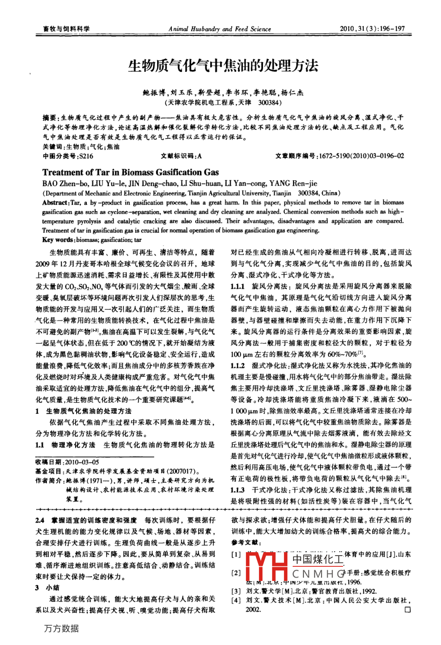 畜牧與飼料科學(xué)Animal Husbandry and Feed Science2010,31(3):196-19生物質(zhì)氣化氣中焦油的處理方法鮑振博,劉五樂,靳登超,李書環(huán),李艷聰,楊仁杰(天津農(nóng)學(xué)院機(jī)電工程系,天津300384)摘要:生物質(zhì)氣化過程中產(chǎn)生的副產(chǎn)物——一焦油具有極大危害性。分析生物質(zhì)氣化氣中焦油的旋風(fēng)分離、濕式凈化、干式凈化等物理凈化方法,論逑高溫?zé)峤夂痛呋呀饣瘜W(xué)轉(zhuǎn)化方法,比較不同焦油處理方法的優(yōu)、缺點(diǎn)及工程應(yīng)用。氣化氣中焦油處理是否有效是生物質(zhì)氣化氣工程得以正常運(yùn)行的保證。關(guān)鍵詞:生物質(zhì);氣化;焦油中圖分類號(hào):S216文獻(xiàn)標(biāo)識(shí)碼:A文章順序編號(hào):1672-5190(2010)03-0196-02Treatment of Tar in Biomass Gasification GasBAO Zhen-bo, LIU Yu-le, JIN Deng-chao, LI Shu-huan, LI Yan-cong, YANG Ren-jieDepartment of Mechanic and Electronic Engineering. Tianjin Agricultural University, Tianjin 300384, China)Abstract: Tar, a by-product in gasification process, has a great harm. In this paper, physical methods to remove tar in biomassgasification gas such as cyclone-separation, wet cleaning and dry cleaning are analyzed. Chemical conversion methods such as hightemperature pyrolysis and catalytic cracking are also discussed. Their advantages, disadvantages and application are comparedTreatment of tar in gasification gas is crucial for normal operation of biomass gasification gas engineering.Key words: biomass; gasification; ta生物質(zhì)能具有豐富、廉價(jià)、可再生、清潔等特點(diǎn),隨著對(duì)已經(jīng)生成的焦油從氣相向冷凝相進(jìn)行轉(zhuǎn)移、脫離,進(jìn)而達(dá)2009年12月丹麥哥本哈根全球氣候變化會(huì)議的召開,地球到與氣化氣分離,實(shí)現(xiàn)減少氣化氣中焦油的目的,包括旋風(fēng)上礦物質(zhì)能源迅速消耗、需求日益增長(zhǎng)、有限性及其使用中散分離、濕式凈化、干式凈化等方法。發(fā)大量的CO2SO2NO,等氣體而引發(fā)的大氣煙塵、酸雨、全球111旋風(fēng)分離法:旋風(fēng)分離法是采用旋風(fēng)分離器來脫除變暖、臭氧層破壞等環(huán)境問題再次引發(fā)人們深層次的思考生氣化氣中焦油,其原理是氣化氣沿切線方向進(jìn)入旋風(fēng)分離物質(zhì)能的開發(fā)與應(yīng)用又一次引起人們的廣泛關(guān)注,而生物質(zhì)器而產(chǎn)生旋轉(zhuǎn)運(yùn)動(dòng),液態(tài)焦油顆粒在離心力作用下被拋向氣化是一種常用的生物質(zhì)能轉(zhuǎn)換技術(shù),在氣化過程中焦油是器壁,與器壁碰撞和摩擦而失去動(dòng)能,在重力作用下沉降下不可避免的副產(chǎn)物焦油在高溫下可以發(fā)生裂解,與氣化氣來。旋風(fēng)分離器的運(yùn)行條件是分離效果的重要影響因素,旋起呈氣體狀態(tài)但在低于200℃的情況下就開始凝結(jié)為液風(fēng)分離法一般用于捕集密度和粒徑大的顆粒,對(duì)于粒徑為體成為黑色黏稠油狀物影響氣化設(shè)備穩(wěn)定、安全運(yùn)行造成100μm左右的顆粒分離效率為60%-70%0。能量浪費(fèi)降低氣化效率;而且焦油成分中的多核芳香族在凈1.12濕式凈化法濕式凈化法又稱為水洗法,其凈化焦油的化及燃燒時(shí)對(duì)環(huán)境及人類健康構(gòu)成嚴(yán)重危害。對(duì)氣化氣中焦機(jī)理主要是慢碰撞用水將氣化氣中的部分焦油帶走。濕法除油釆取適宜的處理方法,降低焦油在氣化氣中的組分提高氣焦主要用冷卻洗滌塔、文丘里洗滌塔、除霧器、濕靜電除塵器化氣質(zhì)量是生物質(zhì)氣化技術(shù)的一個(gè)重要研究課題“。等設(shè)備。冷卻洗滌塔能將重質(zhì)焦油冷凝下來,液滴在5001生物質(zhì)氣化焦油的處理方法1000μm時(shí),除焦油效率最高。文丘里洗滌塔通常連接在冷卻依據(jù)氣化氣焦油產(chǎn)生過程中采取不同焦油處理方法,洗滌塔的后面,可以將氣化氣中較重焦油物質(zhì)除去。除霧器是分為物理凈化方法和化學(xué)轉(zhuǎn)化方法。根據(jù)離心分離原理從氣流中除去煙霧液滴,能有效去除經(jīng)文L1物理凈化方法生物質(zhì)氣化焦油的物理轉(zhuǎn)化方法是丘里洗滌塔處理后氣化氣中的焦油和水。濕靜電除塵器的原理收稿日期:2010-0305是首先對(duì)氣化氣進(jìn)行冷卻使氣化氣中焦油微粒形成液體顆粒基金項(xiàng)目:天津農(nóng)學(xué)院科學(xué)發(fā)展基金資助項(xiàng)目(2007017然后利用高壓電場(chǎng),使氣化氣中液體顆粒帶負(fù)電,通過一個(gè)帶作者簡(jiǎn)介:鮑振博(1971—),男,講師,碩士,主要研究方向?yàn)闄C(jī)有正電荷的極性板,將帶負(fù)電荷的顆粒從氣化氣中除去。械結(jié)構(gòu)設(shè)計(jì)、農(nóng)村能源技術(shù)應(yīng)用、農(nóng)村環(huán)境污染處理1.13干式凈化法:干式凈化法又稱過濾法,其除焦油機(jī)理裝置。是將吸附性強(qiáng)的材料(如活性炭等)裝在容器中,當(dāng)氣化氣24掌握適宜的訓(xùn)練密度和強(qiáng)度每次訓(xùn)練時(shí),要根據(jù)仔欲與探求欲;增強(qiáng)仔犬體能和提高仔犬膽量。在仔犬隨后的犬生理機(jī)能的能力變化規(guī)律以及氣候、場(chǎng)地、器材等因素,訓(xùn)練中,能大大增加幼犬的訓(xùn)練合格率,提高犬的綜合能力。合理安排仔犬進(jìn)行訓(xùn)練。生理負(fù)荷曲線一般是從逐步上升參考文獻(xiàn):到相對(duì)平穩(wěn)然后逐步下降。因此要從簡(jiǎn)單到復(fù)雜從