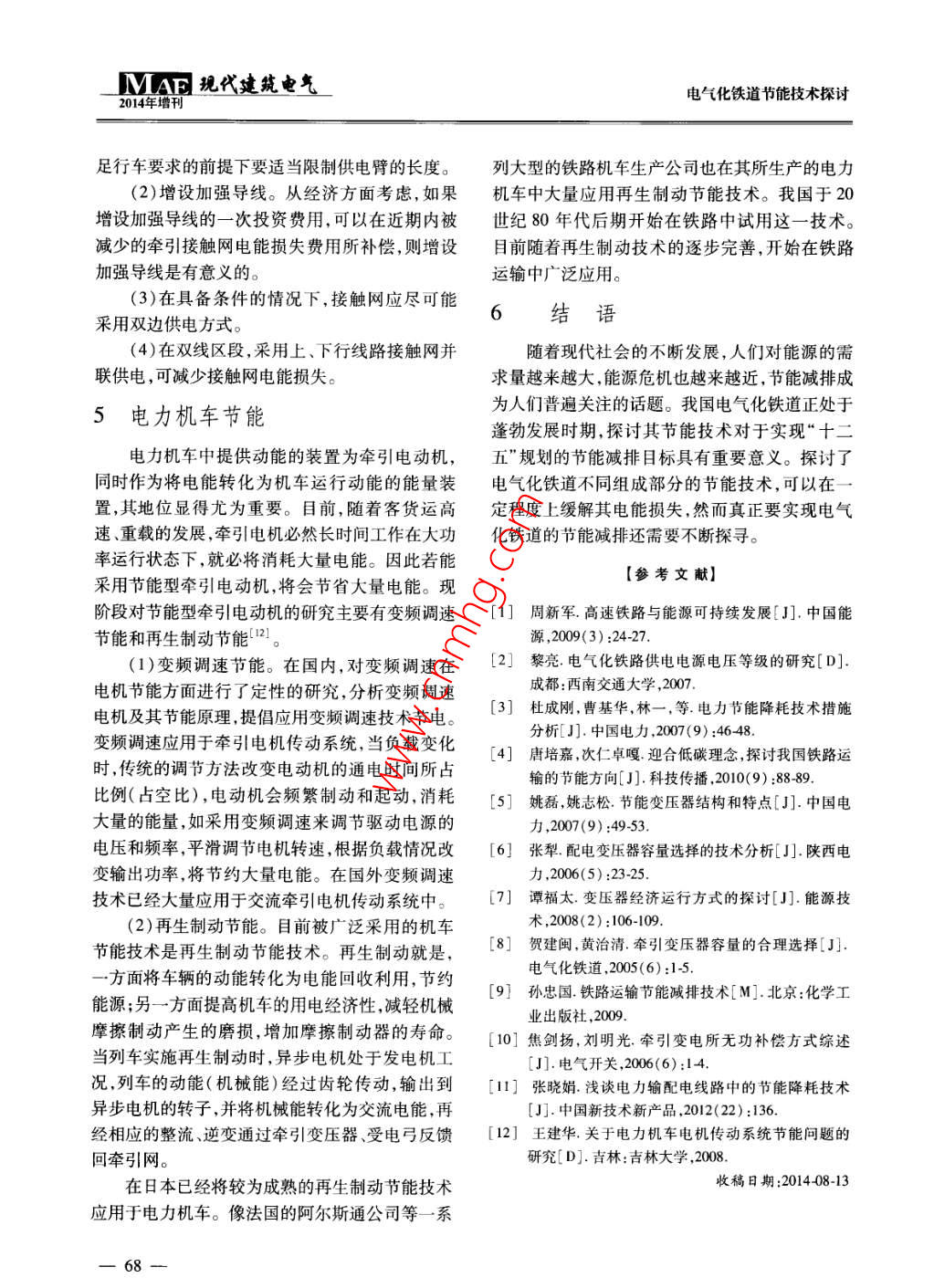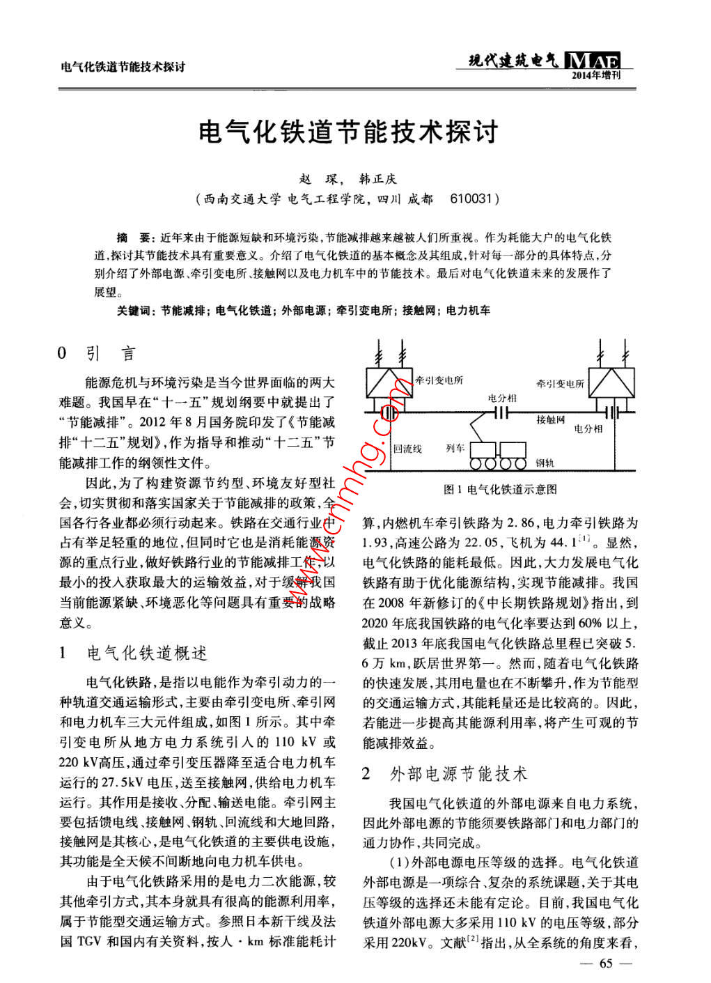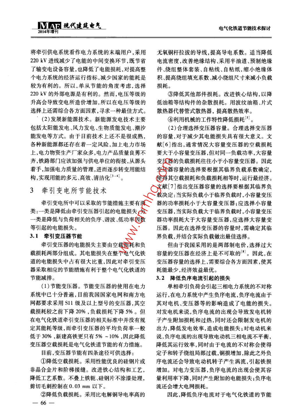 電氣化鐵道節(jié)能技術(shù)探討現(xiàn)代建筑電氣M AD2014年增刊趙琛,韓正慶(西南交通大學電氣工程學院,四川成都610031 )摘要: 近年來由于能源短缺和環(huán)境污染,節(jié)能減排越來越被人們所重視。作為耗能大戶的電氣化鐵道,探討其節(jié)能技術(shù)具有重要意義。介紹了電氣化鐵道的基本概念及其組成,針對每一部分的具體特點,分別介紹了外部電源、牽引變電所、接觸網(wǎng)以及電力機車中的節(jié)能技術(shù)。最后對電氣化鐵道未來的發(fā)展作了展望。關(guān)鍵詞:節(jié)能減排;電氣化鐵道;外部電源;牽引變電所;接觸網(wǎng);電力機車0引言上上能源危機與環(huán)境污染是當今世界面臨的兩大| 牽引變電所牽引變電所難題。我國早在“十一五”規(guī)劃綱要中就提出了電分相“節(jié)能減排”。2012年8月國務院印發(fā)了《節(jié)能減H4IH接觸網(wǎng)排“十二五”規(guī)劃》,作為指導和推動“十二五”節(jié)回流線列車能減排工作的綱領性文件。0060鋼軌因此,為了構(gòu)建資源節(jié)約型、環(huán)境友好型社圖1電氣化鐵道示意圖會,切實貫徹和落實國家關(guān)于節(jié)能減排的政策,全國各行各業(yè)都必須行動起來。鐵路在交通行業(yè)中算,內(nèi)燃機車牽引鐵路為2. 86,電力牽引鐵路為占有舉足輕重的地位,但同時它也是消耗能源資1.93 ,高速公路為22. 05,飛機為44.1"。顯然,源的重點行業(yè),做好鐵路行業(yè)的節(jié)能減排工作,以電氣化鐵路的能耗最低。因此,大力發(fā)展電氣化最小的投入獲取最大的運輸效益,對于緩解我國鐵路有助于優(yōu)化能源結(jié)構(gòu),實現(xiàn)節(jié)能減排。我國當前能源緊缺、環(huán)境惡化等問題具有重要的戰(zhàn)略在2008年新修訂的《中長期鐵路規(guī)劃》指出,到意義。2020年底我國鐵路的電氣化率要達到60%以上,截止2013年底我國電氣化鐵路總里程已突破5.電氣化鐵道概述6萬km,躍居世界第一。然而,隨著電氣化鐵路電氣化鐵路,是指以電能作為牽引動力的一的快速發(fā)展,其用電量也在不斷攀升,作為節(jié)能型種軌道交通運輸形式,主要由牽引變電所、牽引網(wǎng)的交通運輸方式,其能耗量還是比較高的。因此,和電力機車三大元件組成,如圖1所示。其中牽若能進一步提高其能源利用率,將產(chǎn)生可觀的節(jié)引變電所從地方電力系統(tǒng)引人的110 kV或能減排效益。220 kV高壓,通過牽引變壓器降至適合電力機車運行的27.5kV電壓,送至接觸網(wǎng),供給電力機車2外部電源節(jié)能技術(shù)運行。其作用是接收、分配、輸送電能。牽引網(wǎng)主我國電氣化鐵道的外部電源來自電力系統(tǒng),要包括饋電線、接觸網(wǎng)、鋼軌、回流線和大地回路,因此外部電源的節(jié)能須要鐵路部門和電力部門的接觸網(wǎng)是其核心,是電氣化鐵道的主要供電設施,通力協(xié)作,共同完成。其功能是全天候不間斷地向電力機車供電。(1)外部電源電壓等級的選擇。電氣化鐵道由于電氣化鐵路采用的是電力二次能源,較外部電源是一項綜合、復雜的系統(tǒng)課題,關(guān)于其電其他牽引方式,其本身就具有很高的能源利用率,壓等級的選擇還未能有定論。目前,我國電氣化屬于節(jié)能型交通運輸方式。參照日本新干線及法鐵道外部電源大多采用110 kV的電壓等級,部分國TGV和國內(nèi)有關(guān)資料,按人.km標準能耗計采用220kV。文獻[21指出,從全系統(tǒng)的角度來看,65 -MA現(xiàn)代建筑電氣電氣化鐵道節(jié)能技術(shù)探討2014年增刊將牽引供電系統(tǒng)看作電力系統(tǒng)的末端用戶,采用無氧銅桿拉拔的導線,提高導電系數(shù)。適當降低220 kV進線減少了電能的中間變換環(huán)節(jié),既節(jié)省電流密度,改善絕緣結(jié)構(gòu)、采用半油道、預制絕緣了輸變電設備容量,也降低了電能損耗,對提高整件、繞組整體套裝、自粘線、自粘紙,縮小絕緣體個電力系統(tǒng)的經(jīng)濟運行指標,減少國家的能耗是積、提高繞組填充系數(shù)、減小繞組尺寸來減小負載較為有利的。所以,單從節(jié)能的角度考慮,選擇損耗。220kV的外部電源是有利的。然而,電壓等級的③降低其他部件損耗。改進鐵心結(jié)構(gòu),以降升高會導致變電所造價增加,所以在電壓等級的低油箱等結(jié)構(gòu)件的雜散損耗。用波紋油箱、片式選擇上還需綜合各方面因素,尋求- -種最佳方式。散熱器代替管式散熱器,提高散熱效率。(2)發(fā)展新能源技術(shù)。新能源發(fā)電技術(shù)主要④利用機械的工作特性降低損耗[5]。包括太陽能發(fā)電、風力發(fā)電、生物質(zhì)能發(fā)電、潮汐(2)合理選擇變壓器容量。合理選擇變壓器能發(fā)電等方式。由于目前技術(shù)上還不是很成熟,的容量,對于減少其電能損失具有很大意義。文各種新能源都還存在著一定風險 ,加上電力市場獻[6]指出,通常情況大容量變壓器的空載損耗上,電力物資生產(chǎn)廠家眾多,電力產(chǎn)品質(zhì)量良莠不要大 于小容量變壓器,但對同- -負載功率,大容量齊,鐵路部門應該加強與供電單位的銜接,從源頭變壓器的負載損耗往往小于小容量變壓器。因此著手,加強電力質(zhì)量的管理,進而逐步轉(zhuǎn)變用能結(jié)變壓器容量的選擇要根據(jù)其臨界負載系數(shù)確定,構(gòu),實現(xiàn)用能的多元、高效、清潔化[3-4)。使得其空載損耗和負載