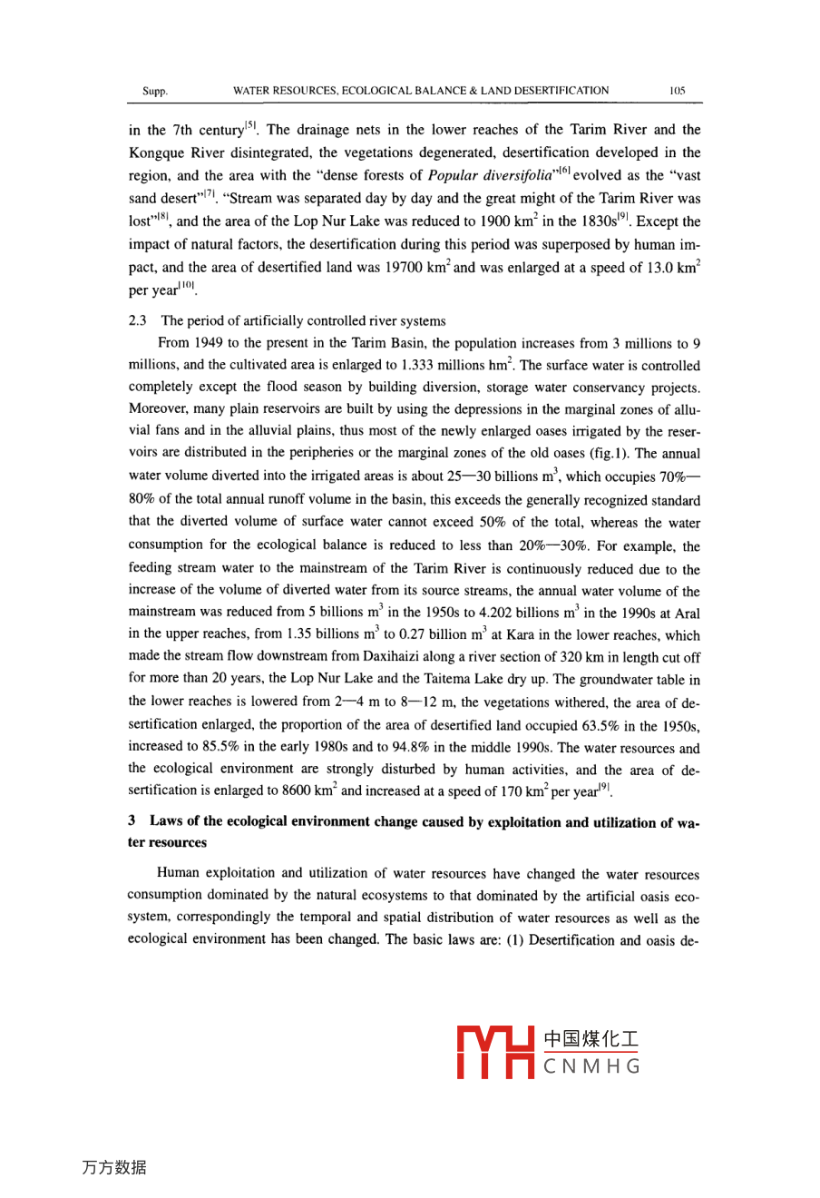 Vol. 45 Supp.SCIENCE IN CHINA (Series D)December 2002Utilization of water resources, ecological balance and landdesertification in the Tarim Basin, XinjiangFAN Zili (樊自立)", XIA Xuncheng (夏訓(xùn)誠)', SHEN Yuling (沈玉凌)',Alishir Kurban' (艾里西爾●庫爾班), WANG Ranghui (王讓會)',LI Shengyu (李生宇)' & MA Yingjun (馬映軍}1. Xinjiang Institute of Ecology and Geography, Chinese Academy of Sciences, Urumqi 830011, China;2. Xinjiang Remote Sensing Center, Urumqi 830011, ChinaReceived September 15, 2002Abstract Because of the human exploitation and tiliation of water resources in the Tarim Basin,the water resources consumption has changed from mainly natural ecosystem to artificial oasisecosystem, and the environment has changed correspondingly. The basic changes are: desertification and oasis development coexist, both "the human being advance and the desert retreat" and"the desert advance and the human being retreat" coexist, but the ltter is dominant. In the upperreaches, water volume drawing to irigated agricultural areas has increased, artificial oases havebeen enlarging and moving from the deltas in the lower reaches of many rivers to the piedmontplains. In the middle and lower reaches of the Tarim River, the stream flow has decreased, old 0a-ses have declined, natural vegetations have been degenerating, deserification has been enlarging,and the environment has deteriorated. The transition regions, which consist of forestlands, grass-lands and waters between the desert and the oases, have been decreasing continuously, theirshelter function to the oases has been weakened, and the desert is threatening the oases seri-ously.Key words: Tarim Basin, water resources, ecological balance, desertification.The Tarim Basin is an extremely arid land in the world. Its natural environment is character-ized by the basin surrounded by high mountains and the oases in the basin surrounded by the de-sert, the rivers rising in the alpine zone, and water being the key factor in the desert oasis ecosys-tem. Therefore, it is important to prevent and control deserification.1 Evolution trend of the ecological environment caused by human exploitation and utiliza-tion of water resourcesIn the Tarim Basin, there would be no agriculture without irigation. Since the beginning ofdevelopment of plant farm, the artificial oases have been developed by undertaking continuouslynew water conservancy projects and diverting water for irrigation, the ecological balance has beenchanged and rebuilt. In the processes, the change trends of the ecological environment caused by .exploitation and uilization of water resources are: (1) The natural rivers are replaced by the artifi-cial canals. The total length of the canals of dfferent levels in south Xinjiang is about 164500 km,and the annual volume of water diverted into the irrigated areas is 25.81 billions m', the artificial中國煤化工MYHCNMHGSupp.WATER RESOURCES. ECOLOGICAL BALANCE & LAND DESERTIFICATION .03imigation networks have formed, and many rivers have been replaced by the artificial canals in theplain, the steam flow in the middle and lower reaches is reduced and even cut off. (2) The naturallakes are replaced by the artificial reservoirs. In order to regulate the runoff and solve the problemof shortage of water in spring season, there are 184 reservoirs of dfferent size have been built, thetotal storage capacity is up to 3.21 bllion m', which exceeds the total storage capacity (1.34 bil-lion m) of the Lop Nur Lake and the Taitema Lake. Streams cannot reach the lower reaches be-cause of the reservoirs in the upper reaches, and the lakes in the lower reaches are dried up. (3)The natural soils are replaced by the artificial cultivated soils. The human beings change thephysical, chemical and biological properties of the natural soils by irigation, drainage, cultivation,fertilizing, and growing crops. For example, the peculiar irigation-deposited soil is formedthrough a long-term irmigation by the stream water with high silt content. (4) The natural vegeta-tions are replaced by the artificially planted plants. After reclamation, the natural desert vegeta-tions dominated by the desert species are replaced by artificial vegetations which include the ce-real, industrial and oil-bearing crops, green manure plants, herbage, melons, fruit trees, vegetablesand various artificial forests. The biomass of the artificial plants is ten or even hundred timeshigher than that of natural plants, however, their reversal resistance and adaptability to the envi-ronment are much lower than that of natural plants. (5) The natural ecosystem is replaced by theartificial oasis ecosystem. Through the human exploitation and utilization of water resources andagricultural development, the peculiar artificial oasis ecosystem has formed, which is supportedby the artificial water systems and coupled by the ecosystem of farmlands, artificial forests,breeding and aquiculture, rural and urban residential regions. Thus, some desert regions havechanged into the artificial oases that provide the bases for human existence and development inthe arid land.2 The relationship among the utilization of water resources, ecological balance anddesertification during the different periodsExploitation and utilization of water resources are historical processes, the distribution of theoases, ecological balance and desertification situation are different in the different historical peri-ods because of the different ways and degrees of exploitation and utilization. The history and thepresent situation of exploitation and utilization of water resources in the Tarim Basin can be clas-sified into the following periods:2.1 The period of natural river systemsAbout before the 6th century, the population was about 20000 in the Tarim Basin, more than20 small kingdoms, such as Loulan, Niya and Karadun, are ditributed on the deltas in the lowerreaches of the rivers' (fig. 1). Productive forces were ve