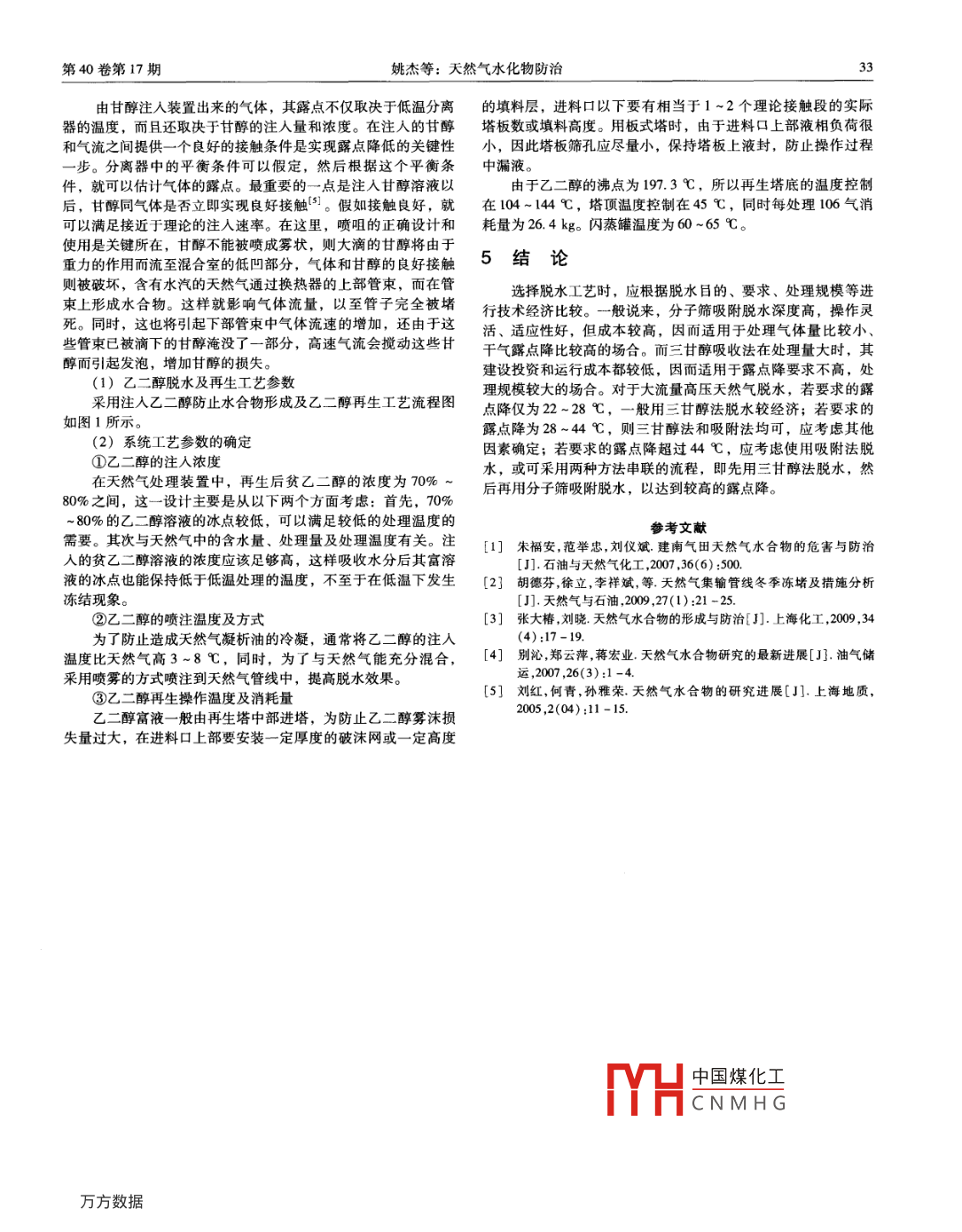 第40卷第17期廣州化工012年9月Guangzhou Chemical IndustrySeptember 2012天然氣水化物防治姚杰,黃風林',高長生2,胡艷峰2(1西安石油大學(xué),陜西西安710065;2中原油田分公司技術(shù)監(jiān)測中心,河南濮陽457001)摘要:天然氣脫水是管道安全輸送或進行輕烴回收前必不可少的環(huán)節(jié)。只有將天然氣中的水汽含量控制在工藝流程要求的范圍內(nèi),才能保證氣體輸送或冷凝分離法輕烴回收工藝的實施。本文詳細介紹了天然氣脫水工藝,并對比各種脫水工藝優(yōu)劣與使用條件關(guān)鍵詞:水化物;露點;分子篩;乙二醇;抑制劑中圖分類號:TQ914.1文獻標識碼:B文章編號:1001-9677(2012)17-0031-03Prevention and Control of Natural Gas HydrateYAO Jie, HUANG Feng-lin, GAO Chang -sheng, HU Yan-feng(1 Xi'an Petroleum University, Shaanxi Xian 7100652 Technical Monitor Center of Zhongyuan Oli Field, Henan Puyang 457001, China)Abstract: Natural gas dehydration was pipeline safety transportation and light hydrocarbon recovery before the essen-tial link. Only in the natural gas moisture content control in the process of the range of requirements, the gas or condensate separation method for light hydrocarbon recovery process was ensured. The dehydration process of natural gas was introduced in detail, and various dehydration technology advantages and disadvantages and conditions of use were compared.Key words: hydrate; dew point; molecular sieve; ethylene glycol; inhibitor表1氣體生成水合物的臨界溫度(℃)1水合物的形成及防止CrHs C3Hg iC4H1o nC4 H1oHaS1.1天然氣的水汽含量21.54.52.51.010.029.0天然氣的水汽含量取決于天然氣的溫度、壓力和氣體的組成等條件。水在天然氣中的溶解度是隨壓力升高或溫度降低而1.3水合物的防治降低,在一定的溫度和壓力條件下,天然氣中分子量較小氣體由于水合物是一晶狀固體物質(zhì),天然氣中一旦形成水合組分能和液態(tài)水形成水化物1。天然氣水化物是白色結(jié)晶固物,極易在閥門、分離器入口、管線彎頭及三通等處形成堵體,外觀類似松散的冰或致密的雪,密度為096-0.98g/cm3。塞,嚴重時影響天然氣的收集和輸送。從本質(zhì)上說,防止水化在水化物中,與氣體分子結(jié)合的水分子的結(jié)構(gòu)不是恒定的,這物的生成就是破壞水化物生成的相平衡條件。目前工業(yè)上防止與氣體分子的大小、結(jié)構(gòu)等因素有關(guān)。天然氣各組分的水合物天然氣水化物生成的主要措施可以歸納為三類3:加熱法、天分子的分子式為H20,C2H6·8H2O,C3H317H2Q,然氣脫水、注抑制劑法。iC4Hlo·17H2O,H2S·6H2O,CO2·6H2O,戊烷和己烷以上烴(1)加熱法類一般不形成水化物。提高天然氣節(jié)流前的溫度,或敷設(shè)平行于采氣管線的熱水1.2水合物的形成條件伴隨管線,使氣體流動溫度保持在天然氣的水露點以上,是防天然氣水合物形成的必要條件是2止水合物生成的有效方法。(2)天然氣中脫水(1)氣體處于水汽的飽和或過飽和狀態(tài)并存在游離水;使天然氣含水量低于某一標準值。(2)有足夠高的壓力和足夠低的溫度(3)注抑制劑法在具備上述條件時,水合物有時尚不能形成,還必須具有抑制劑的加入些輔助條件,如壓力的脈動,氣體的高速流動,因流向突變點,從而降低形成水中國煤化工低天然氣的露產(chǎn)生的攪動,水合物晶種的存在及晶種停留的特定物理位置如CNMHG彎頭、孔板、閥門、粗糙的管壁等2天然氣脫水水合物形成的臨界溫度是水合物可能存在的最高溫度,高于此溫度,不論壓力多高,也不會形成水合物。氣體生成水合2.1天然氣脫水方法物的臨界溫度如表1所列。天然氣脫水方法主要有:溶劑吸收法、固體干燥劑吸附廣州化工2012年9月法、冷凍分離法。用(1)溶劑吸收法3.2性能對比利用適當?shù)囊后w吸收劑以除去氣體混合物中的一部分水從表2列出的甲醇和乙二醇兩種抑制劑在相同條件下所作份,對吸收后的貧溶劑進行脫吸,使溶劑再生循環(huán)使用。常用的水合物形成溫度降實驗結(jié)果表明,質(zhì)量濃度相同的兩種抑制的脫水劑有二甘醇、三甘醇等劑,其效果是甲醇優(yōu)于乙二醇。(2)固體干燥劑吸附法利用氣體在固體表面上積聚的特性,使某些氣體組分吸附表2甲醇與乙二醇效果比較在固體吸附劑表面,進行脫除。氣體組分不同,在固體吸附劑甲醇上的吸附能力也有差異,因而可用吸附方法對氣體混合物進行φ/%摩爾分數(shù)yAt/%摩爾分數(shù)y△t凈化。工業(yè)上常用的固體吸附劑有硅膠、活性氧化鋁和分子0.02870.0150篩。吸附是在固體表面張力作用下進行的,根據(jù)表面張力的性100.05884.2100.0312質(zhì)可將吸附過程分為物理吸附和化學(xué)吸附。物理吸附是可逆過程,可用改變溫度和壓力的方法改變平衡方向,達到吸附劑的0.1941170.110再生。目前廣泛采用的用分子篩作吸附劑脫除天然氣中水分的0.272515.2過程就是物理吸附過程(3)冷凍分離法甲醇可用于任何操作溫度。由于甲醇沸點低蒸汽壓高,故將一定溫度的混合氣體在一定壓力下通過干燥的、最低漏更適用于較低的操作溫度,若在較高溫度下使用則蒸發(fā)損失較度可達-20℃以下的冷凝器,使混合氣體中的水氣變成液滴后大。一般情況下噴注的甲醇蒸發(fā)到氣相中的部分不再回收,液分離。常用的設(shè)備有冷凍干燥器。相水溶液經(jīng)蒸餾后可循環(huán)使用。是否需再生循環(huán)使用應(yīng)根據(jù)處2.2脫水劑理氣量和甲醇的價格等條件并經(jīng)技術(shù)經(jīng)濟分析論證