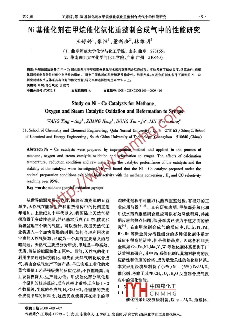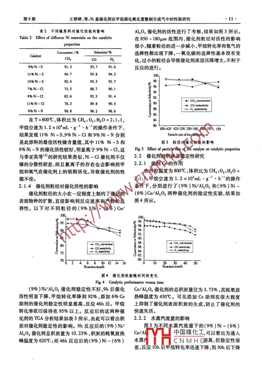 Ni基催化劑在甲烷催化氧化重整制合成氣中的性能研究
