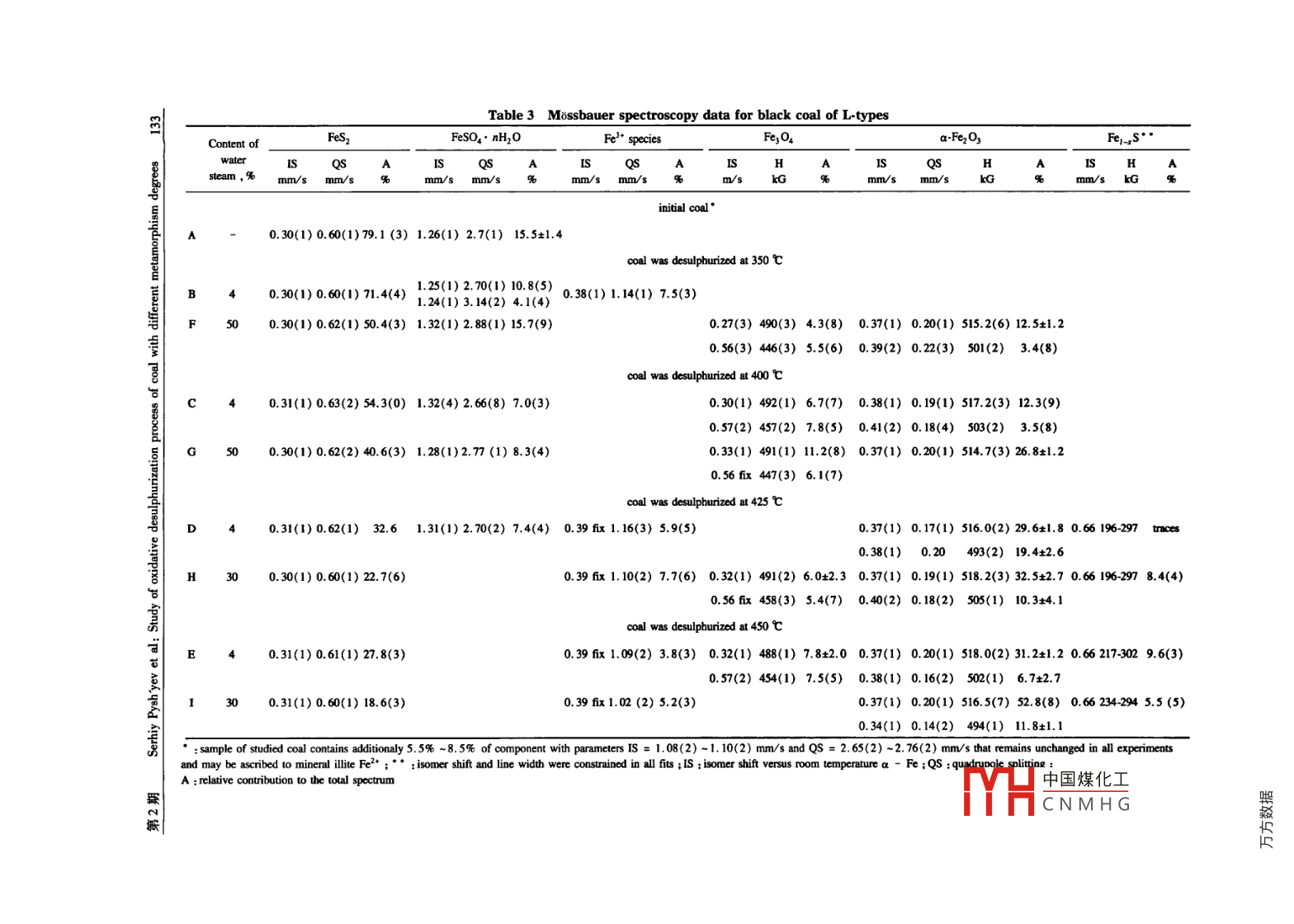 第40卷第2期燃料化學(xué)學(xué)報(bào)Vol 40 No. 2012年2月Journal of Fuel Chemistry and TechnologyFeb.2012文章編號(hào):0253-2409(2012)02012909Study of oxidative desulphurizationprocess of coal with different metamorphism degreesS PYSHYEV. V GUNKA Y PRYSIAZHNYI K SHEVCHUK. A PATTEK-JANCZYK(1. Institute of Chemistry and Chemical Technology, Lviv Polytecnic National University, St. Bandery 12, 79013 Laiv, Ukraine2. State Higher Vocational School in Tarnow, Mickiewicz 8, 33-100 Tarnow Poland)Abstract: The oxidative desulphurization process of coal with different metamorphism degrees treated by an air-steam mixture hasbeen studied. It has been shown that the pyrite present in black coal and anthracite is oxidized with the sulphur dioxide formationand the process chemical mechanism does not depend on the quality of organic matter. The medium-metamorphized coal, capable ofturning into a plastic state and cake in the range of investigated temperatures( 350-450 C), is desulphurized with the greatestdifficulty. The chemical mechanism dealing with the transformations of pyritic sulphur present in brown coal differs from similarprocesses taking place in black coal and anthracite, because Fes, is converted with hydrogen sulphide formation at desulphurizationKey words: oxidative desulphurization; organic matrix; pyrite; metamorphism degree; sulphurCLC number: TQ533 Document code AThe use of coal at heat power plants( HPPs)is stage in the two-staged coal burning at HPPs, andcomplicated because of the sulphur high present in the desulphurized coal can be seen as comprising thecoal. The burning of such a fuel leads to the so, second stage of burnemission into the atmospherePrevious studies(6-91 conducted on some coalNowadays SO2 emissions accompanied by smoke samples showed the effect of temperature and waterfumes decrease due to their sorption by potassium steam on the chemical mechanism of the coalompounds with the following gypsum obtaining. desulphurization process:However if we do not take into consideration theIt was observed that process intensification takesbenefits from the environmental protection, thanall place at 425 C and higher temperatures due to thethese desulphurization methods willmposition of pyrite to pyrrhotite and sulphur witheven if by-products( gypsum, dry ash, ammonium their following oxidationsulphate etc. )find an application"1-It was assumed that the addition of water steamMost of the other existing desulphurization to the air enhances the process due to the fact that themethods are either economically unprofitable or under steam may form complexes with pyrite, therebydevelopment. Thus, we may say that the efficient and increasing its reactivity. Water adsorption changes theprofitable industrial technology relating to so2 highest occupied molecular orbital HOMOemissions reduction for the combustion of high- characteristics of the surface, for instance, H2O to Fesulphur coal is absentions by electron donation. The resulting LUMO statesWe develop the technological basis of coal attributed to the orbitals in S2 dimers occurring in bulkpreventive desulphurization by using the oxidative can promote the surface reactionsmethod The essence of this process lies in theUsing data from 6-9, the scheme of the processselective oxidation of pyritic sulphur, which chemism was suggested( Figure 1)constitutes the main part of sulphur in the highOn the other hand. the authors( 3, 11, 12) showedlphur coall2-, by an air-steam mixture at 350- that coal organic matter(C)and its transformation450 C. The desulphurization products of black coal products(CO) may participate in reactions of pyriteand anthracite are solid fuel with a relatively low oxidation, Fes Fe-s) formation and itssulphur content, resin formed by partial transformationdecomposition of coal organic matter, andFeS,+C+H20- H2S+ Fes+ codesulphurization gases with a high content of so2FeS2+C→CS2+Fe(2)The latter may be used for the production of liquefied2FeS(Fe- S)+C- CS,+ 2Fe(3)concentrated So, by using known methods 101FeS2+CO→Fes+COSThe proposed process can be seen as the firstIt is well known that for coal treatment by waterReceived date: 2011-06-07: Recelved in revised form: 2011-09-21Corresponding author: Serhiy Pysh'yev( 1972-),male, Ph. D, associate professor, main凵中國(guó)煤化工mandhydrocarbon fuels, E-mail: gaja@ polyet. Viv. ua.CNMHG本文的英文電子版由Elsevier出版社在ScienceDirect上出版(hp://www.sciencedirect.com/science/joumal18725813)。130燃料化學(xué)學(xué)報(bào)第40卷steam or an air-steam mixture, the hydrogen may be on COM reactivity. Therefore, the followingformed due to the gasification reactions of the coal questions emerge:organic matrix COM ). Therefore, the pyriteAre black high-metamorphized and brown coalstransformation may be expressed by the following desulphurized in the same manner as the samplesequationsIn previous experiments?FeS2+H2→Fes+H2S(5)Is pyrite chemism the same for all types ofFes(Fe1S)+H2→Fe+H2S(6) black and brown coalPyrite hydration in accordance with EquationsThus, the aim of this work was to establish the5)and(6) is also possible due to atomic hydrogen. effect of COM on the oxidative desulphurizationAtomic hydrogen is formed by the compounds that are process and the dependence of the reaction rate andcapable of generating it during heating 3Jdirection of pyrite conversion on COM characteristicsThese experiments would allow a comparison of thFe, ( Sondesulphurization process of different types of coal andwill improve or refute the possibility of its application350℃for any type of coalith watercam1 ExperimentalsDAFoThe following samples of Ukrainian coal were425℃selectednvestigation: brown coal(B)from400℃Morozivskyy deposit of Dnieper brown-coal basinFecandle(C)from Buzanska mine of Lviv-VolynFe (SO4hcoal basin; gas coal (G)from Chervonograd mine ofFeSOFe, o.Lviv- Volyn coal basin; fat coal F1) fromSamsonovska concentrating m