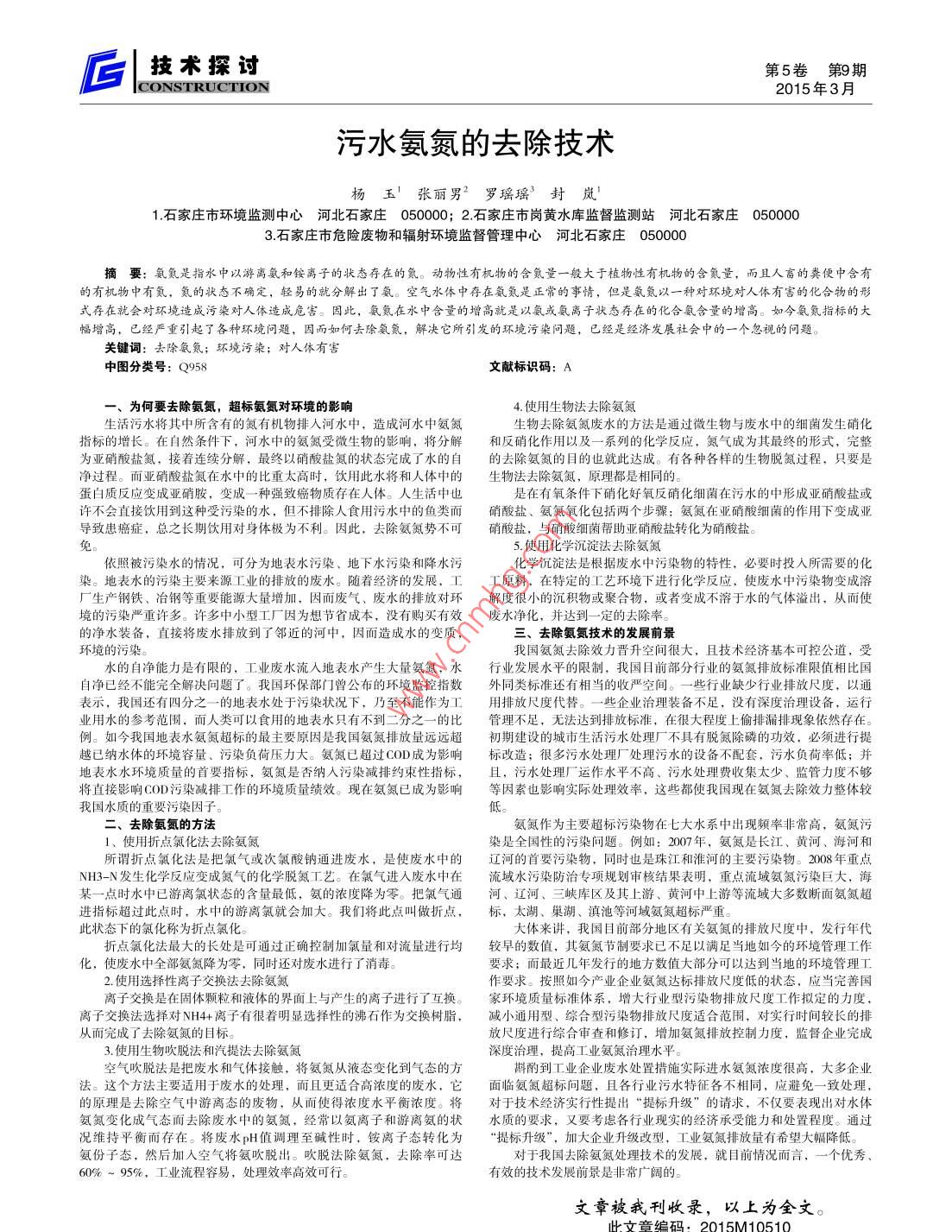 后l技術(shù)探討第5卷第9期CONSTRUCTION2015年3月污水氨氮的去除技術(shù)楊玉'張麗男2羅瑤瑤’封嵐1.石家莊市環(huán)境監(jiān)測(cè)中心河北石家莊050000;2.石家莊市崗黃水庫(kù)監(jiān)督監(jiān)測(cè)站河北石家莊0500003.石家莊市危險(xiǎn)廢物和輻射環(huán)境監(jiān)督管理中心河北石家莊050000摘要:氨氮是指水中以游離氨和銨離子的狀態(tài)存在的氮。動(dòng)物性有機(jī)物的含氪量一般大于植物性有機(jī)物的含氪量,而且人畜的糞便中含有」的有機(jī)物中有氮,氮的狀態(tài)不確定,輕易的就分解出了氨。空氣水體中存在氨氮是正常的事情,但是氫氪以一種對(duì)環(huán)境對(duì)人體有害的化合物的形式存在就會(huì)對(duì)環(huán)境造成污燊對(duì)人體造成危害。因此,氨氪在水中含量的増高就是以氨或氨離子狀態(tài)存在的化合氡含量的増高。如今氨氪指標(biāo)的大幅增高,已經(jīng)嚴(yán)重引起了各種環(huán)境問(wèn)題,因而如何去稌氨氮,解決它所引發(fā)的環(huán)境污染問(wèn)題,已經(jīng)是經(jīng)濟(jì)發(fā)展社會(huì)中的一個(gè)忽視的問(wèn)題。關(guān)鍵詞:去除氡氪;環(huán)境污染;對(duì)人體有害中圖分類號(hào):Q958文獻(xiàn)標(biāo)識(shí)碼:A、為何要去除氨氮,超標(biāo)氨氮對(duì)環(huán)境的影響4.使用生物法去除氨氮生活污水將其中所含有的氮有機(jī)物排入河水中,造成河水中氨氮生物去除氨氮廢水的方法是通過(guò)微生物與廢水中的細(xì)菌發(fā)生硝化指標(biāo)的增長(zhǎng)。在自然條件下,河水中的氨氮受微生物的影響,將分解和反硝化作用以及一系列的化學(xué)反應(yīng),氮?dú)獬蔀槠渥罱K的形式,完整為亞硝酸鹽氮,接著連續(xù)分解,最終以硝酸鹽氮的狀態(tài)完成了水的自的去除氨氮的目的也就此達(dá)成。有各種各樣的生物脫氮過(guò)程,只要是凈過(guò)程。而亞硝酸鹽氮在水中的比重太高時(shí),飲用此水將和人體中的生物法去除氨氮,原理都是相同的蛋白質(zhì)反應(yīng)變成亞硝胺,變成一種強(qiáng)致癌物質(zhì)存在人體。人生活中也是在有氧條件下硝化好氧反硝化細(xì)菌在污水的中形成亞硝酸鹽或許不會(huì)直接飲用到這種受污染的水,但不排除人食用污水中的魚類而硝酸鹽、氨氮氧化包括兩個(gè)步驟:氨氮在亞硝酸細(xì)菌的作用下變成亞導(dǎo)致患癌癥,總之長(zhǎng)期飲用對(duì)身體極為不利。因此,去除氨氮?jiǎng)莶豢上跛猁},與硝酸細(xì)菌幫助亞硝酸鹽轉(zhuǎn)化為硝酸鹽。5.使用化學(xué)沉淀法去除氨氮依照被污染水的情況,可分為地表水污染、地下水污染和降水污化學(xué)沉淀法是根據(jù)廢水中污染物的特性,必要時(shí)投入所需要的化染。地表水的污染主要來(lái)源工業(yè)的排放的廢水。隨著經(jīng)濟(jì)的發(fā)展,工工原料,在特定的工藝環(huán)璄下進(jìn)行化學(xué)反應(yīng),使廢水中污染物變成溶廠生產(chǎn)鋼鐵、冶鋼等重要能源大量増加,因而廢氣、廢水的排放對(duì)環(huán)解度很小的沉積物或聚合物,或者變成不溶于水的氣體溢出,從而使境的污染嚴(yán)重許多。許多中小型工廠因?yàn)橄牍?jié)省成本,沒有購(gòu)買有效廢水凈化,并達(dá)到一定的去除率的凈水裝備,直接將廢水排放到了鄰近的河中,因而造成水的變質(zhì)三、去除氨氮技術(shù)的發(fā)展前景環(huán)境的污染我國(guó)氨氮去除效力晉升空間很大,且技術(shù)經(jīng)濟(jì)基本可控公道,受水的自凈能力是有限的,工業(yè)廢水流入地表水產(chǎn)生大量氨氮,水行業(yè)發(fā)展水平的限制,我國(guó)目前部分行業(yè)的氨氮排放標(biāo)準(zhǔn)限值相比國(guó)自凈已經(jīng)不能完全解決問(wèn)題了。我國(guó)環(huán)保部門曾公布的環(huán)境監(jiān)控指數(shù)外同類標(biāo)準(zhǔn)還有相當(dāng)?shù)氖諊?yán)空間。一些行業(yè)缺少行業(yè)排放尺度,以通表示,我國(guó)還有四分之一的地表水處于污染狀況下,乃至不能作為工用排放尺度代替。一些企業(yè)治理裝備不足,沒有深度治理設(shè)備,運(yùn)行業(yè)用水的參考范圍,而人類可以食用的地表水只有不到二分之一的比管理不足,無(wú)法達(dá)到排放標(biāo)準(zhǔn),在很大程度上偷排漏排現(xiàn)象依然存在。例。如今我國(guó)地表水氨氮超標(biāo)的最主要原因是我國(guó)氨氮排放量遠(yuǎn)遠(yuǎn)超初期建設(shè)的城市生活污水處理廠不具有脫氮除磷的功效,必須進(jìn)行提越已納水體的環(huán)境容量、污染負(fù)荷壓力大。氨氮已超過(guò)COD成為影響標(biāo)改造;很多污水處理廠處理污水的設(shè)備不配套,污水負(fù)荷率低;并地表水水環(huán)境質(zhì)量的首要指標(biāo),氨氮是否納入污染減排約束性指標(biāo),且,污水處理廠運(yùn)作水平不高、污水處理費(fèi)收集太少、監(jiān)管力度不夠?qū)⒅苯佑绊慍OD污染減排工作的環(huán)境質(zhì)量績(jī)效?,F(xiàn)在氨氮已成為影響等因素也影響實(shí)際處理效率,這些都使我國(guó)現(xiàn)在氨氮去除效力整體較我國(guó)水質(zhì)的重要污染因子低去除氨氮的方法氨氮作為主要超標(biāo)污染物在七大水系中出現(xiàn)頻率非常高,氨氮污1、使用折點(diǎn)氯化法去除氨氮染是全國(guó)性的污染問(wèn)題。例如:2007年,氨氮是長(zhǎng)江、黃河、海河和所謂折點(diǎn)氯化
