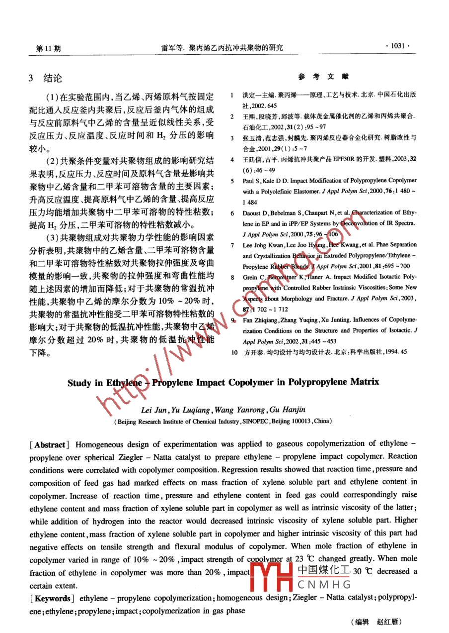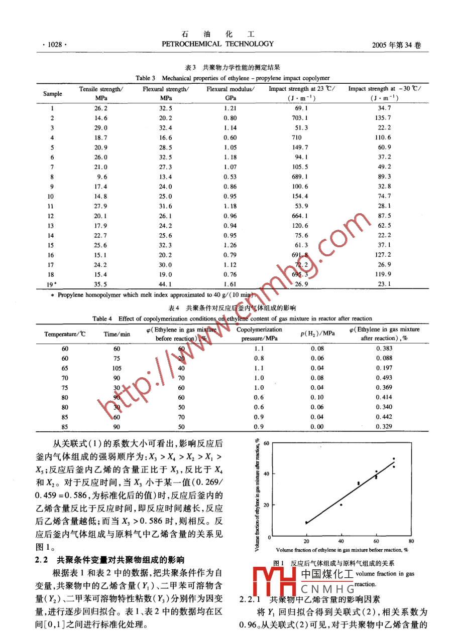 石油化工PETROCHEMICAL TECHNOLOGY2005年第34卷第11期研究與開發(fā)聚丙烯乙丙抗沖共聚物的研究雷軍,于魯強(qiáng),王彥榮,谷漢進(jìn)(中國石油化工股份有限公司北京化工研究院,北京10013[摘要]運用均勻設(shè)計法對乙烯-丙烯氣相共聚進(jìn)行實驗設(shè)計,將反應(yīng)條件與聚丙烯乙丙抗沖共聚物(簡稱共聚物)的組成進(jìn)行關(guān)聯(lián)。實驗結(jié)果表明反應(yīng)壓力反應(yīng)時間原料氣中乙烯含量對共聚物中的乙烯含量、二甲苯可溶物含量有顯著影響;提高反應(yīng)溫度原料氣中乙烯含量或反應(yīng)壓力共聚物中的二甲苯可溶物的特性粘數(shù)增加提高氫氣分壓,二甲苯可溶物的特性粘數(shù)減小;提高共聚物中的乙烯含量、二甲苯可溶物含量或二甲苯可溶物特性粘數(shù),共聚物的拉伸強(qiáng)度和彎曲性能降低;共聚物中的乙烯摩爾分?jǐn)?shù)為10%-20%時,共聚物的常溫抗沖性能變化較大;共聚物中的乙烯摩爾分?jǐn)?shù)超過20%時,共聚物的低溫抗沖性能有所下降。[關(guān)鍵詞]乙烯-丙烯共聚;均勻設(shè)計法; Ziegler-Nama催化劑;聚丙烯;乙烯;丙烯;抗沖;氣相共聚[文章編號]1000-8144(2005011-1026-06[中圖分類號]TQ316文獻(xiàn)標(biāo)識碼]A聚丙烯乙丙抗沖共聚物(簡稱共聚物)具有良助劑、外給電子體、H2和丙烯單體按一定比例加人好的抗沖性能,一般情況下共聚物的抗沖性能主要到反應(yīng)器中,升溫至70℃,聚合時間1h;第二段反應(yīng)隨共聚物中乙烯含量的增加而增強(qiáng)但也與乙烯在前先將第一段未反應(yīng)的丙烯單體排出反應(yīng)器,加入共聚物中的分布形式等因素有關(guān)6;共聚物的剛定量H2,然后向反應(yīng)器中通入一定配比的乙烯丙烯性則隨共聚物中乙烯含量的增加而下降。因此,開原料氣進(jìn)行氣相聚合。固定第一段實驗條件,控制反發(fā)抗沖性能和剛性好的(即剛韌平衡性能好的)共應(yīng)生成熔體流動指數(shù)為40g/(10min)的均聚物,改聚產(chǎn)品是提高共聚物性能的關(guān)鍵9。變第二段實驗條件,考察共聚物的各項性能。生產(chǎn)共聚物一般采用兩段反應(yīng),首先進(jìn)行丙烯1.3均勻設(shè)計方案均聚,然后進(jìn)行乙烯-丙烯共聚??紤]到影響共聚第二段的實驗條件:反應(yīng)溫度60~85℃、反應(yīng)物性能的因素很多,若采用全排列方法逐一進(jìn)行考時間60~105min、混和氣中乙烯的體積分?jǐn)?shù)為察,實驗量太大。因此,本工作采用均勻設(shè)計法對乙20%~70%、共聚壓力0.6-1.1MPa、H2分壓0烯-丙烯氣相共聚(簡稱共聚)進(jìn)行實驗設(shè)計,并采0.LMPa采用5因素6水平的均勻設(shè)計表Uls用逐步回歸的方法關(guān)聯(lián)得到反應(yīng)條件與共聚物組成(181)進(jìn)行實驗方案的設(shè)計,具體方案見表1的關(guān)系進(jìn)一步分析共聚物力學(xué)性能的影響因素,為1.4共聚物的分析測試生產(chǎn)共聚物尋找最佳的工藝操作條件提供參考。采用 Nicolet儀器公司的 Magna-IR760型紅外光譜儀測定共聚物中乙烯的含量,以丁基化羥基1實驗部分甲苯(BHT)穩(wěn)定過的四氫萘為溶劑,在135℃時測1.1原料定共聚物的特性粘數(shù);按照ISO10350-1的方法測己烷:化學(xué)純使用前經(jīng)分子篩干燥;助劑三乙定共聚物中二甲苯可溶物的含量;按照GB1040基鋁(AEt3)(濃度為0.5mo/L的己烷溶液):遼陽2000的方法測定共聚物的拉伸強(qiáng)度;按照ASTM化纖公司化工三廠;外給電子體環(huán)己基-甲基D790的方法測定共聚物的彎曲強(qiáng)度和彎曲模量;按甲氧基硅烷( CHMMS):進(jìn)口;催化劑:高效球形照 ASTMD25的方法測定共聚物的od沖擊強(qiáng)度;Ziegler-Nata催化劑,北京化工研究院;乙烯、丙按照GB/T3682-200的方法,采用意大利 CEAST烯:聚合級;氫氣:高純氫;氮氣:高純氮。乙烯、丙中國煤化工烯、氮氣氫氣在使用前經(jīng)進(jìn)一步的脫水和脫氧處理。[收稿CNMHG2005 -08-101.2聚合方法[作者簡介]雷軍(1979-),男湖南省郴州市人,碩土生,電話聚合反應(yīng)在5L不銹鋼釜中間歇進(jìn)行,聚合過010-64216131-263,電郵jm@bni,acn。聯(lián)系人:于魯強(qiáng),程分兩個階段:第一段為液相丙烯均聚,將催化劑、電話00-64216131-2618電郵y@bi.ac.cn第11期雷軍等.聚丙烯乙丙抗沖共聚物的研究1027公司的7027型熔體流動速率儀測定共聚物的熔體在上述實驗條件下,共聚物組成的測試結(jié)果見流動指數(shù)。表2,共聚物力學(xué)性能的測試結(jié)果見表3表1共聚Uls(181)的方案設(shè)計Table 1 Homogeneous design of UIs(18)copolymerization experimentsTime/ mino( Ethylene in gas mixture). Copolymerization pressure/MPa P(H2)/MPa10587005690000000000000001010181810.0400001001234560005558055900050101070600000000.100.02表2共聚物組成的測試結(jié)果Table 2 Composition of ethylene-propylene impact copolymerx( Ethylene ),w( Soluble fraction[g(10min)-1]fraction in xylene/(mL.g "15.29161.4920.30.04l3.815.2234.66204.8513.3418.2710.3617.4623.17173.6437.044227.721015.8913.1622.65206.41I125.977.9980.731125.92253.151316.2117.3928.92151.01145.3718.34112.4219.5115.6927.9423.8614.658230.002結(jié)果與討論共聚條件及反應(yīng)后釜內(nèi)氣體組成的測試結(jié)果見表4。2.1反應(yīng)過程中反應(yīng)蓋內(nèi)氣體組成的變化將共聚條件作為自變量,反應(yīng)后釜內(nèi)乙烯的體共聚時將一定配比的乙烯、丙烯原料氣通入到積分?jǐn)?shù)(Y)作為因變量,進(jìn)行逐步回歸,得到關(guān)聯(lián)式反應(yīng)釜中,隨著反應(yīng)的進(jìn)行,由于乙烯丙