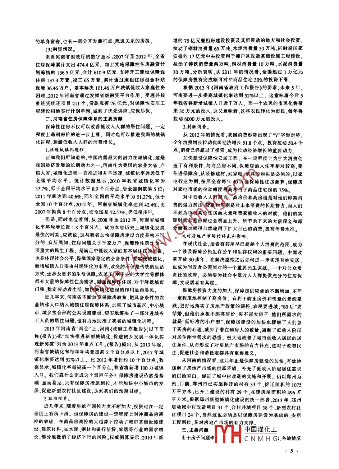 .第26卷第2期河南廣播電視大學(xué)學(xué)報(bào)Vol. 26, No.22013年4月Joumal of Henan Radio & TV UniversityApr. 2013河南省住房保障體系的總體評價(jià)(河南廣播電視大學(xué),鄭州450008)摘要: 基于多種考慮,保障性住房政策正在逐步成為國家穩(wěn)定房地產(chǎn)市場、改善中低收入群體福利的關(guān)鍵調(diào)控手段,河南省住房保障體系多年來取得了一定的成就,但也存在一些問題。下一步,如何利用市場手段破解保障房的融資難題,如何讓保障性住房的分配更公平、公開等應(yīng)該成為我們研究的重點(diǎn)課題。關(guān)鍵詞:保障性住房;低收入群體;融資中圈分類號: C913.31文獻(xiàn)標(biāo)識碼: A文章編號: 1671-2862(2013)02 -00 -03過去三十年,在中國經(jīng)濟(jì)快速發(fā)展的背景下,房價(jià)也不斷對象資格進(jìn)行嚴(yán)格審查;加強(qiáng)對保障性住房的動(dòng)態(tài)管理,實(shí)現(xiàn)飆升,刺激了房地產(chǎn)市場的不良增長.加大了住宅保障的難度及時(shí)退出。和壓力。尤其是2013年樓市調(diào)控“新國五條"出臺后,根據(jù)規(guī)定,特別是在當(dāng)前世界經(jīng)濟(jì)低迷.我國外部發(fā)展環(huán)境復(fù)雜嚴(yán)地級以上城市要把符合條件的外來務(wù)工人員納人當(dāng)?shù)刈》勘>那闆r下,扎實(shí)推進(jìn)保障房建設(shè),對于擴(kuò)大內(nèi)需,保持經(jīng)濟(jì)障范圍。鄭州市很快將這一一政策精神貫徹下去,在廉租房對象平穩(wěn)較快發(fā)展具有獨(dú)特的重要作用。河南省住房保障體系多應(yīng)保盡保的基礎(chǔ)上,公租房覆蓋面擴(kuò)大到城鎮(zhèn)常住人口,包括年來取得了一定的成就,但也存在一些問題。新就業(yè)職工和來鄭務(wù)工人員。-、 河南省住房保障體系現(xiàn)狀2.建設(shè)和供給現(xiàn)狀。統(tǒng)計(jì)調(diào)查顯示,目前河南全省已審批的申請保障房的城來自河南省住房和城鄉(xiāng)建設(shè)廳的資料顯示,2007-2012市低收入家庭有52.62萬戶,符合廉租房住房條件的有6.8萬年,河南省開工建設(shè)保障性住房137.3萬套,竣工65萬套。戶,其中,省轄市2.86萬戶.縣級市3.94萬戶。人均住房面積2013年將新開工建設(shè)保障性住房40萬套,竣工30萬套,把8平方米以下的有8個(gè)市,分別是開封、許昌、漯河、平頂山、具備條件的農(nóng)業(yè)人口納人城鎮(zhèn)住房保障體系。南陽、商丘駐馬店、信陽等;人均住房面積8~10平方米的有(1)主要類型。7個(gè)市.分別是新鄉(xiāng)、安陽焦作鶴壁、濮陽、三門峽、周口等;眾所周知,多年來,我國的保障性住房主要包括三種:經(jīng)人均住房面積10~12平方米以下的有3個(gè)市,分別是鄭州、濟(jì)適用房、廉租房和公共租賃住房。但是由于經(jīng)濟(jì)適用房具有洛陽、濟(jì)源。在河南住房保障方式多以租賃補(bǔ)貼為主,租金補(bǔ)產(chǎn) 權(quán)性質(zhì),在運(yùn)作中就產(chǎn)生了很多的尋租空間,因此專家們一貼標(biāo)準(zhǔn)各地也各不相同,從全省來看,補(bǔ)貼最高的是鄭州,為直在呼吁保障房應(yīng)以租賃保障為主,產(chǎn)權(quán)保障為輔。就河南省每人每月60元;補(bǔ)貼最低的是開封.焦作等市,每人每月30的情況看 ,也是如此。2013年伊始,鄭州正式取消了經(jīng)濟(jì)適用元(數(shù)據(jù)來源于河南統(tǒng)計(jì)年鑒)。房,同時(shí),將對廉租房和公租房進(jìn)行并軌建設(shè),實(shí)現(xiàn)了“三房合1.采取的政策和總體思路。-”。 這將有利于把有限的保障房建設(shè)資金集中起來.逐步建為加快發(fā)展公共租賃住房,切實(shí)解決城市中等偏下收入立“以租為主”的住房保障體系。家庭和外來務(wù)工人員、新就業(yè)職工的住房困難問題,推進(jìn)河南(2)建設(shè)和供給情況。城鎮(zhèn)化快速健康發(fā)展,近年來,河南省多次出臺了關(guān)于保障性2012年,河南全省保障性安居工程新開工量為41.69萬住房的政策建議和意見。套,實(shí)際分解落實(shí)860個(gè)項(xiàng)目、43.6萬套,完成責(zé)任目標(biāo)的2011年年初,省政府出臺了《河南省人民政府關(guān)于加快107%;基本建成22.5萬套,完成投資410億元。2013年,全省發(fā)展公共租賃住房的意見》。在這個(gè)意見中明確提出,今后要保障性住房建設(shè)目標(biāo)為開工40萬套,基本建成30萬套。即使把公共租賃住房作為保障房建設(shè)的重點(diǎn)。是這樣,網(wǎng)絡(luò)調(diào)查數(shù)據(jù)仍然顯示,58.9%的網(wǎng)友認(rèn)為目前河南2012年初, <河南省2012年保障性安居工程建設(shè)工作方的公租房、廉租房的建設(shè)跟不上百姓需求,即供給不足。案>(以下簡稱<方案>》)出臺,<方案>明確,河南省保障性住房究其原因,主要是這些開工建設(shè)的保障性住房并不能完建設(shè)資金主要來自財(cái)政性資金和社會(huì)投資兩個(gè)渠道。對于保全進(jìn)人保障房供應(yīng)鏈最終通過“正規(guī)”渠道流向市場的房源障性住房的分配,(方案》要求要確保分配公開透明;對申請不足整體的60%"。余下的40%里面包含了一部分企業(yè)職工中國煤化工收稿日期:2013-03-16作者簡介:曲俊鋒,女,河南鄭州人,碩士,河南廣播電視大學(xué)講師,研究方向:MHCNMHG又相當(dāng)復(fù)雜,因此.保障房建設(shè)在實(shí)際過程中出現(xiàn)了很多問題。裂、樓板漏水、使用“瘦身鋼筋"等問題,在鄭州甚至出現(xiàn)過正在展開的保障房建