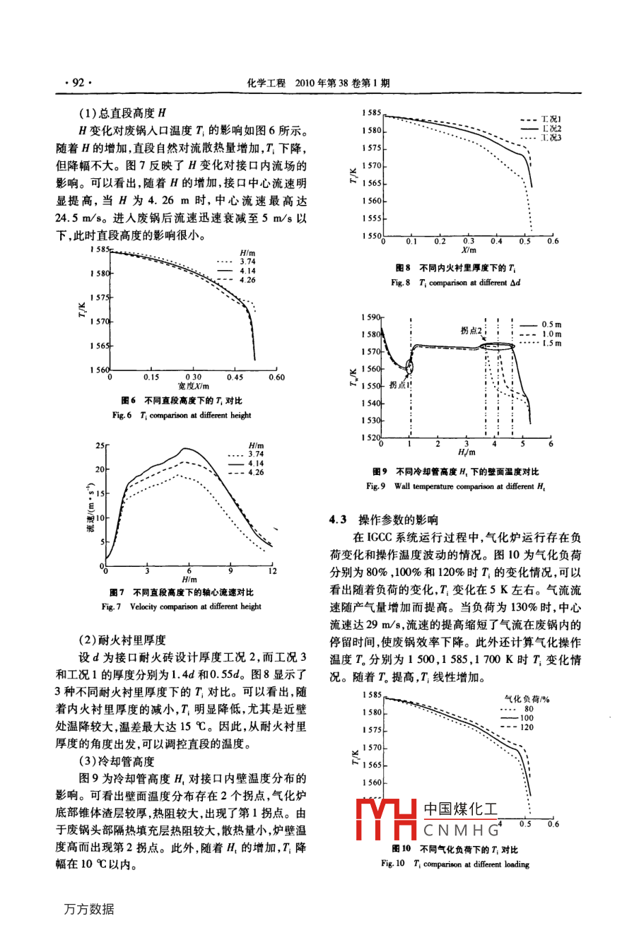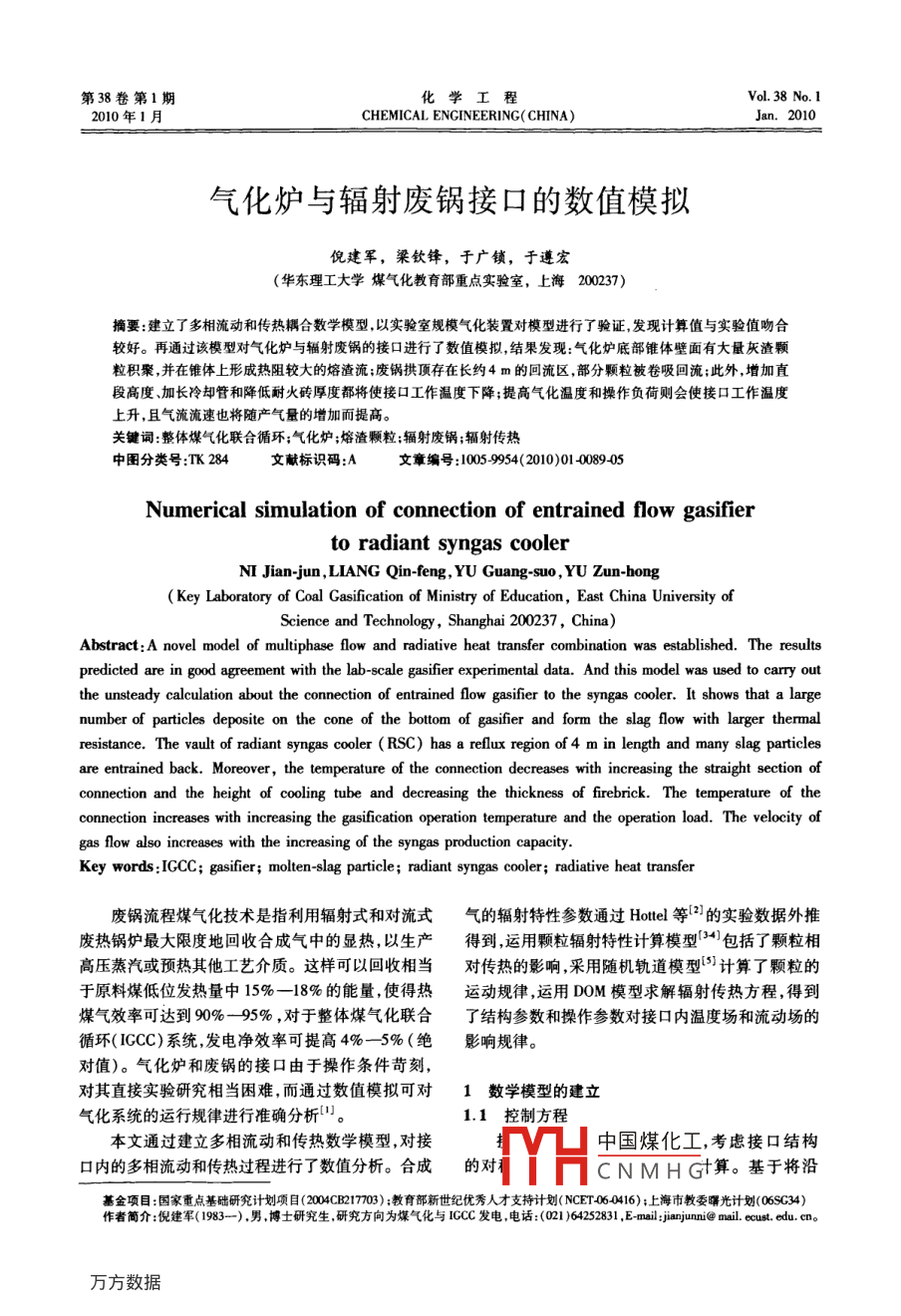 第38卷第1期化學(xué)工程Vol.38No.I.2010年1 月CHEMICAL ENGINEERING( CHINA)Jan. 2010氣化爐與輻射廢鍋接口的數(shù)值模擬倪建軍,梁欽鋒,于廣鎖,于遵宏(華東理工大學(xué)煤氣化教育部重點(diǎn)實(shí)驗(yàn)室,上海200237)摘要:建立了多相流動(dòng)和傳熱耦合數(shù)學(xué)模型,以實(shí)驗(yàn)室規(guī)模氣化裝置對(duì)模型進(jìn)行了驗(yàn)證,發(fā)現(xiàn)計(jì)算值與實(shí)驗(yàn)值吻合較好。再通過(guò)該模型對(duì)氣化爐與輻射廢鍋的接口進(jìn)行了數(shù)值模擬,結(jié)果發(fā)現(xiàn):氣化爐底部錐體璧面有大量灰渣顆粒積聚,并在錐體上形成熱阻較大的熔渣流;廢鍋拱頂存在長(zhǎng)約4 m的回流區(qū),部分顆粒被卷吸回流;此外,增加直段高度、加長(zhǎng)冷卻管和降低耐火磚厚度都將使接口工作溫度下降;提高氣化溫度和操作負(fù)荷則會(huì)使接口工作溫度上升,且氣流流速也將隨產(chǎn)氣量的增加而提高。關(guān)鍵詞:整體煤氣化聯(lián)合循環(huán);氣化爐;熔渣顆粒;輻射廢鍋;輻射傳熱中圖分類號(hào):TK 284文獻(xiàn)標(biāo)識(shí)碼:A文章編號(hào):1005-9954(2010)01 4089-05Numerical simulation of connection of entrained flow gasifierto radiant syngas coolerNI Jian-jun, LIANG Qin-feng, YU Guang-suo, YU Zun-hong( Key Laboratory of Coal Gasification of Ministry of Education, East China University ofScience and Technology , Shanghai 200237, China)Abstract:A novel model of multiphase flow and radiative heat transfer combination was established. The resultspredicted are in good agreement with the lab-scale gasifier experimental data. And this model was used to carry outthe unsteady calculation about the connection of entrained flow gasifier to the syngas cooler. It shows that a largenumber of particles deposite on the cone of the bottom of gasifier and form the slag flow with larger thermalresistance. The vault of radiant syngas cooler (RSC) has a reflux region of4 m in length and many slag particlesare entrained back. Moreover, the temperature of the connection decreases with increasing the straight section ofconnection and the height of cooling tube and decreasing the thickness of frebrick. The temperature of theconnection increases with increasing the gasification operation temperature and the operation load. The velocity ofgas flow also increases with the increasing of the syngas production capacity.Key words :IGCC; gasifler; molten. slag particle; radiant syngas cooler; radiative heat transfer廢鍋流程煤氣化技術(shù)是指利用輻射式和對(duì)流式氣的輻射特性參數(shù)通過(guò)Hottel等[2]的實(shí)驗(yàn)數(shù)據(jù)外推廢熱鍋爐最大限度地回收合成氣中的顯熱,以生產(chǎn)得到,運(yùn)用顆粒輻射特性計(jì)算模型[34)包括了顆粒相高壓蒸汽或預(yù)熱其他工藝介質(zhì)。這樣可以回收相當(dāng)對(duì)傳熱的影響,采用隨機(jī)軌道模型[5]計(jì)算了顆粒的于原料煤低位發(fā)熱量中15% -18%的能量,使得熱運(yùn)動(dòng)規(guī)律,運(yùn)用DOM模型求解輻射傳熱方程,得到煤氣效率可達(dá)到90%- 95% ,對(duì)于整體煤氣化聯(lián)合了結(jié)構(gòu)參數(shù)和操作參數(shù)對(duì)接口內(nèi)溫度場(chǎng)和流動(dòng)場(chǎng)的循環(huán)( ICCC)系統(tǒng),發(fā)電凈效率可提高4%- -5%(絕影響規(guī)律。.對(duì)值)。氣化爐和廢鍋的接口由于操作條件苛刻, .對(duì)其直接實(shí)驗(yàn)研究相當(dāng)困難,而通過(guò)數(shù)值模擬可對(duì)1數(shù)學(xué)模型的建立氣化系統(tǒng)的運(yùn)行規(guī)律進(jìn)行準(zhǔn)確分析”。.1.1 控制方程本文通過(guò)建立多相流動(dòng)和傳熱數(shù)學(xué)模型,對(duì)接中國(guó)煤化工,考慮接口結(jié)構(gòu).口內(nèi)的多相流動(dòng)和傳熱過(guò)程進(jìn)行了數(shù)值分析。合成fHCNMHGt算。基于將沿基金項(xiàng)目:國(guó)家重點(diǎn)基礎(chǔ)研究計(jì)劃項(xiàng)自(000C217703) ;教育部新世紀(jì)優(yōu)秀人才支持計(jì)劃( NCET:060416);上海市教委曙光計(jì)劃(06SC34)作者簡(jiǎn)介:倪建軍(1983--) .男,博士研究生,研究方向?yàn)槊簹饣cICCC發(fā)電,電話:(021 )64252831 ,Email:jaijunni@ mail. ecust. edu. cn。●90●化學(xué)工程2010年第38卷第1期壁熔融態(tài)流渣與合成氣流作為某種連續(xù)介質(zhì),且對(duì)氣流夾帶顆粒運(yùn)動(dòng)的建模中采用隨機(jī)軌道有質(zhì)量分?jǐn)?shù)25%的灰分以顆粒形式被氣流夾帶模型,離散相是通過(guò)積分拉氏坐標(biāo)系的顆粒作用的假設(shè),建立了接口內(nèi)氣液固三相系統(tǒng)的傳熱流力微分方程求解顆粒的軌道,顆粒作用力平衡方動(dòng)過(guò)程的數(shù)學(xué)模型。由于氣液二相在流動(dòng)過(guò)程程為15)中沒(méi)有發(fā)生相互滲透,因而本文采用流體體積法dup=F,(u-u)+6:(Pe -P)+F(3)(VOF)多相流模型進(jìn)行模擬,不可壓湍流采用標(biāo)ltP準(zhǔn)k-8模型[6]:式中:F為附加加速度項(xiàng);Fp(u-u,)為單位質(zhì)量顆a(pk) + a(pku.)品[(4+共)驗(yàn)]+粒的曳力項(xiàng),其中Fp=18 CgRe Re。pd,|u。-u.x;ρ。d 24Gq+G, -pe-Yy+S; .(1)g為重力加速度;Pp為顆粒密度;C為曳力系數(shù);upa(e) + a(pau:)[(μ+5)三] +為顆粒速度;d,為顆粒直徑。x:1.2 介質(zhì)輻射模型C號(hào)(G +C2.G)-C2p∈+S。(2)采用Hotel(2J)的圖表法結(jié)合修正公式計(jì)算介質(zhì)式中:模型常數(shù)C。=1.44,C2 =1.92,σ=1.0,的輻射特性參數(shù),采用合成氣中的CO2和H2O為主σ。=1.3;C3為模型變量;G;,G,分別為平均速度梯要熱輻射介質(zhì),其典型體積分?jǐn)?shù)分
