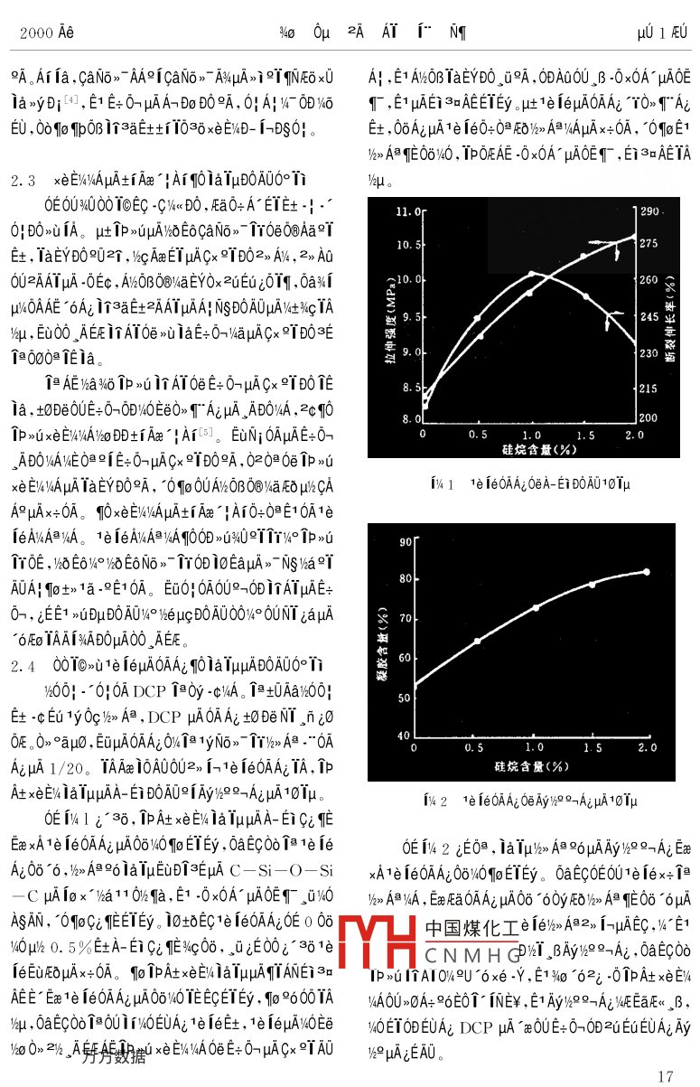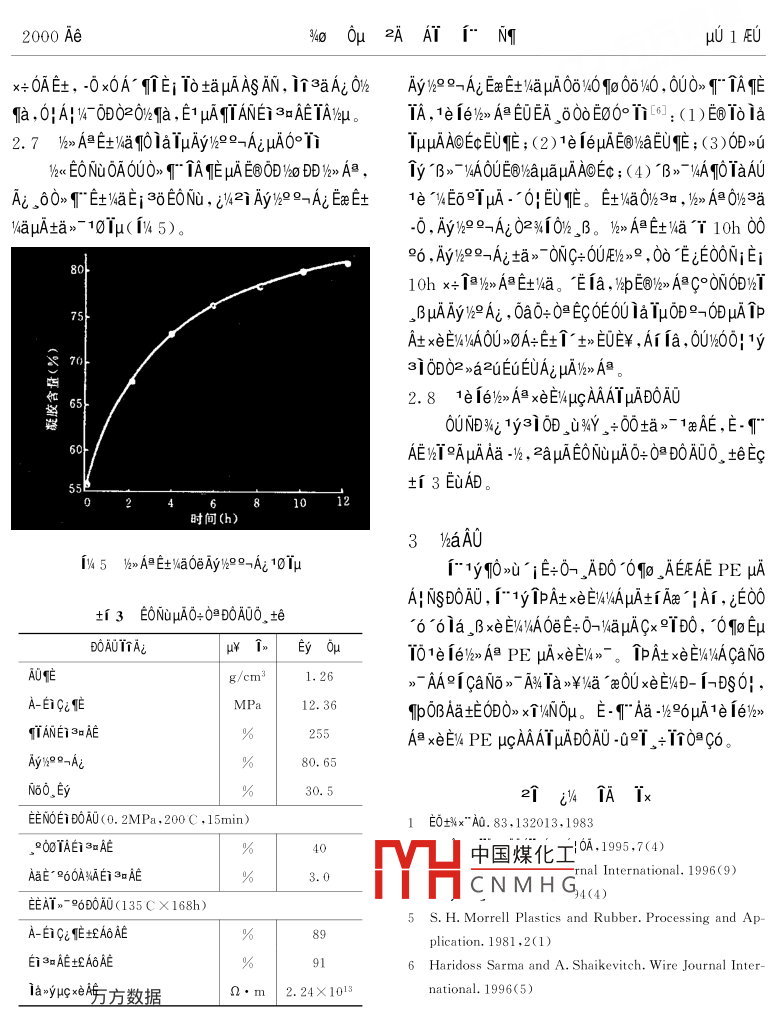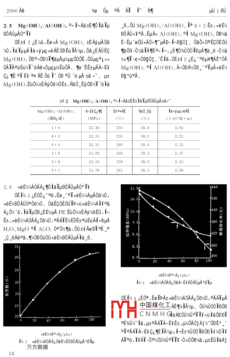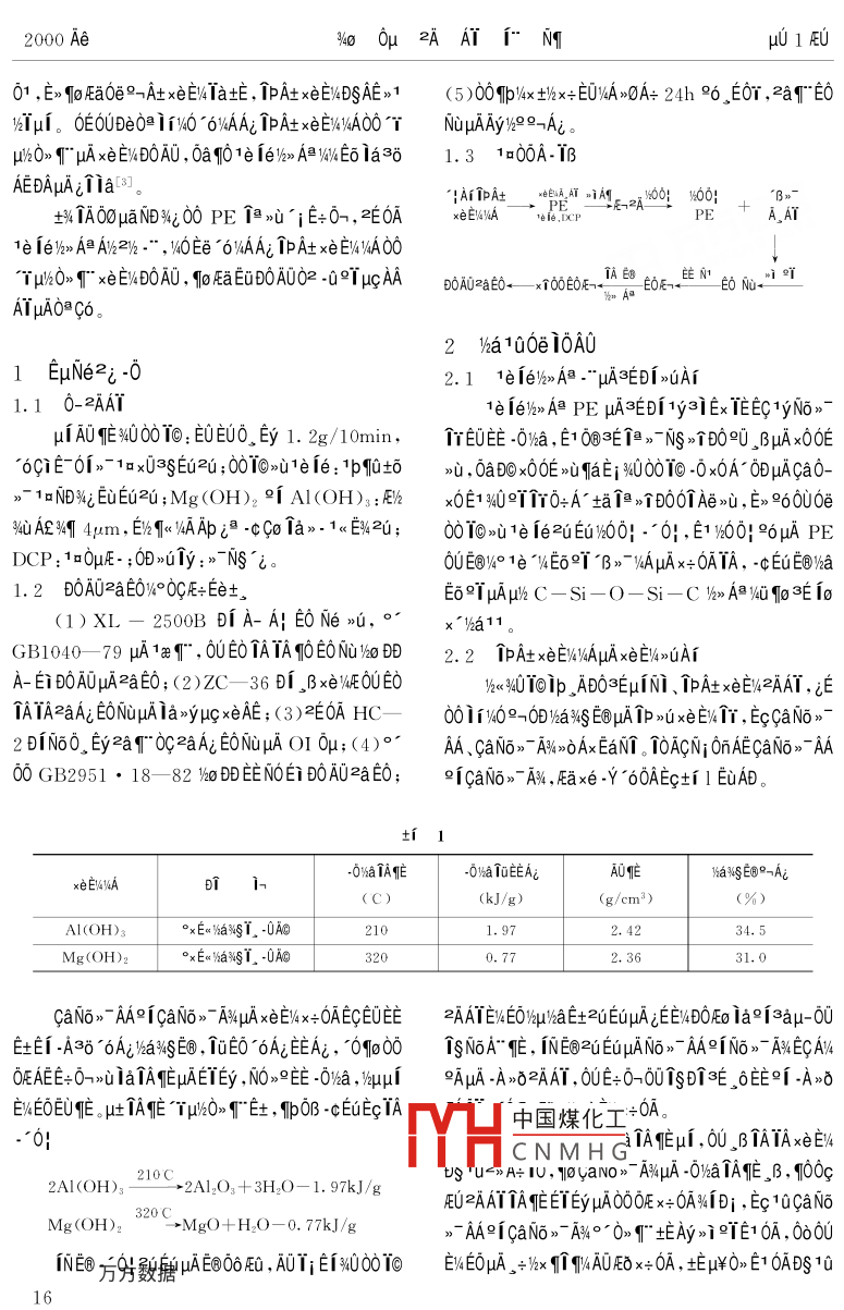 2000 Ae%o .0μ?2AAT1°NTμ01EU1e 1e/2>> A膽xeE/490T@ipucAAAIμAND%i0ATOON 9《O%49< Ta 061p仙t0A1o”6N82AAT i;ENg0e1c3iNg09 (150040)δ≌0a veEOAE 1e 1e9%》A膽ipAt xei% 1aTμ。≈DOAOμA0°Ti 0OE0. r 1y r0Faxe E4DOA0 ,A-自BA0QTWeμgD0AOμuAzaE0, μuμ%°AμA ip At xENWIA Mg(OH)2 0e Al(OH)s Aa坨, i~"1yE+0-. ADO° xEWyAμAfAxe |Ai , E1 DprliATOeE+0-TaEYD0ia, βB,μAμ6h2°ADOAOμAx∈EliaTμ。D“E V>axw00T0 3o0μAT 1e/>A@ 1PA+xeE/4 N6O ,EyC° NO10Eu2dEet。00 T010N0DETqucAA3S、,2%“ AY3400010(PE >μA1%》AV/AEGEC PE ADOμA00E/kμcAA3gAN}4OTE96°2x° AEOa00Eet.。。0≌Eq↑0@0》。/>A@96μA PE εET0Ooμ0ia ,BAI0E0U0010- 0010>i1e ie 1240EC00 PE》.W30;A! e ANDOAO%O .BATAμAA;NsDOA0,2c.0DOF士。 ,1EEuAOE.t£khT. ,BμA iE,iE+0Aa。AEFaxU°TD0A0。3Q000μA1/> A@ 1"3E0DEy0O0E001yNo》roy -CVA -δa2uEuμA"E@E+0!”.-k-",μ00> 00EC%T3EEi μA0D>u1yNo》- T/6> A膽02 >uts%AayAE 1yNo,"介-0a2DAδAγμA1UE%,- ,A00A1yNo>-T1a1OxOE >u00.cμA PE -0“66μ0ia, BAE/%> A膽PE μuAμG4o0μD0AU。.Aμcx0%a C- C 149°T;μψqp0Os -000膽. , ECOAAAAT3yEEOAOUμf N1 μcAAμADE0i a, aEEOA0U.BAEaTBOy -C x0OE >uDi≤∈, AaEOU1yNo>~個(gè)ODN1 μcAA。0c10 BP 1<《E%4、 EO+%EyAa0i》-、AA00-c PE uμA1%>A@ ,0, ECOoOB C- C /4GDT3∈EC0U10 UCC 1< E%μE IE 96 1E361e ie 12301rμgAAV6aKS∈EOμa00TA;μ0Ey00e1elEe)}>A@." ,(>Ax ioAT。1010EA "ucAA3g、AT2yμcAA3SμEON}x0a00ECC-Si- -O- Si- C T3∈μAEy T-Ac iaa11,zAAT0A0U%U i0%o 0μμgAA、;OOEμc IBμE 2uE-μuA印叫。y> A@TAqE02u10U%$ iaE0ua。3400010@AATμAN60_ Ey 18 x600, E6OxE%41e 1el12 Aw0001000 -.0Ey00-/6-" :(1)AVz2l22AAT , 0U0D ia2i0- >0AU2;1E0TE士,XLPE uc“" ,4 Sioplas. E - ;(2)0>2%.-" , Ec Monosil.AA9UEYOx -cEEV4EO。uc TBμcAAO》μuO -cEu>00,R ."°9/2TDAμA CTM( iOEDyx3-");(3)12340.%[3∈Tewδ00μA”<2¥FA- 9oE1>000AO"6。@AE-"%“0A00T0>i1e 1e0e00T000.-0!, 312360,E10| .1 100》-cEuμA>δ0O ,E1 Eeε∈S%uμhxiDi ,Yh0%,00D0.u1e i6%u0E: (00000*0*00 E@AeA- 。+162, TOUC.CApAxDAt2/2 " EC0EAA1 Dow Corning 1< E%/%<<陽(yáng)>u%元,00F∪Eμ10 ,BxeE/4>。Eae xA1e 1e/%> AB)AMNEOμA1eE0 TAAo>- Tδ6° μA>i1%60- Ai0! OApuhk60Toip4U0| 0AE0Oe1a 9, 1e ie/> A膽PE μcAAμAxeE%402叫-0|。1978 AeEoEz Maillefer 1 2)-",EuEC)k< PE y°中國(guó)煤化工howa μuc TBμgAA10/-3600.2ucAA,MHCNMH G", E0t%EyAa01n- 1iE3δE路100%40μ¥, 0yEeμA000E%TEU ,0DuIN1 μgAA%4uxeE/4%41 LINKLON- ST- 0640L 1e le 1240EE0A。A-"EL2uuA1e fe/)>> A≌μcAAEDIpZ1E-38TrμcIBAT ,No6. Ey T 28[2]。μ1AAxeE%》C+ E氏, IBAAxeE%ONOEOx 2uEuTlp 1000uA 10A書努數(shù)騙1《E%、EEi BUSS 1 9o Fa0e9-AxENTaE , ipAt xeEWDSAE>1 (5 )01p:/x thx+E0%A>0A+ 24h 96。Eσr , 2aT"EOvIu1。OE6UDEO 1i%0 6%AAi ipA+xeEV%/A00T NuμAyo∞Ai。μ/kO》1 μA xeE&DOAO , 0aq01e ie%k> A1/E6 1a381.3 1a00A-1BAEDAμAi↑ia[8]。IAliPA+_. *的 1A1 zq:00! w00:°B》一土%1AO0μaNWi0 PE @》U^ iE+0-, zE0AxEI%1NA1e1e,DCPPE. A_AT1e 1e/k> AA1%z2)z ." ,40Ee“6%AAi 1pAt x∈EV%A00TμkO。xeEW4DOA0 ,9o AaEvDOA0O2 -02TμcAAB0AOzaEO←xr00EOE-1AE8 ehe_ ENATμA0@C6。2 Vha100e 10A01 EμN(yùn)e2; -02.1 1e 1el/>》> A旦. μA3EDi >UA11.1 0-2AAY1e 1e16》> A膽PE μA3∈Df1y3iEx IEEC1yNo》-μi A0作40010: E0EUO、Ey 1. 2g/10min, .YEOEE -0%a , E1 0@3E i@>-Ns >個(gè)D090_ BμA x0OE6CiE- 61>-1x03∈Eu2c ;00@>i1e ie : 1p怕坑》, 0a DC x0OE >uTaEi w400010 -0 x0A- ODμAca0-》1aND%i EuEG2U ;Mg(OH)2 2[ Al(OH):Elzx0E1 94U≌9Y0+A-坦T@>TD0TAe>u, E> 96000e%4u AE%T 4μm, E)2 Ti1e 1e2iEu%0O! .”0|,E1 %600! °6μA PEDCP:1oOμE-;D>u1y:>~NS i。0UE@V%° 1e °V4E69T^B>~yAμAx+ 6ATA, -c EeuE⑨Ya1.2 D0AU2aEO%°0GE∈Ee+,E6°TμAμhC-Si- O- Si-C /<>> A@YQqIo3E io(1)XL- 2500B Di A- A! E0 Ne >,?!眡"a11。GB1040- 79 uA1ae9" , 0UE0 TATA9O EONu/%o2.2 ipA+xeE'%AμAxE/>UAIA- Ei B0AOμAzaE0;(2)ZC- 36 Di。βxEWEOUEO1%ui 4UT01p_ ADO3∈μINi、iPAtxeE:2AAT,ETATA2aAi EONuμAIaxyμcxeAE ;(3)2E0A HC一001/09-0/a%$ E@μAIp >uxeE%1T,EccaNo>-2 D1N6O, Ey2a0c2aAi EONuμA OI 0μ;(4)°AA、CaN6>- A%》>OAxEaNT。T0ACN; 0nAECaNo>- AA00 GB2951●18- 82 )DEENOEi BOAUzaE; eicaNo>" Aw,總x伯.Y 60AEc+f 1 EuAD。ti 1-0aTAE-0aTEEAiAO惟YaNS∈@°一AiBi(C)(kJ/g)(g/cm")(%)Al(OH)z°xEwawgT. -0Ao2101.972.4234.5Mg(OH)2°xEuaxζT, -0AG .3200.772. 3631.0CaNo>- AA9iCaNo>-A%μAxeE%4x+OAECEUEE2AATEWεOψμuμWa∈←2uEuμAξEE%4DOEo ia9[3aμ-00EtEf -A3δ 6Aia%$E@ , ToEO'6AiEEAi, 6091o00 TSN6A" 帕, INE@ZUEUμANo> AA9INo》> AKECAVA0OEAEE+O->uiaTAnEμAETEy ,NO>9EE -0%a , 6uμAμA -A>0ZAAT, 0∪∈+0→001SD°3∈_ 6E9f -A>0 .EWEOEUE. u吐TAE Tμu6O≥"土, Tbp0B -cEuEcTA中國(guó)煤化工A。."0!MHCNMH G_i TAmEμi ,0U, BTAIAxeEV210Cus "u≈A+ IU, 10yaNo》AWμA -O%aTAmE, ,B , 9100c2AI(OH)3→2Al2O3+ 3H2O- 1. 97kJ/gEUZAATTAqEETEyμA00OE x+0A%ID; , Ec10CaNo .Mg(OH):320C: →MgO+ H2O - -0. 77kJ/g》- AA9icaN6>" A%00> T" EAy>ieTE1 0A, 000N@方分殿愈AE@06FQ , A0Ti E[Nw00T0EWEOμA。+)hx TwAUE x+0A, fEμ$O>E1 0ADS10162000 Ae%o .0μ?2AAT1°NTμu 1EUA。Ai fa,caN6》- AA9icaNo>- A%μA>i °qNEoxUA| ,E1 AtxOB TaEYDO ,u9A, 0A0OL B -0x0A μAOEla>yDi[4,E1 E+ 0-→μAA-Do D0A, 0! A|- D%6.「,E1μAEi3=AEEIEy。μ1e ieμuAOAAi T0》T"Ai印U , 0o1 IpOB liaEtti 1038xeE%D- 1-DS0|。E士,0δAεμA1e 1e0+0≌E0%》> AyAμAx+0A, OoE11/%》 A@TE06%0 , IPOEAE -0x0A- μAOECT , Ei3aAETA2.3 x∈E)%1AμAtiAx "qArqOia IμD0A00°階μu。0EOU3000T●EC -C%/<< D0 , AaO+A~ET+-|"11. or1 2900| DO>吣1A。μ1p >uμAw6E6CaN6> r0e0@Aa°T10.5275社, TaEYDO902個(gè), yxcAaEYμACx °TD02> AN%, 2> A06U≥AATμA -δEc ,AzOBO@WaEYOx 2uEuz0Tq ,0axT10. 0260uμ%4OAAE“6Ai isaE+2AATμAA! NSDOAOμAN+%cTA9.5|245:yu, Et00 AERE i∩AT0e >心iaE+O→/NaμAGx≌°DO≈∈↑@000@ TEia。9.0230 I但AE )aw6 Tp >咱i個(gè)AT0eE+ 0→μACx≌TDOi∈8.21ia, tODEOUE+O-ODy4OEeO> T AiμA_ ADOvA,2cq .J 201p >xEI%A4o0D士iAxe Ai[6]。 EuN; 0AμAE+0→0.51.1.52.0硅烷含量(%)jADONAVEO≌fE+0→μACx 9"D0eA, 020 0e PpuxeEI/NAμA IaEY DO, 0910UA%OBO@NaFEOμl%GA141 1e 1eOAA;0eA- Ei D0A0101μA9μAx+0A。qOxEV%xAμAti Axe' Ar0:0@E10A1e1eANAsyA。1e 1eANA@yA900>UqU9TTT%° IP咱U90OE , lkδE6W∞%DE6N6> 00 ioEaμA>- Ns版T30A