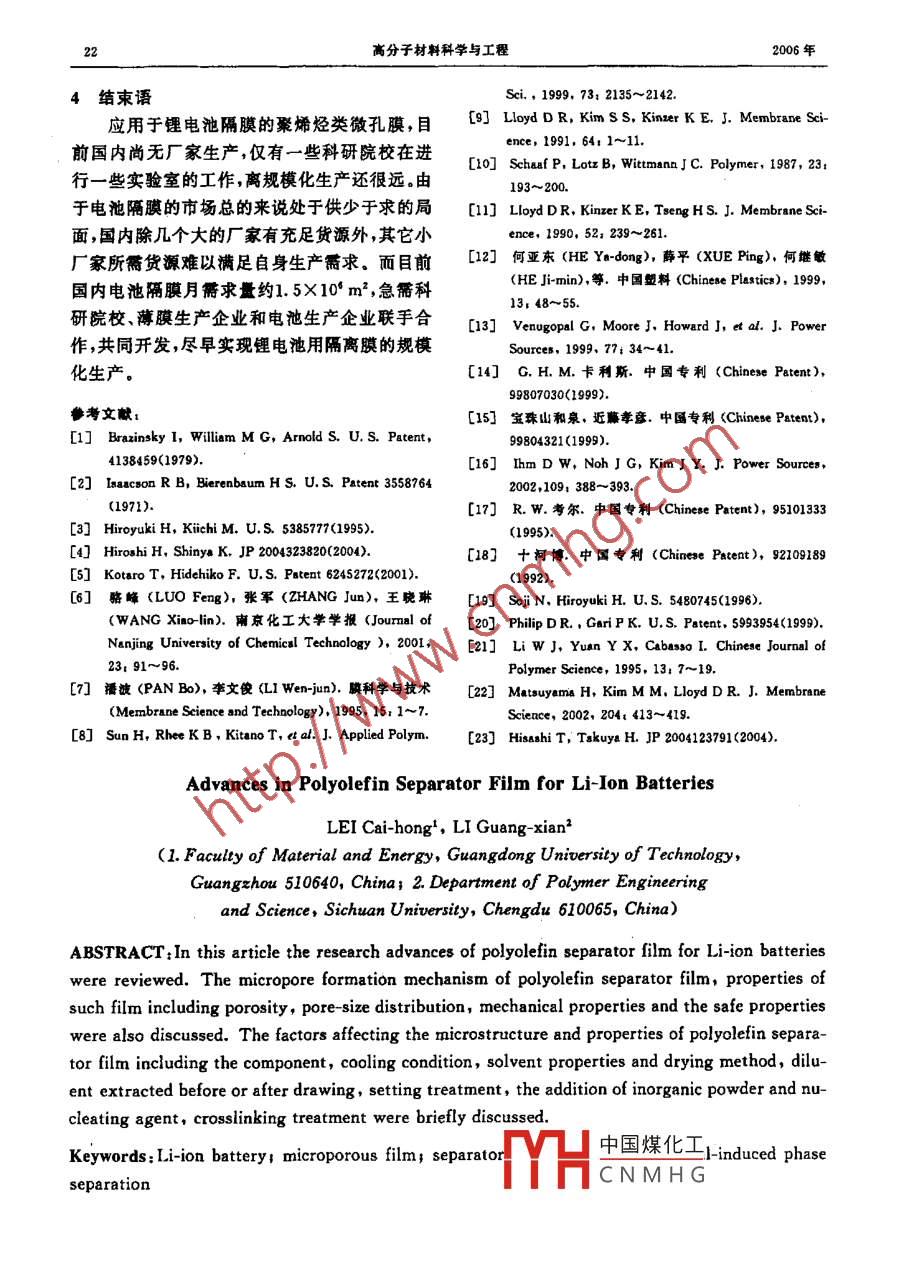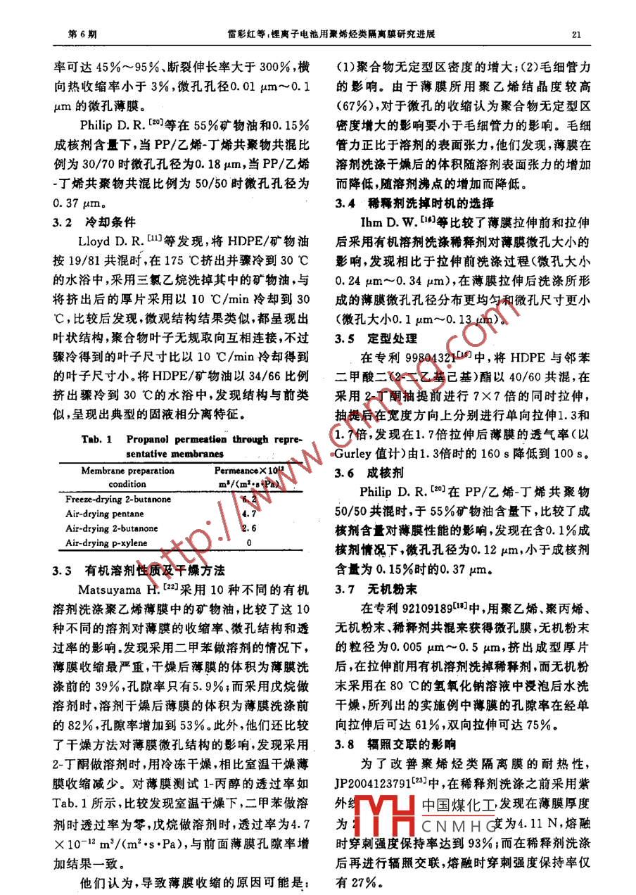第22卷第6期高分子材料科學(xué)與工程vo.22,No.620064F11 A POLYMER MATERIALS SCIENCE AND ENGINEERING Nov 2006鋰離子電池用聚烯烴類隔離膜研究進(jìn)展雷彩紅1,李光憲2(1廣東工業(yè)大學(xué)材料與能源學(xué)院,廣東廣州51064012四川大學(xué)高分子材料科學(xué)與工程系,四川成都610065)摘妟:綜逑了熱致相分離法銅高于電池用聚姊烴類隔高膜研究進(jìn)晨,上點(diǎn)綜述了隔離膜微孔形成機(jī)理、隔高鼷主頭技術(shù)指擗加孔徑大小及分布、孔隙率、力學(xué)性能及閉孔泓度和膜破梨溫度。并簡(jiǎn)迷了組分含量、冷卻條件、有機(jī)溶劑性質(zhì)及干燥方法、科釋劑洗拌時(shí)機(jī)的選擇、定型處理、無(wú)機(jī)粉末、成植劑、幅照交聯(lián)等對(duì)隔高膜微觀蚰構(gòu)和性能的影響關(guān)輸調(diào):鋰離子電池微孔胰;離;聚烯烴熱致相分離中圖分類號(hào):TB383文獻(xiàn)標(biāo)識(shí)碼,A文章編號(hào):1000-7555(2006)06-0018-05鋰離子電池目前廣泛應(yīng)用于手機(jī)、筆記本法,不同的是 Asahi- Kasey和 Mitsui Ch電電腦等可攜帶式電子產(chǎn)品上。相比鎳鍋和鎳氫采用先洗后拉過(guò)程而 Tonen公司采用先拉后池,具有能量密度高壽命長(zhǎng)和電壓高等優(yōu)洗過(guò)程。點(diǎn)。鋰離子電池由正負(fù)極、隔離膜和電解液組本文主要介紹熱致相分離法制造電池隔離成。其中隔離膜連接并隔開(kāi)正極和負(fù)極材料,膜的研究進(jìn)展,重點(diǎn)綜述隔離膜微孔形成機(jī)理、是電子的絕緣體,但允許離子通過(guò),其性能的優(yōu)隔離膜主要技術(shù)指標(biāo)及影響隔離膜微觀結(jié)構(gòu)和劣決定著電池的界面結(jié)構(gòu)和內(nèi)阻,進(jìn)而影響著性能的主要因京。電池的容量循環(huán)性、充放電電流密度等關(guān)鍵特性因此隔離膜性能的優(yōu)劣對(duì)于提高電池的綜1隔離蹊微孔形成機(jī)理合性能起重要的作用。隔離膜制造過(guò)程包括以下步驟:將聚合物目前,電池隔離膜主要是聚烯烴類微孔膜,如HDPE)與稀釋劑在高溫下共混形成均勻溶它的制造方法主要有熔融拉伸和熱致相分離液;該溶液以一定的冷卻速度或驟冷來(lái)誘發(fā)相法。熔融拉伸法是在提高熔融聚合物應(yīng)力的分離1采用溶劑洗滌方法洗掉稀釋劑;于燥將溶條件下先將結(jié)晶性聚合物(如聚丙烯)擠塑成劑揮發(fā)掉;溶劑洗滌前或后進(jìn)行單向或雙向拉膜,然后使薄膜在無(wú)張力或低張力下經(jīng)退火得伸;溶劑洗滌后進(jìn)行定型處理;最后收卷成膜。到必要結(jié)晶結(jié)構(gòu)再后進(jìn)行縱向拉伸產(chǎn)生一種其依據(jù)的機(jī)理是熱致相分離機(jī)理。狹縫狀空隙的網(wǎng)狀結(jié)構(gòu)。該法存在孔徑及孔隙駱?lè)宓群?jiǎn)述了熱致相分離法的相平衡熱率較難控制的缺點(diǎn),而且由于只進(jìn)行縱向拉伸力學(xué)及相分離動(dòng)力學(xué)原理潘波、李文俊印等對(duì)薄膜橫向強(qiáng)度較差。 Hoechst[和Nito聚合物/稀釋劑體系熱致相分離制造微孔膜的Denko公司采用該種方法。熱致相分離法是意義、原理過(guò)程及國(guó)內(nèi)外研究進(jìn)展進(jìn)行了評(píng)利用高聚物(如HDPE〕和某些高沸點(diǎn)的小分子述。SunH(采用 Hoffman- Weeks圖獲得了化合物(稀釋劑)在較高溫度下形成均相溶液,HDPE/液體石蠟間 Flory-Huggins相互作用參然后降低溫度發(fā)生相分離在拉伸前或拉伸后數(shù)為0.36對(duì)于這種具有弱相互作用的結(jié)晶性聚合洗掉稀釋劑使其產(chǎn)生微孔。日本的 Asahi-Ka中國(guó)煤化衛(wèi)相圖如Fg1所sei4、 Mitsui Chemical和 Tonen'公司采用該CNMHG收稿日期:2005-07-19μ修訂日期:2005-10-08聯(lián)系人:曾彩紅,主要從事薄胰加工、微觀結(jié)構(gòu)與性能之間的關(guān)系研究, E-mail: LCH528@21cN.OOM第6期露彩紅等:鋰離子電池用聚烯烴類隔離膜研究進(jìn)展19,其中。是偏晶點(diǎn)。要的當(dāng)溫度較高時(shí),聚合物與稀釋劑形成均勻的溶液,溫度降低時(shí),聚合物在高濃度區(qū)(在國(guó)n2隔離主要性能指標(biāo)右側(cè))表現(xiàn)為熔點(diǎn)降低在熔點(diǎn)降低曲線以下和2.1孔隙率、孔徑大小透氣率在φ左側(cè)水平虛線以下的區(qū)域發(fā)生固液相分Ganesh venugopal等比較了不同供應(yīng)離;在低濃度區(qū)(④左側(cè))相分離曲線以下,發(fā)商的隔離膜,發(fā)現(xiàn)其中兩家供應(yīng)商的隔離膜的生液液相分離形成聚合物富相和稀釋劑富相微孔孔徑在003m~0.05m之間,孔隙率在兩相區(qū)。40%~50%,以 Gurley值(根據(jù) ASTM D726標(biāo)準(zhǔn), Gurley值為在一定壓力下50mL氣體通Liquid-liquid過(guò)隔膜所需的時(shí)間,低 Gurley值表明薄膜具有好的透氣性)表示的透氣率小于100s,另外一Region家供應(yīng)商的隔離膜孔徑在0.09m~0.12m之間,孔隙率為55%。此外,他們發(fā)現(xiàn)盡管隔離膜孔徑和孔隙率接近,但透氣率并不是完全Solid-liquid region接近,這表明隔離膜中微孔的貫通性不一樣。隔離膜的孔徑一般要求在0.01pm~0.1pm范內(nèi),孔徑小于0.01pm時(shí),鋰離子穿過(guò)能力太F1 Temperature-composition phase diagram for.小;孔徑若大于0.1pm,電池內(nèi)部樹(shù)枝狀晶體a, the fraction of polymer in pol/dian生成時(shí),電池易短路此外為了保證電池有足夠的鋰離子穿透力,隔離膜的透氣率最好小于或Schaaf P.等認(rèn)為,在HDPE與二(2羥等于400s乙酯)牛酯胺、二苯醚聯(lián)二苯