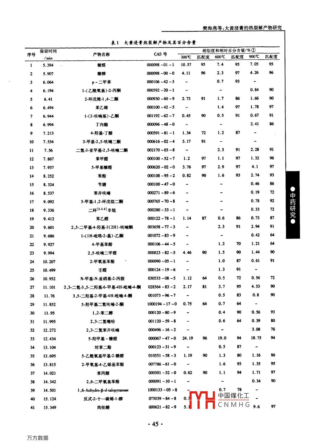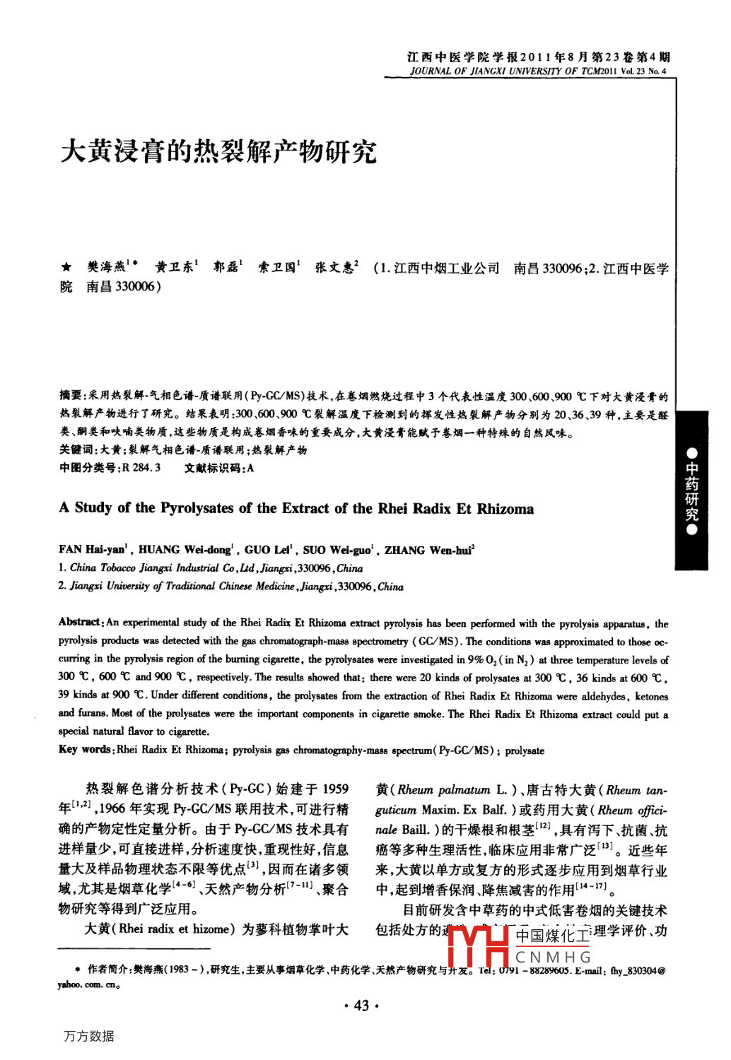 江西中醫(yī)學(xué)院學(xué)報(bào)2011年8月第23卷第4期JOURNAL OF JIANGXI UNIVERSITY OF TCM2011 Vol 23 No, 4大黃浸膏的熱裂解產(chǎn)物研究★樊海燕*黃衛(wèi)東1郭磊索衛(wèi)國(guó)張文惠2(1.江西中煙工業(yè)公司南昌330096;2江西中醫(yī)學(xué)院南昌330006)摘要:采用熱裂解氣相色譜-質(zhì)譜聯(lián)用(PyCC/MS)技術(shù),在卷煙燃燒過(guò)程中3個(gè)代表性溫度300、60900℃下對(duì)大黃浸膏的熱裂解產(chǎn)物進(jìn)行了研究。結(jié)果表明:300600、900℃裂解溫度下檢測(cè)到的揮發(fā)性熱裂解產(chǎn)物分別為20、36、39種,主要是醛類(lèi)、酮類(lèi)和呋喃類(lèi)物質(zhì),這些物質(zhì)是構(gòu)成卷煙香味的重要成分,大黃浸膏能賦予卷煙一種特殊的自然風(fēng)味。關(guān)鍵詞:大黃;裂解氣相色譜-質(zhì)譜聯(lián)用;熱裂解產(chǎn)物中圖分類(lèi)號(hào):R284.3文獻(xiàn)標(biāo)識(shí)碼:AA Study of the Pyrolysates of the Extract of the Rhei radix Et Rhizoma中藥研究FAN Hai-yan, HUANG Wei-dong, GUO Lel, SUO Wei-guo', ZHANG Wen-hui?1. China Tobacco Jiangxi industrial Co, Ltd, Jiangzi, 330096, China2. Jiangxi University of Traditional Chinese Medicine, Jiangxi, 330096, ChinaAbstract An experimental study of the Rhei Radix Et Rhizoma extract pyrolysis has been performed with the pyrolysis apparatus, thepyrolysis products was detected with the gas chromatograph-mass spectrometry(GC/MS). The conditions was approximated to thosecurring in the pyrolysis region of the buming cigarette, the pyrolysates were investigated in 9%, (in N, )at three temperature levels of300℃,600℃and90℃, respectively. The results showed that: there were20 kinds of prolysates at300℃,36 kinds at600℃,39 kinds at 900 C Under different conditions, the prolysates from the extraction of Rhei Radix Et Rhizoma were aldehydes, ketonesand furans. Most of the prolysates were the important components in cigarette smoke. The Rhei Radix Et Rhizoma extract could put aspecial natural flavor to cigarette.Key words: Rhei Radix Et Rhizoma; pyrolysis gas chromatography-mass spectrum( Py-GC/MS); prolysate熱裂解色譜分析技術(shù)(Py-GC)始建于1959黃( Rheum palmatum L)、唐古特大黃( Rheum tan年2,1966年實(shí)現(xiàn)Py-CCMS聯(lián)用技術(shù)可進(jìn)行精 guticum Maxim, Ex Balf.)或藥用大黃( Rheum offici確的產(chǎn)物定性定量分析。由于Py-CC/MS技術(shù)具有 nale bail)的干燥根和根莖2),具有瀉下、抗菌、抗進(jìn)樣量少,可直接進(jìn)樣,分析速度快重現(xiàn)性好信息癌等多種生理活性,臨床應(yīng)用非常廣泛。近些年量大及樣品物理狀態(tài)不限等優(yōu)點(diǎn),因而在諸多領(lǐng)來(lái),大黃以單方或復(fù)方的形式逐步應(yīng)用到煙草行業(yè)域,尤其是煙草化學(xué)。、天然產(chǎn)物分析’-聚合中,起到增香保潤(rùn)、降焦減害的作用14-1)。物研究等得到廣泛應(yīng)用目前研發(fā)含中草藥的中式低害卷煙的關(guān)鍵技術(shù)大黃( ei radix et hizome)為要科植物掌葉大包括處方的中國(guó)煤化理學(xué)評(píng)價(jià)功CNMHG作者簡(jiǎn)介:樊海燕(1983-),研究生主要從事煙草化學(xué)中藥化學(xué)天然產(chǎn)物研究與升發(fā)。a:yn-8828905.Emil:y830304@江西中醫(yī)學(xué)院學(xué)報(bào)2011年第23卷第4期能性評(píng)價(jià)和卷煙煙氣中有效成分的鑒別和轉(zhuǎn)移率的GC/MS分析條件:氣相色譜柱:HP5MS柱,規(guī)檢測(cè)研究等,而對(duì)其在卷煙燃燒過(guò)程中的變化、熱解格:30m×0.25mm×0.25μm;氣相升溫梯度:50產(chǎn)物以及熱解動(dòng)力學(xué)等研究鮮見(jiàn)報(bào)道,處于一種℃保持1min,以8℃/s升至220℃,在以20℃/“只知結(jié)果、不知過(guò)程”的局面。為此,本文采用Py升至280℃然后保持5min;質(zhì)譜離子源溫度:230GC/MS部分模擬卷煙燃燒過(guò)程,對(duì)大黃浸膏進(jìn)行裂℃,傳輸線溫度:280℃,四極桿溫度:150℃。解,檢測(cè)其裂解產(chǎn)物并計(jì)算相對(duì)含量,考察其裂解產(chǎn)3實(shí)驗(yàn)結(jié)果與討論物與溫度的關(guān)系,為大黃及其提取物作為煙用添加裂解是卷煙燃燒過(guò)程中的一個(gè)重要環(huán)節(jié),卷煙劑的應(yīng)用效果提供理論依據(jù)。熱解蒸餾區(qū)的溫度大約在200~900℃之間,煙氣的1實(shí)驗(yàn)材料和儀器大部分成分主要在這個(gè)區(qū)產(chǎn)生。因此,本實(shí)驗(yàn)選取1.1實(shí)驗(yàn)材料了卷煙燃燒過(guò)程中3個(gè)代表性溫度300600和900大黃藥材(購(gòu)于上海同濟(jì)堂藥業(yè)有限公司);無(wú)℃作為裂解溫度,考察大黃浸膏在相應(yīng)溫度下的裂水乙醇(分析純,天津市永大化學(xué)試劑開(kāi)發(fā)中心);解產(chǎn)物。圖1~圖3為300、600和900℃下大黃浸去離子水(18.2M·CM);膏裂解產(chǎn)物的總離子流圖(TIC圖, Total Ion Chro-1.2儀器matogram)。對(duì)比圖1圖2和圖3可以看出,300℃6890N/5973N氣相色譜質(zhì)譜聯(lián)用儀(美國(guó)Agi-時(shí)大黃浸膏裂解程度不激烈,裂解組分較少;而600lent公司); CDS Pyroprobe5200裂解儀(美國(guó)CDs℃和900℃裂解程度加劇,產(chǎn)生的主要組分明顯比公司); Heidolph LR4003旋轉(zhuǎn)蒸發(fā)儀(德國(guó) Heidel-300℃時(shí)的多。對(duì)大黃浸膏在300600和900℃下°|ph);H8數(shù)顯恒溫水浴鍋(常州國(guó)華電器有限公的熱裂解產(chǎn)物揮發(fā)性成分進(jìn)行定性分析并用面積中司):101EAE電熱鼓風(fēng)干燥箱(上海實(shí)驗(yàn)儀器廠有歸一法測(cè)定其相對(duì)含量其主要產(chǎn)物成分見(jiàn)表1藥限公司); METTLER